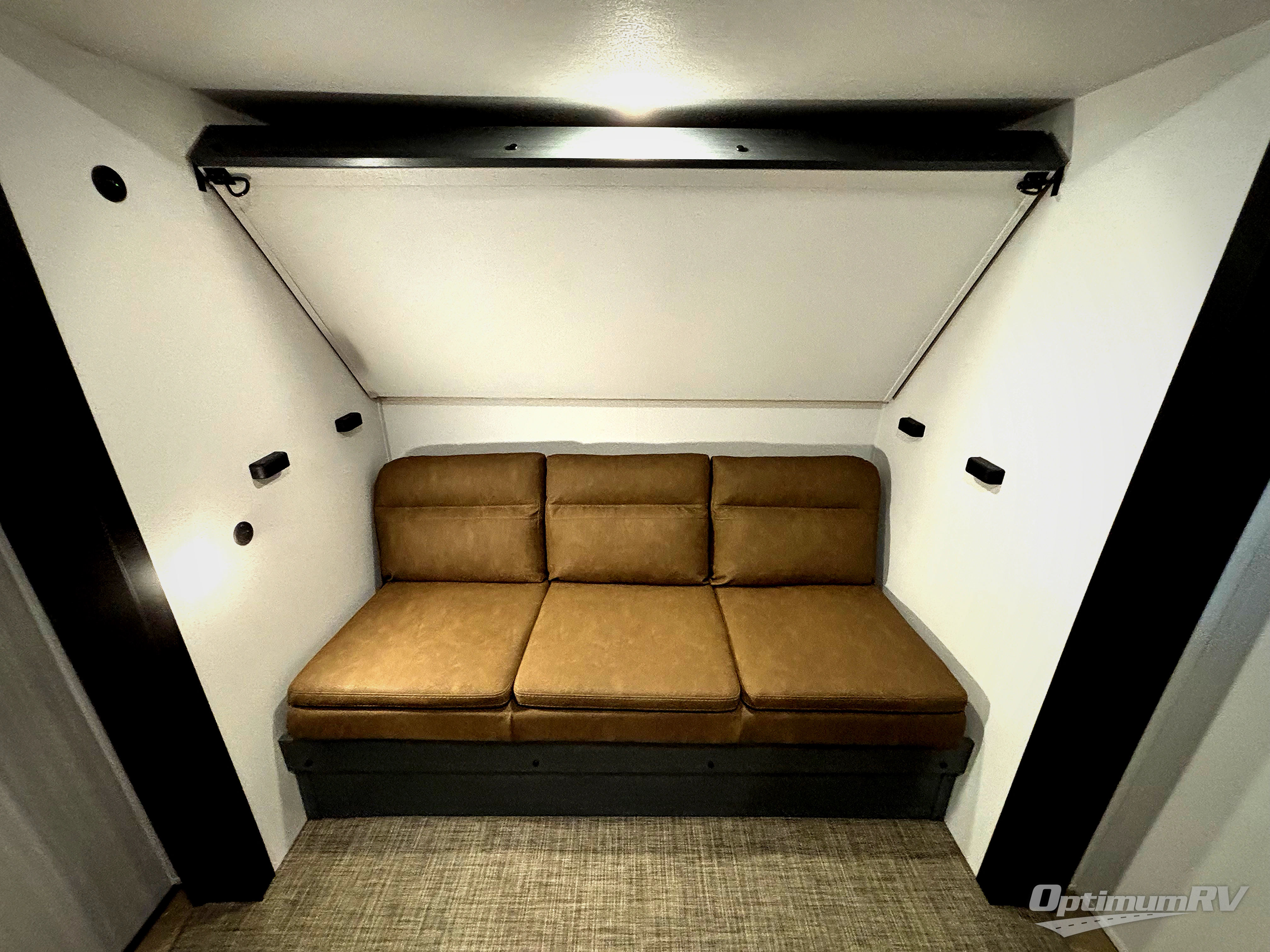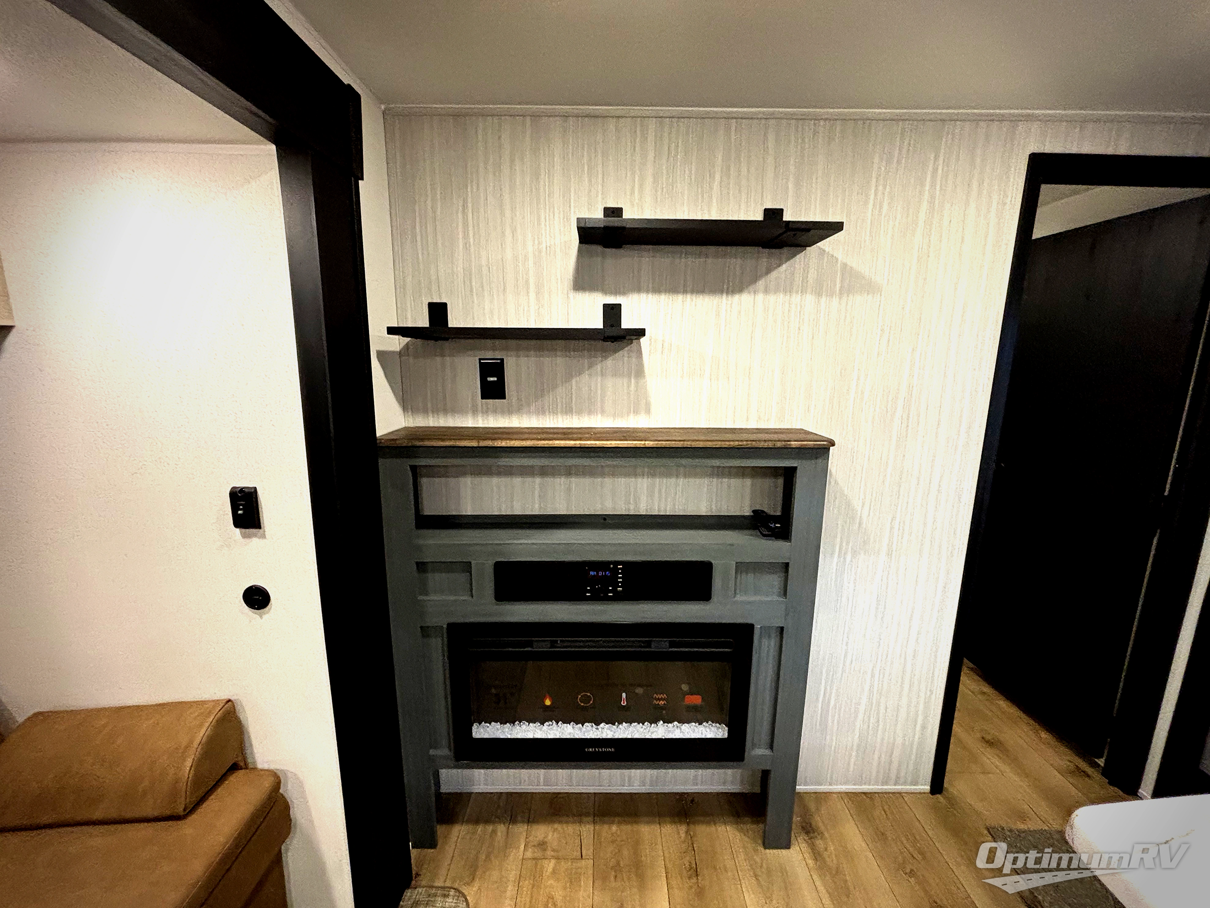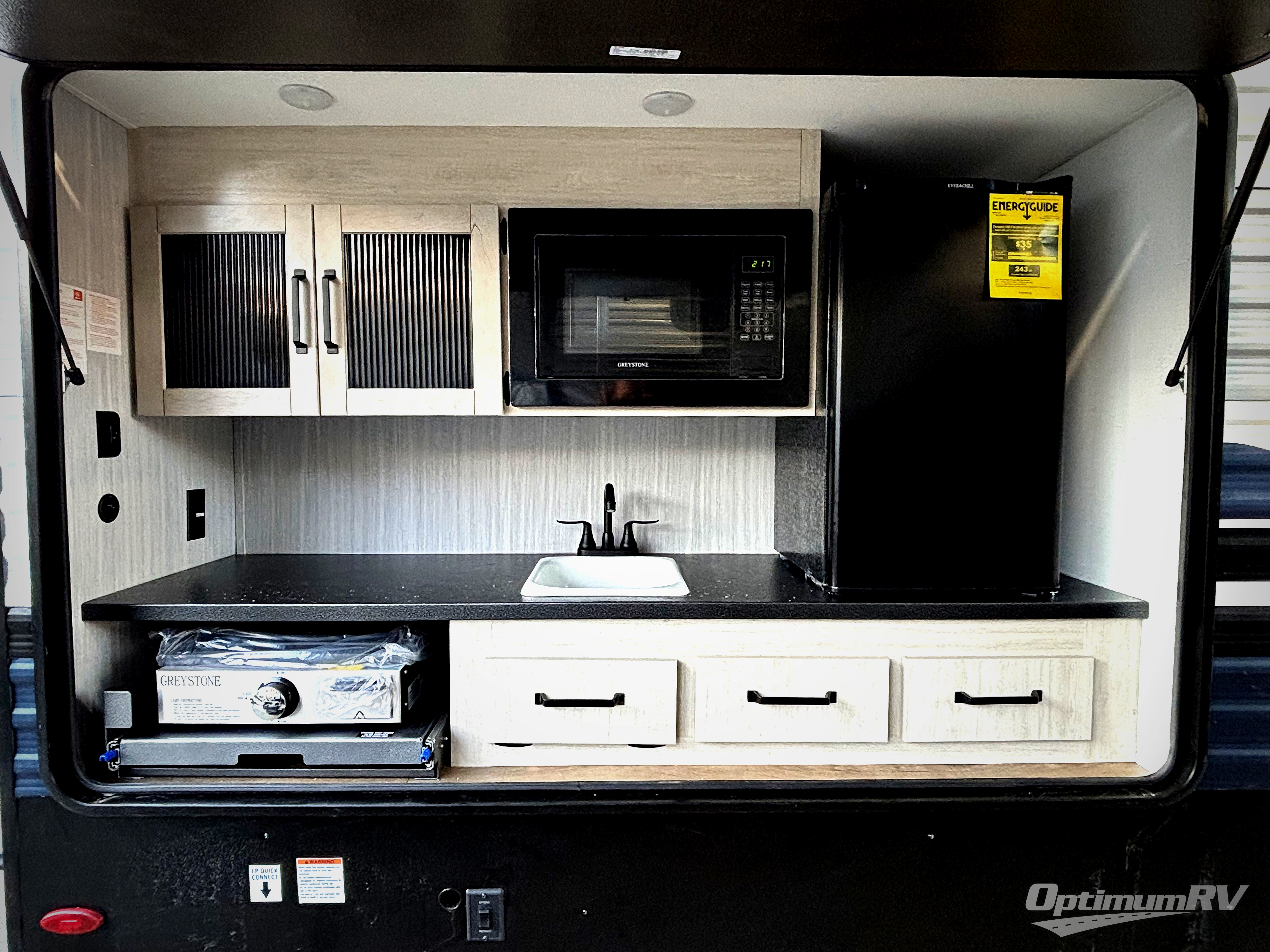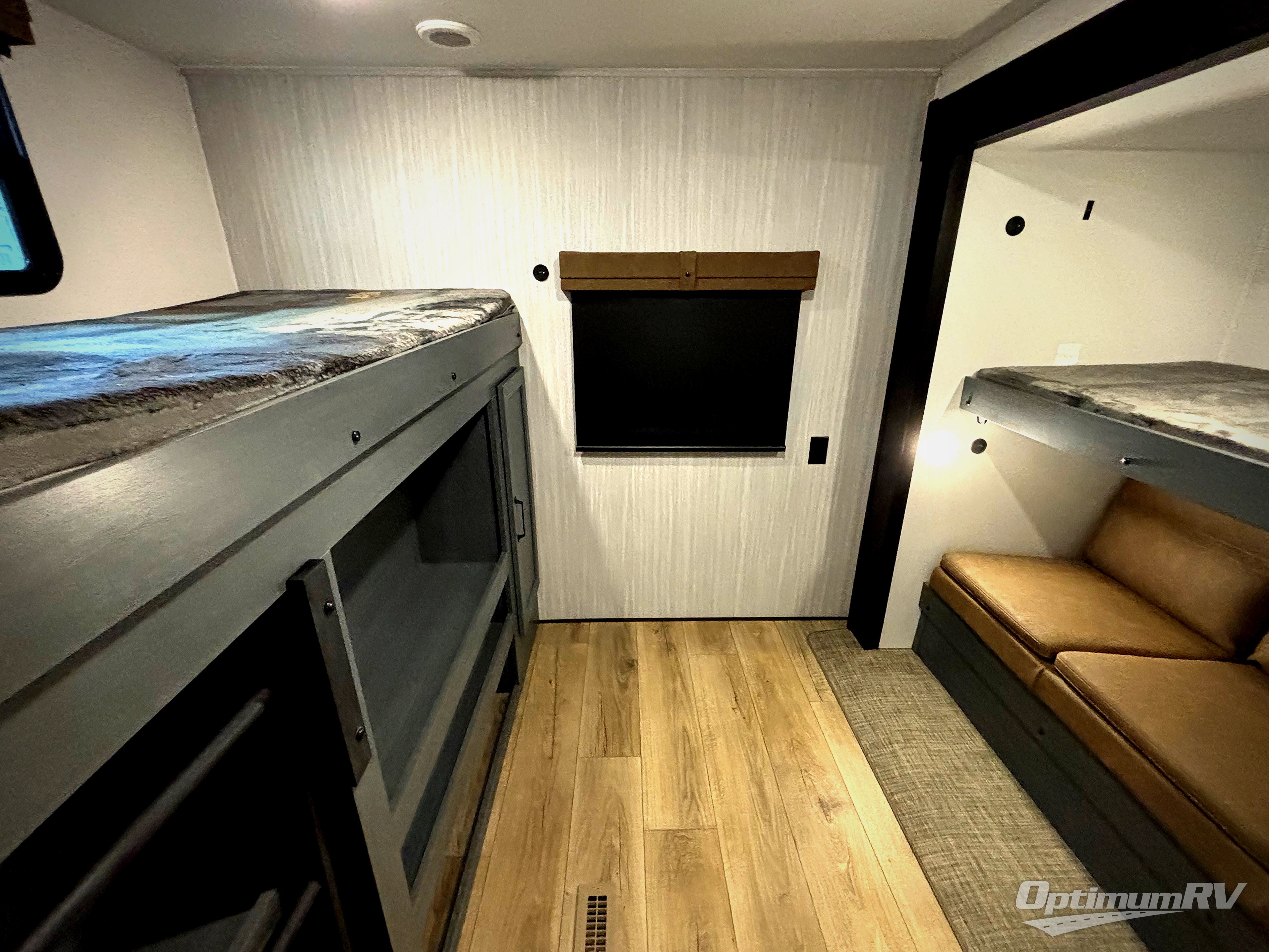 The whole family will love camping in this travel trailer! The kids will have their own privacy with the rear private bunkhouse which has a 32" x 69" bunk above a jiffy sofa slide and a 38" x 76" bunk above an entertainment center to keep them occupied on those rainy days. And you will have your own privacy with the front private bedroom that has a queen bed slide across from a dresser and a front closet. There is even a second closet with washer and dryer prep if you choose to add those appliances. Everyone can stay clean in the full bathroom with the 34" x 34" radius shower and their bellies full with the full kitchen. And you can choose between two outside kitchen options for even more convenience!