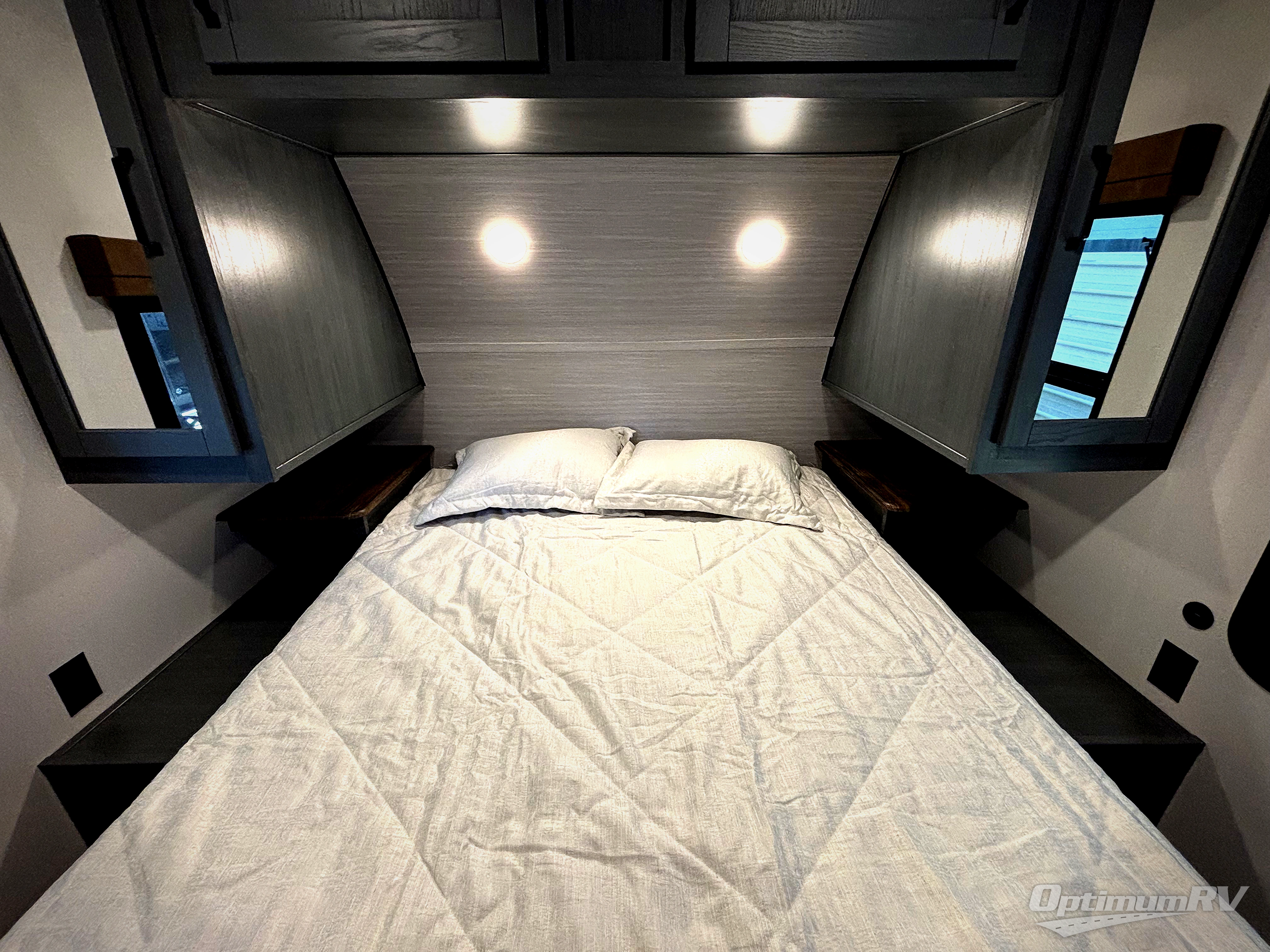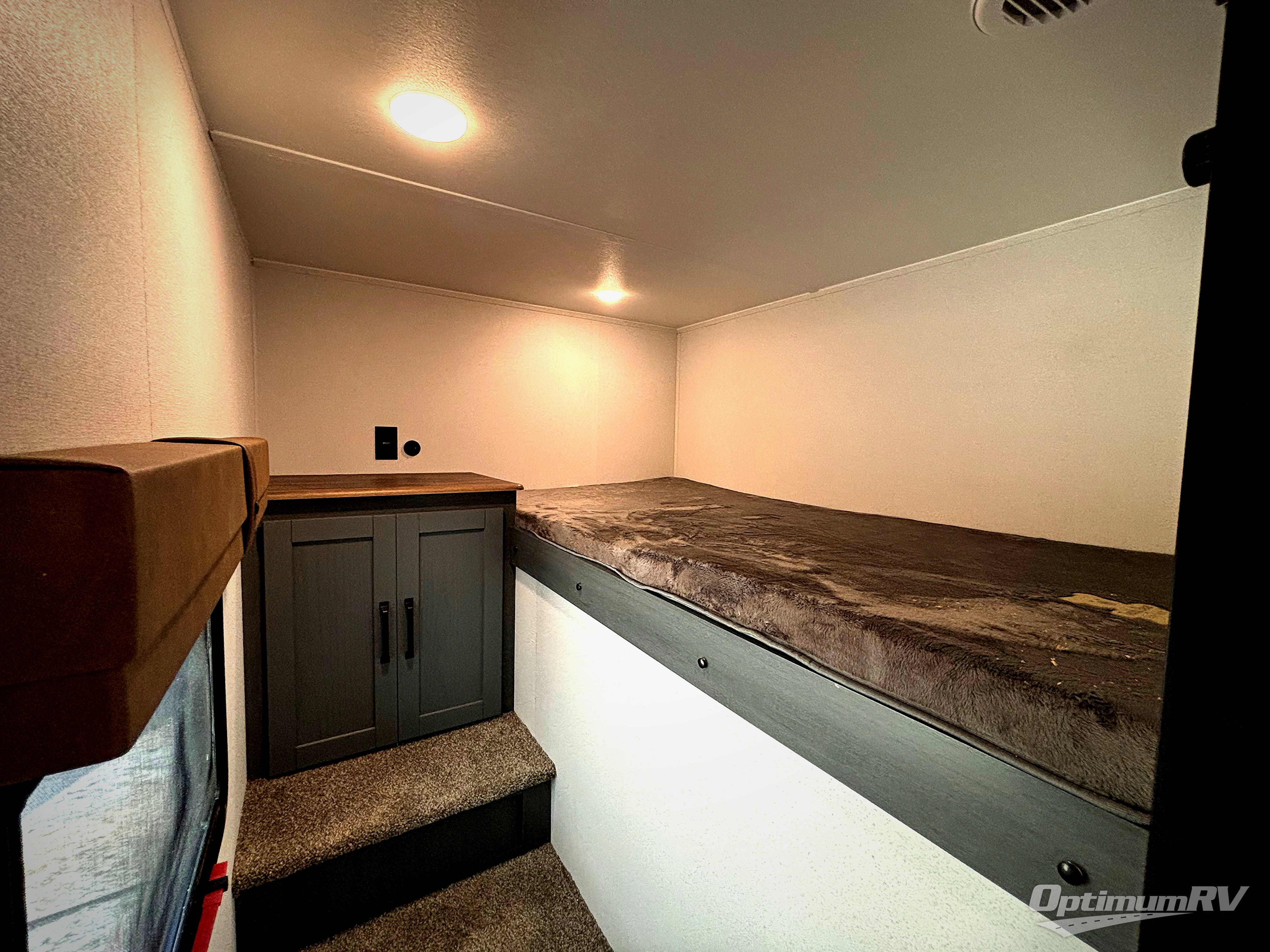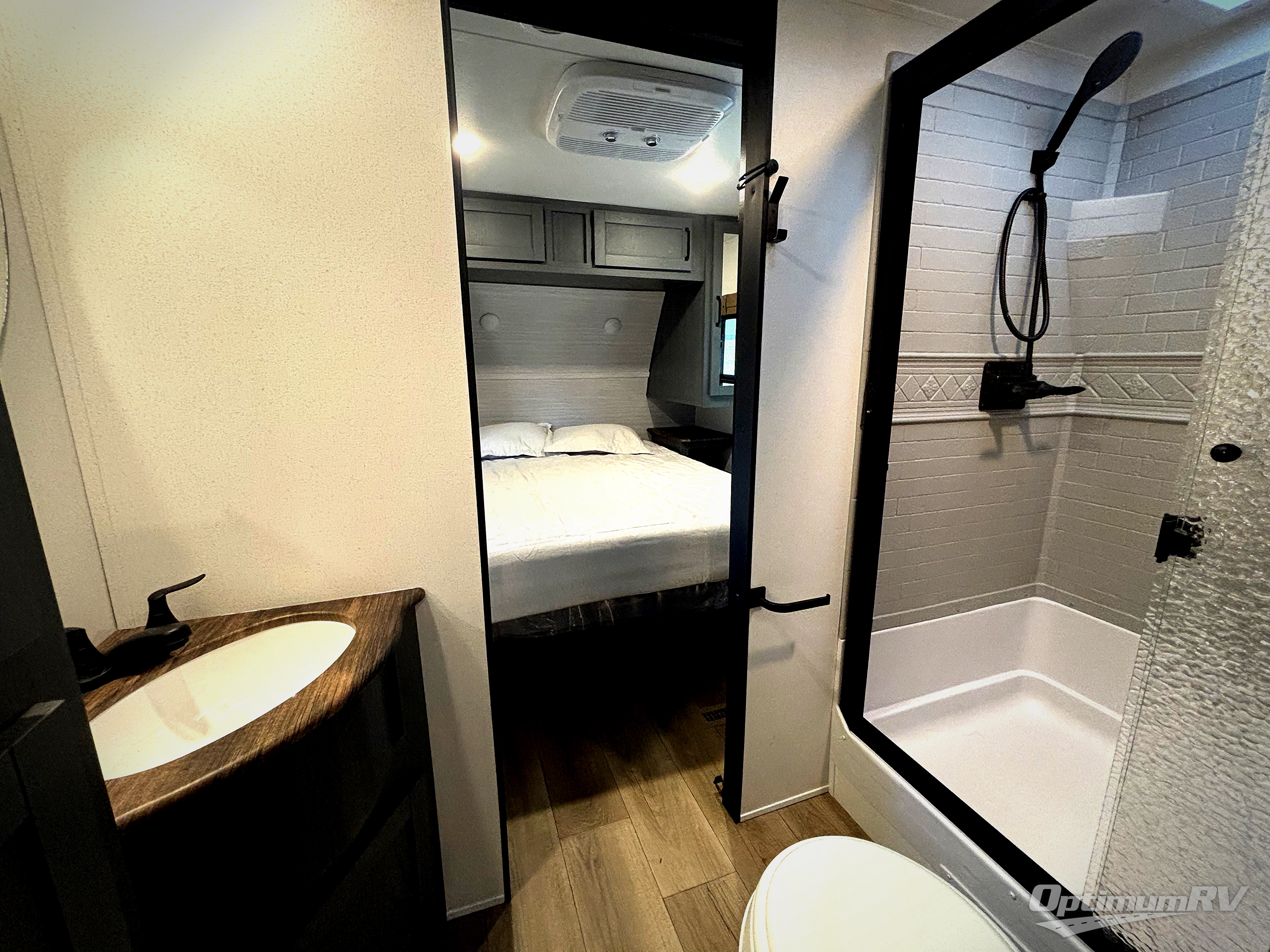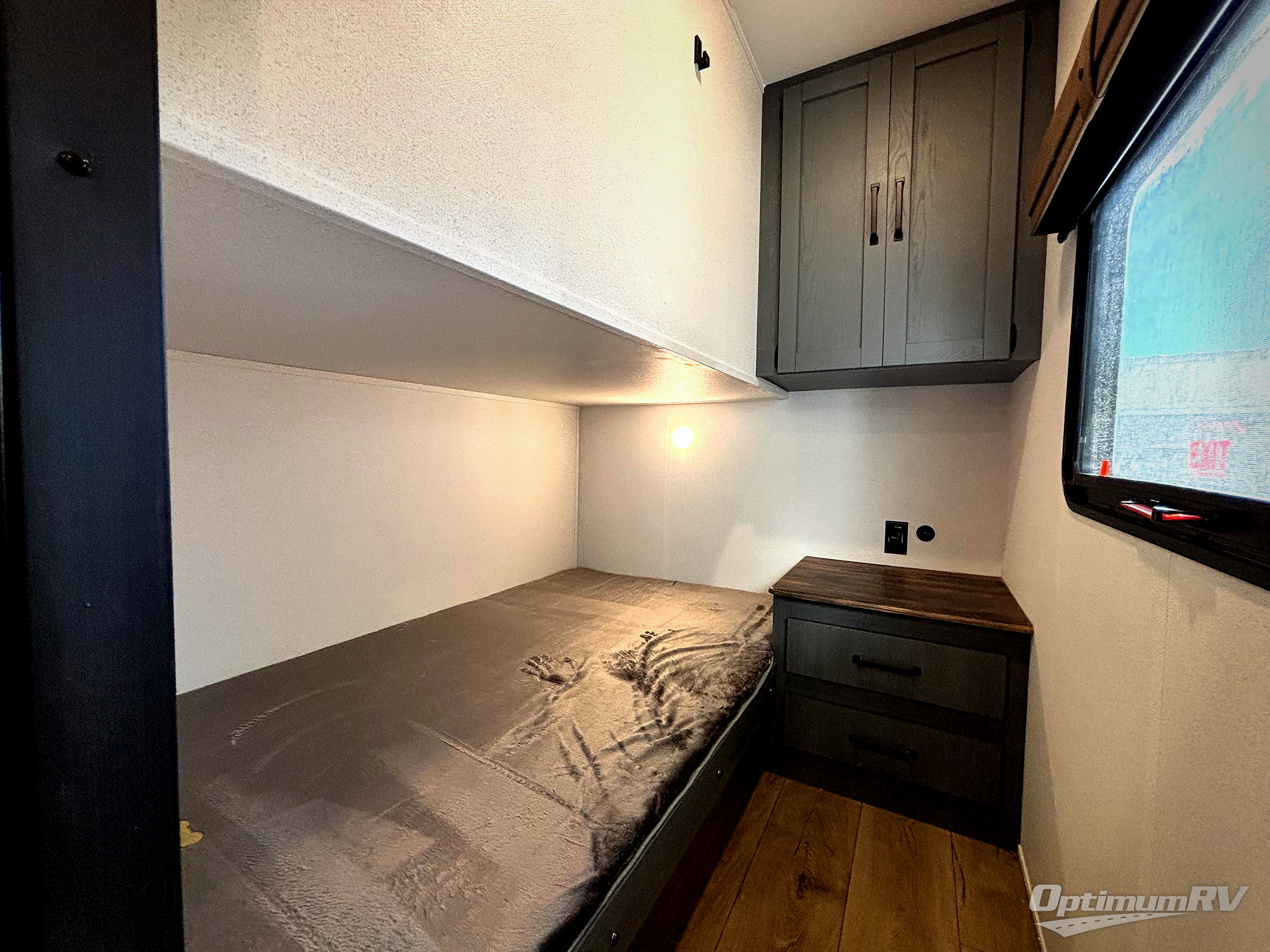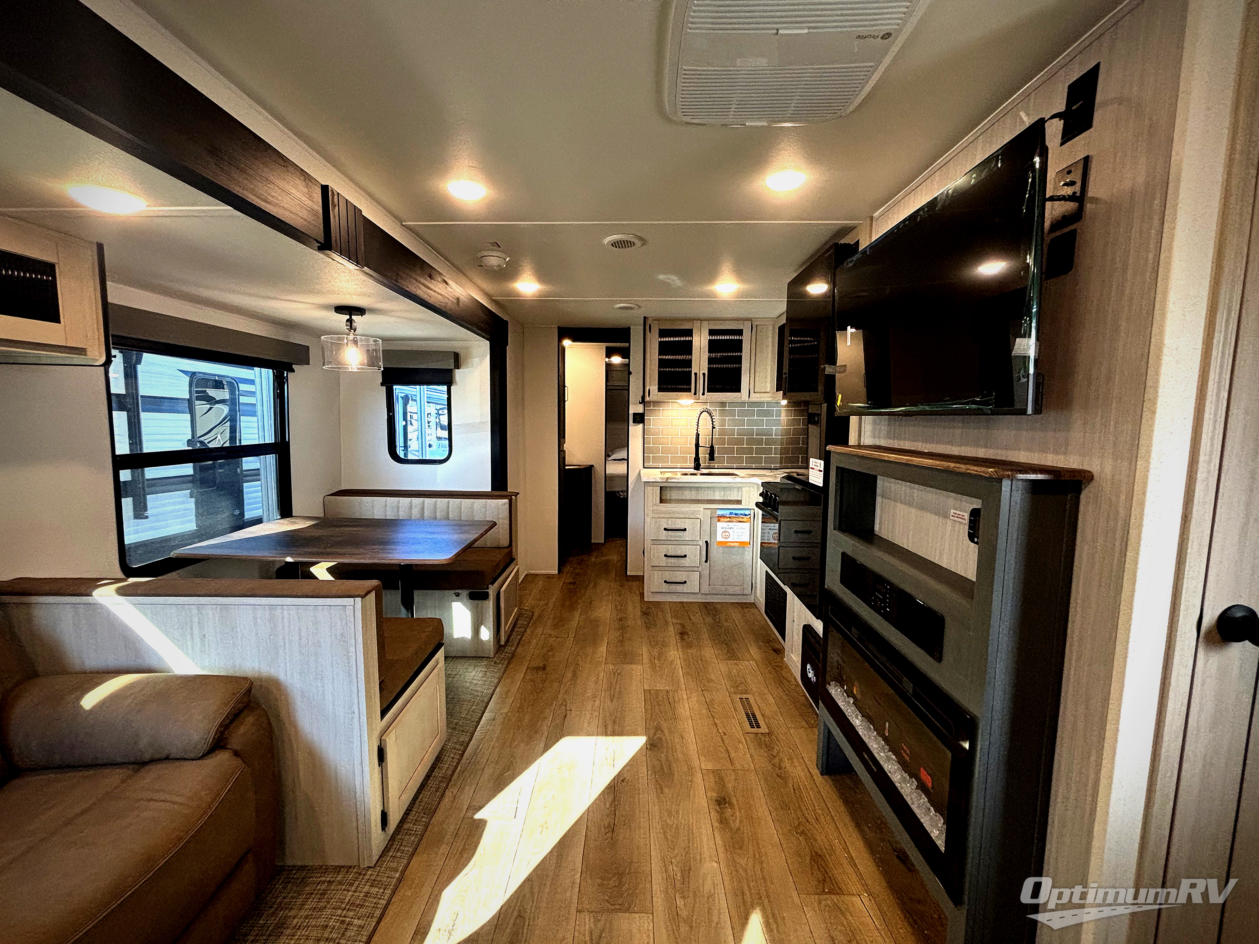 This travel trailer is perfect for camping with a larger group of friends or if you have older kids since there are two private bunkrooms! Each room includes a bunk bed and storage space for clothes, shoes, and more. You'll enjoy your own space up front in the master bedroom that includes a queen bed, dual shirt closets, and one of the dual entry doors to the unit for added convenience. Everyone can come together in the combined living area and kitchen that includes a large slide out with a sofa and booth dinette, plus there is a fireplace to make this space feel more like home. A full kitchen inside lets you create home-cooked meals each day, and you can choose to add the optional micro kitchen with a griddle for a pancake breakfast outdoors!