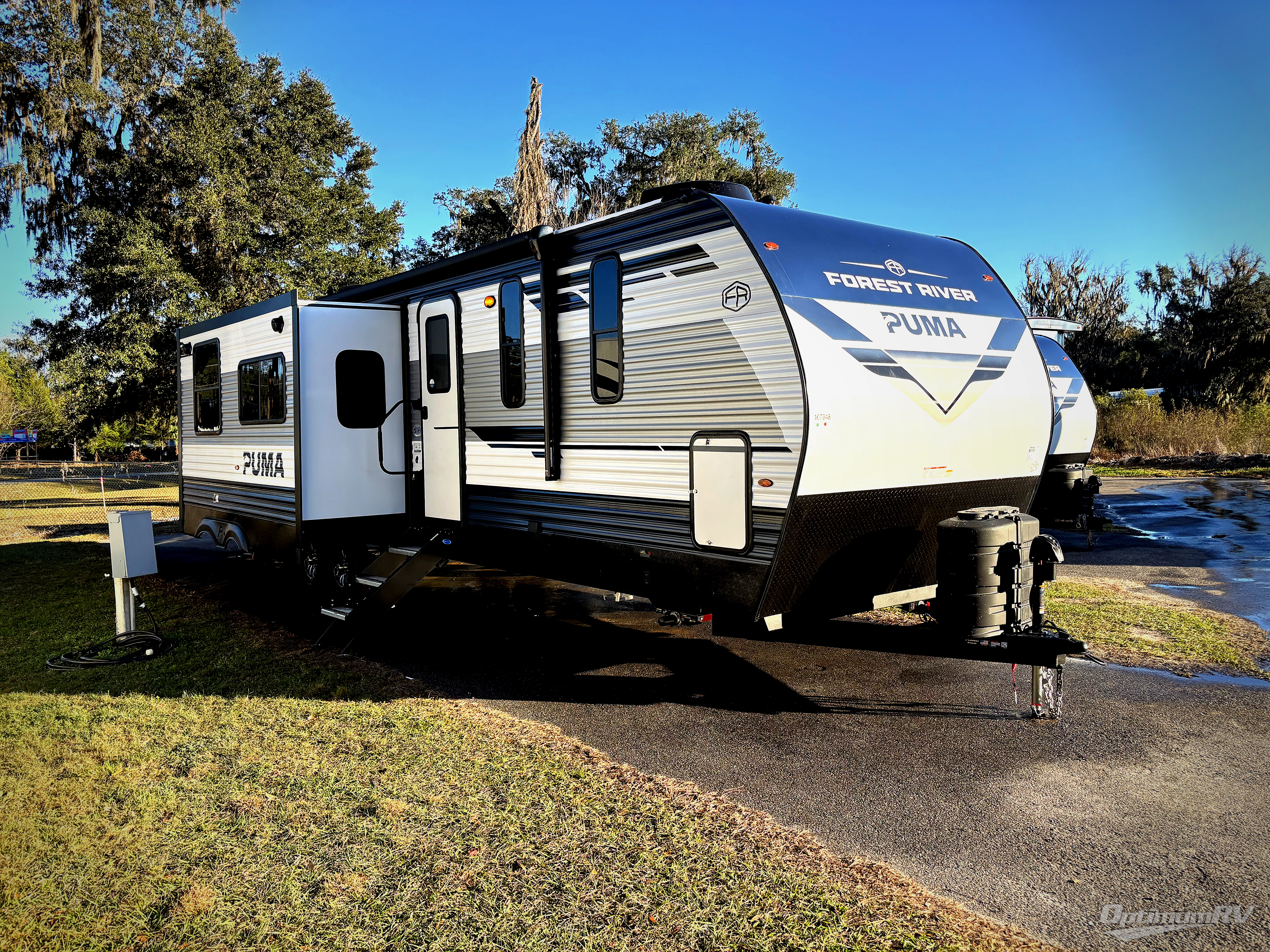 If you're looking for family-fun adventures, then you need one of these Forest River Puma travel trailers! They are built rugged, easy to tow, and jam packed with features. The Darco wrapped underbelly will help protect your unit, and the roof and side mount solar prep gives you the option to add off-grid power. Inside, the Congoleum linoleum will be easy to keep clean, and the night roller shades will provide privacy when it's time to turn in. You'll also enjoy an electric awning with an LED light strip plus an AM/FM/Bluetooth stereo and two outside speakers to keep the party going!