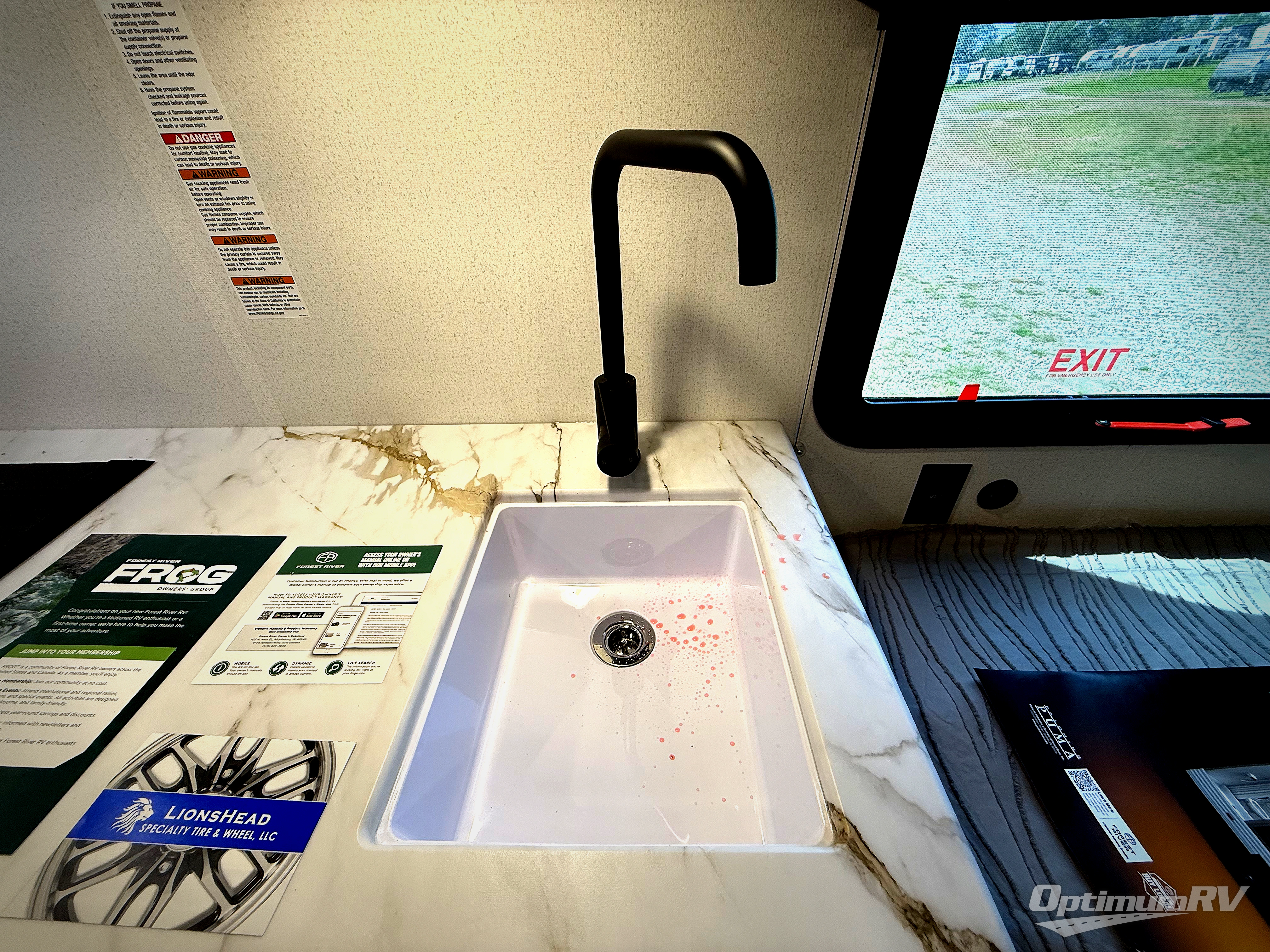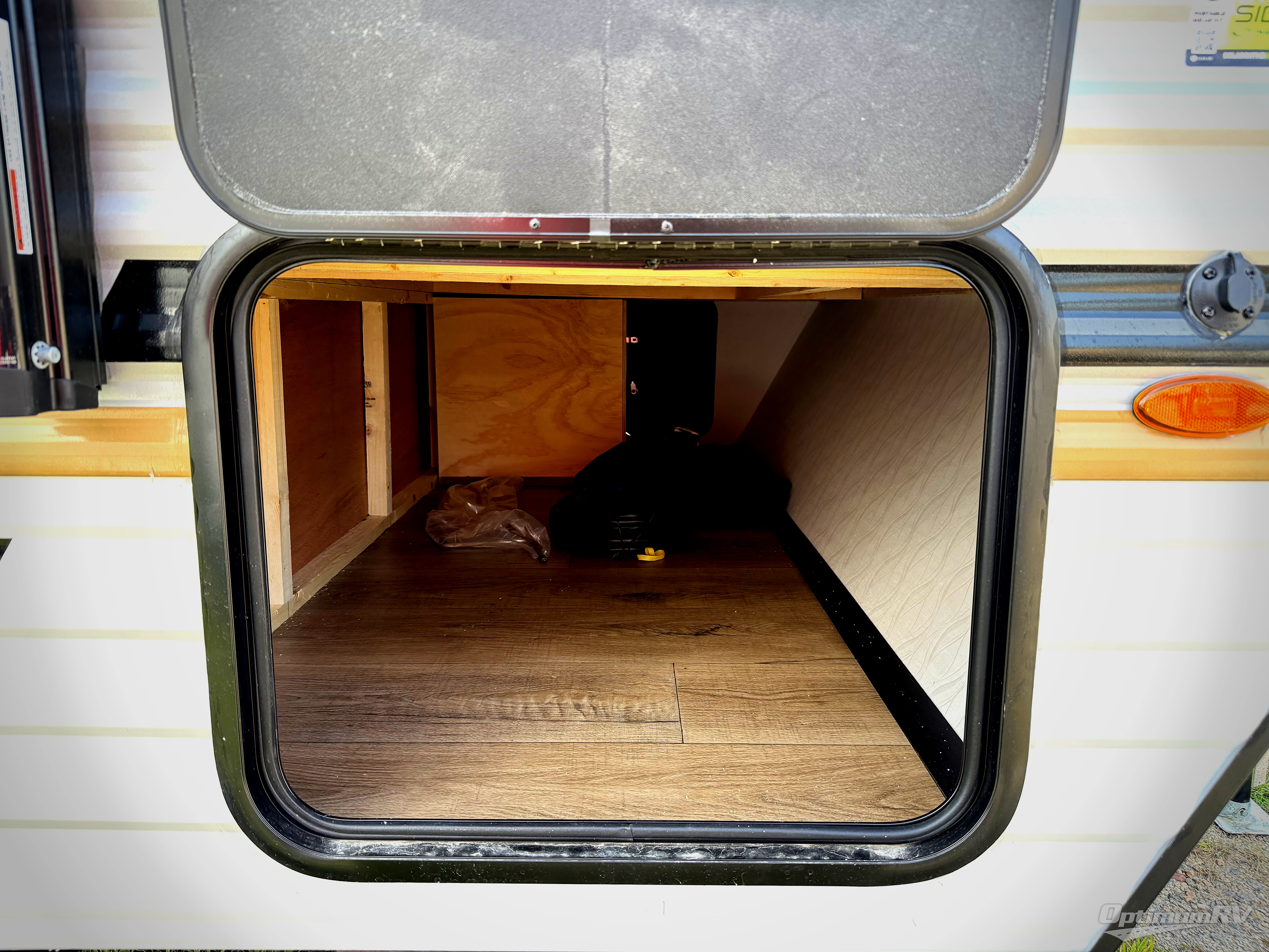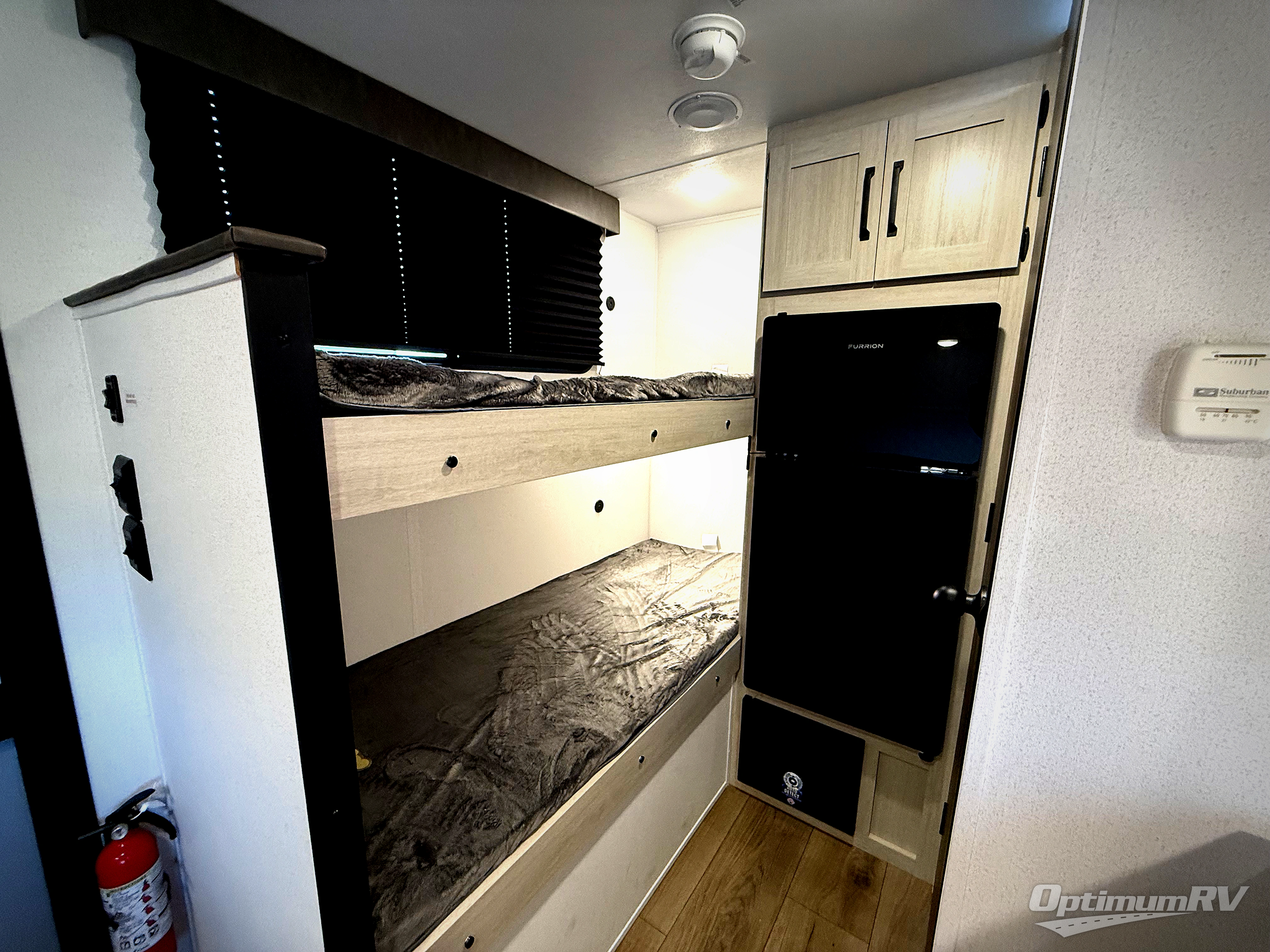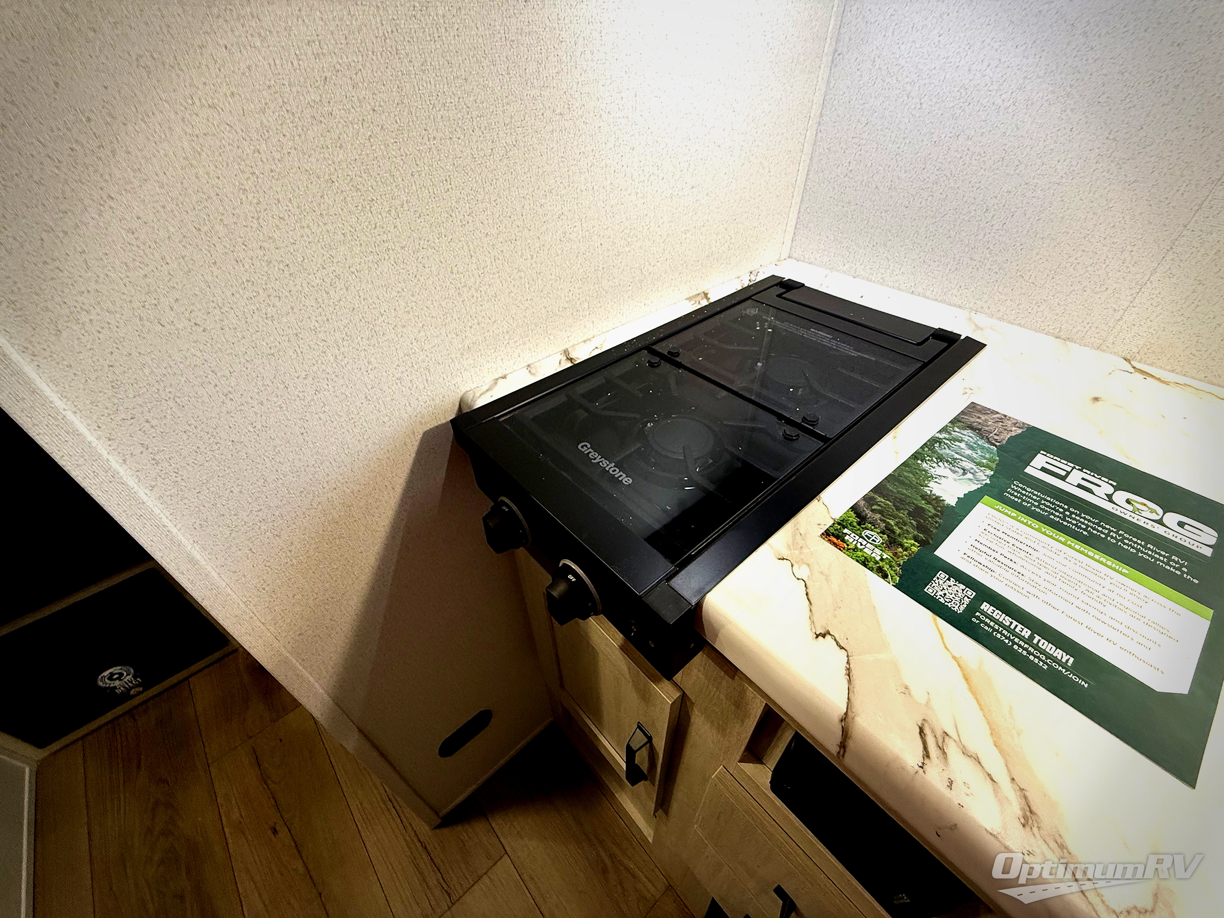 It will be so easy to enjoy camping trips in this single axle travel trailer! There is a front RV queen bed with flip-up storage at the foot of the bed for your belongings, and any additional guests can sleep on the 29" x 70" bunk beds. A full kitchen includes a stainless two burner cooktop and stainless microwave to cook meals each day, and the 4.3 cu. ft. 12V black glass refrigerator will keep your food fresh. And a private bath with a toilet and shower will let you freshen up without having to use the camp's facilities!