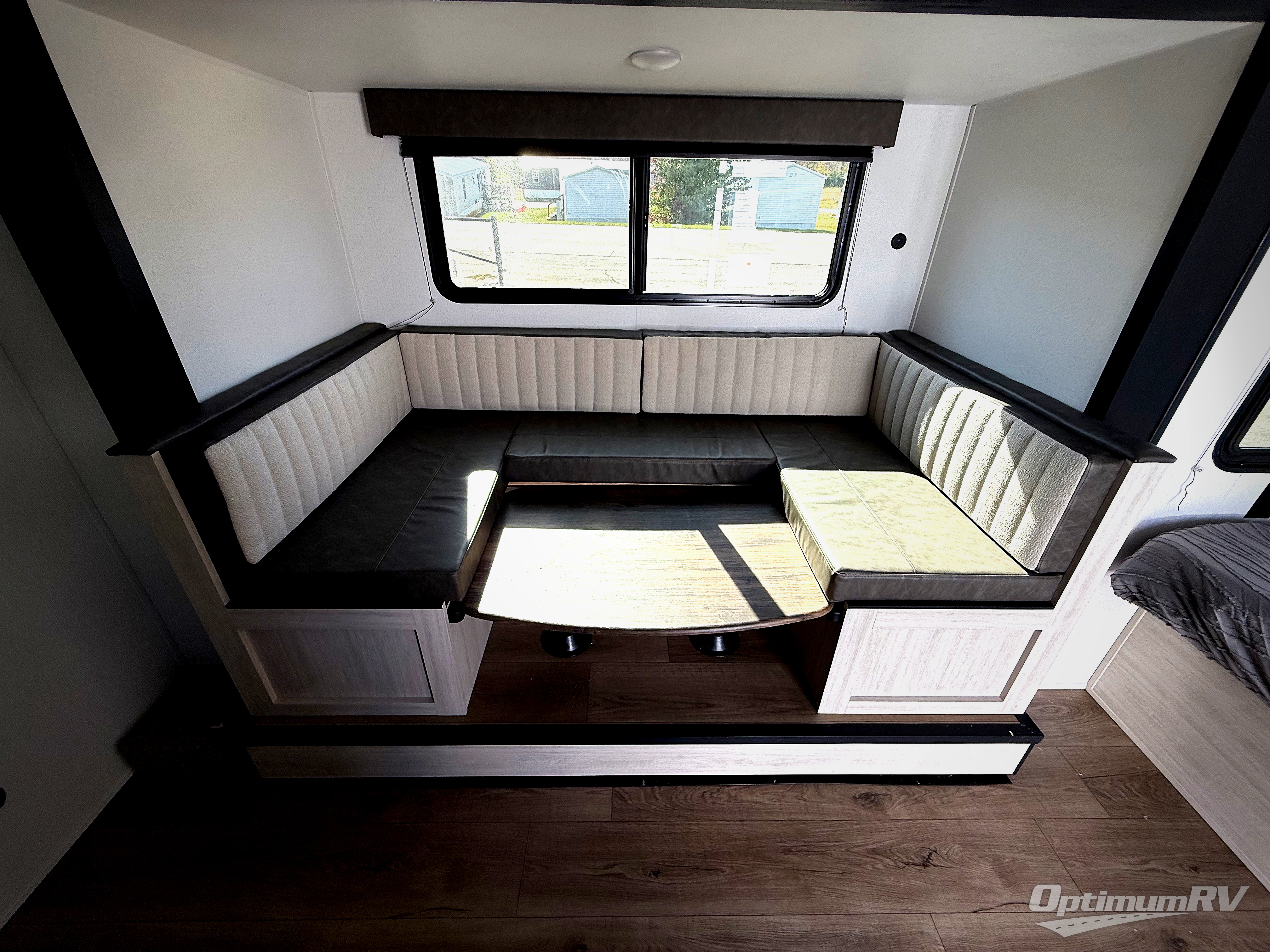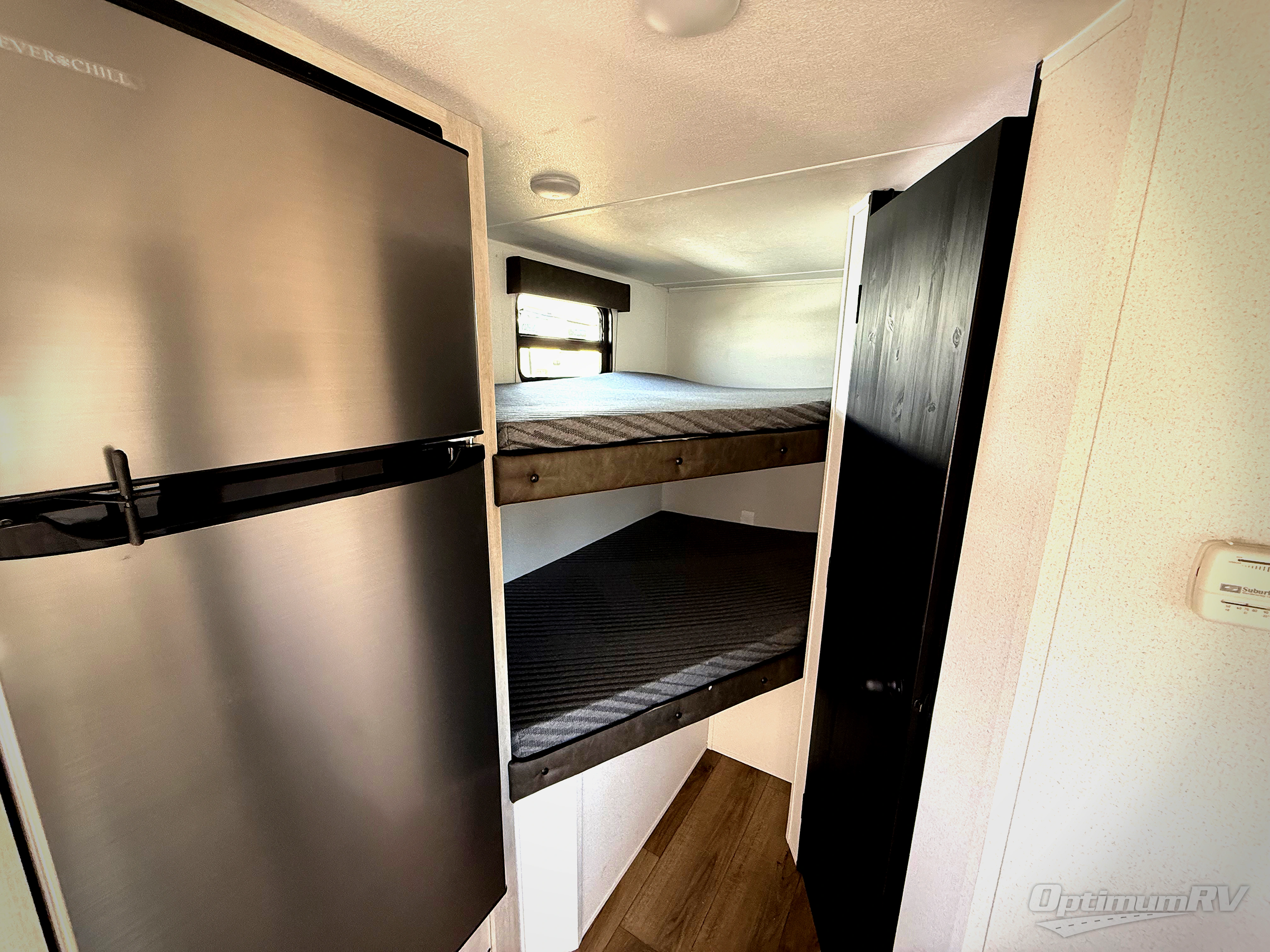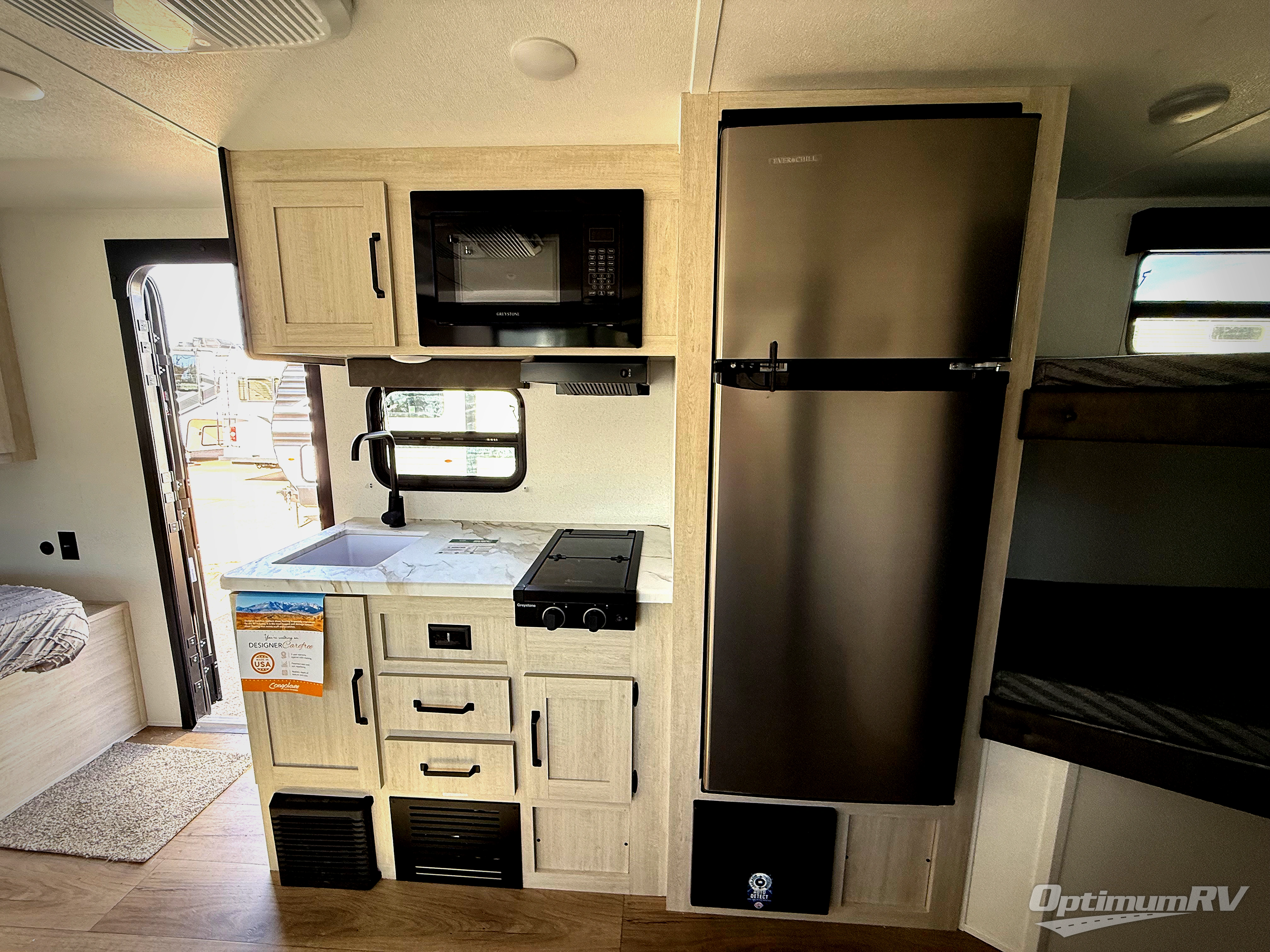 The whole gang will love camping in this travel trailer since there are double-size bunks for compact sleeping spaces and a slide out for more space to relax! The front RV queen bed is sure to provide a great night's rest, and you can choose the optional Murphy bed if you're needing more seating space during the day. Once you've made dinner on the two burner cooktop, you can dine around the U-shaped dinette. And an optional mini kitchen with a griddle is available if you'd rather cook outdoors! This unit includes ample storage space for your things, including exterior storage and storage under the bunks!