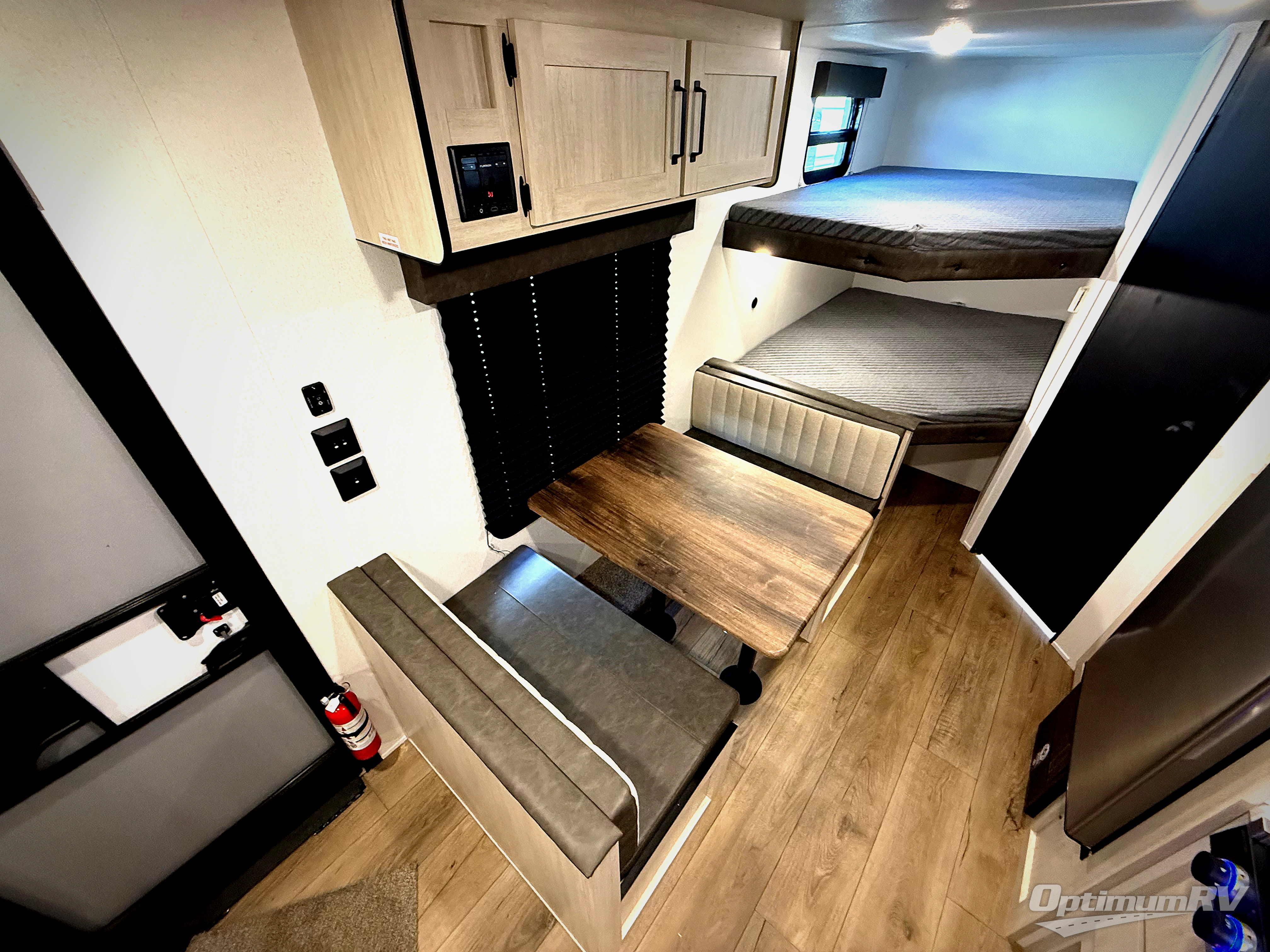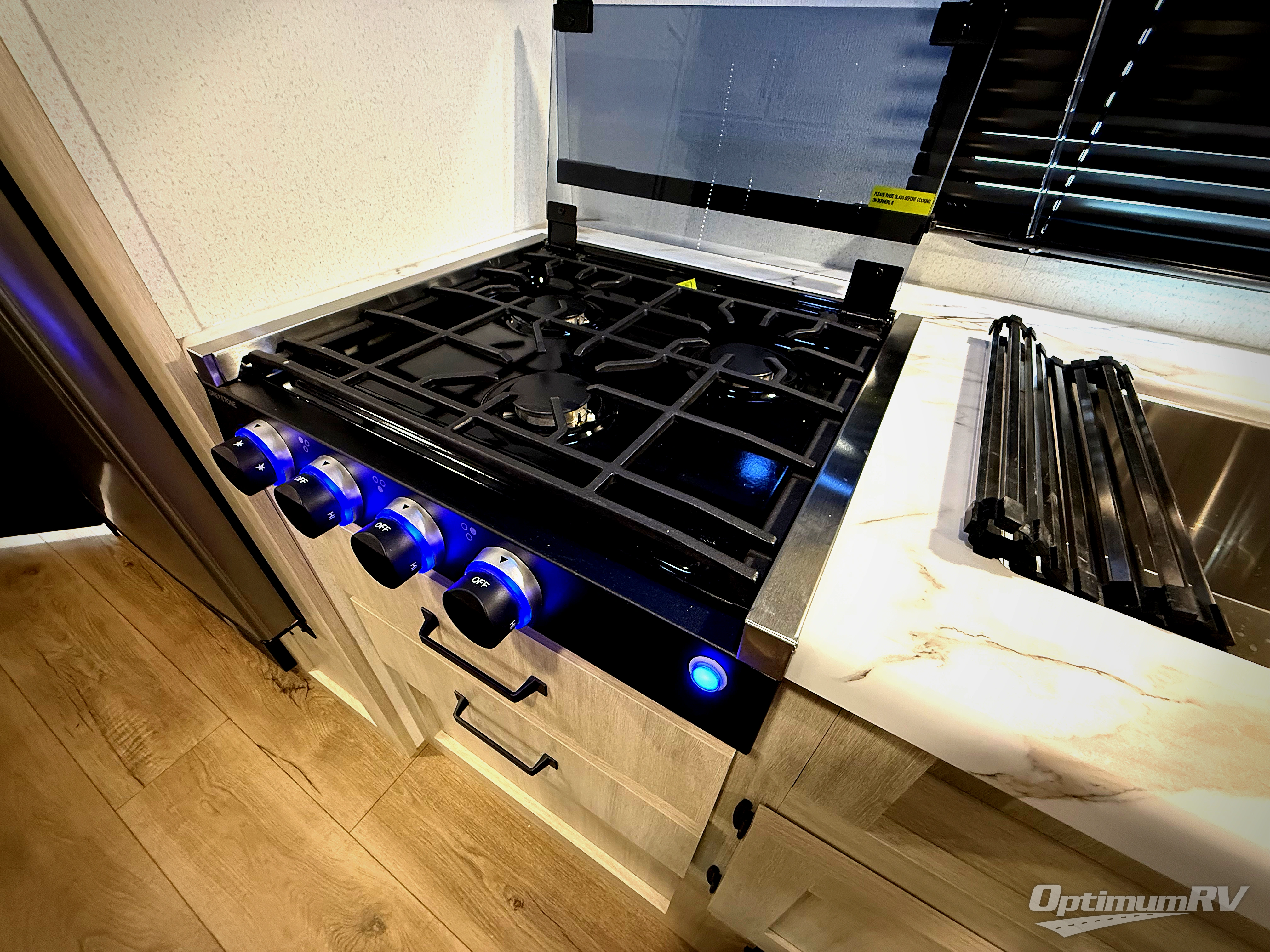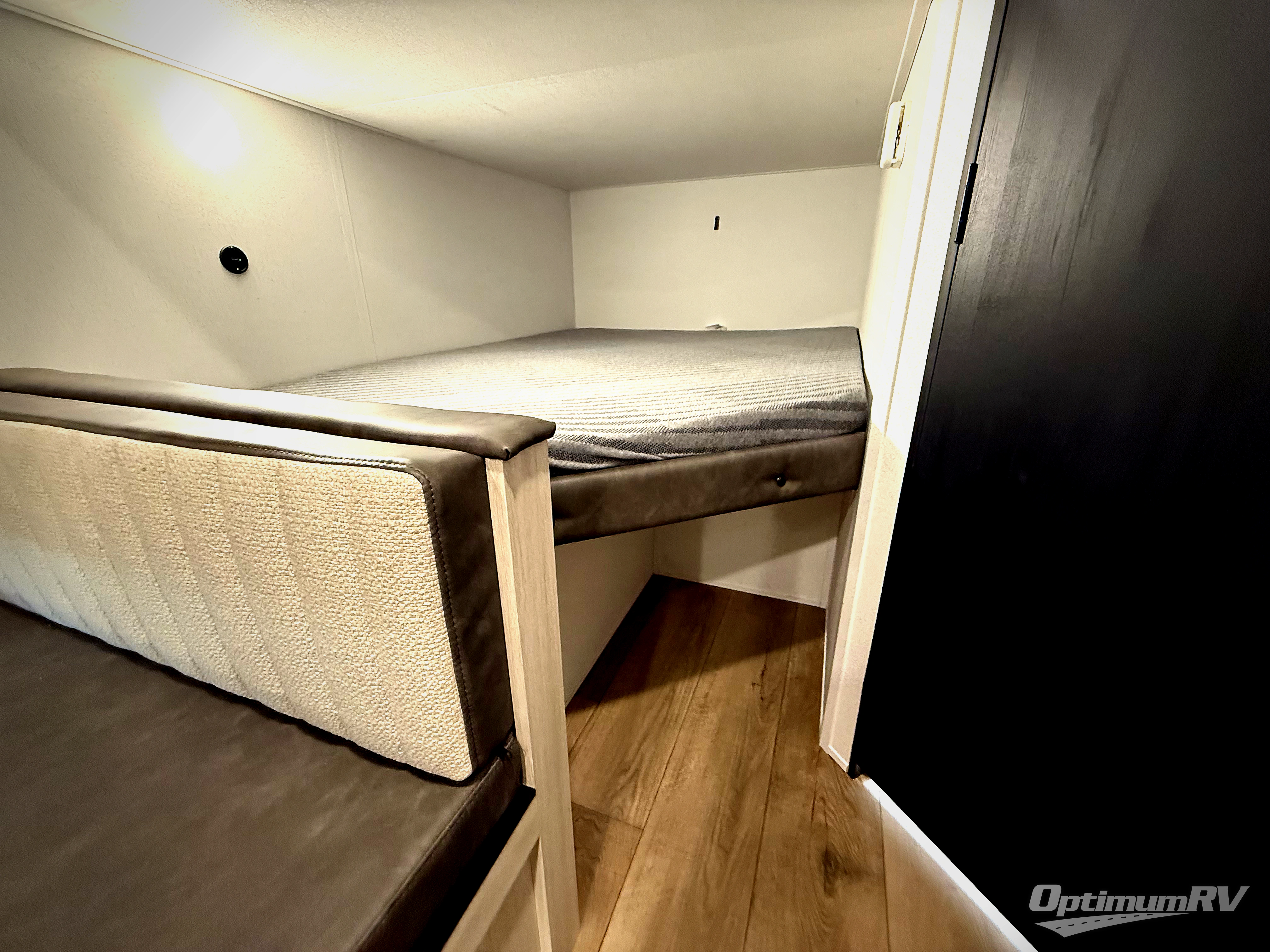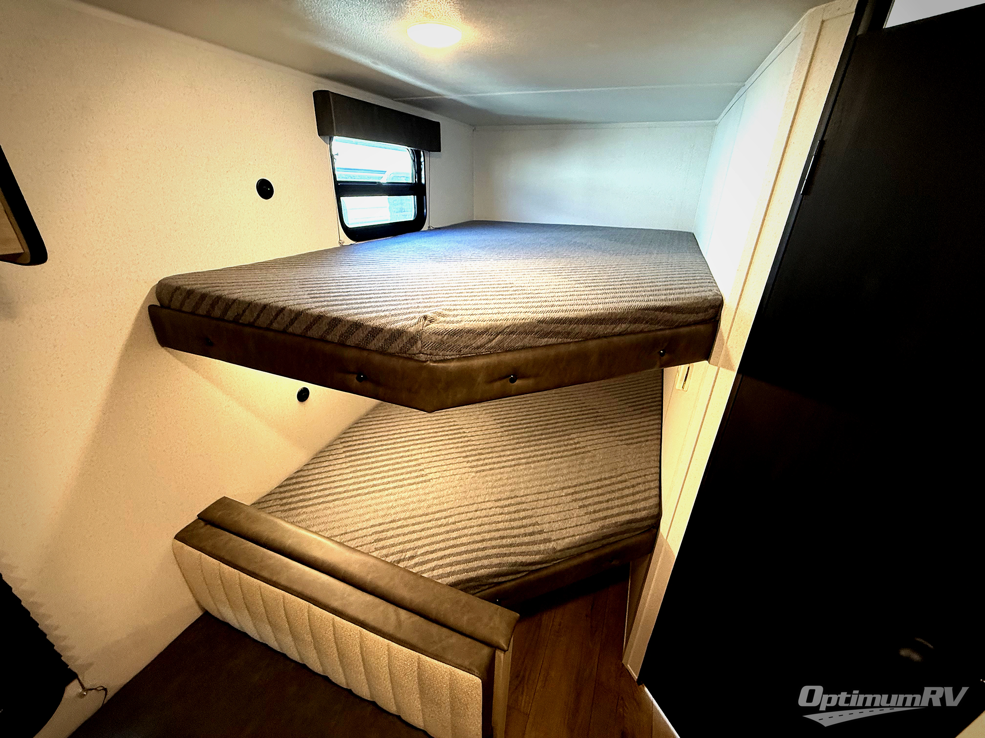If you're looking for more sleeping space, this double axle unit features double-size bunks with storage under the bunks for your bags. The full kitchen includes a stainless microwave and three burner cooktop to make meals, plus a pantry and 12V refrigerator for food storage. And an optional outside mini kitchen with a griddle can be added if you enjoy cooking outdoors! Up front, you'll find a 60" x 74" queen bed with an optional Murphy bed if you're needing more seating space during the day!