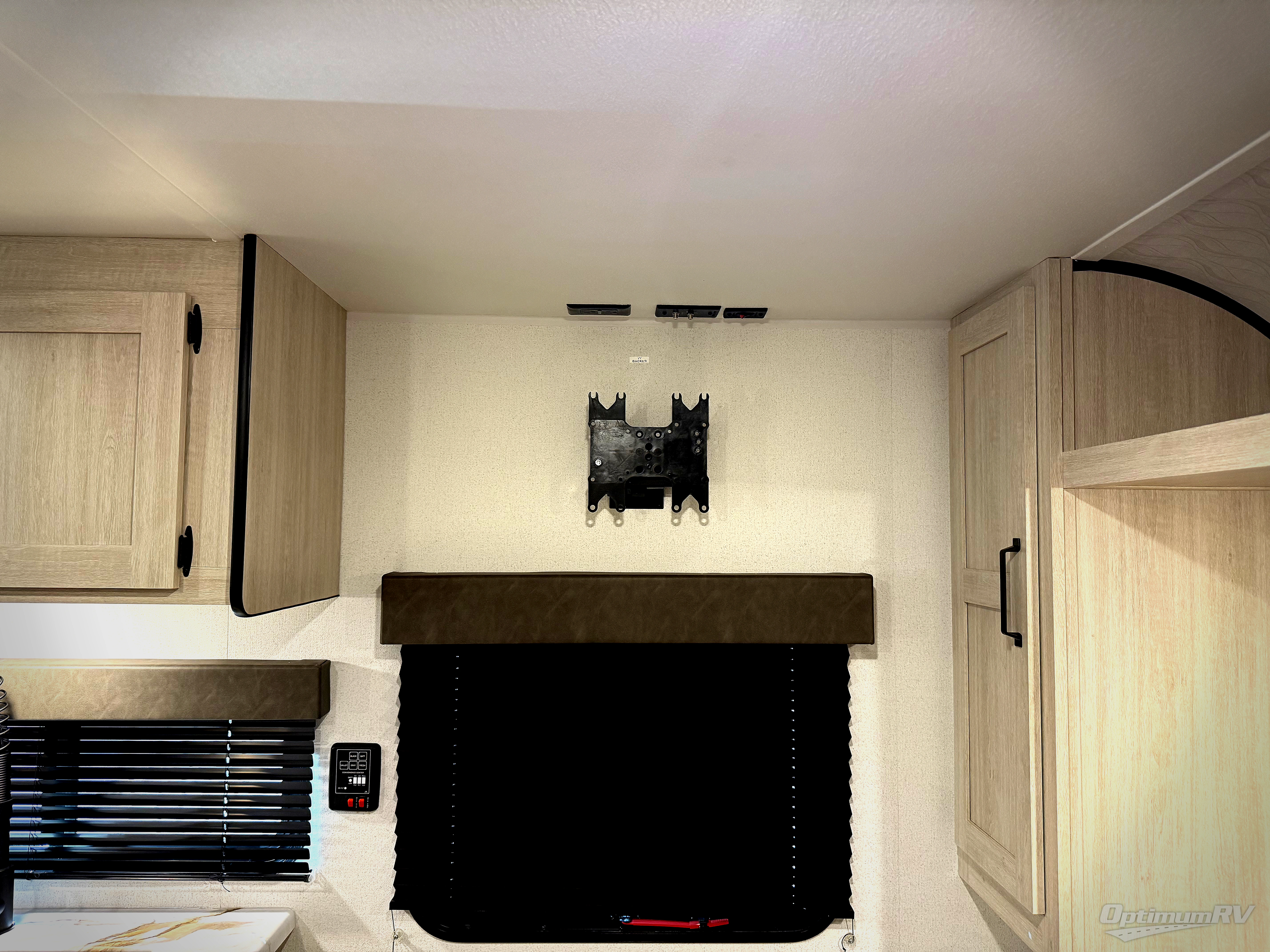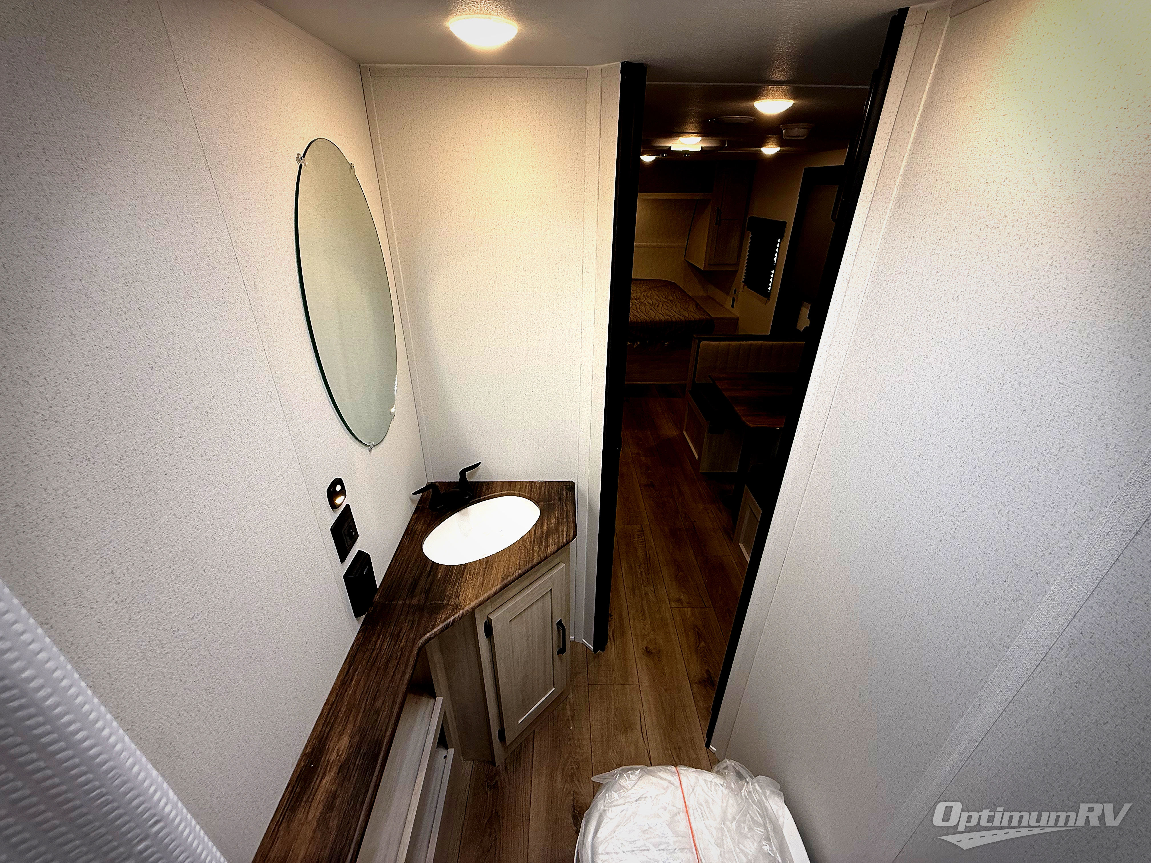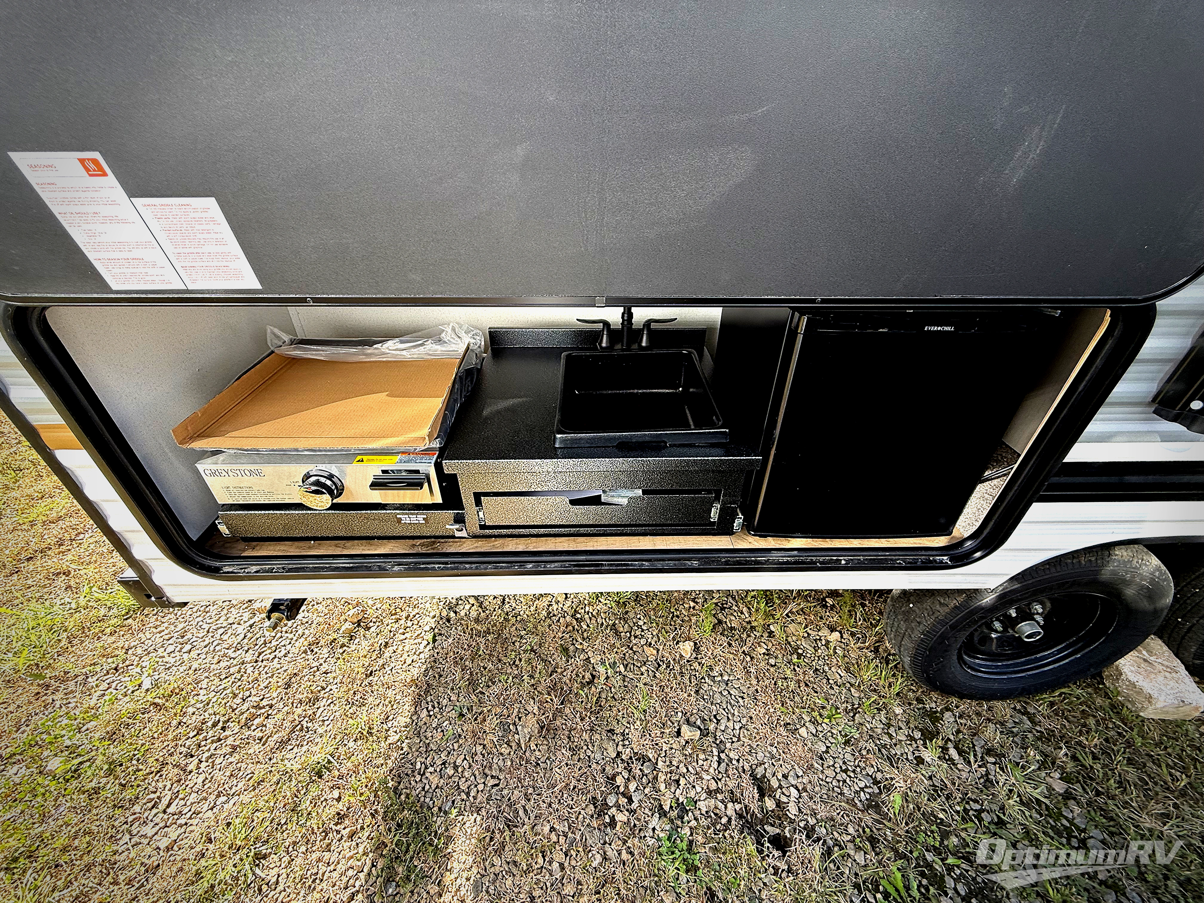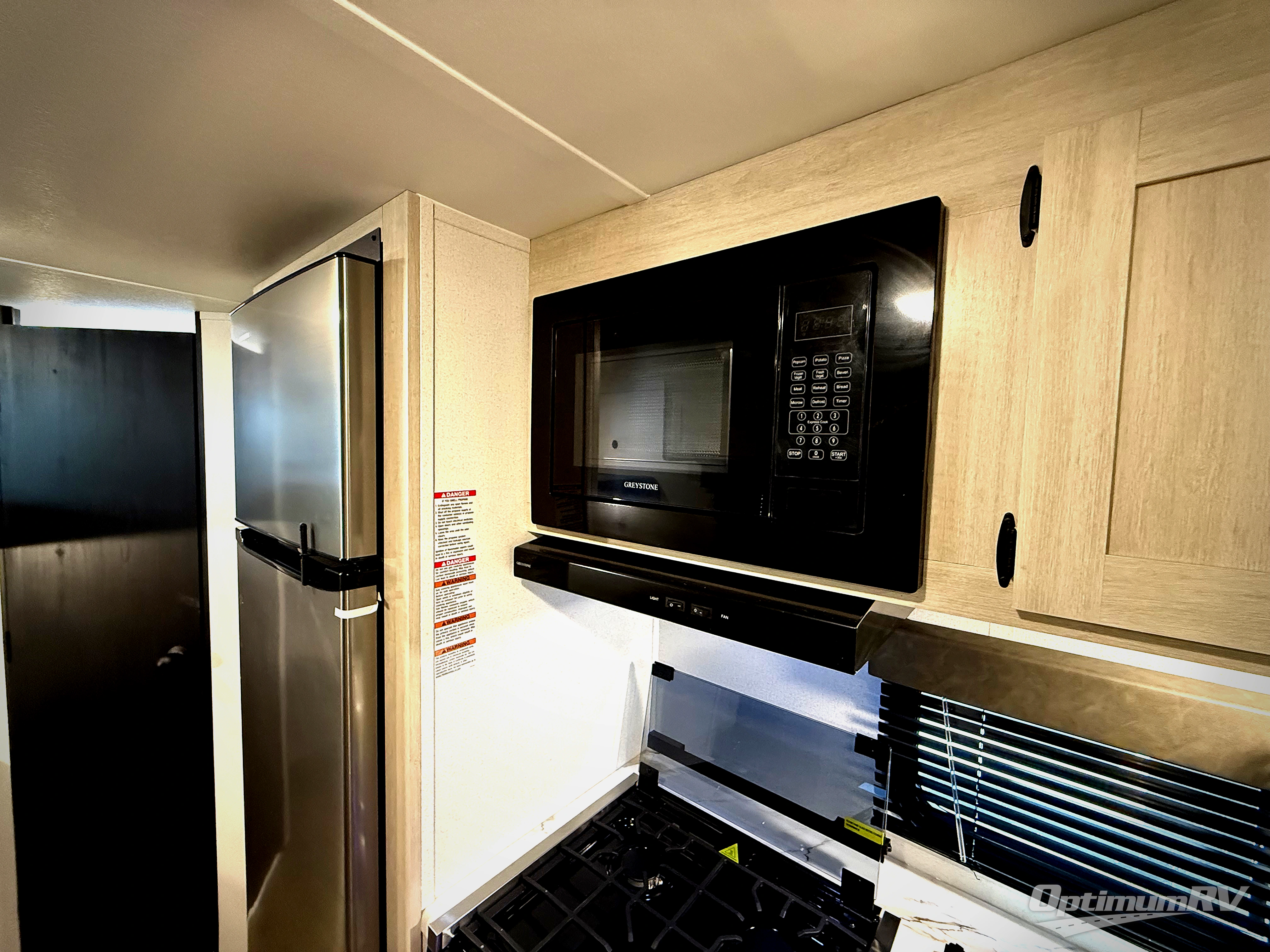 If you're looking for more sleeping space, this double axle unit features double-size bunks with storage under the bunks for your bags. The full kitchen includes a stainless microwave and three burner cooktop to make meals, plus a pantry and 12V refrigerator for food storage. And an optional outside mini kitchen with a griddle can be added if you enjoy cooking outdoors! Up front, you'll find a 60" x 74" queen bed with an optional Murphy bed if you're needing more seating space during the day!
