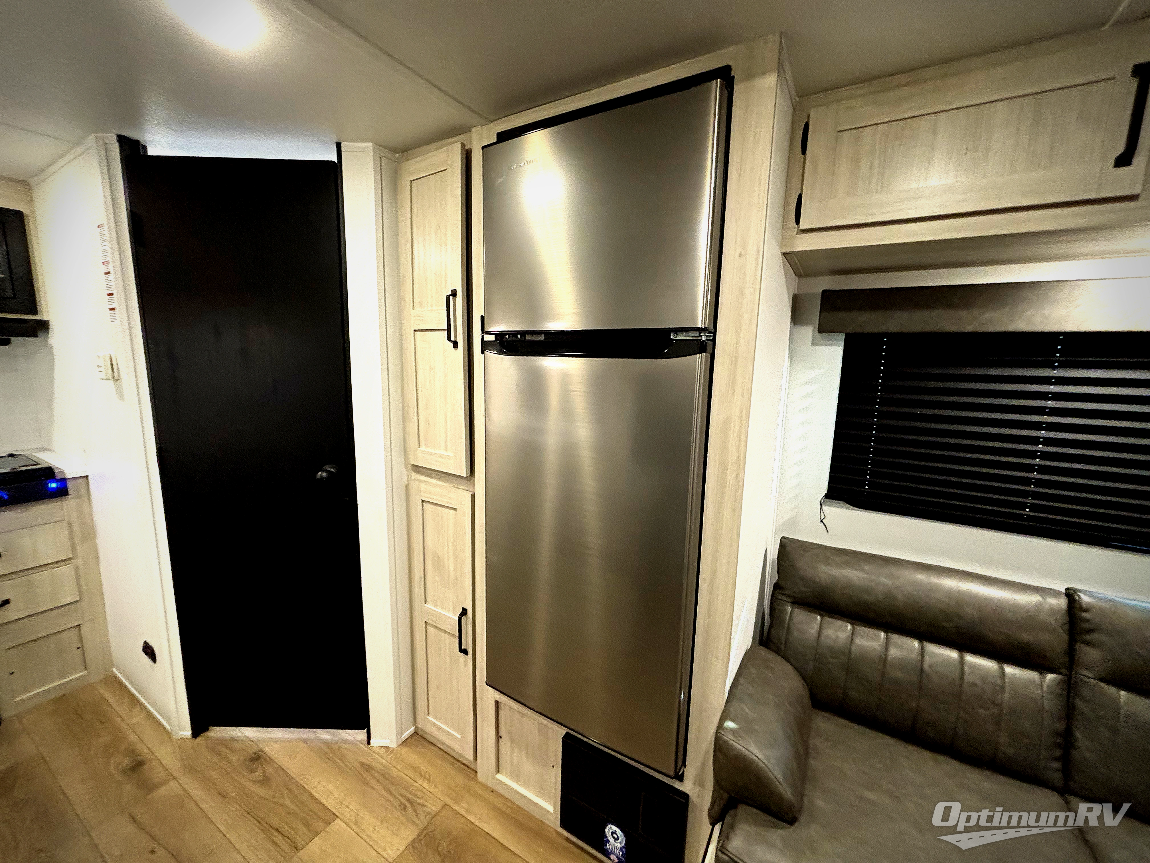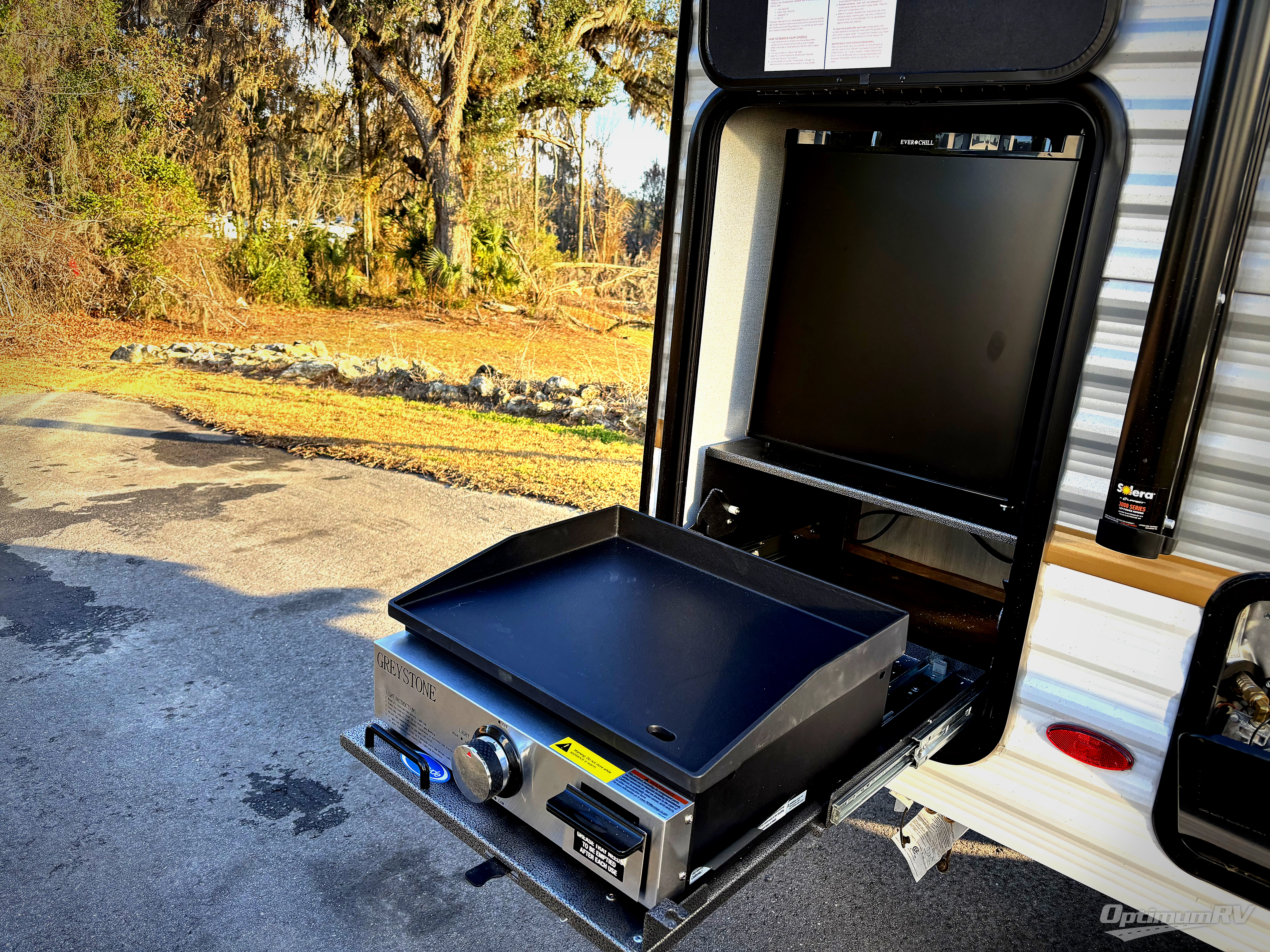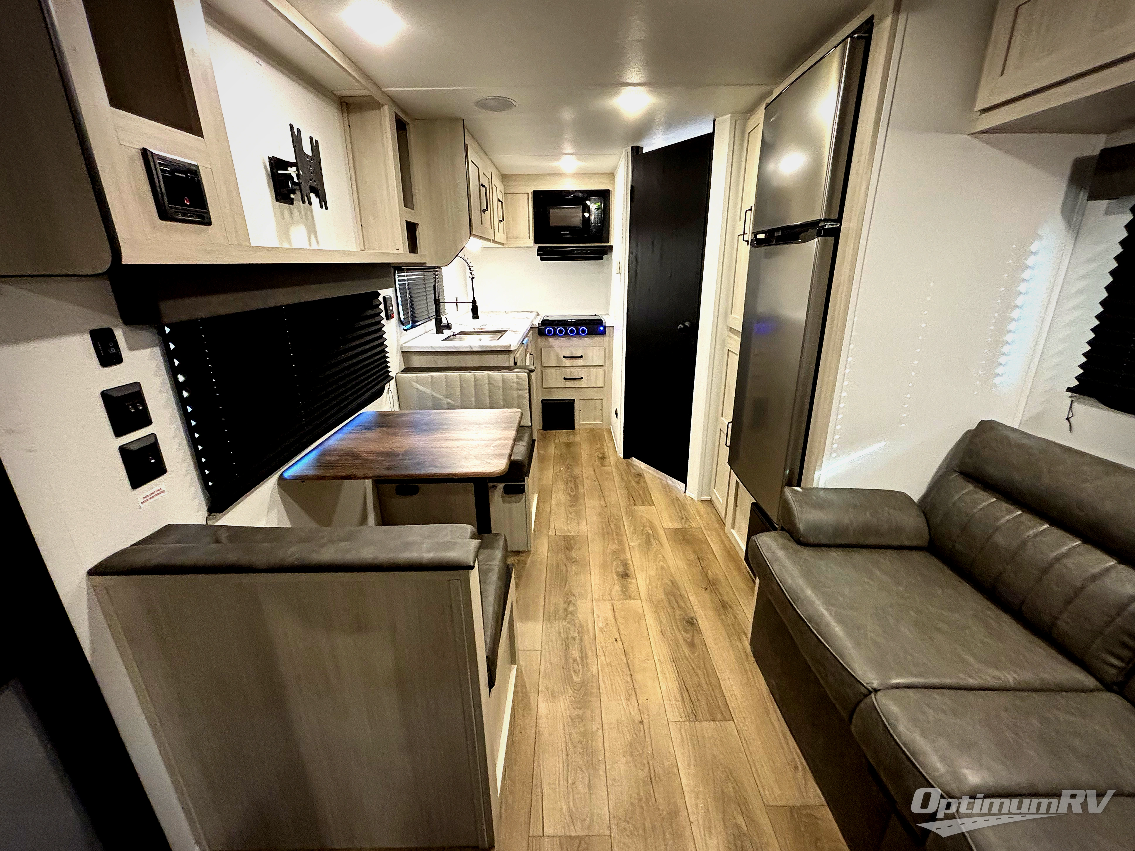 Escape the hustle and bustle of city life for weekends at the campground in this rear living travel trailer. There is a sofa to relax on across from a booth dinette, both of which will provide sleeping space for guests. Prepare all your meals on the three-burner cooktop or in the microwave in the rear corner kitchen, then keep leftovers in the 12V refrigerator. When you're ready to get some shut eye, the front 60" x 74" RV queen bed is sure to bring a great night's rest, and you'll find dual shirt closets to keep your clothes organized. This unit also includes outside storage plus an optional micro kitchen with a refrigerator and grill!