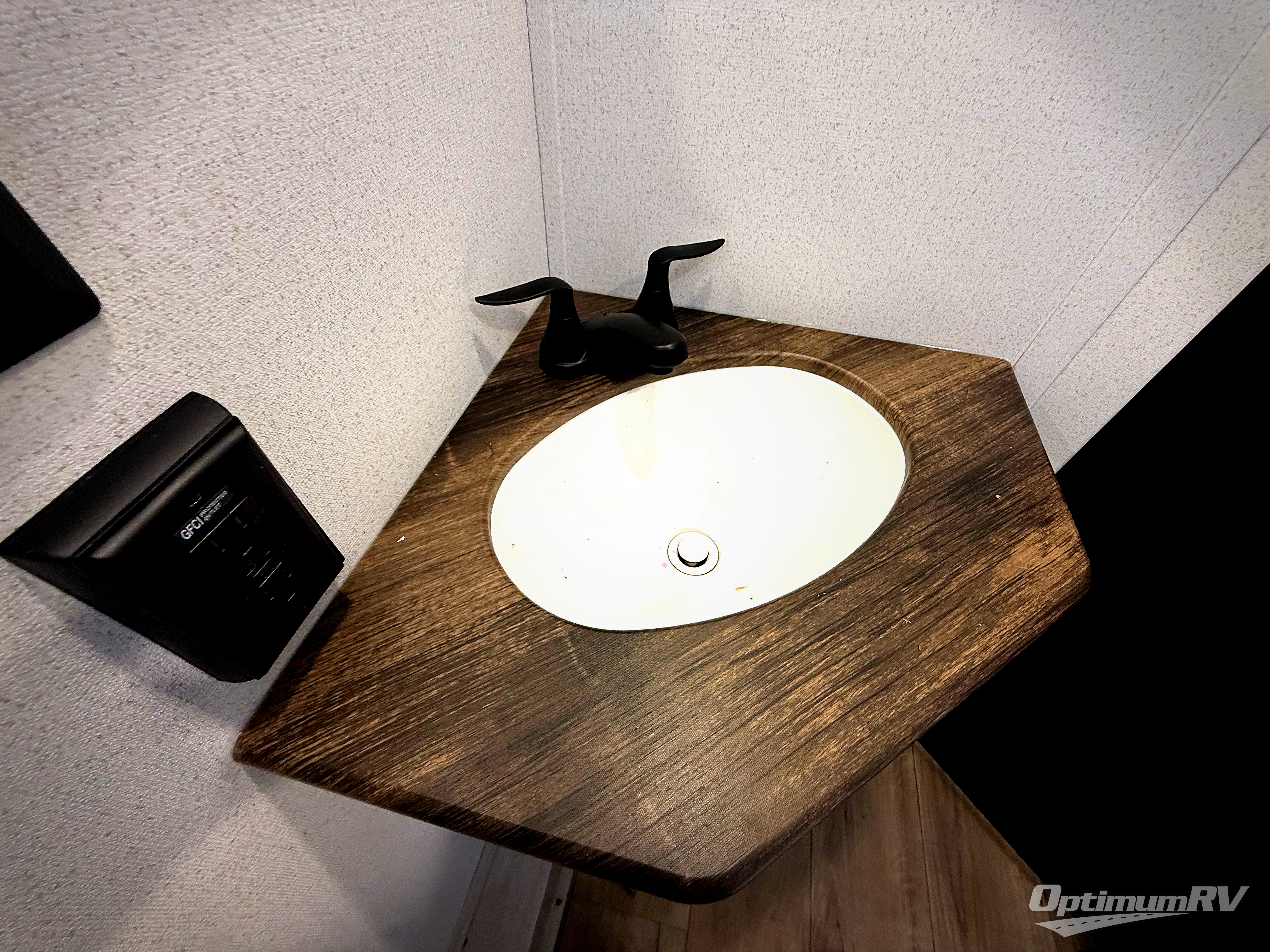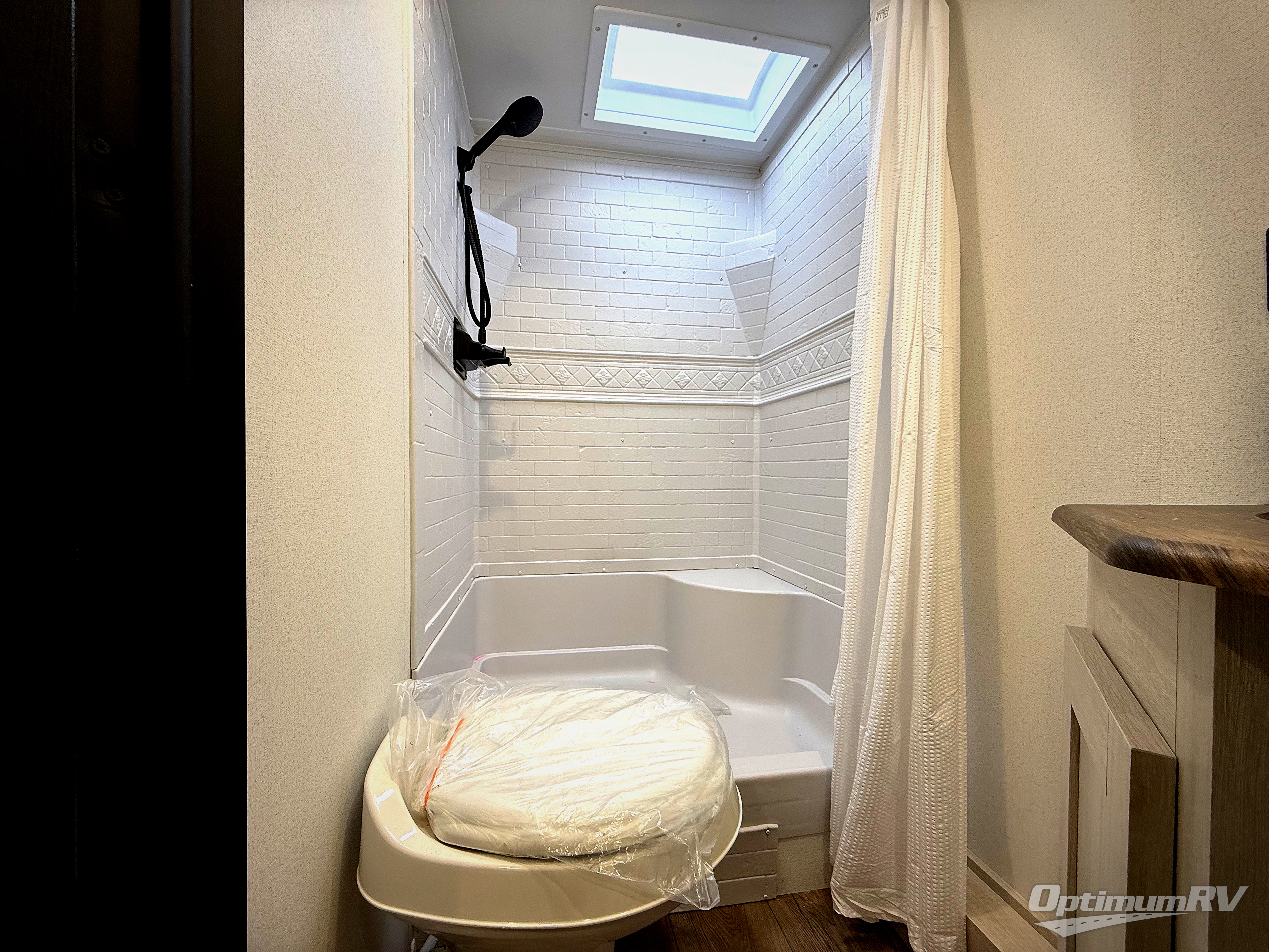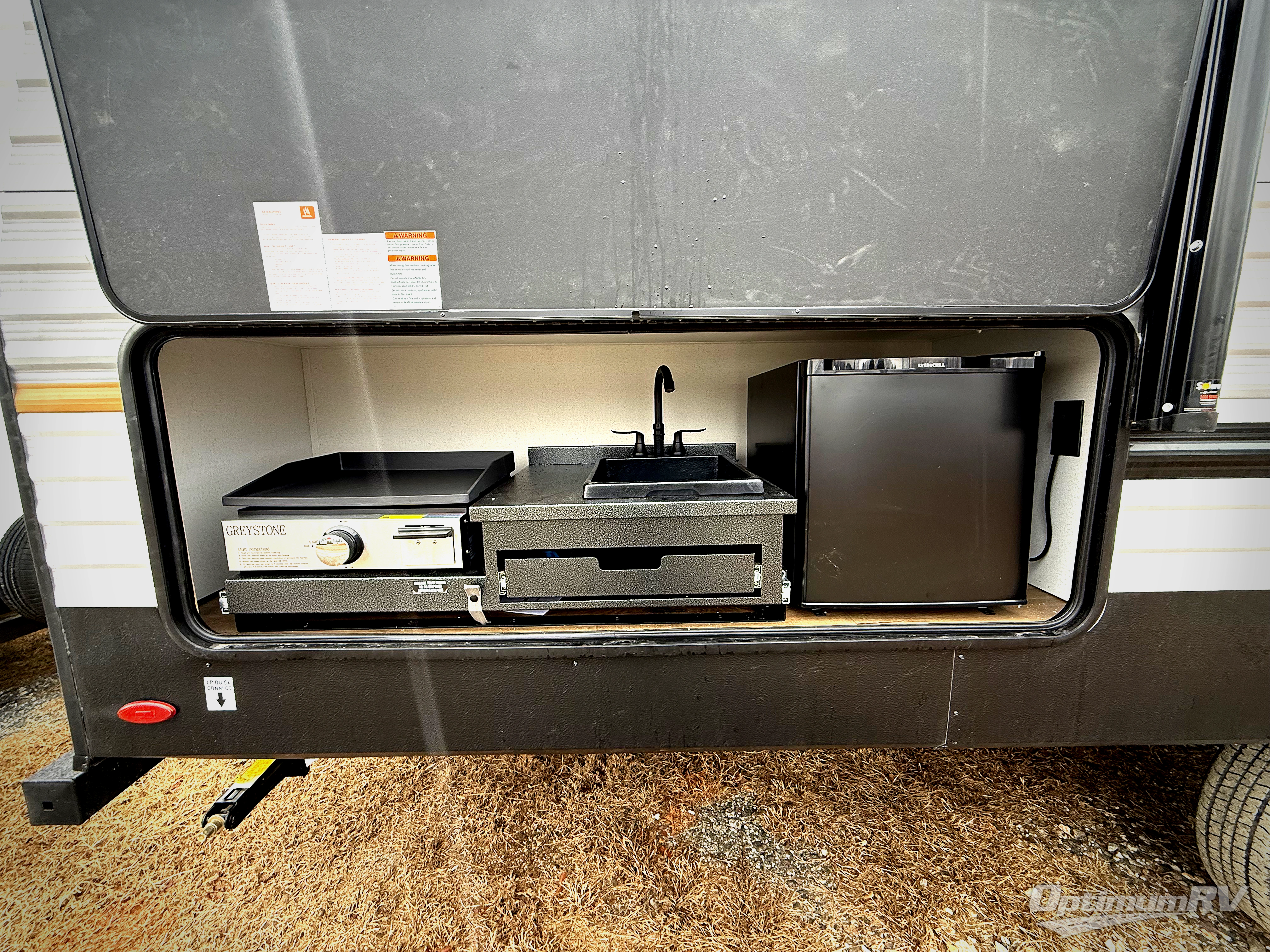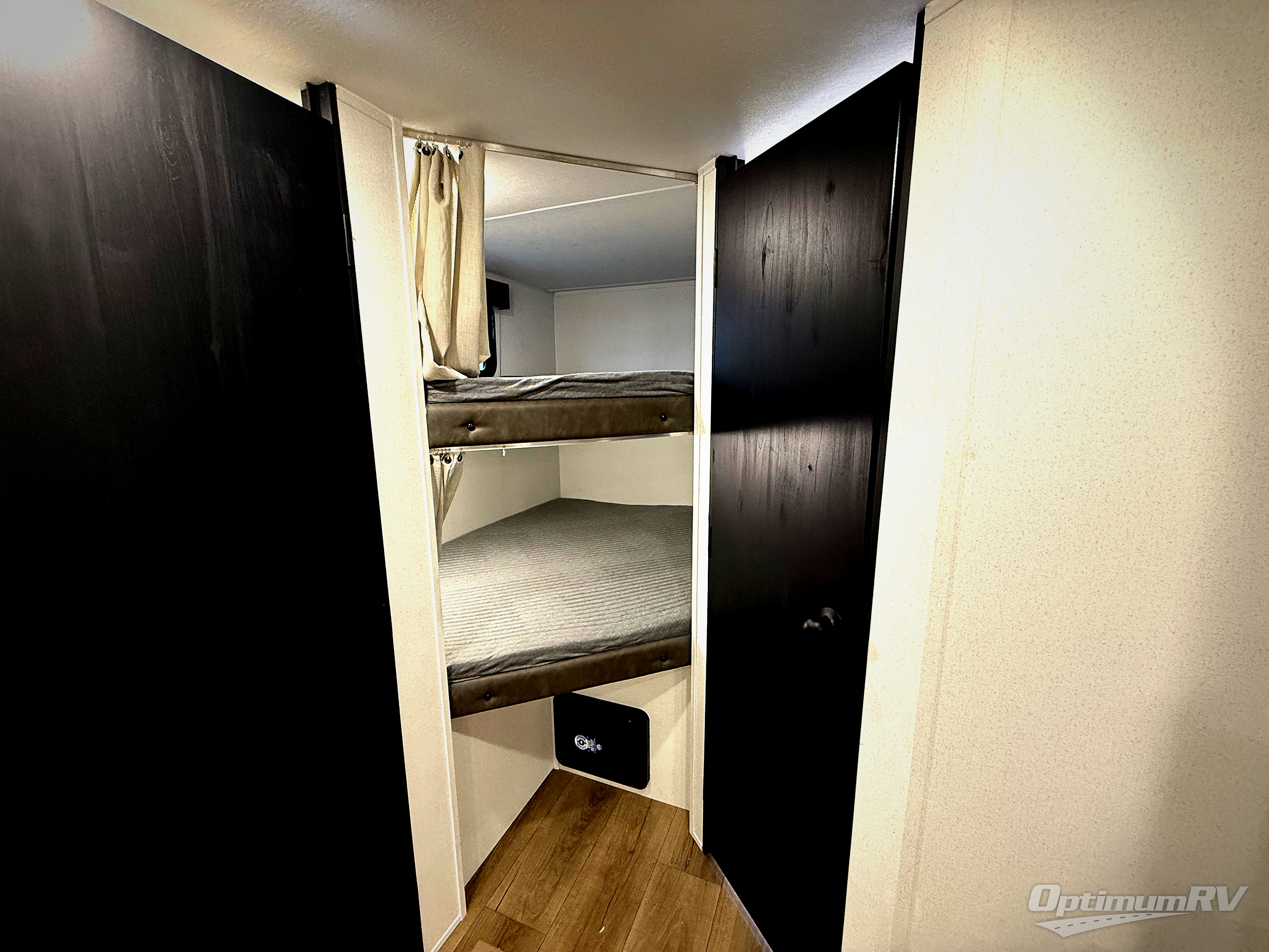 If you're looking for more space, this double axle unit features a large slide so you can walk about freely. Here, you'll find the booth dinette and sofa, which sit across from the optional TV if you want to enjoy movie nights. The full kitchen includes a microwave and three burner cooktop to make meals, plus a pantry and 12V refrigerator for food storage. There is even washer and dryer prep in the pantry if you choose to add these appliances. An optional outside mini kitchen can be added if you enjoy cooking outdoors! The kids or your guests will love the double-size bunks, and the full bath right beside the bunks includes a shower a seat for added comfort.