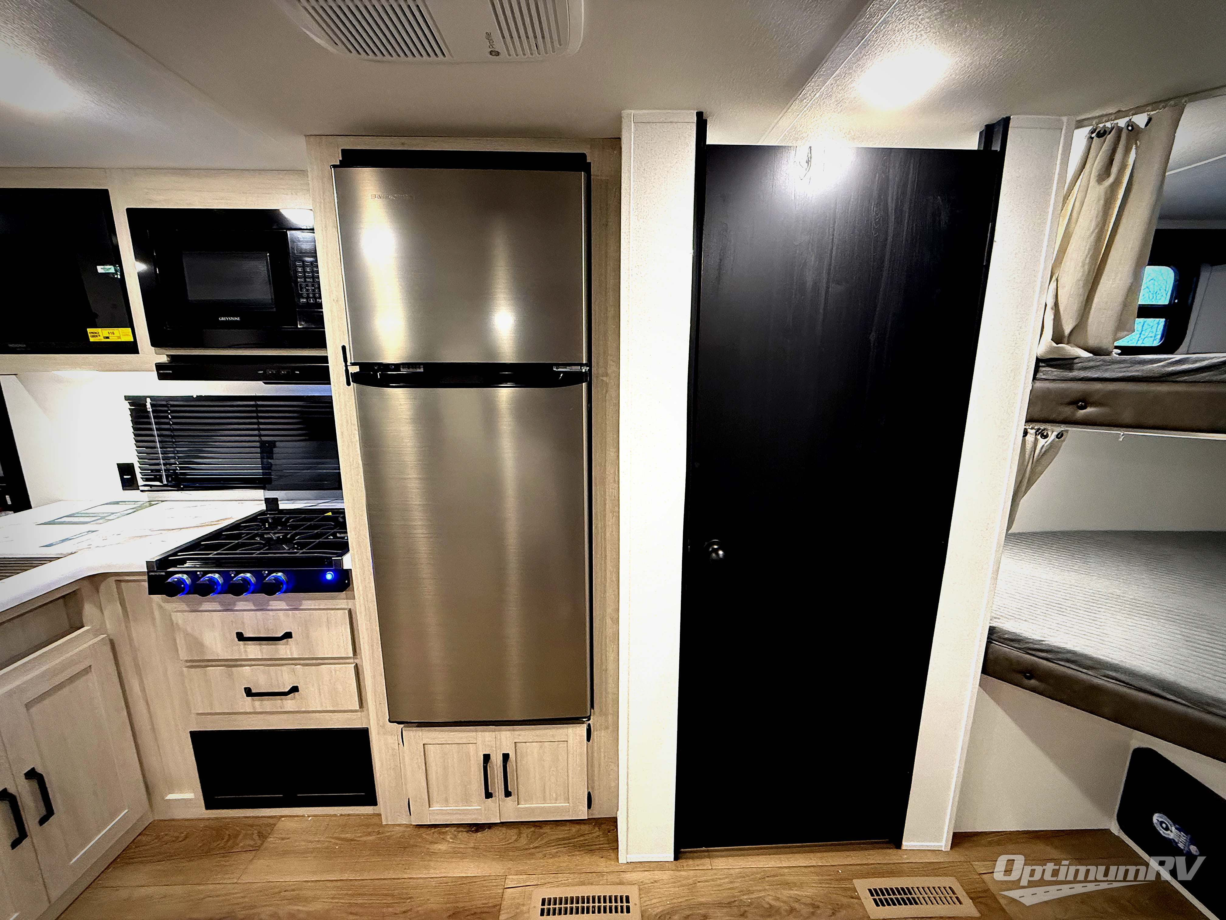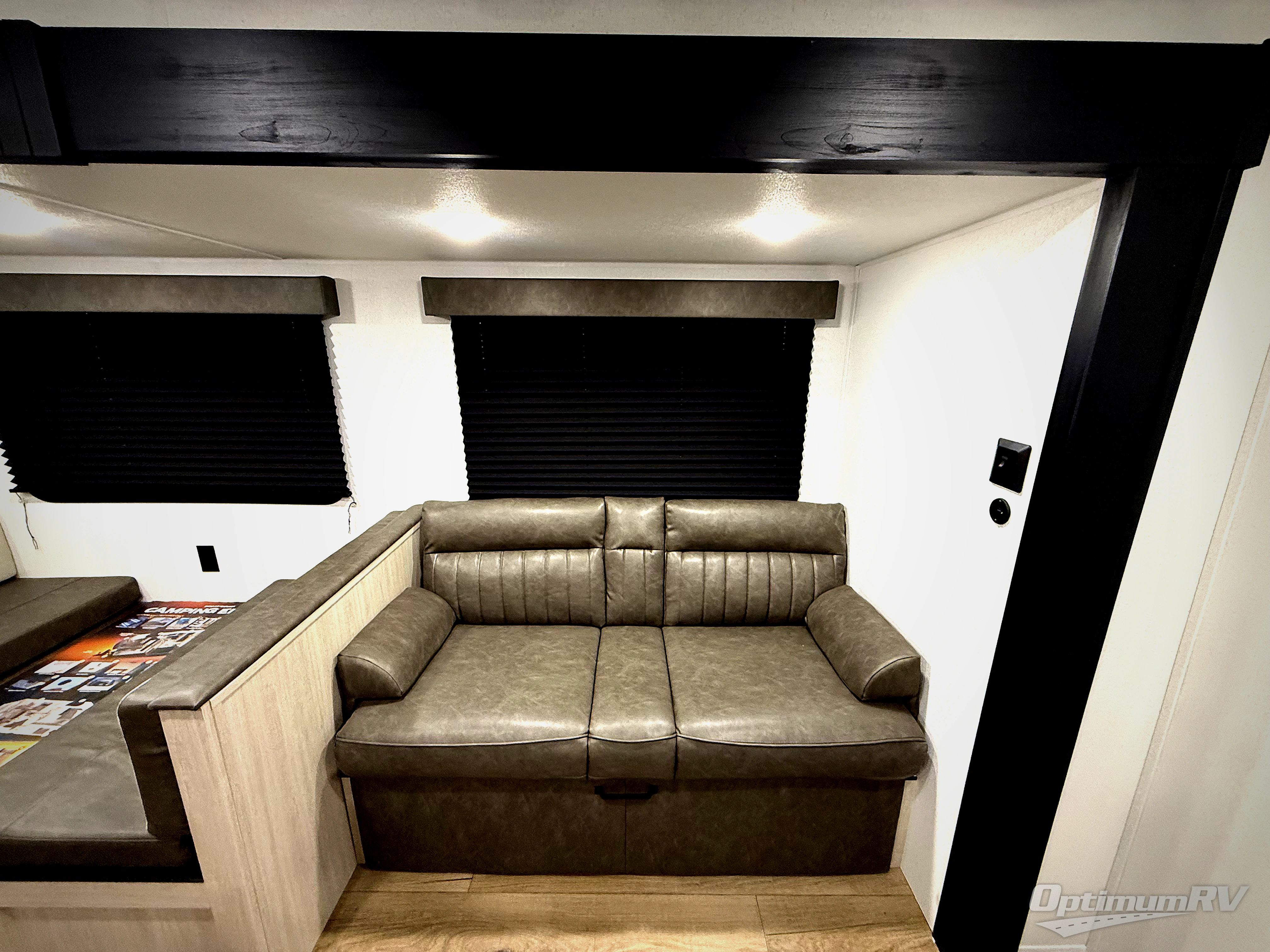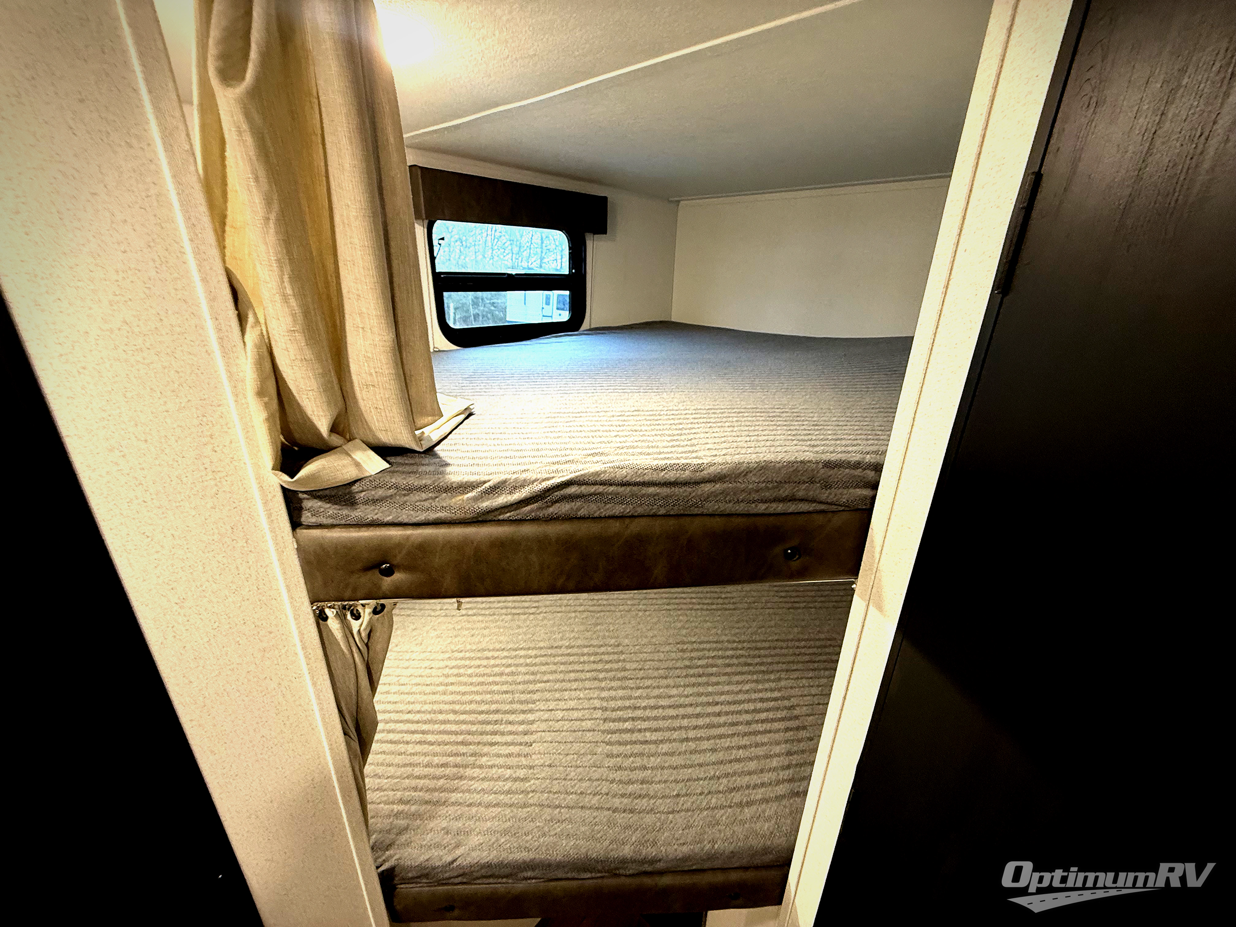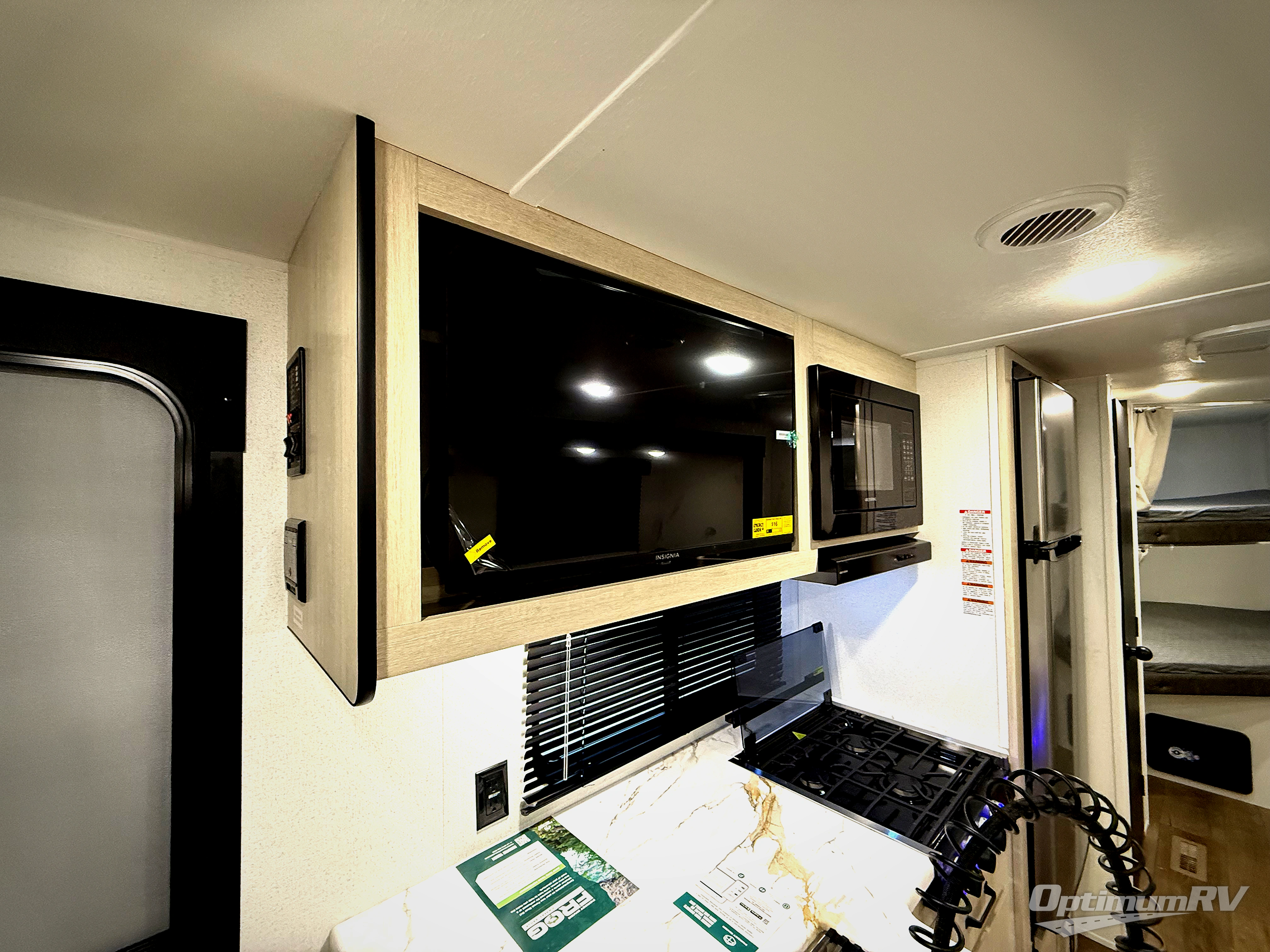If you're looking for more space, this double axle unit features a large slide so you can walk about freely. Here, you'll find the booth dinette and sofa, which sit across from the optional TV if you want to enjoy movie nights. The full kitchen includes a microwave and three burner cooktop to make meals, plus a pantry and 12V refrigerator for food storage. There is even washer and dryer prep in the pantry if you choose to add these appliances. An optional outside mini kitchen can be added if you enjoy cooking outdoors! The kids or your guests will love the double-size bunks, and the full bath right beside the bunks includes a shower a seat for added comfort.