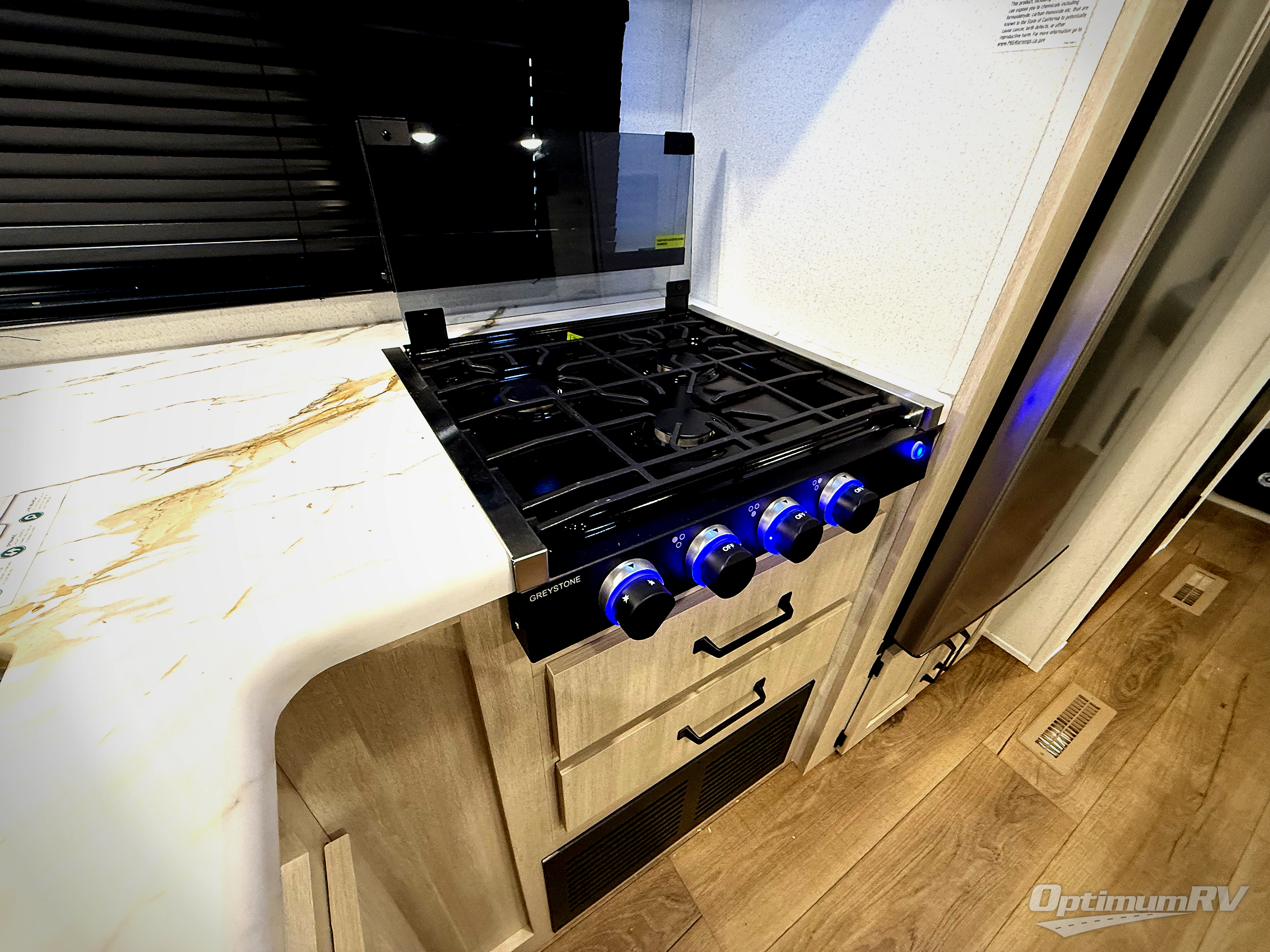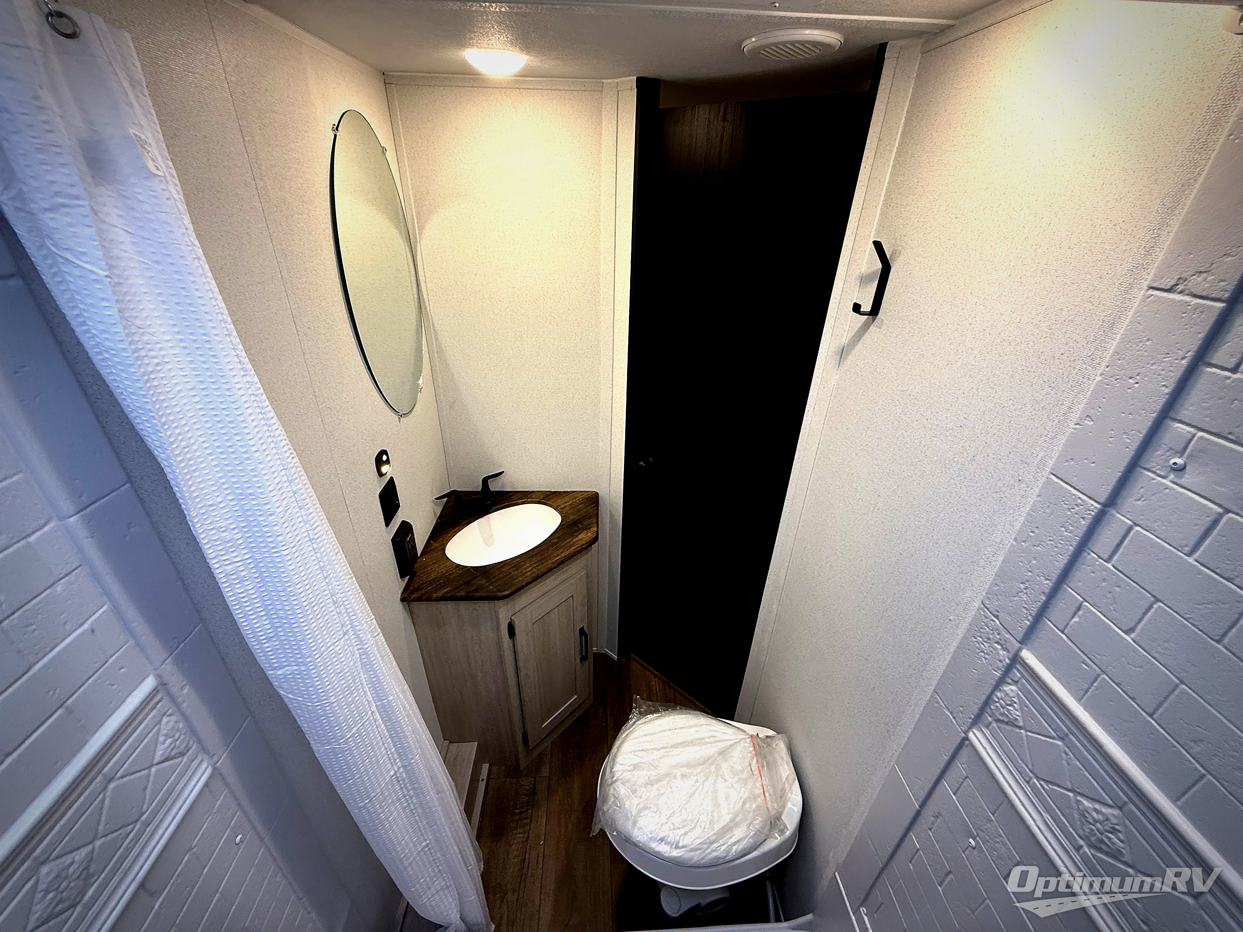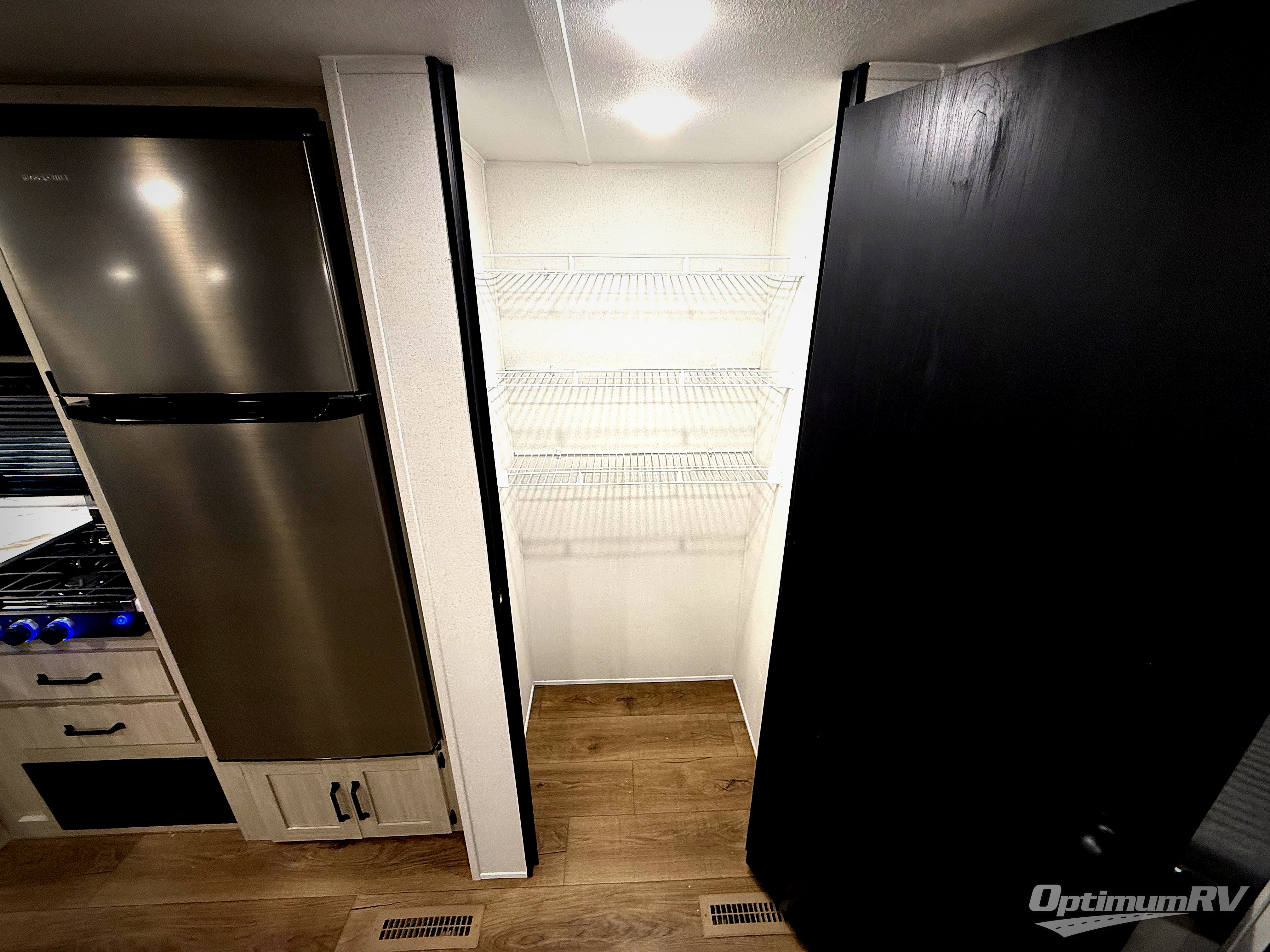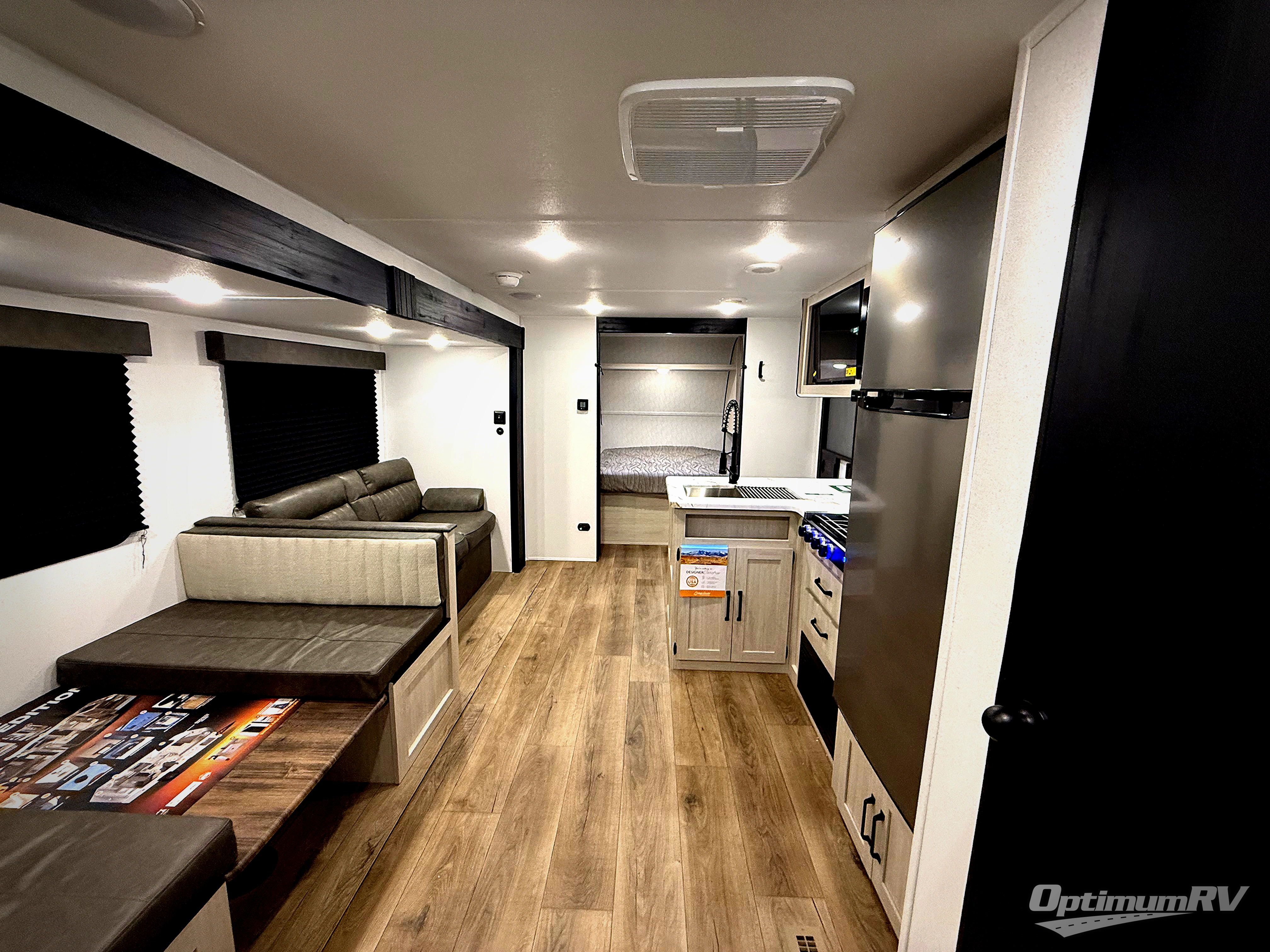 If you're looking for more space, this double axle unit features a large slide so you can walk about freely. Here, you'll find the booth dinette and sofa, which sit across from the optional TV if you want to enjoy movie nights. The full kitchen includes a microwave and three burner cooktop to make meals, plus a pantry and 12V refrigerator for food storage. There is even washer and dryer prep in the pantry if you choose to add these appliances. An optional outside mini kitchen can be added if you enjoy cooking outdoors! The kids or your guests will love the double-size bunks, and the full bath right beside the bunks includes a shower a seat for added comfort.