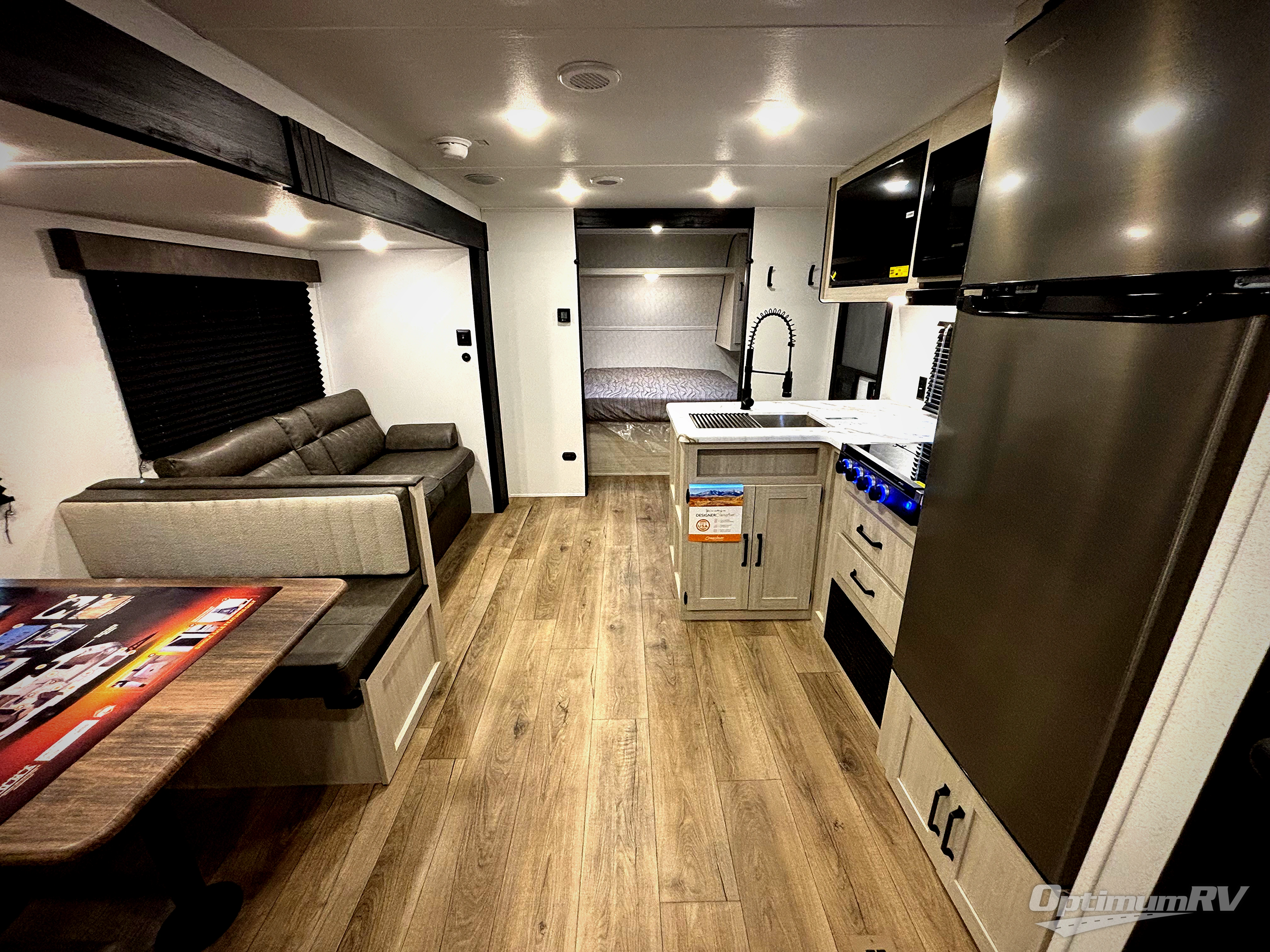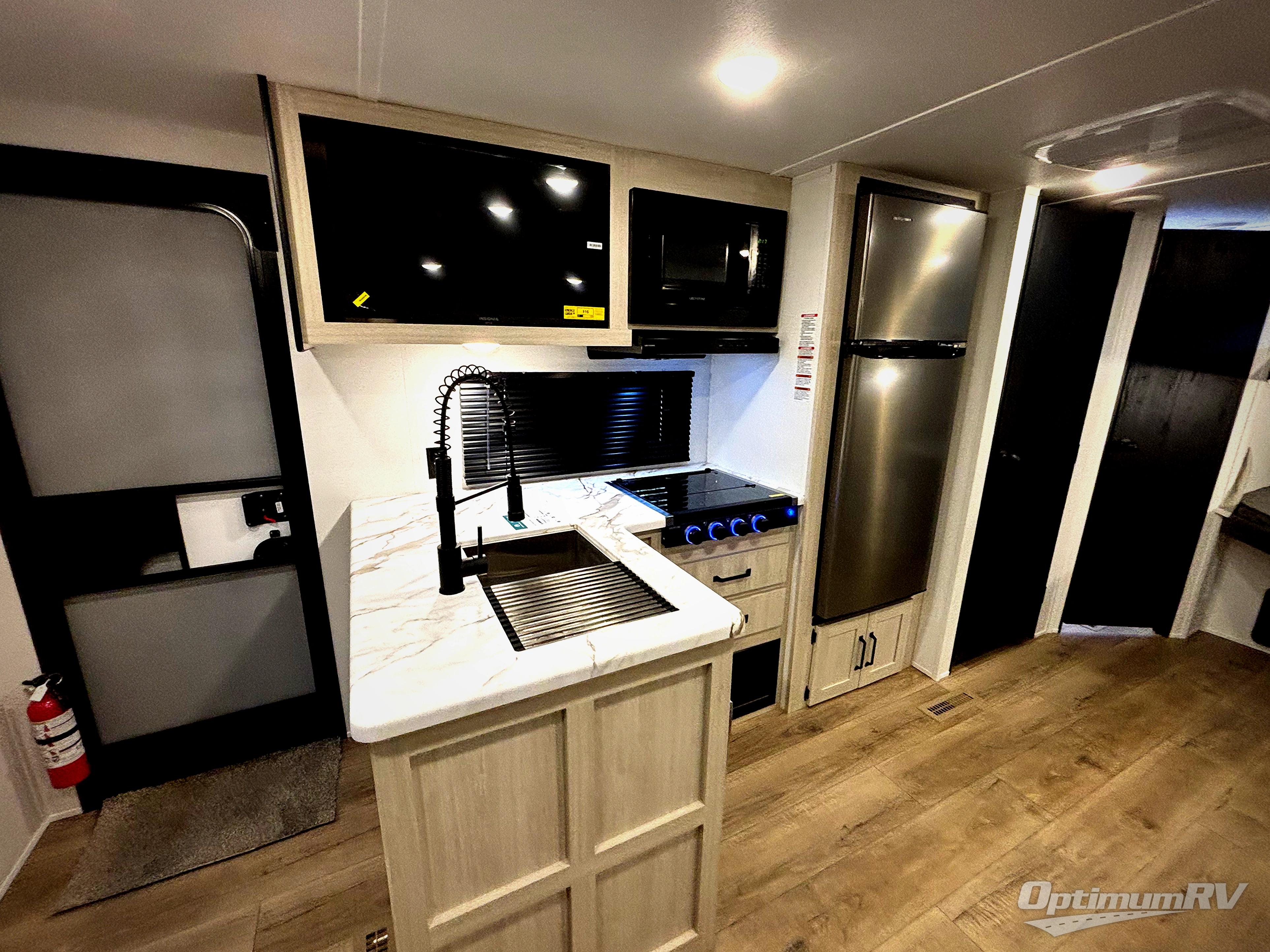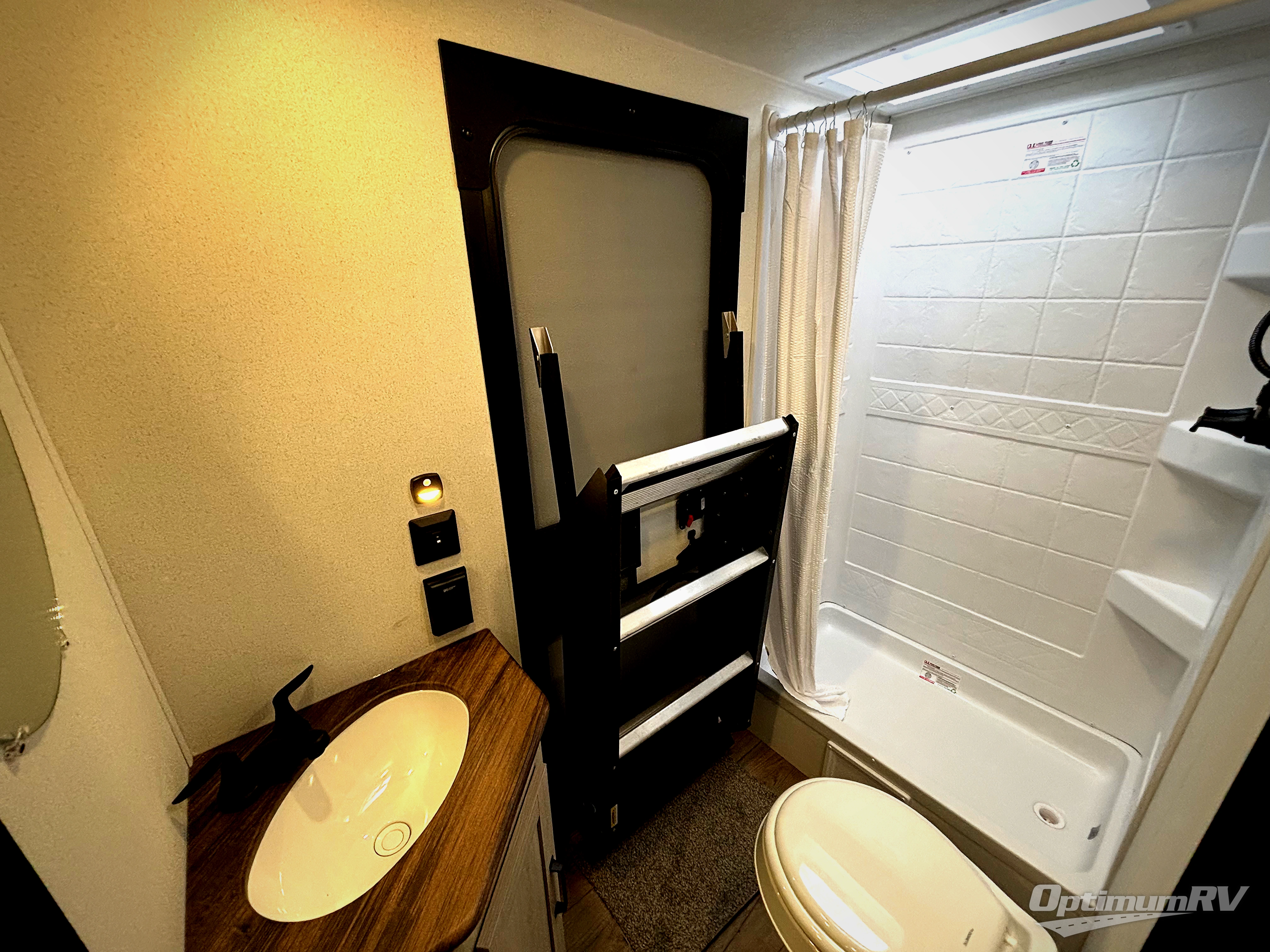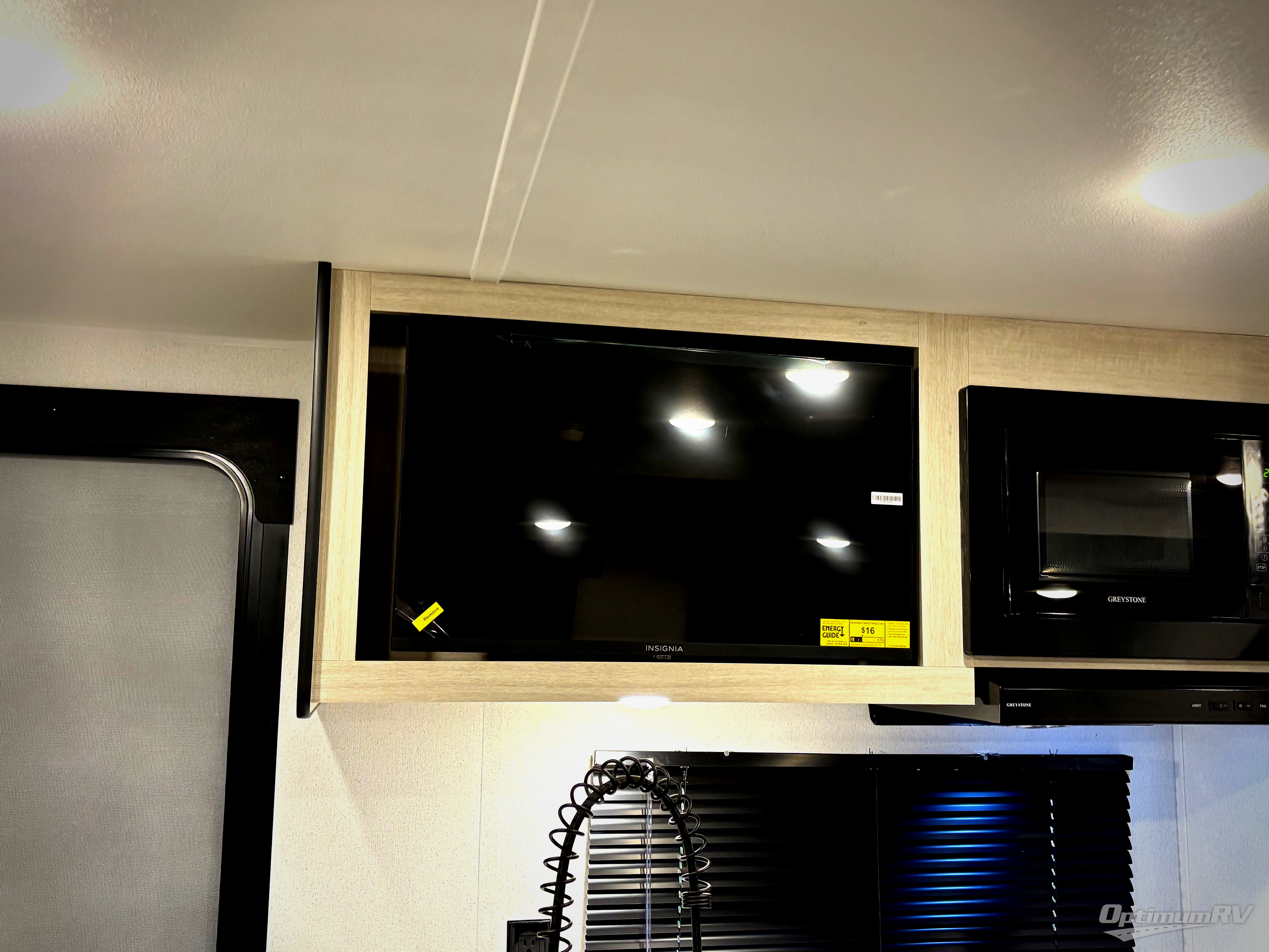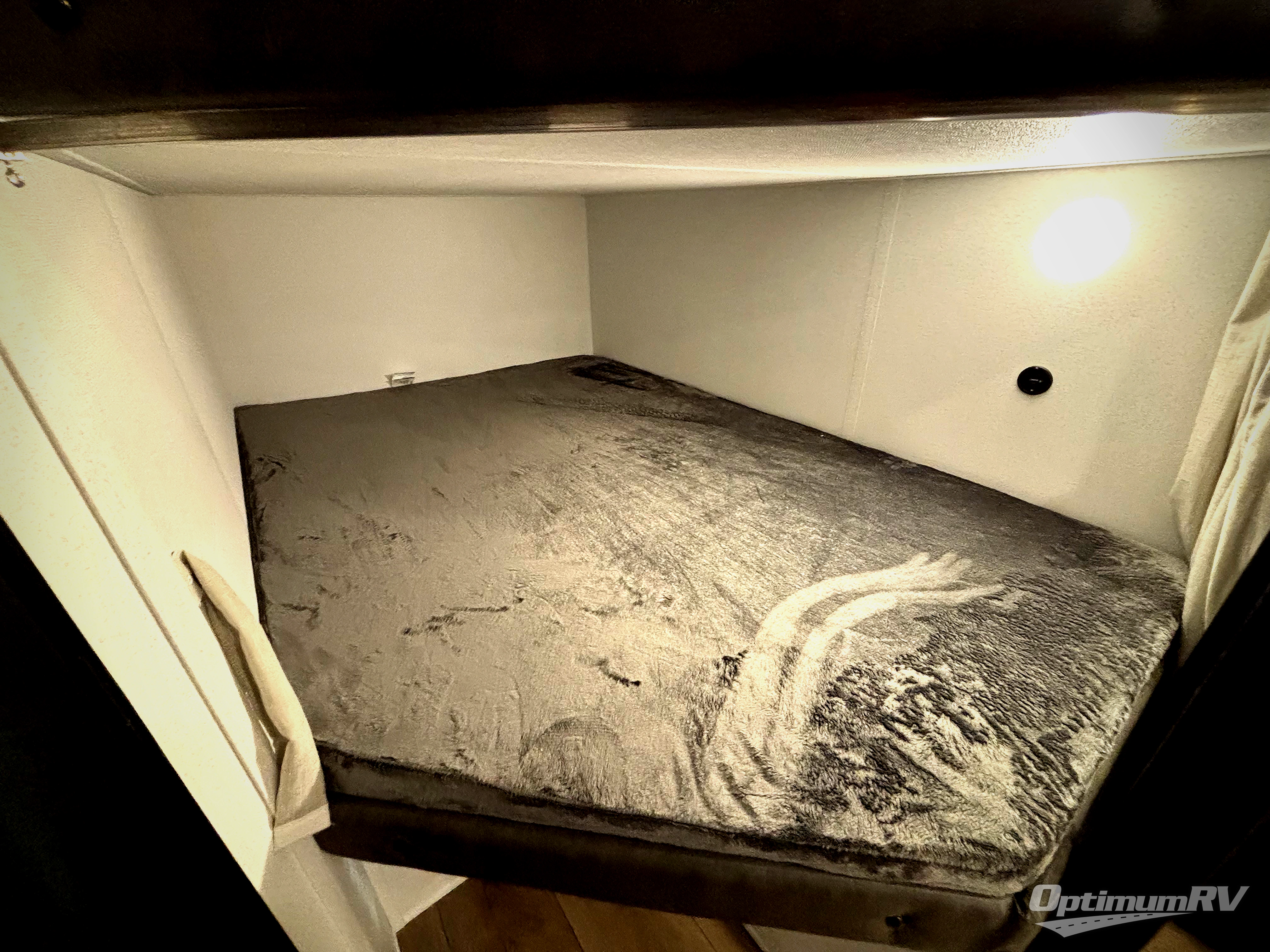 If you're looking for more space, this double axle unit features a large slide so you can walk about freely. Here, you'll find the booth dinette and sofa, which sit across from the optional TV if you want to enjoy movie nights. The full kitchen includes a microwave and three burner cooktop to make meals, plus a pantry and 12V refrigerator for food storage. There is even washer and dryer prep in the pantry if you choose to add these appliances. The kids or your guests will love the double-size bunks, and the full bath right beside the bunks includes one of the dual entry doors so you can easily get back out to the fun!