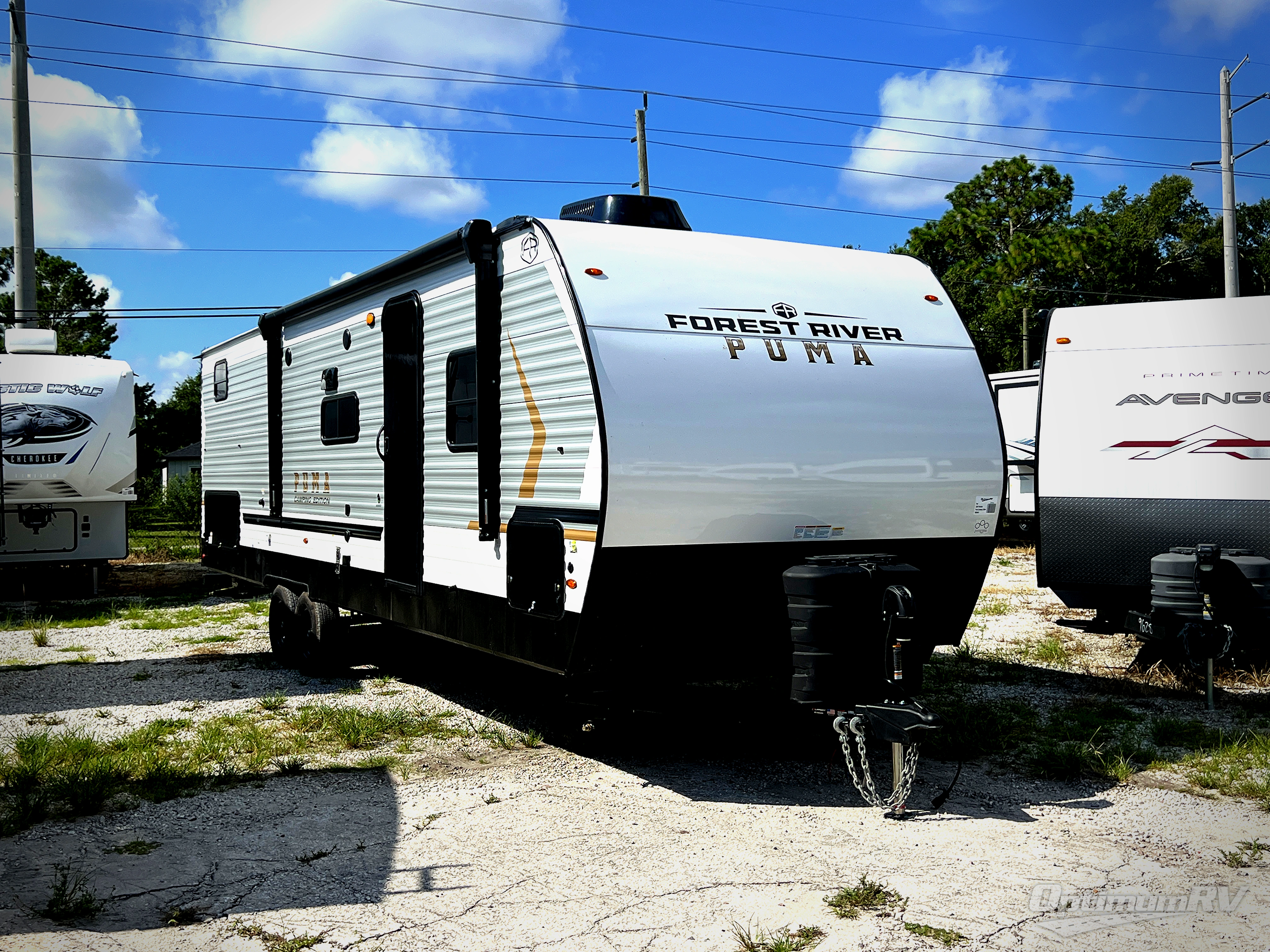 The Puma Camping Edition by Palomino offer an affordable travel trailer for rookie campers or seasoned RVers! They are built with 5/8" tongue and groove plywood flooring and a front diamond plate for added protection. There are also exterior clamp style door latches, back up camera prep, and 20 lb. LP bottles. Head inside to find Thermofoil countertops with a smooth drop edge, bedroom USB ports and outlets, and a GE appliance and kitchen package.