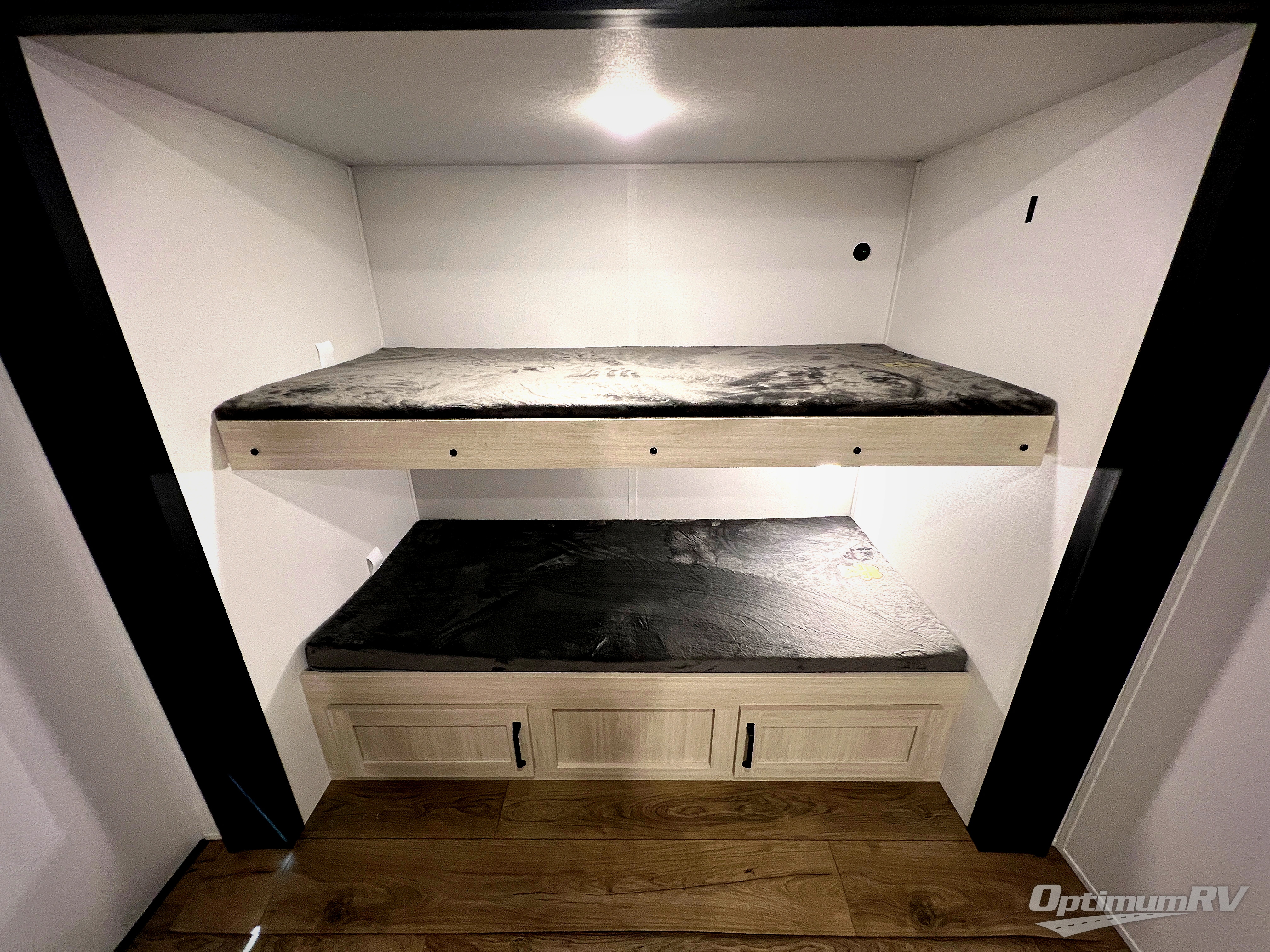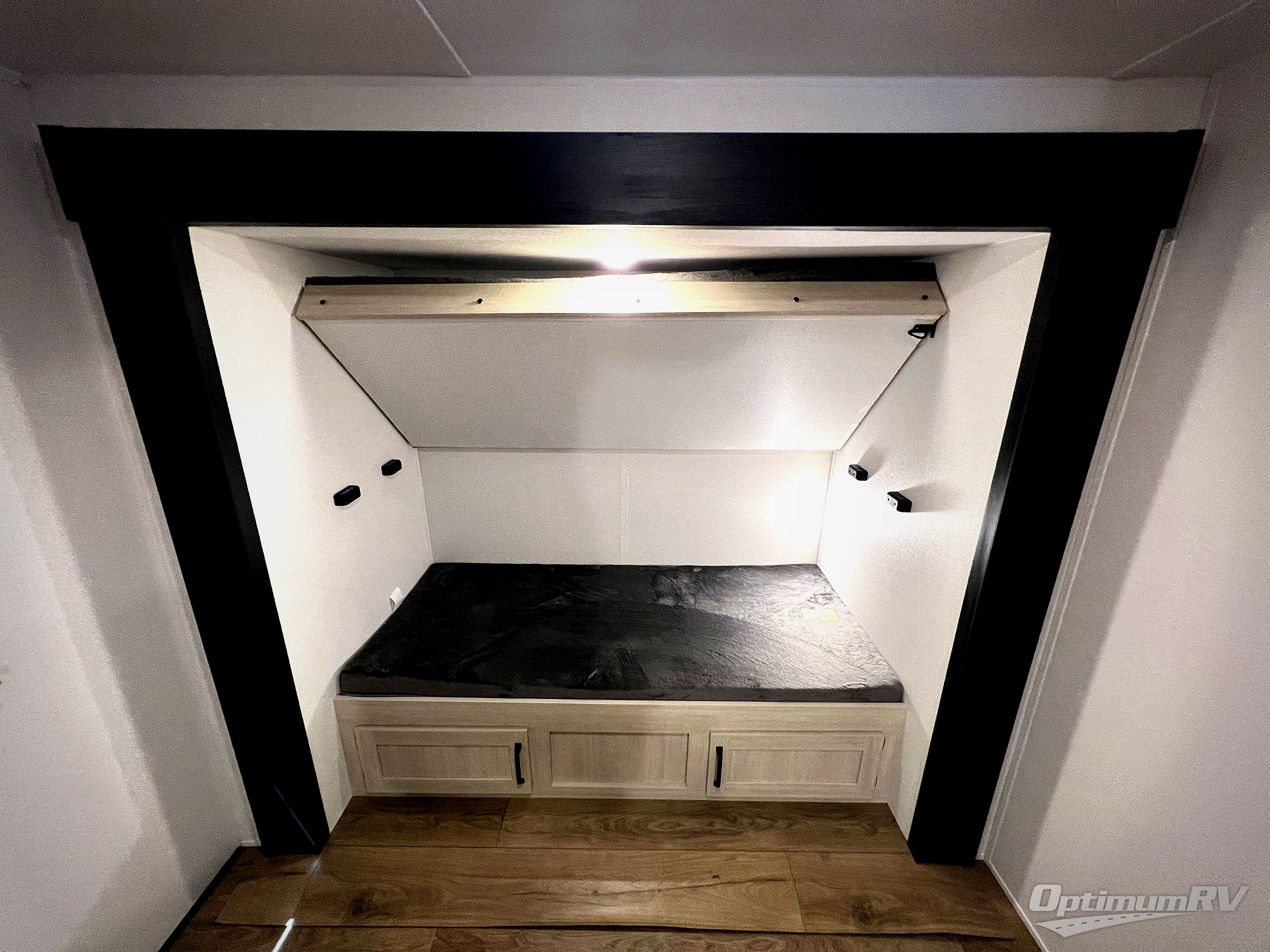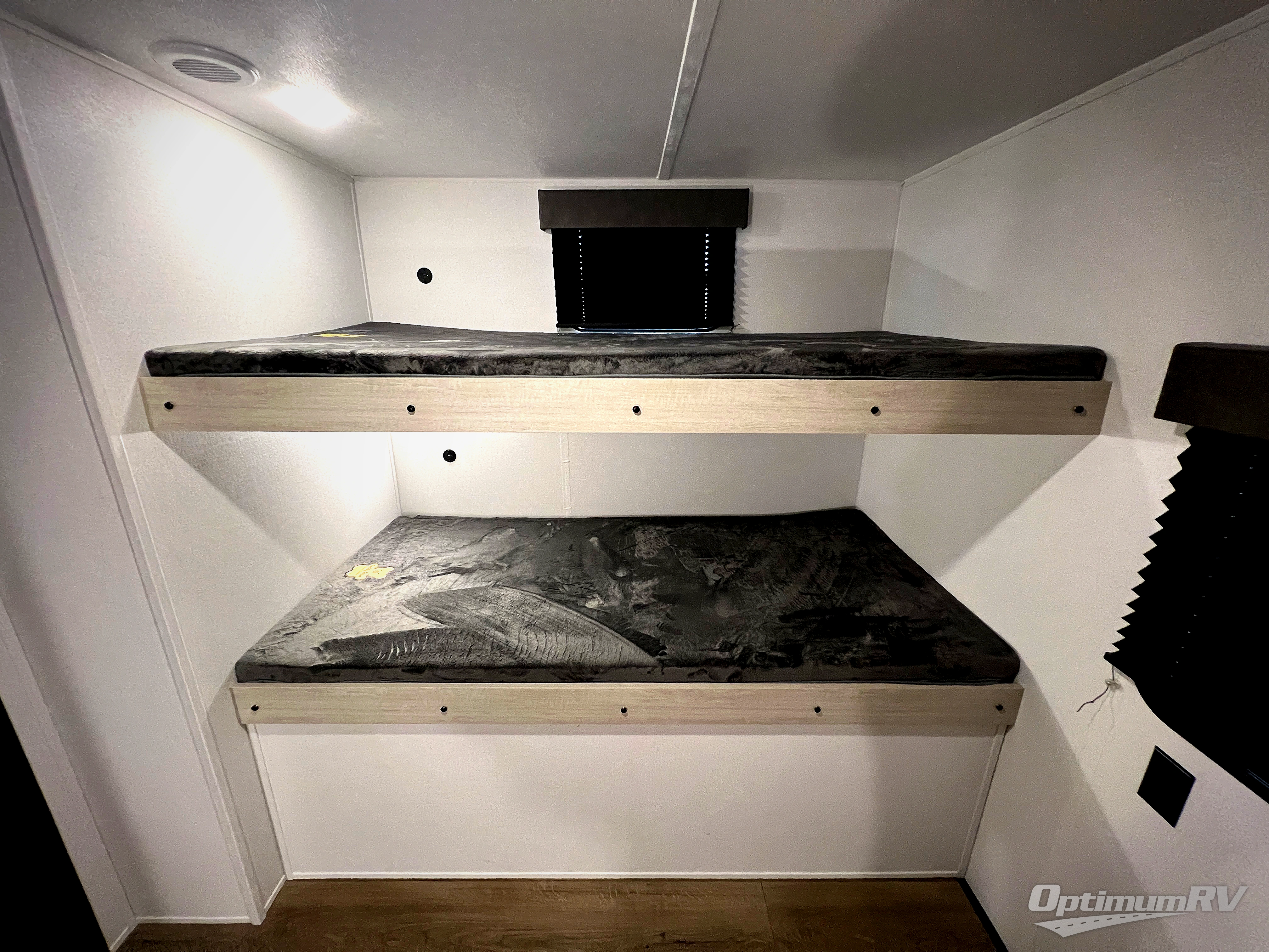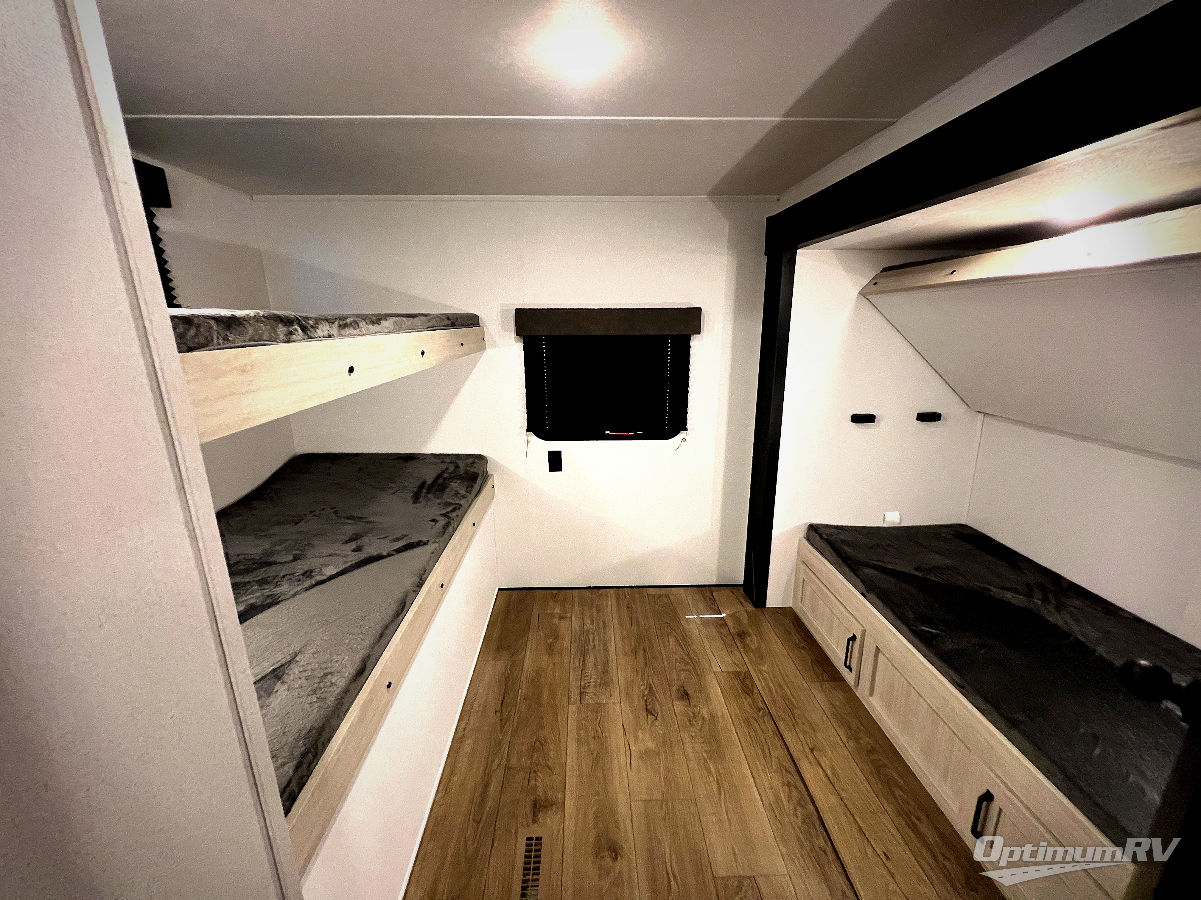 If you're looking for more space, this double axle, double slide out unit is perfect for your group of eight. Within the large slide in the living room, you'll find the booth dinette and sofa, which sit across from the optional TV if you want to enjoy movie nights. The full kitchen includes a stainless microwave and three burner cooktop to make meals, plus a pantry and 12V refrigerator for food storage. And an optional outside kitchen with a griddle can be added if you enjoy cooking outdoors! Your guests or littles are sure to enjoy the rear private bunkhouse that features a set of 38" x 76" bunks across from the third bunk and jiffy sofa within a slide out!