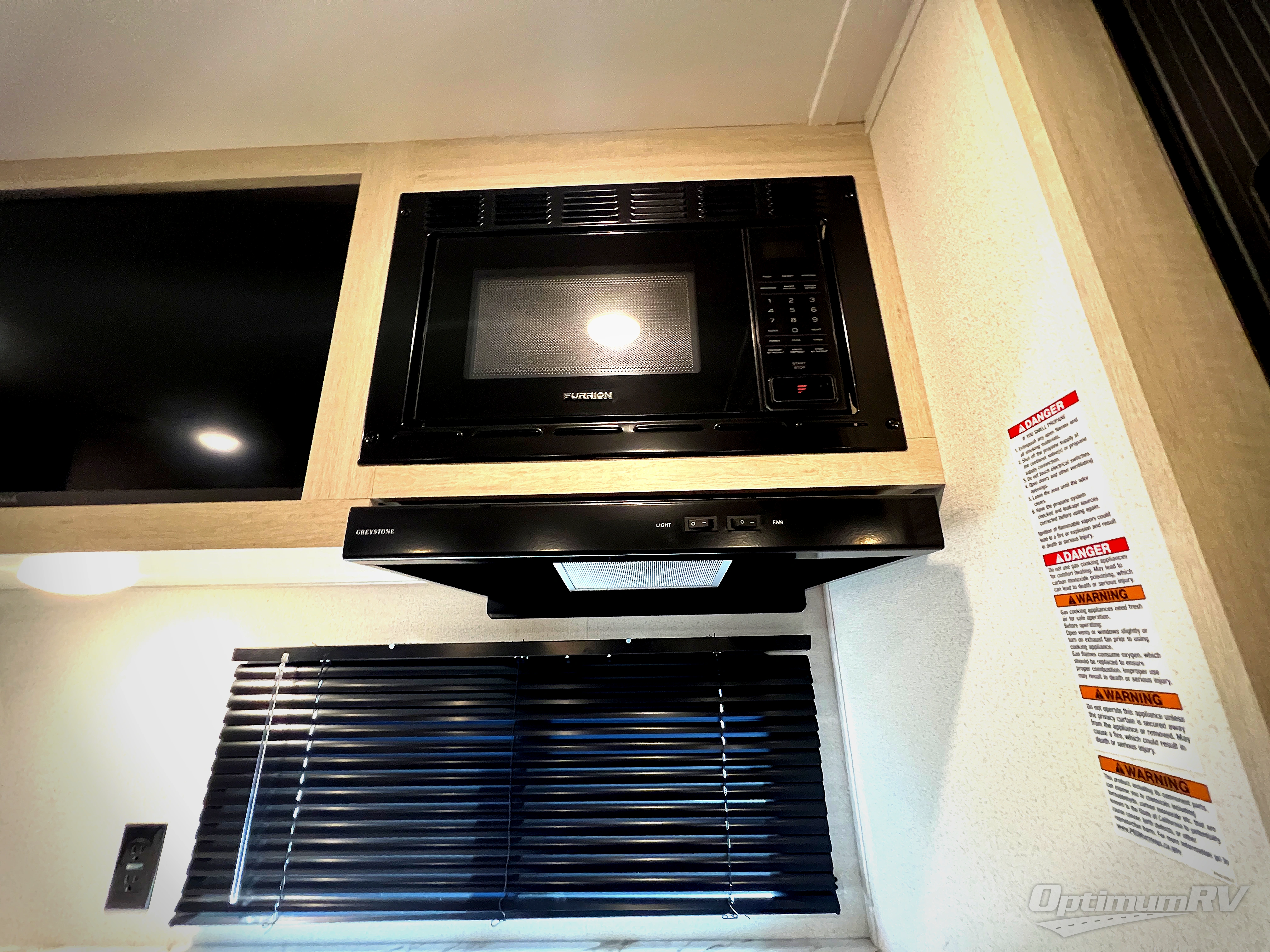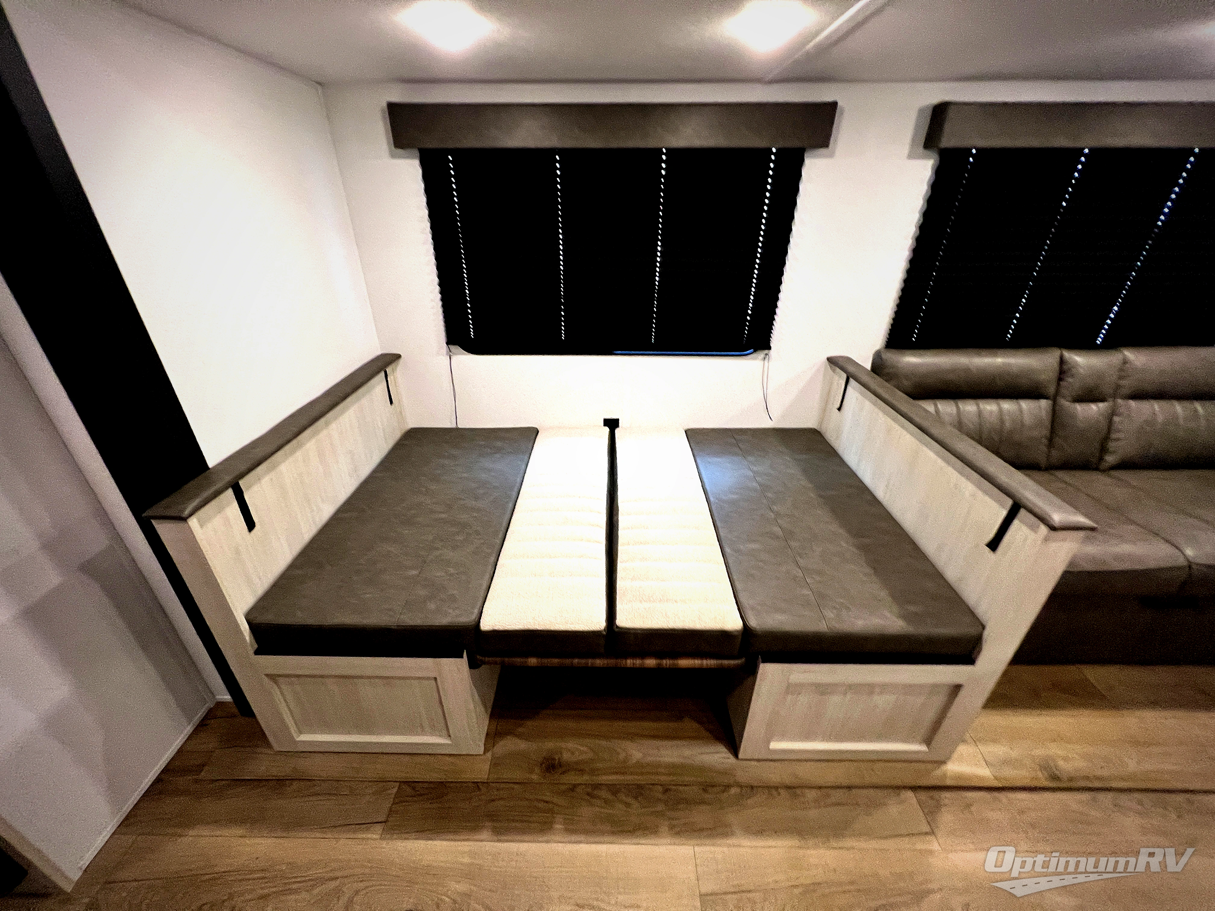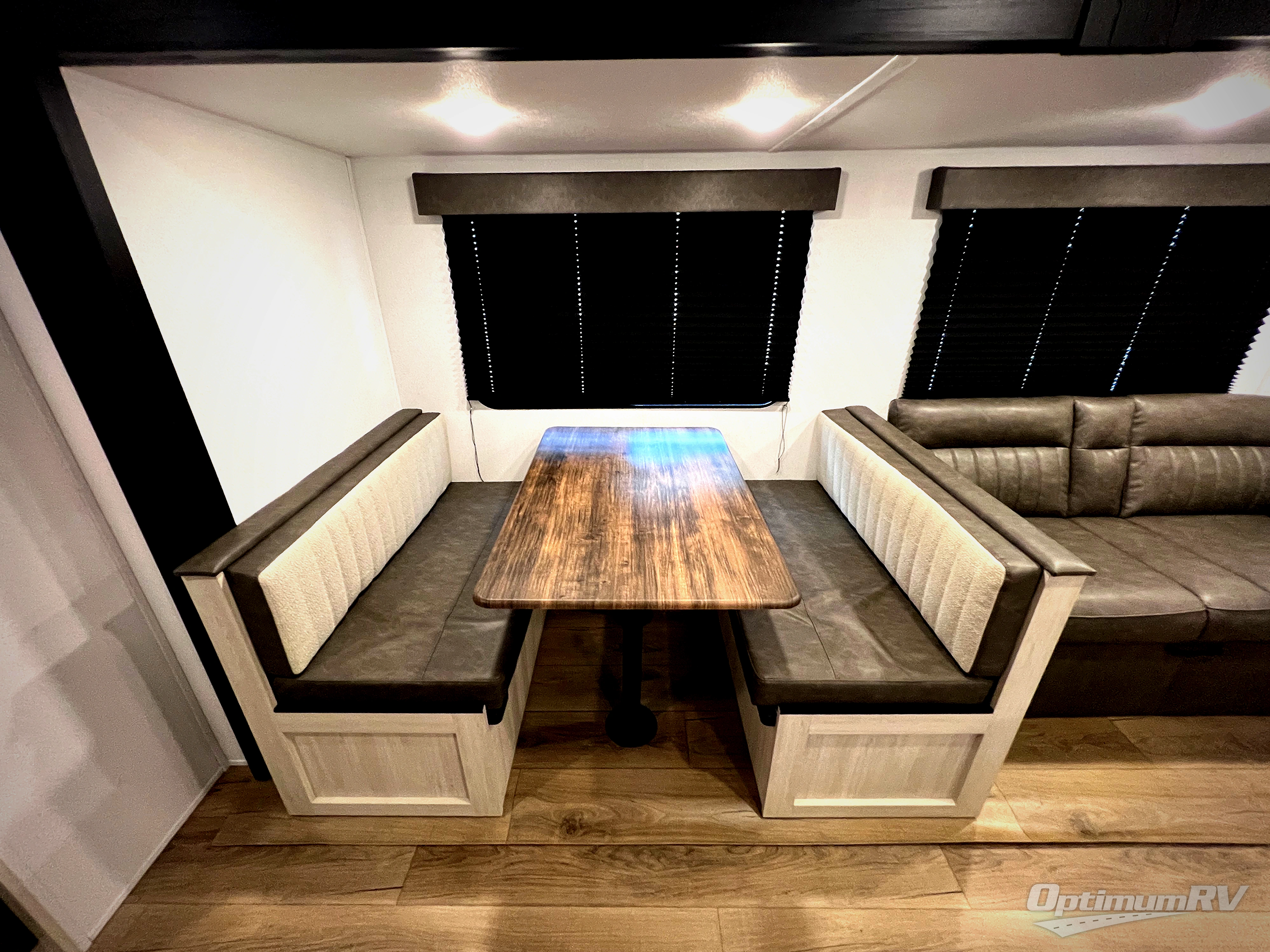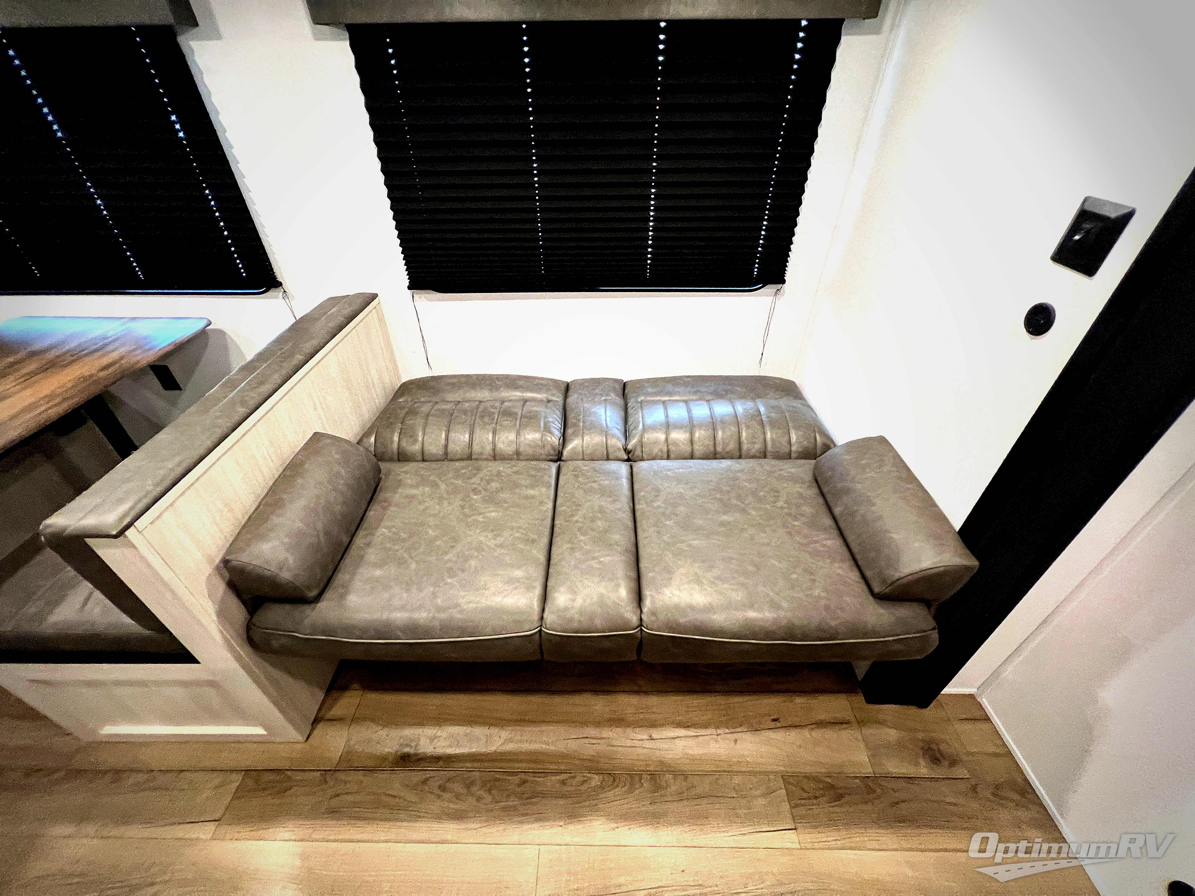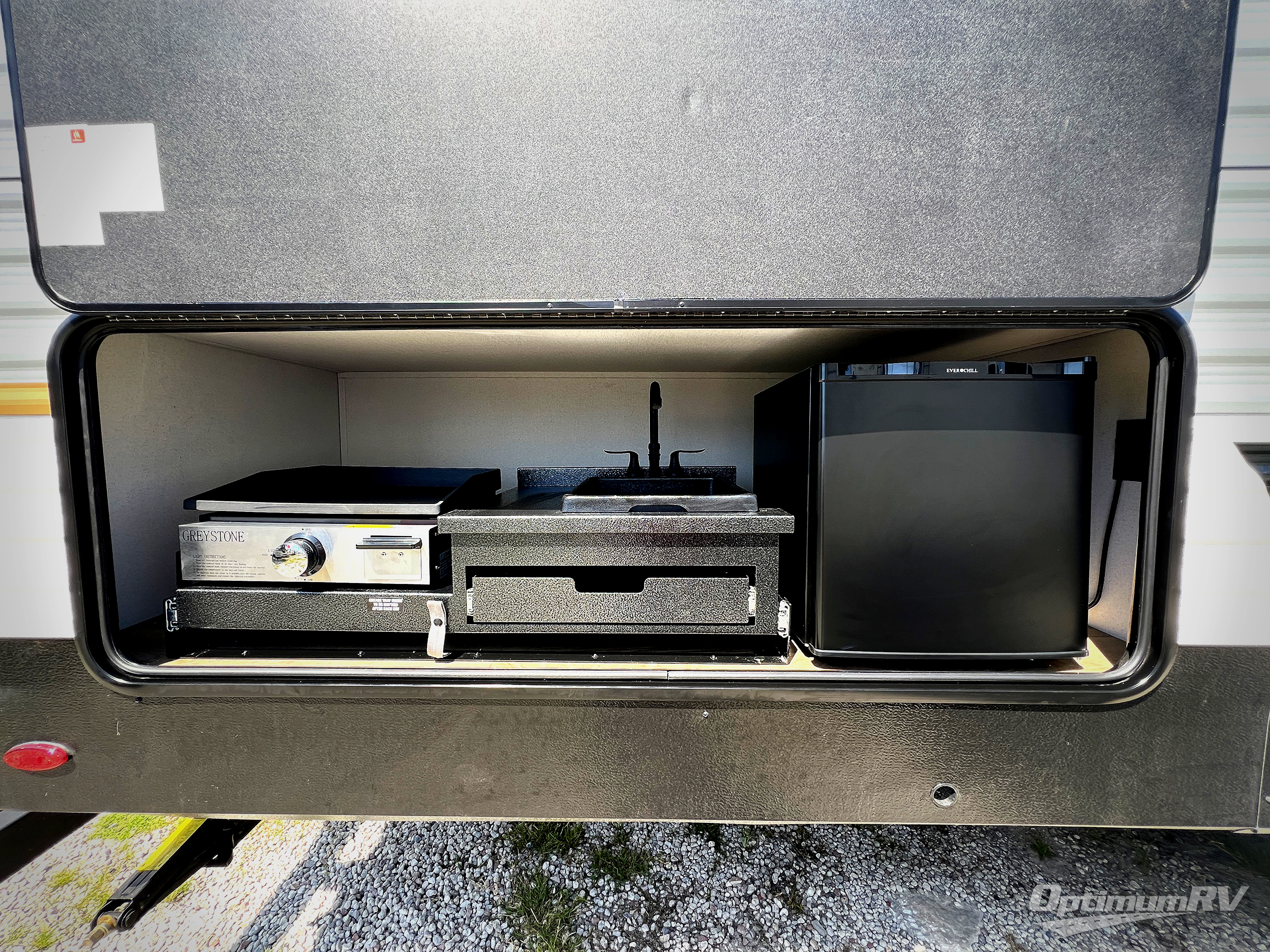 If you're looking for more space, this double axle, double slide out unit is perfect for your group of eight. Within the large slide in the living room, you'll find the booth dinette and sofa, which sit across from the optional TV if you want to enjoy movie nights. The full kitchen includes a stainless microwave and three burner cooktop to make meals, plus a pantry and 12V refrigerator for food storage. And an optional outside kitchen with a griddle can be added if you enjoy cooking outdoors! Your guests or littles are sure to enjoy the rear private bunkhouse that features a set of 38" x 76" bunks across from the third bunk and jiffy sofa within a slide out!