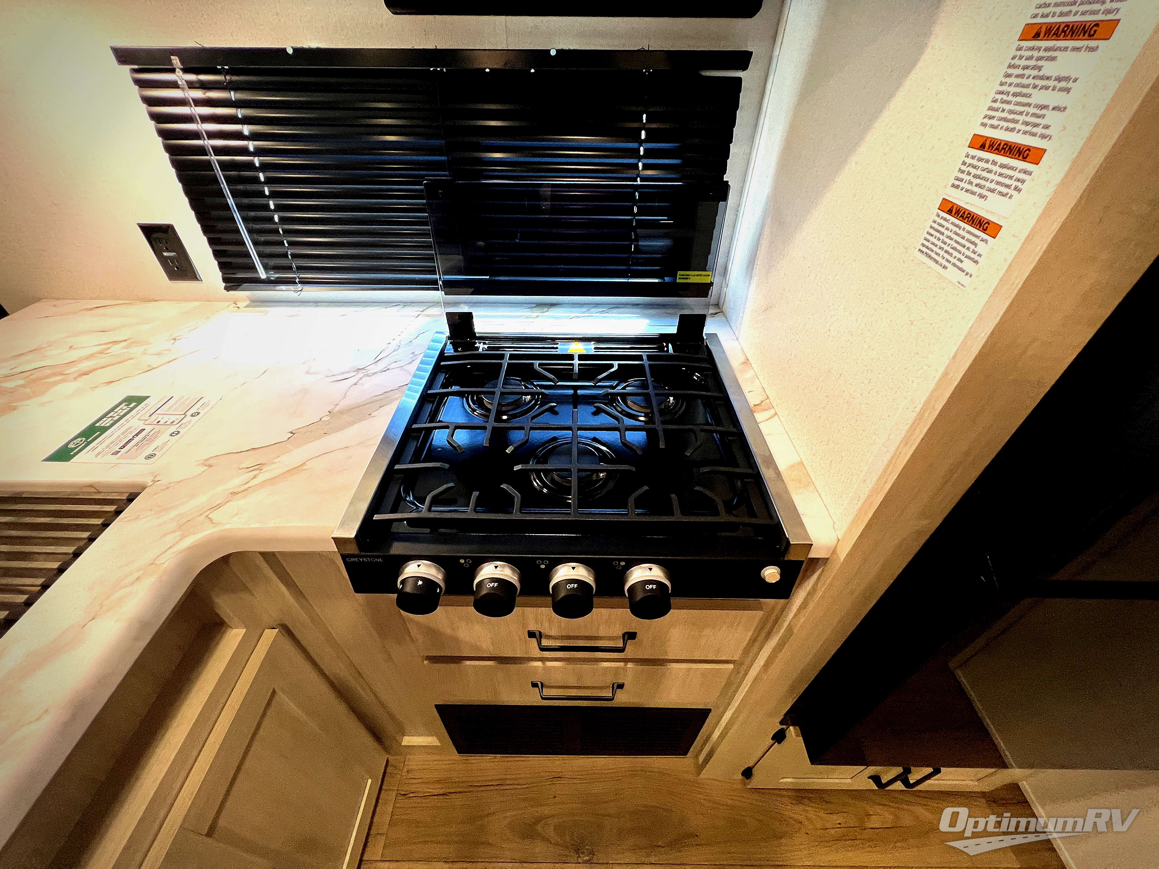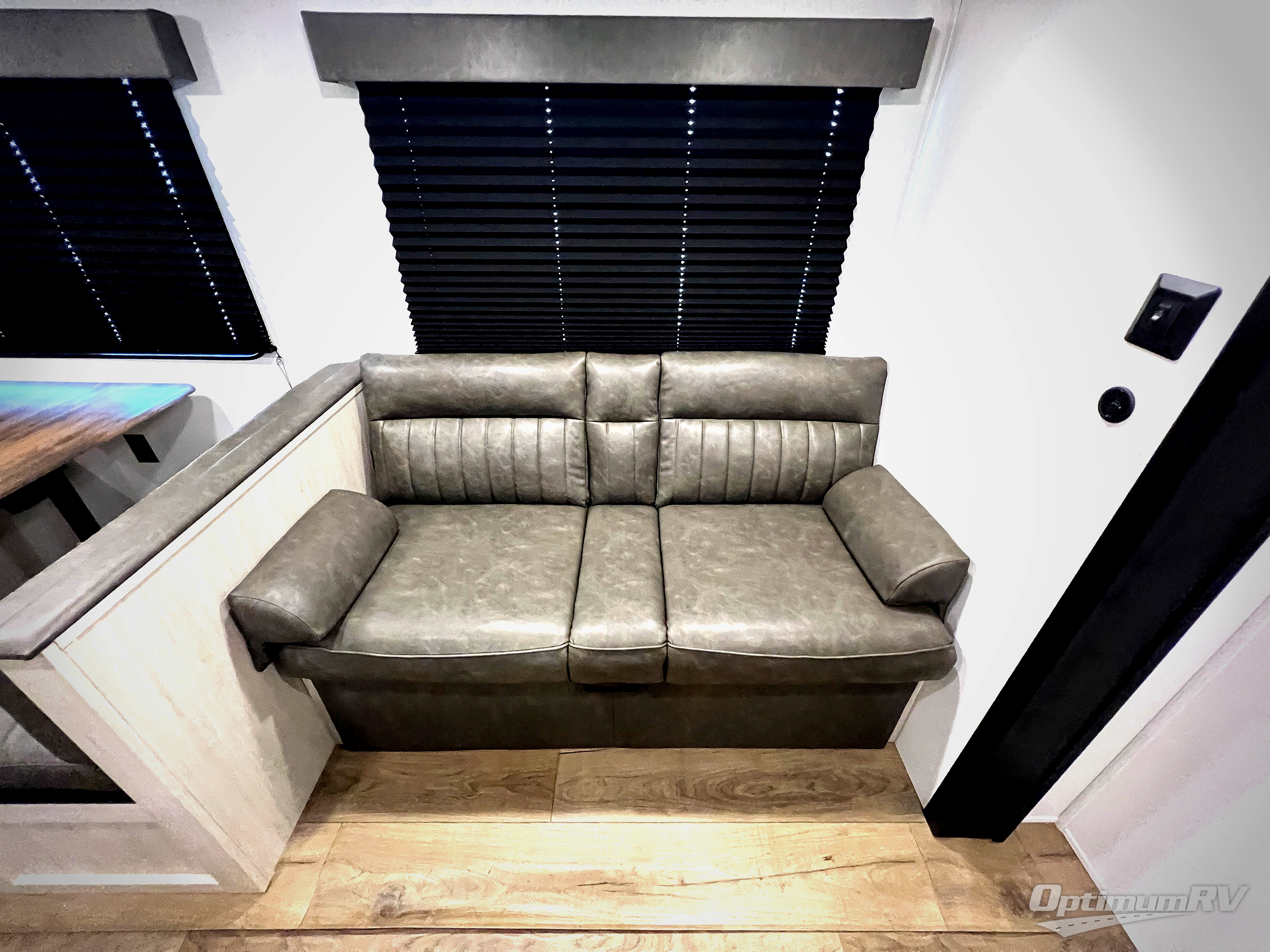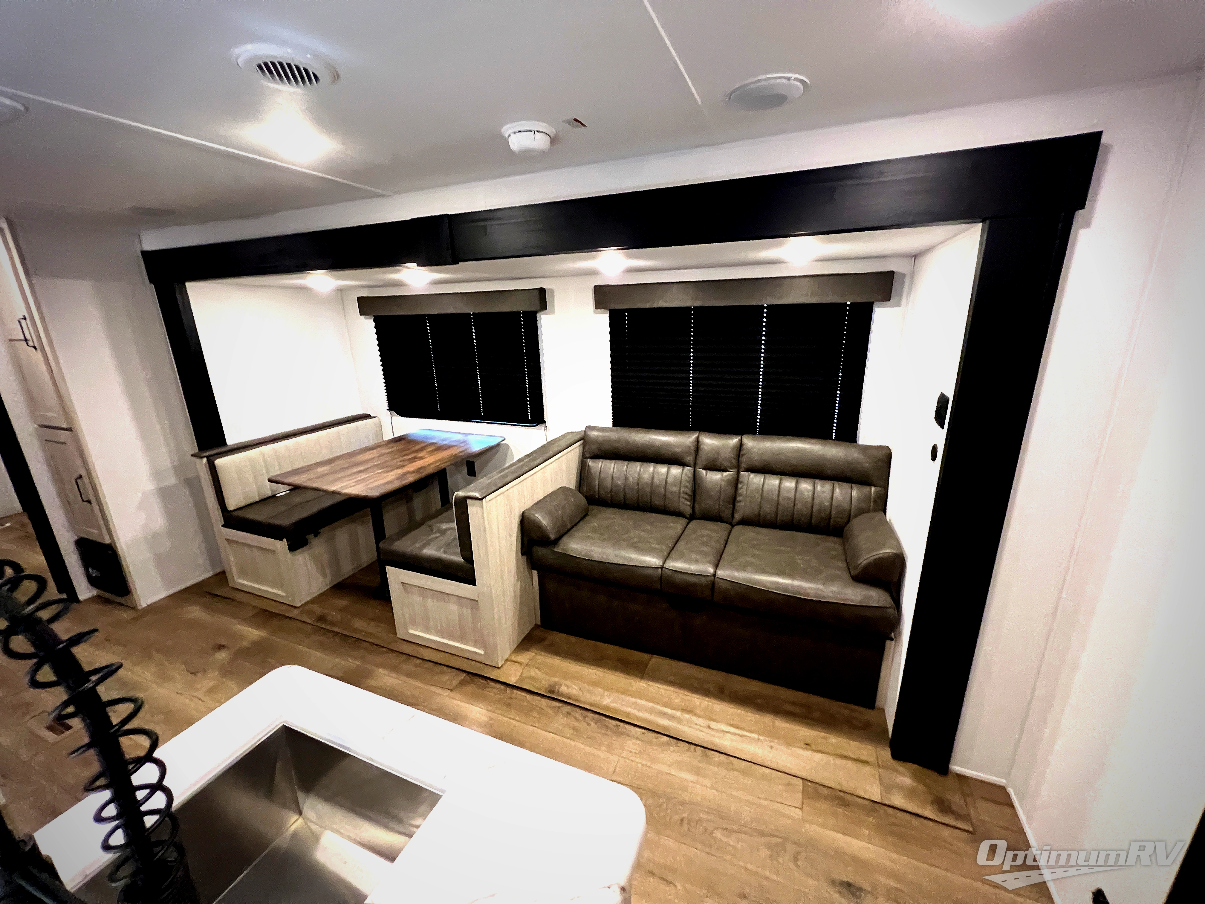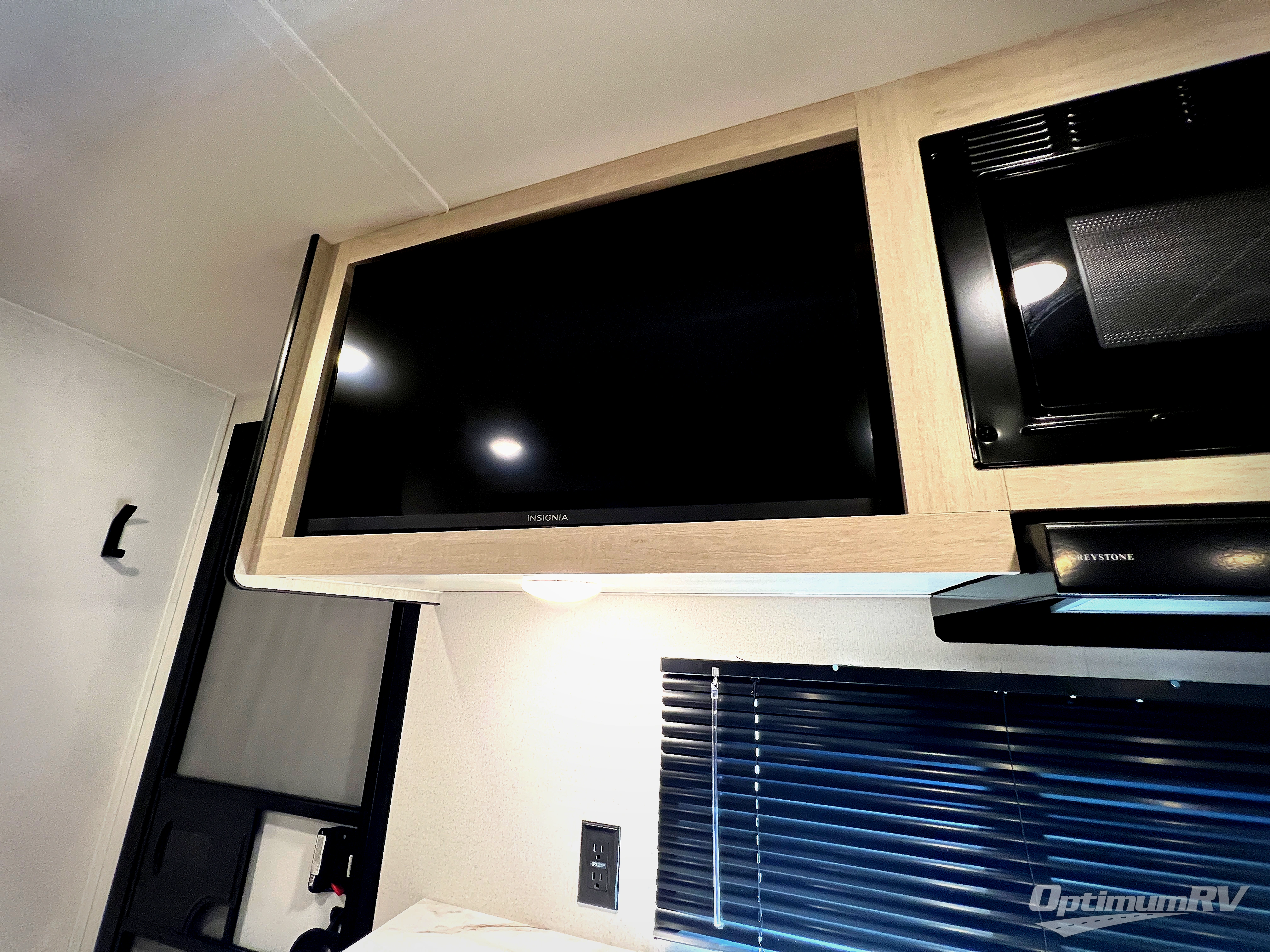 If you're looking for more space, this double axle, double slide out unit is perfect for your group of eight. Within the large slide in the living room, you'll find the booth dinette and sofa, which sit across from the optional TV if you want to enjoy movie nights. The full kitchen includes a stainless microwave and three burner cooktop to make meals, plus a pantry and 12V refrigerator for food storage. And an optional outside kitchen with a griddle can be added if you enjoy cooking outdoors! Your guests or littles are sure to enjoy the rear private bunkhouse that features a set of 38" x 76" bunks across from the third bunk and jiffy sofa within a slide out!