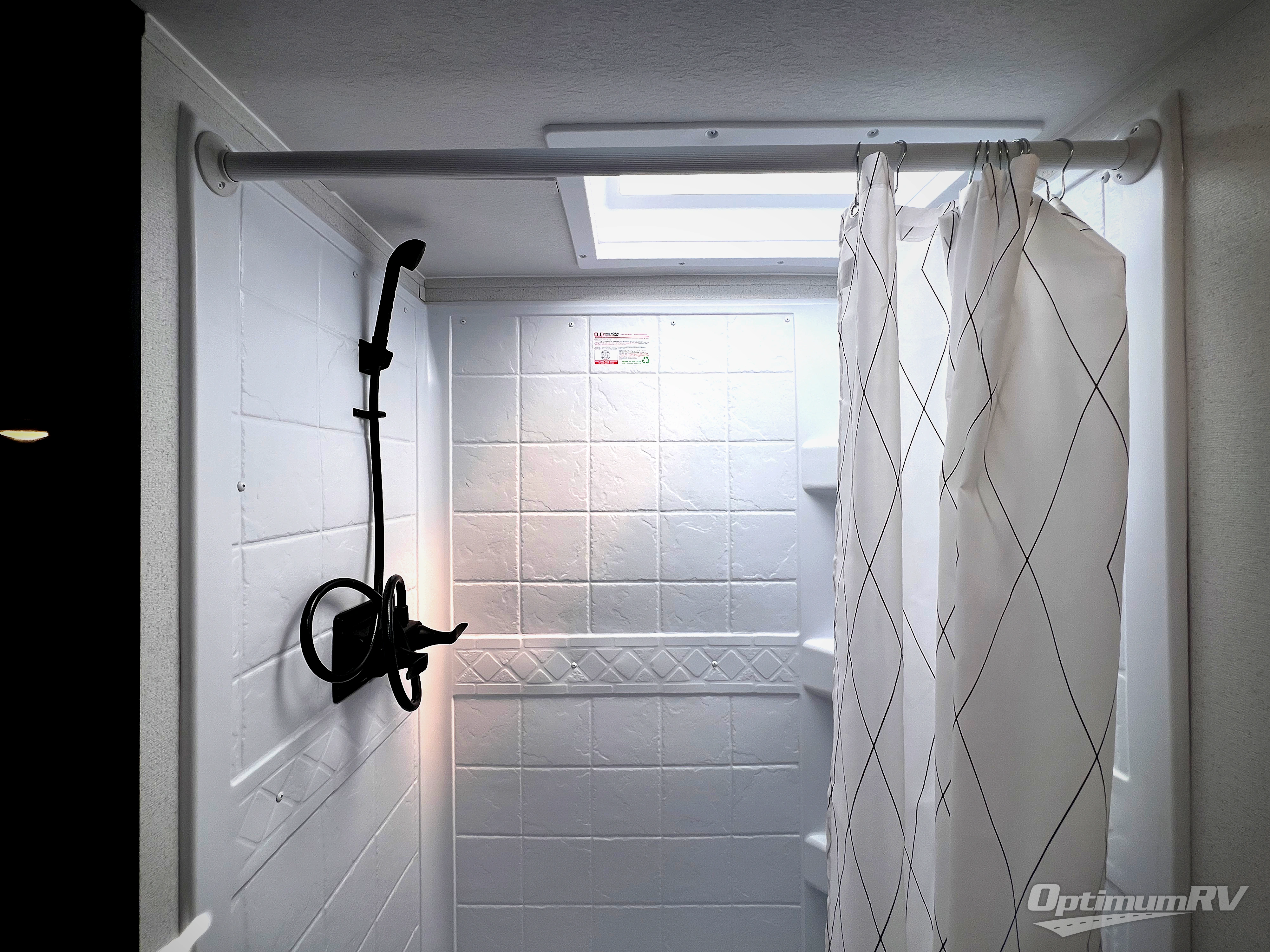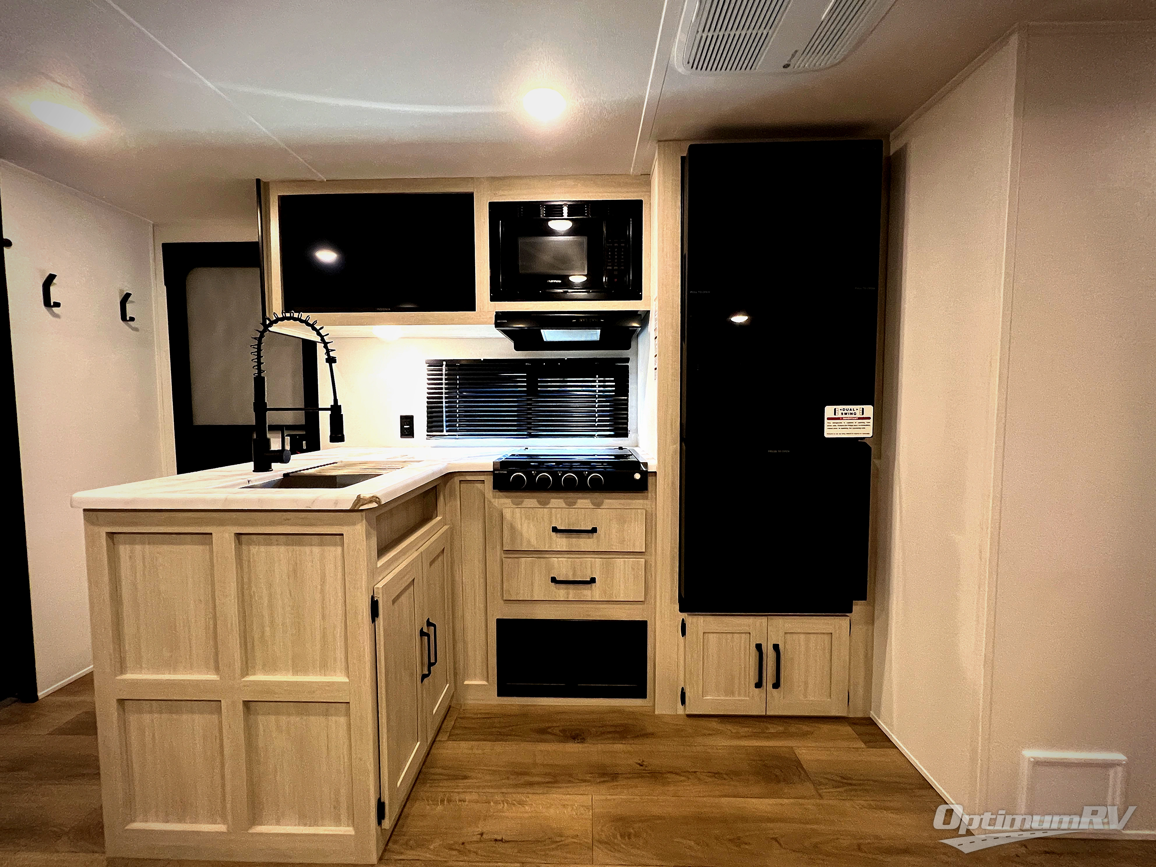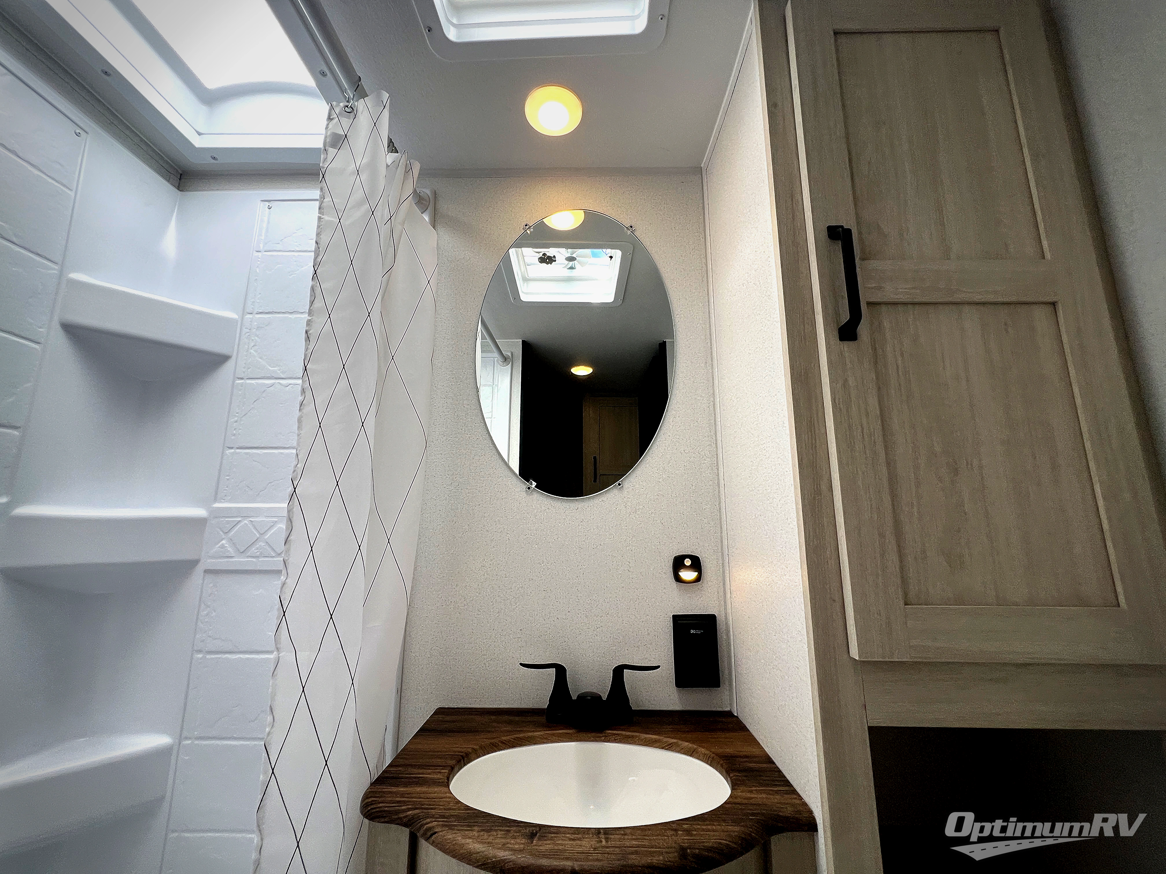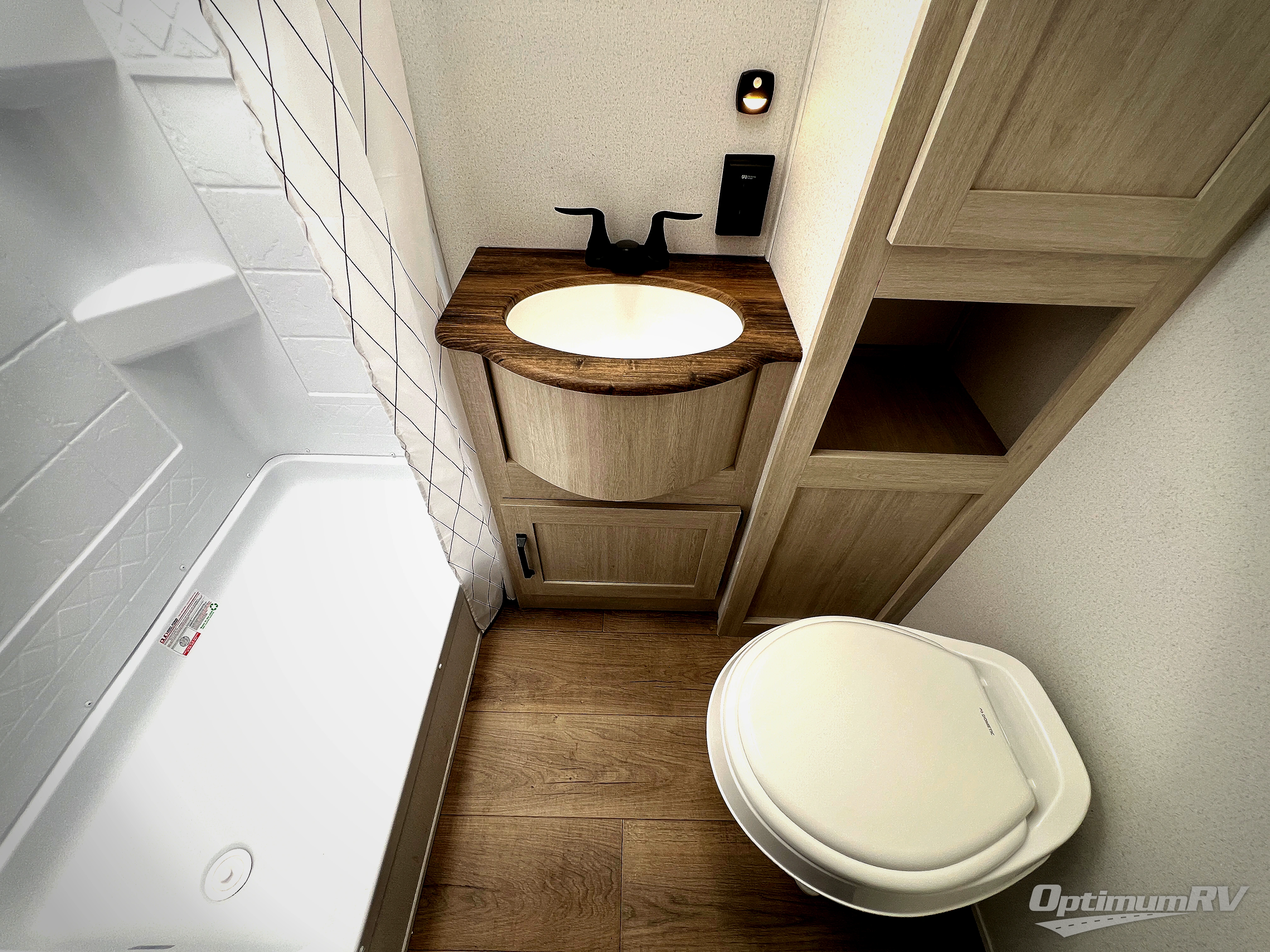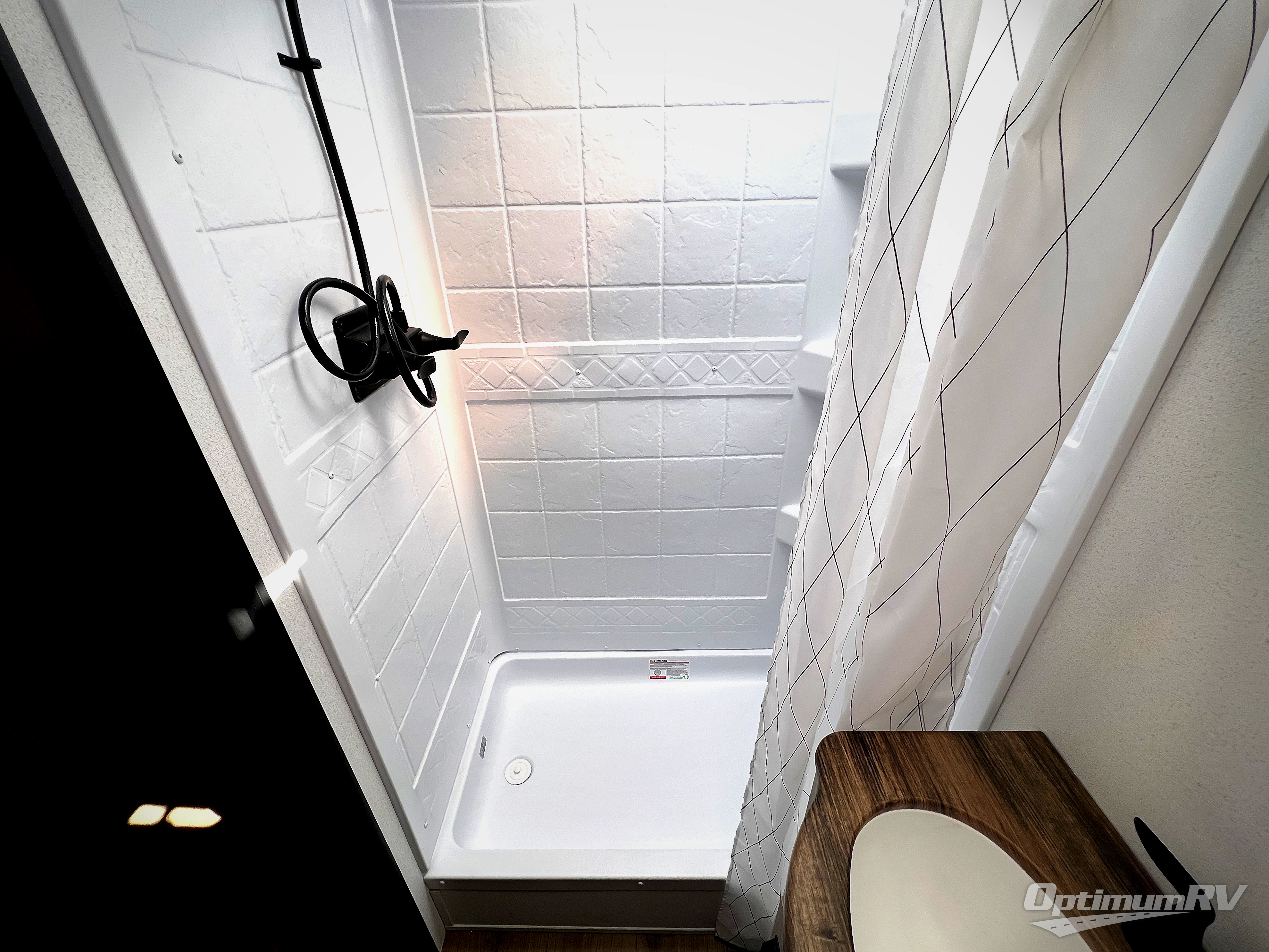 If you're looking for more space, this double axle, double slide out unit is perfect for your group of eight. Within the large slide in the living room, you'll find the booth dinette and sofa, which sit across from the optional TV if you want to enjoy movie nights. The full kitchen includes a stainless microwave and three burner cooktop to make meals, plus a pantry and 12V refrigerator for food storage. And an optional outside kitchen with a griddle can be added if you enjoy cooking outdoors! Your guests or littles are sure to enjoy the rear private bunkhouse that features a set of 38" x 76" bunks across from the third bunk and jiffy sofa within a slide out!