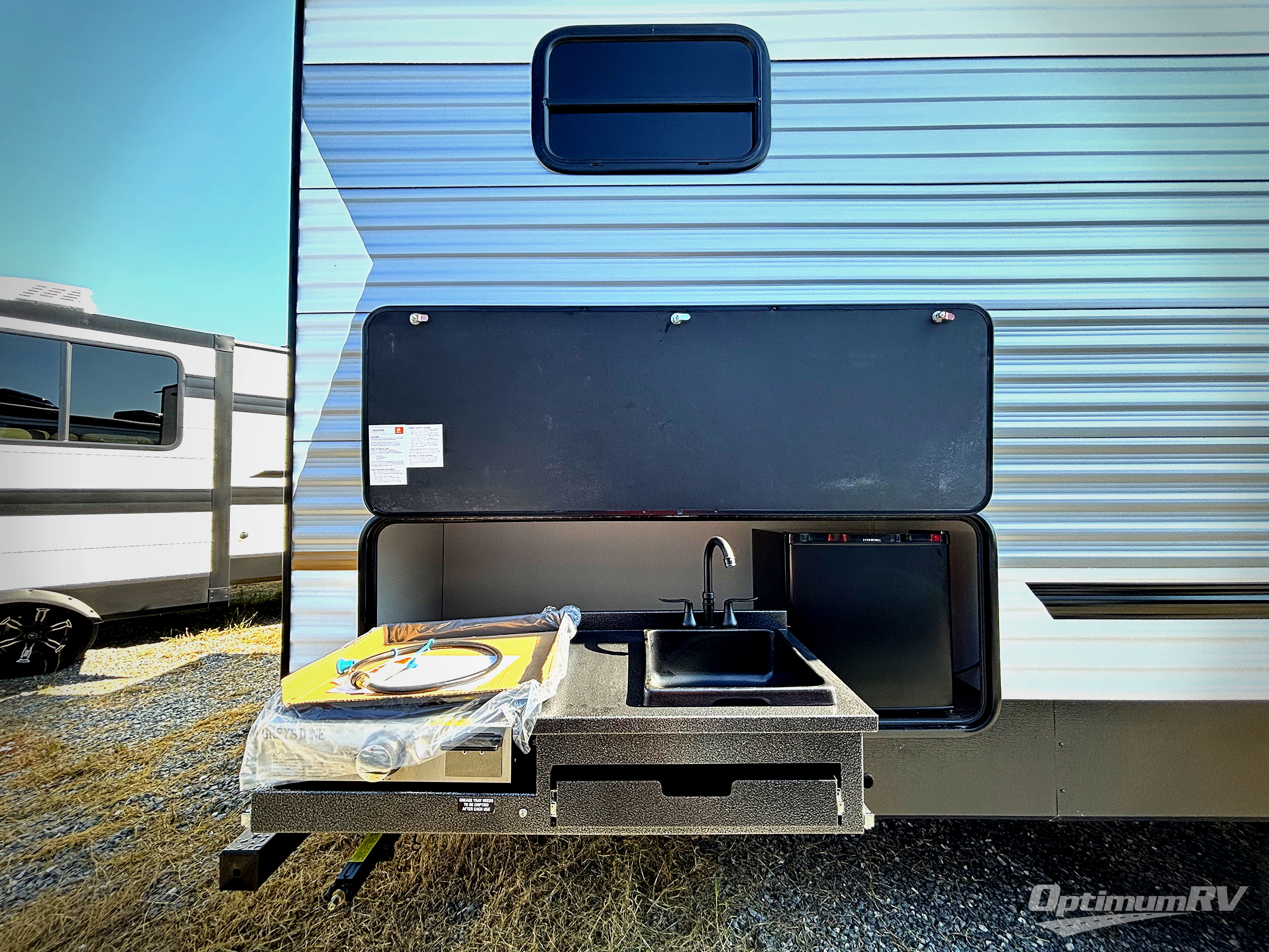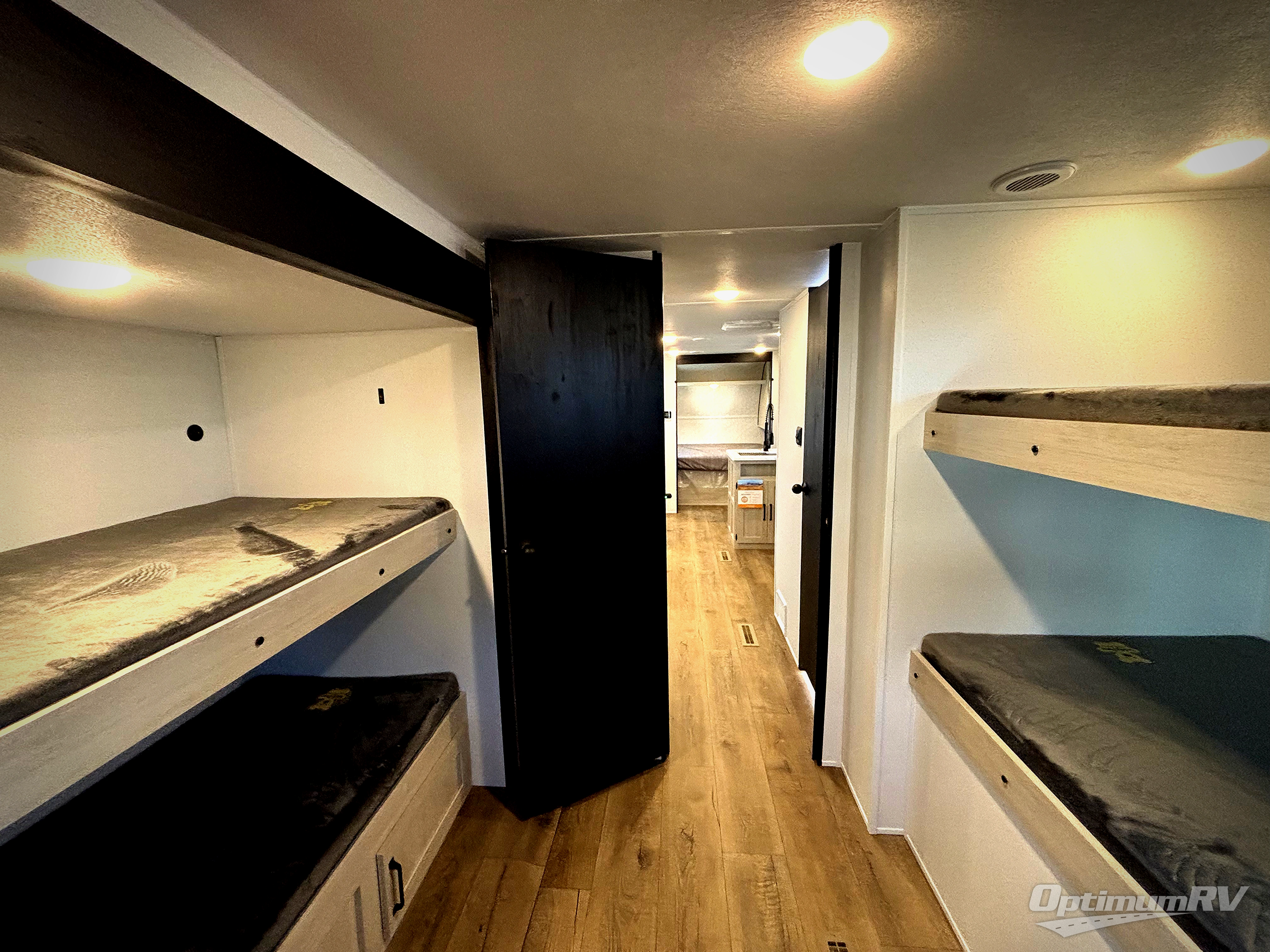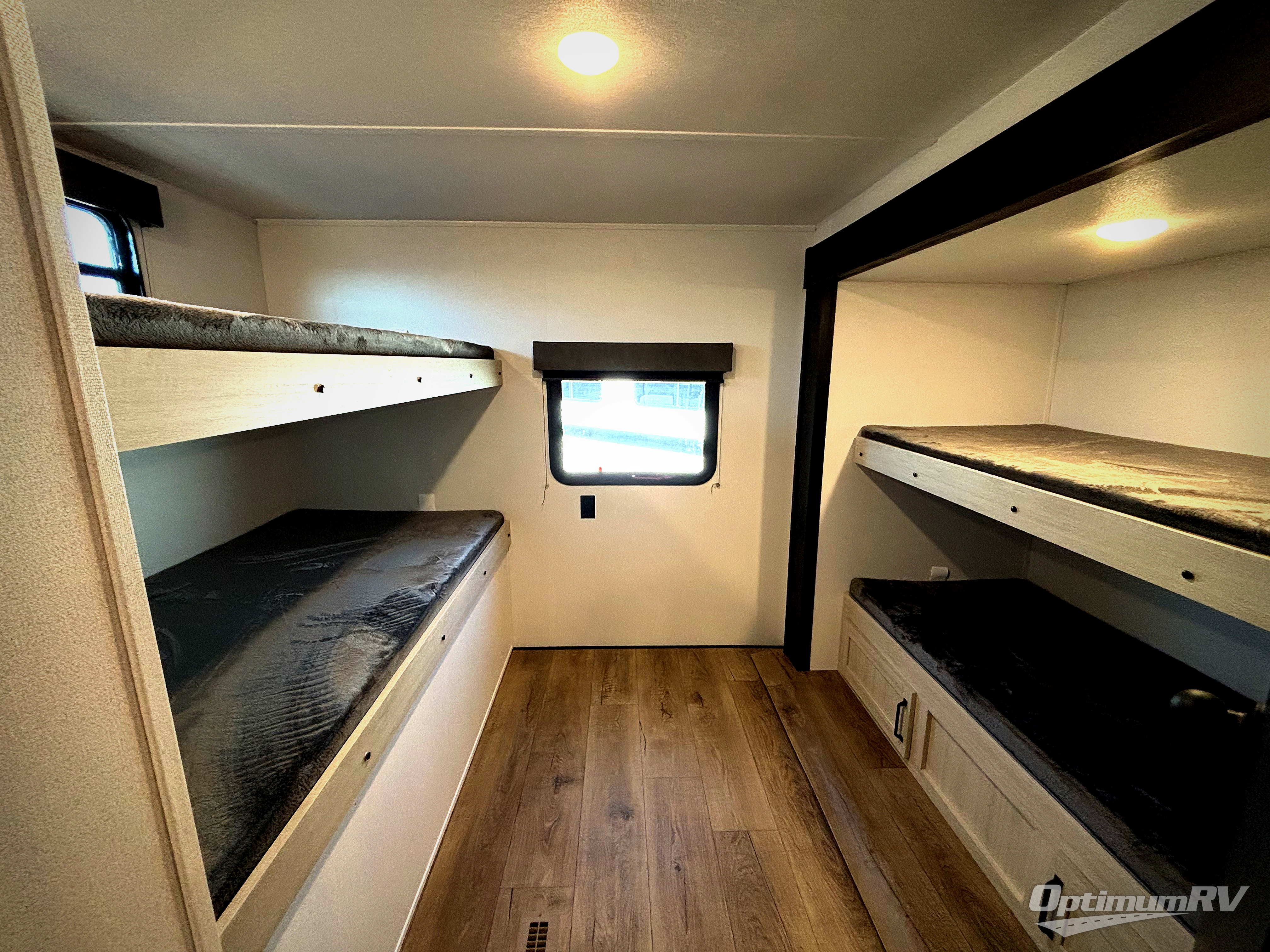 If you're looking for more space, this double axle, double slide out unit is perfect for your group of eight. Within the large slide in the living room, you'll find the booth dinette and sofa, which sit across from the optional TV if you want to enjoy movie nights. The full kitchen includes a stainless microwave and three burner cooktop to make meals, plus a pantry and 12V refrigerator for food storage. And an optional outside kitchen with a griddle can be added if you enjoy cooking outdoors! Your guests or littles are sure to enjoy the rear private bunkhouse that features a set of 38" x 76" bunks across from the third bunk and jiffy sofa within a slide out!