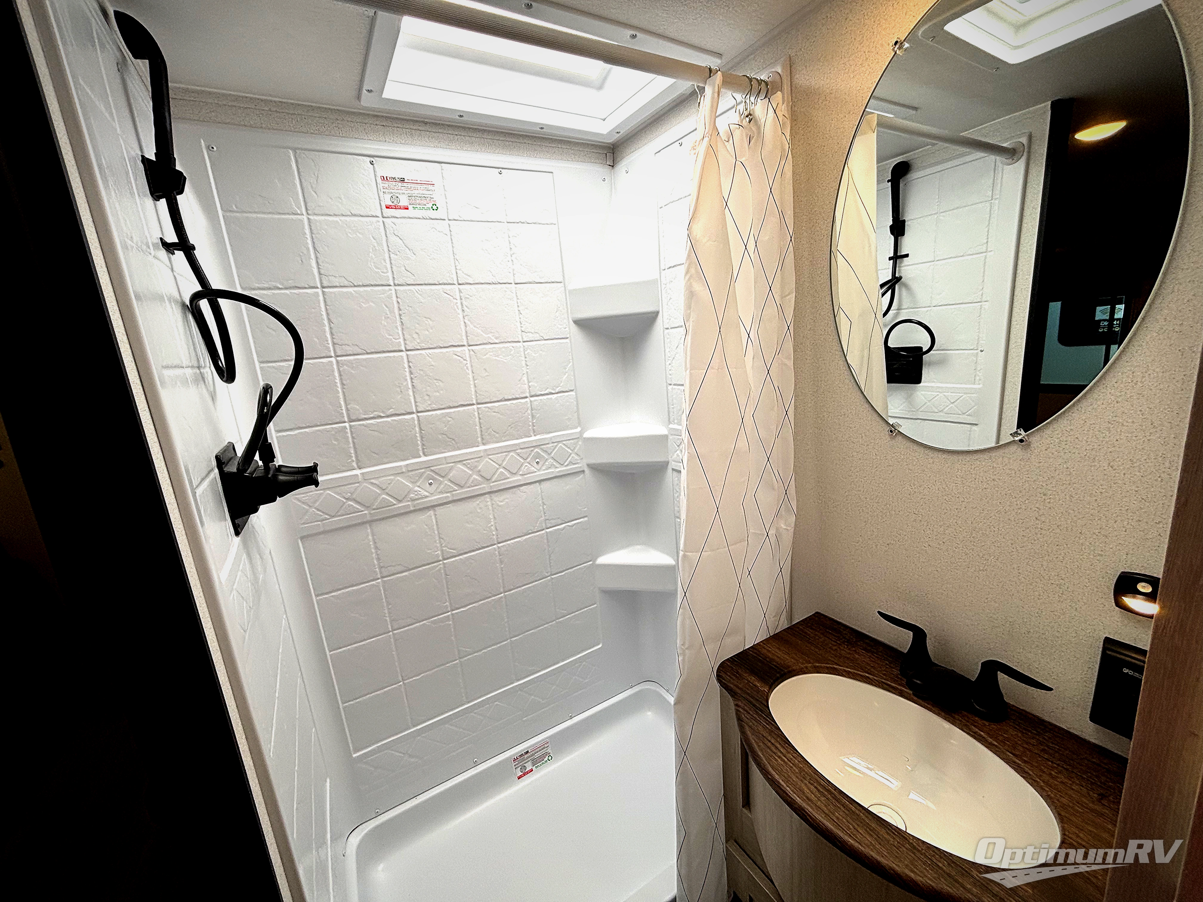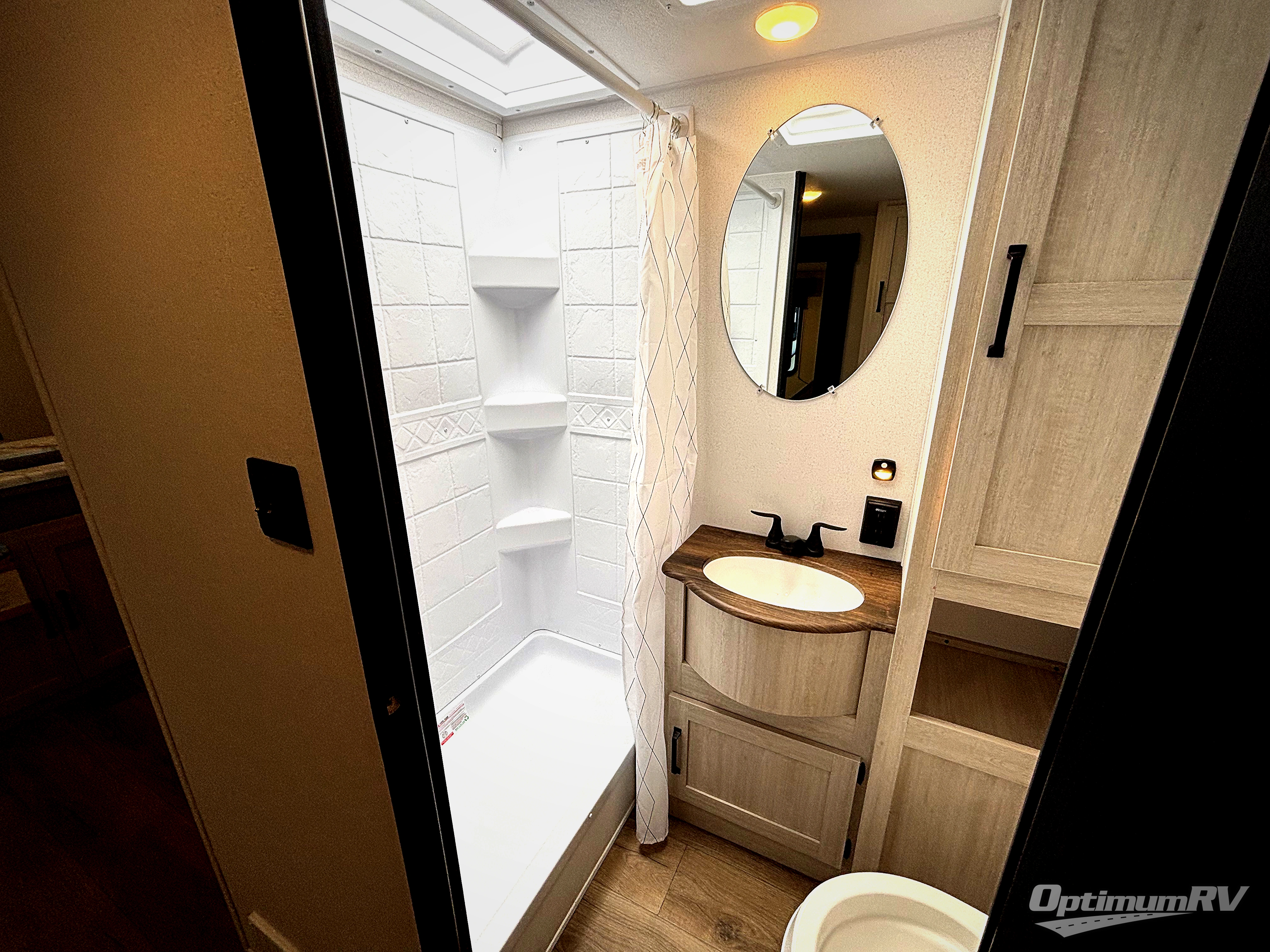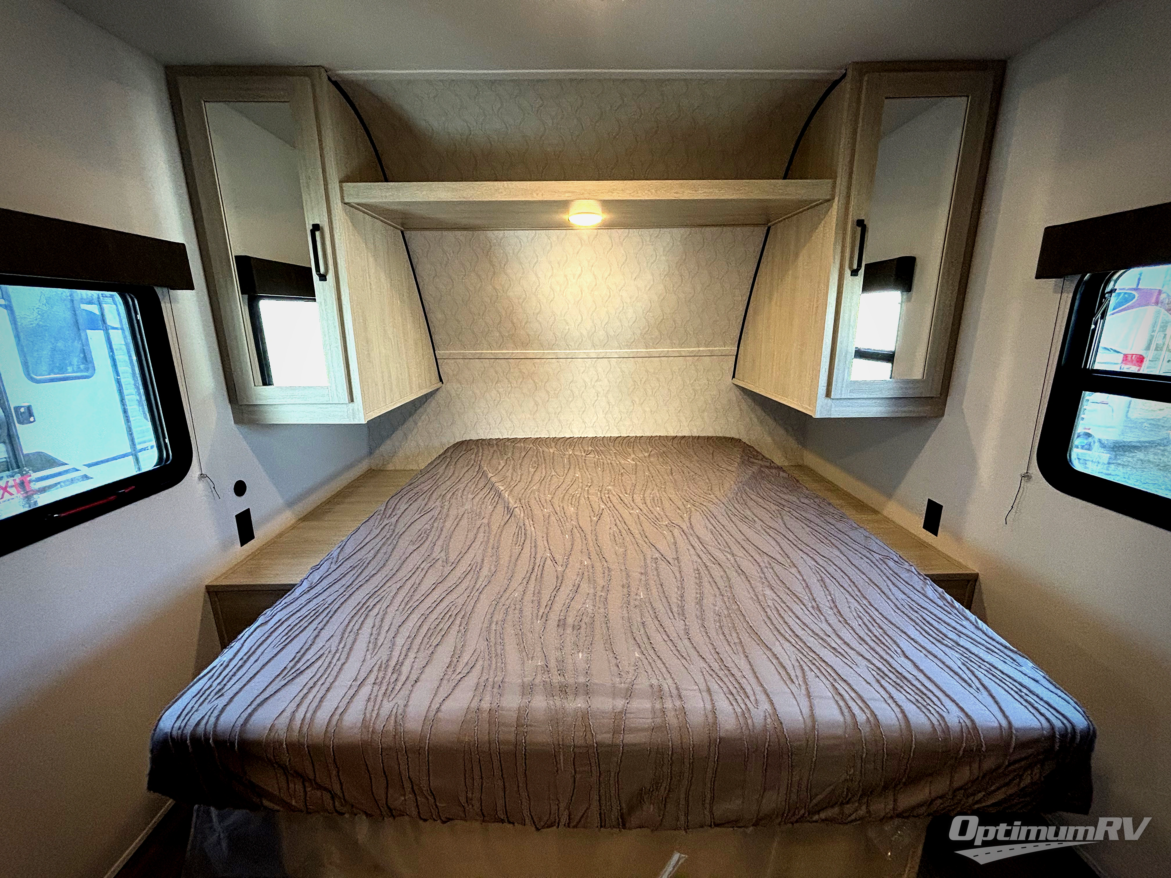 If you're looking for more space, this double axle, double slide out unit is perfect for your group of eight. Within the large slide in the living room, you'll find the booth dinette and sofa, which sit across from the optional TV if you want to enjoy movie nights. The full kitchen includes a stainless microwave and three burner cooktop to make meals, plus a pantry and 12V refrigerator for food storage. And an optional outside kitchen with a griddle can be added if you enjoy cooking outdoors! Your guests or littles are sure to enjoy the rear private bunkhouse that features a set of 38" x 76" bunks across from the third bunk and jiffy sofa within a slide out!