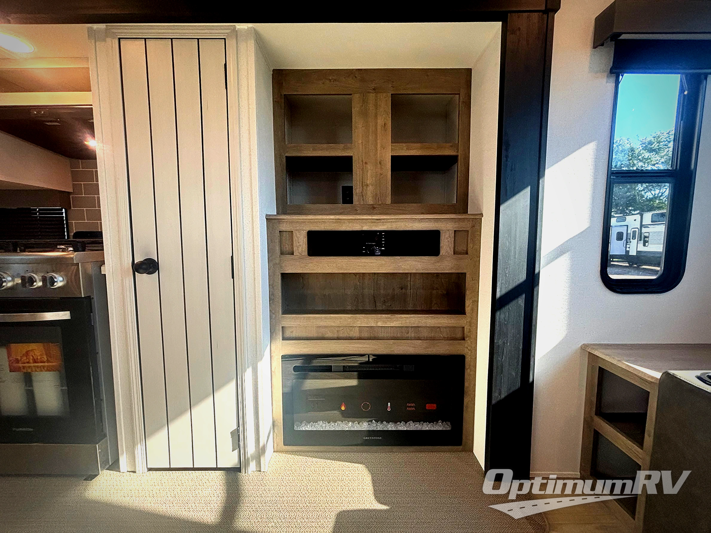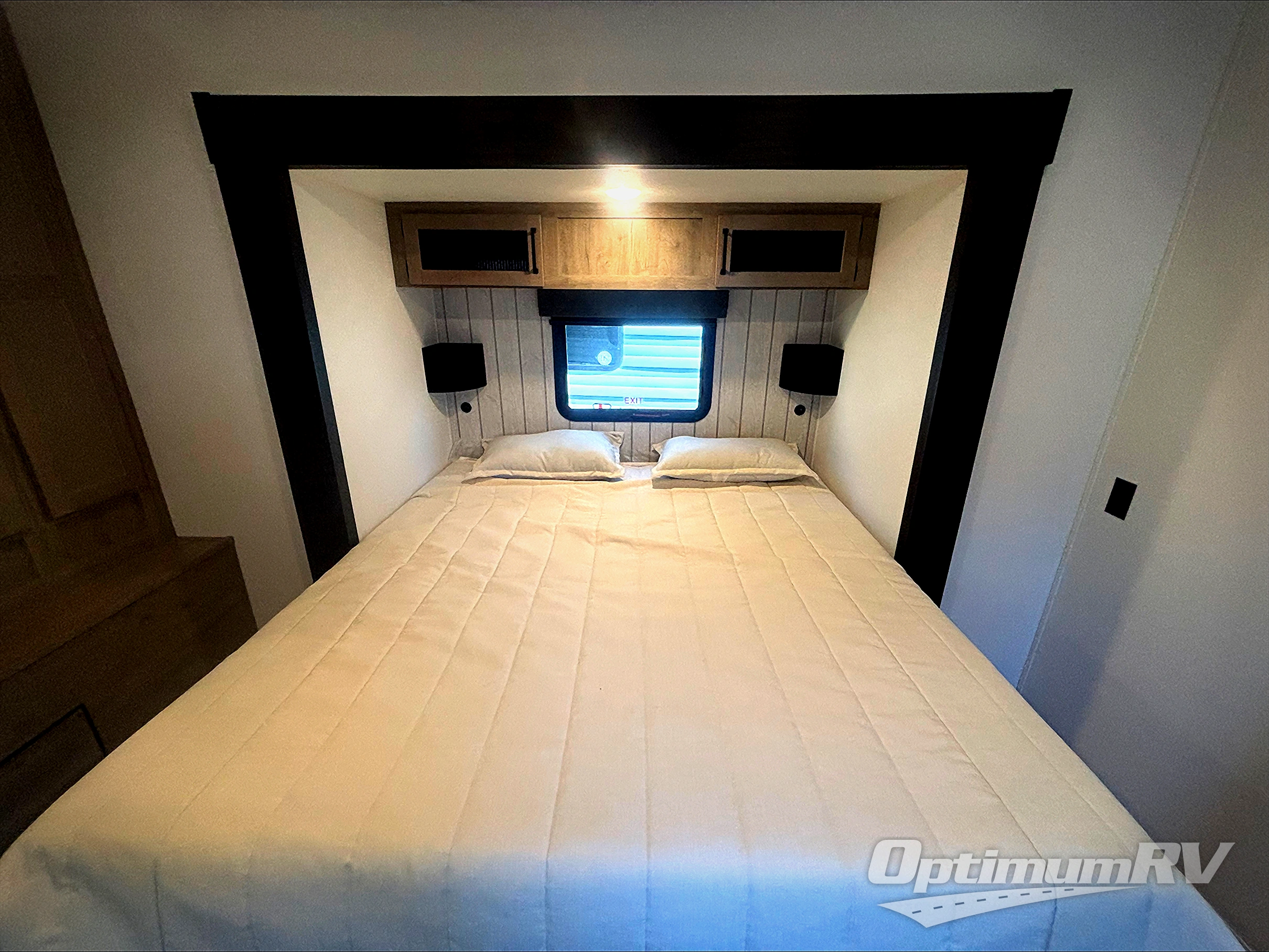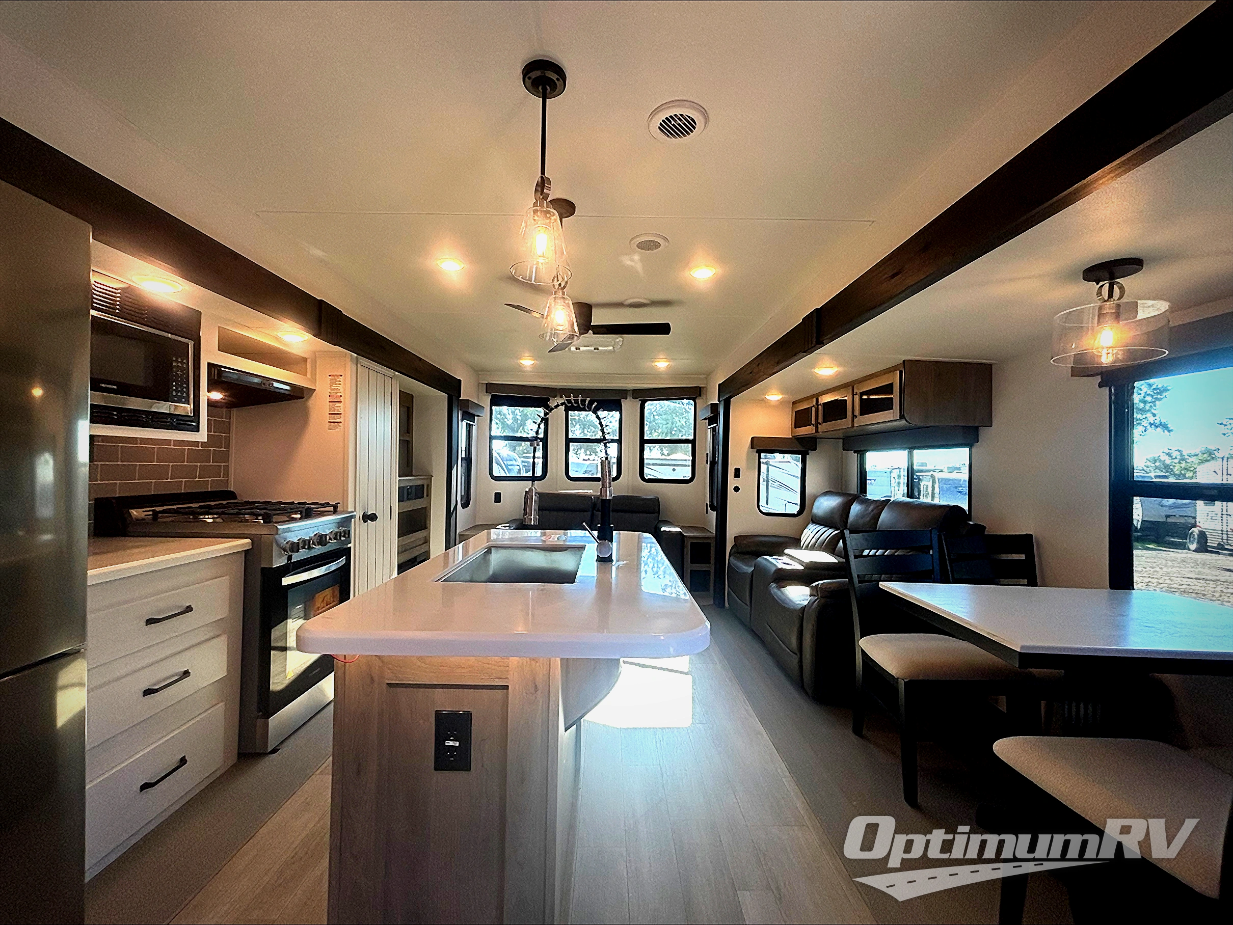 Get ready to enjoy your destination for a weekend or even longer in comfort with the front living and kitchen combined area. The sofa and booth dinette offer relaxing and dining space as well as sleeping space when needed. There are two recliners you are sure to love, as well as a fireplace to make it feel more like home. There is a kitchen island to prepare and serve meals from and wash the dishes. The kitchen offers full amenities including a stainless steel refrigerator and plenty of storage. You will surely enjoy the natural lighting from the patio door, and the second entry/exit is located in the rear private bedroom where you can sleep like a royalty on the king bed. There is also a closet with the option to add washer and dryer prep if you choose!