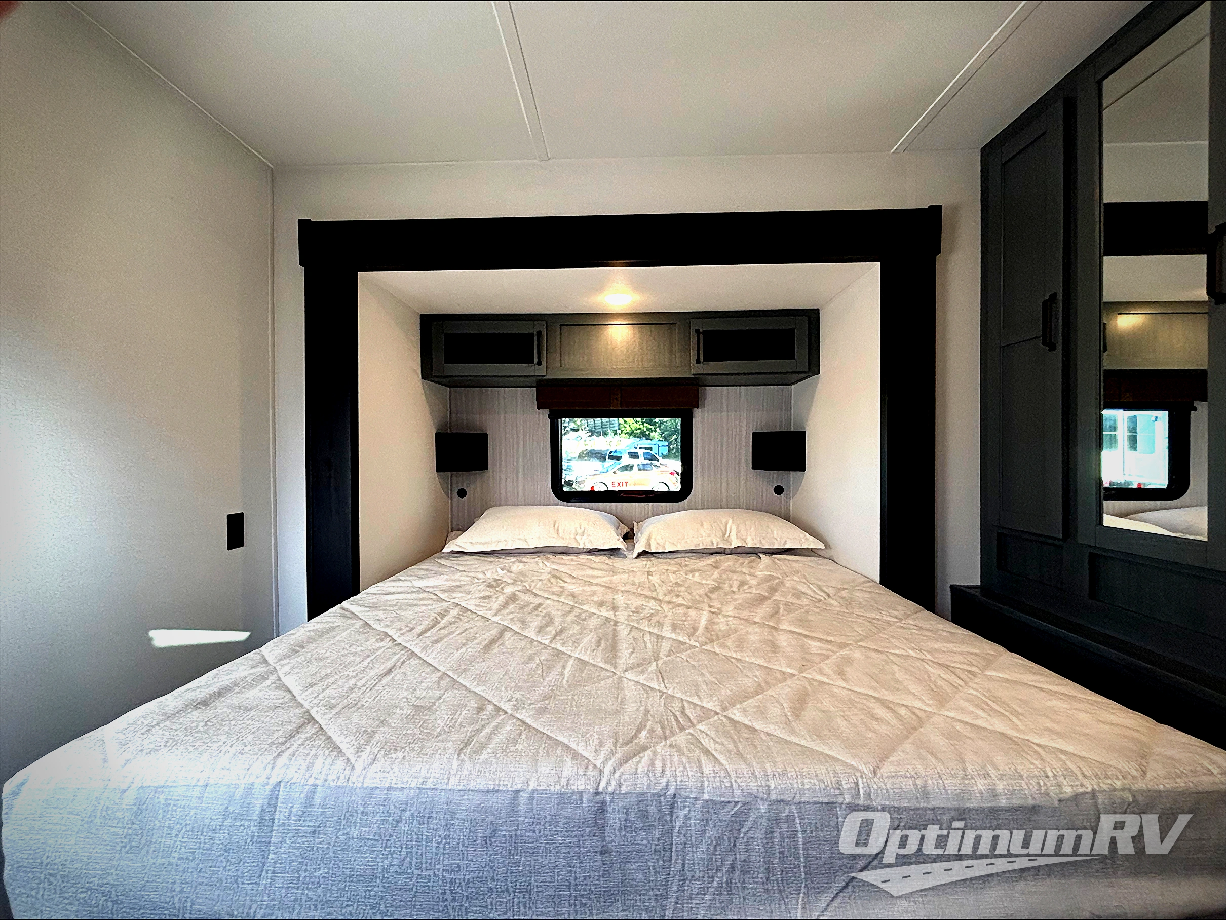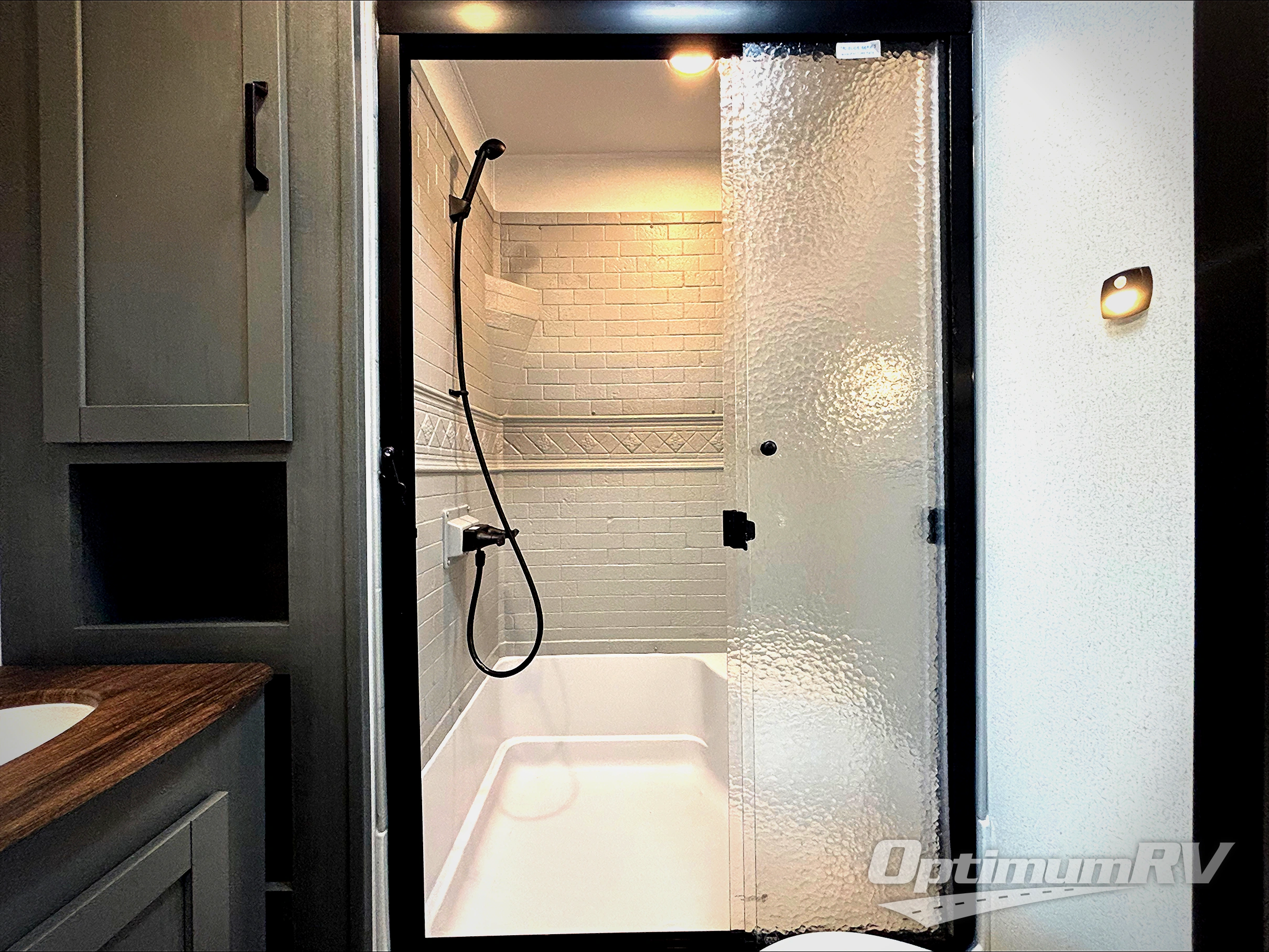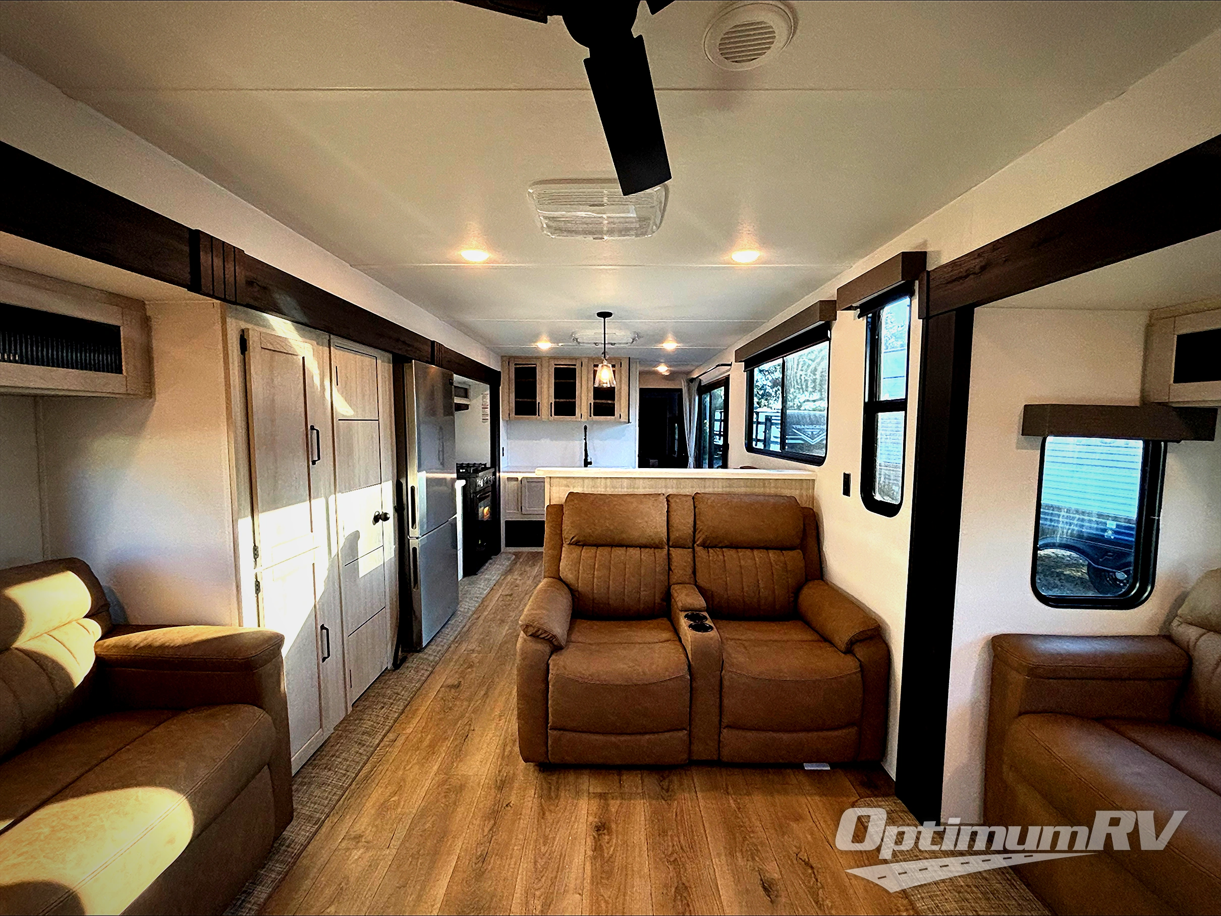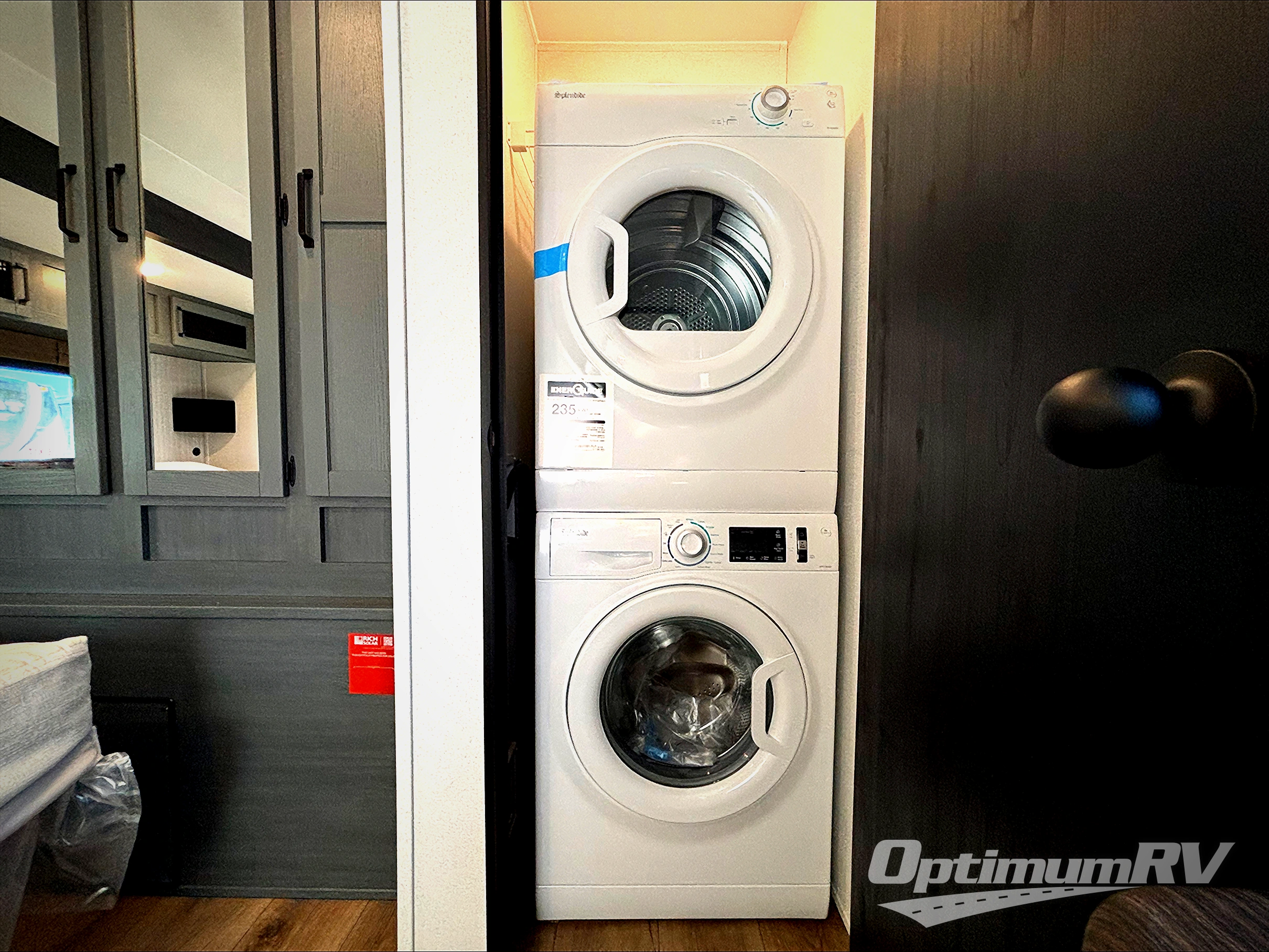 Escape the everyday schedule and enjoy your trailer at your favorite spot! Once you arrive, you can enter through the patio door or the second entry which places you inside the front bedroom. You can quickly load your clothing and food and relax in the rear separate living area with two recliners, two sofas, and an entertainment center. The cook can make a meal with full amenities with plenty of counter space plus a large pantry and refrigerator to hold lots of food. The table and two chairs plus booth seating will allow four people to enjoy a meal together or play a game here. When you need to get refreshed, the full bathroom includes everything needed plus linen storage and a seated shower. And the front bedroom offers a slide out king bed, a dresser and a large closet, plus a second closet with washer and dryer prep option if you choose.