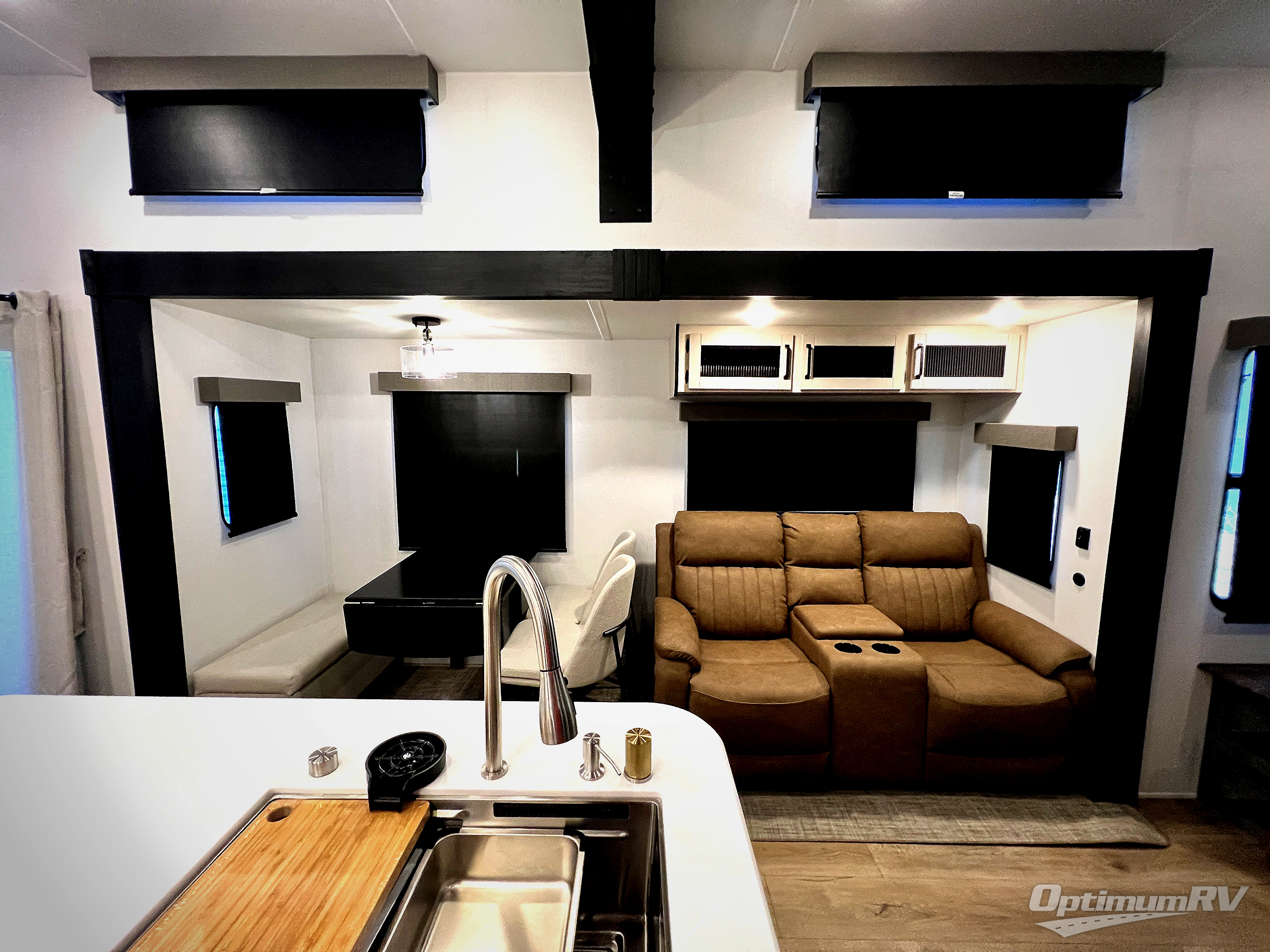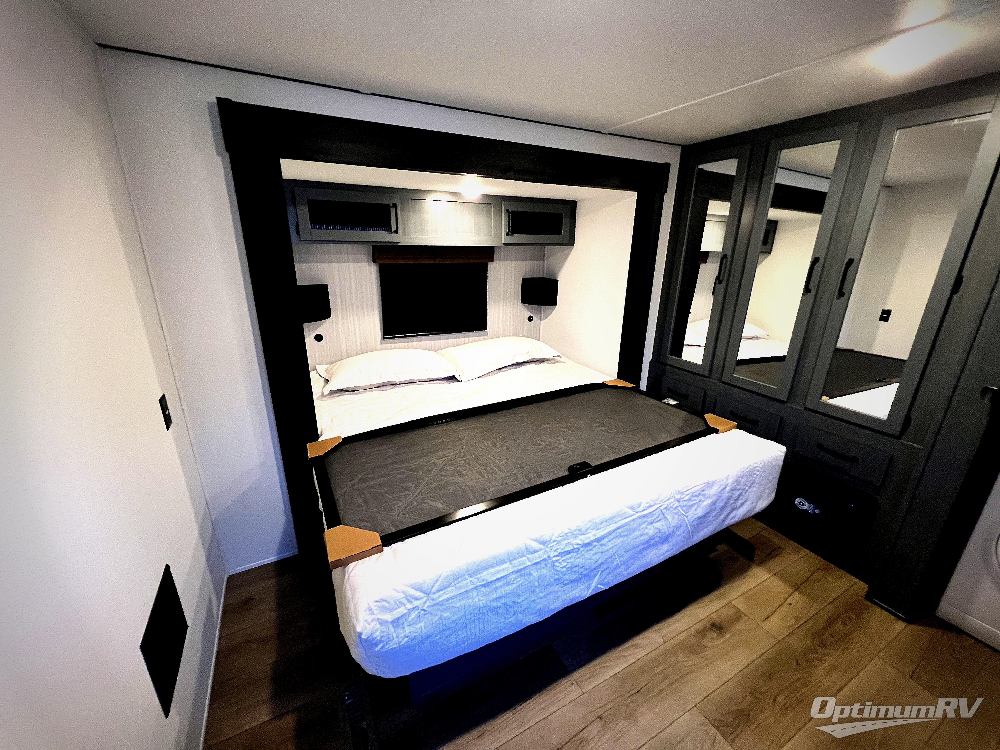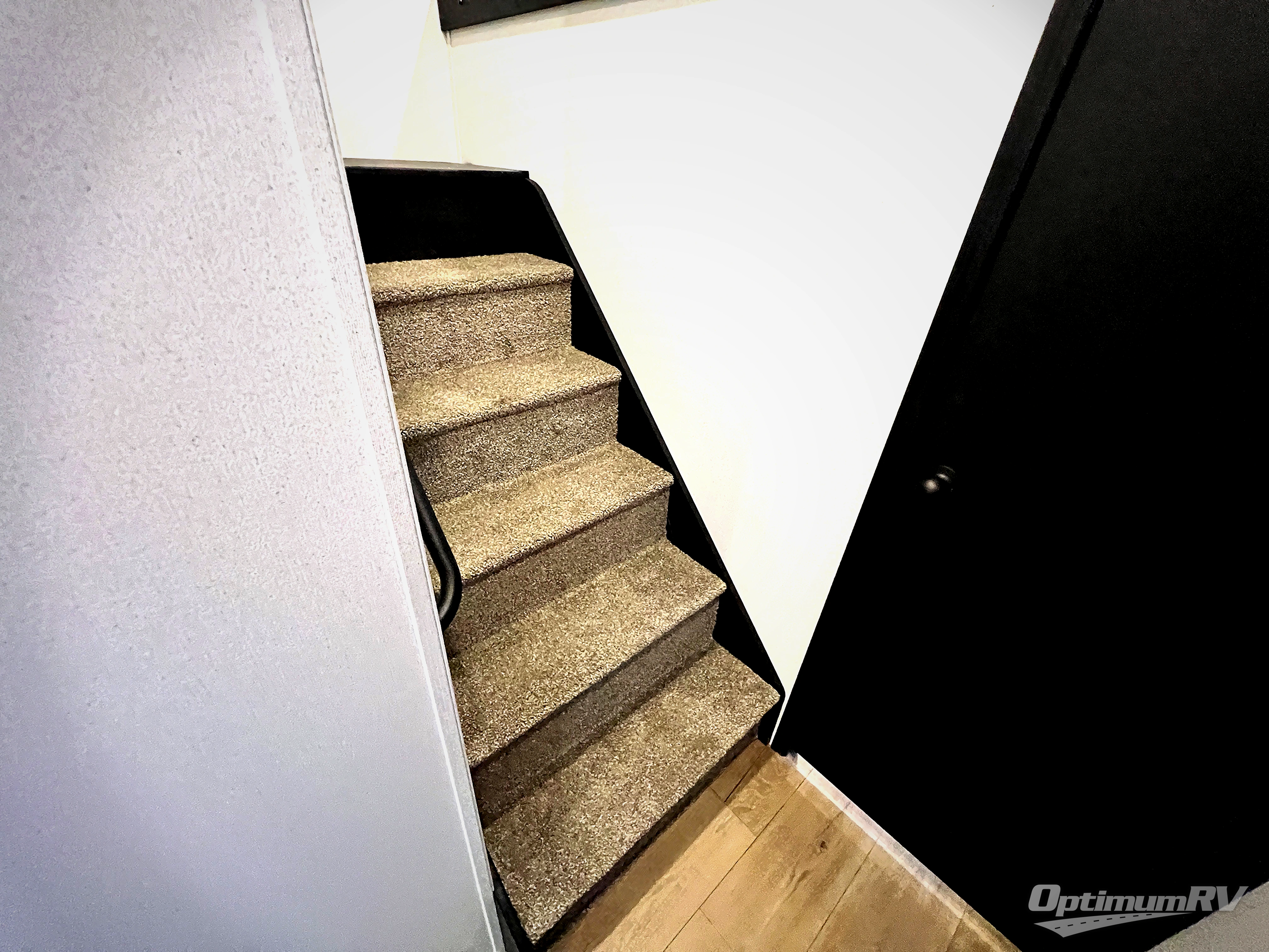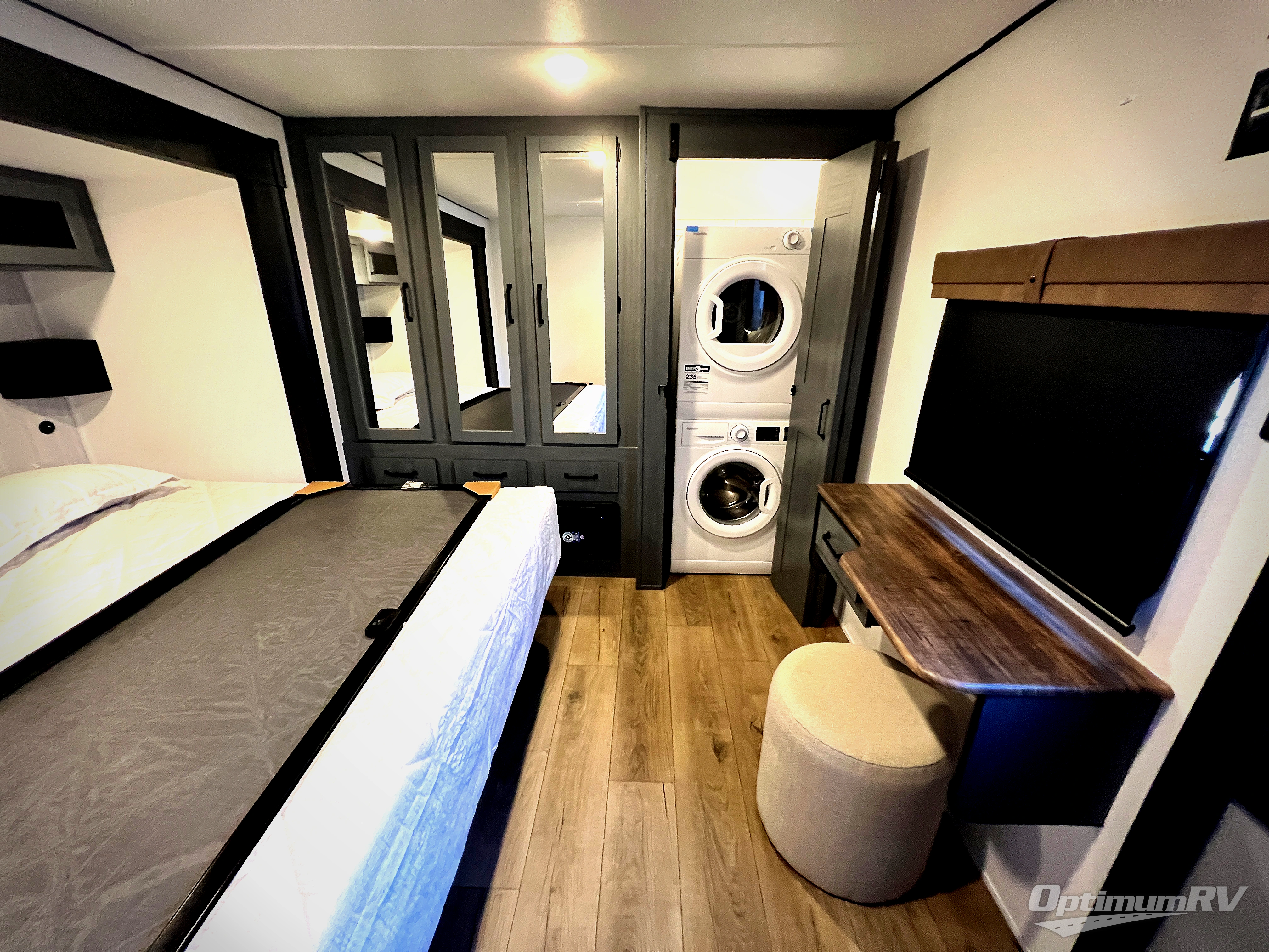 Wherever your destination may be, you can be sure to enjoy it to the fullest with this trailer in tow! With two entry doors, you can enter in through the front private bedroom or the main living area. The bedroom includes a king bed slide out, a desktop if you need to work from home, and a wardrobe/closet to keep your clothes organized. There is also a closet with the option to add washer and dryer prep. Just outside this room are steps that lead to the large loft area with a 58" x 58" bunk mat and a cabinet on one side, plus two 32" x 80" bunk mats on the other. There is also a front cabinet and a wardrobe/closet for plenty of storage space. Once you've headed back downstairs, you can relax on the dual recliners, rear sofa, or free-standing table with a bench and two seats. And the chef of your group will love the kitchen with its residential style refrigerator and pantry, kitchen island, and four burner cooktop!