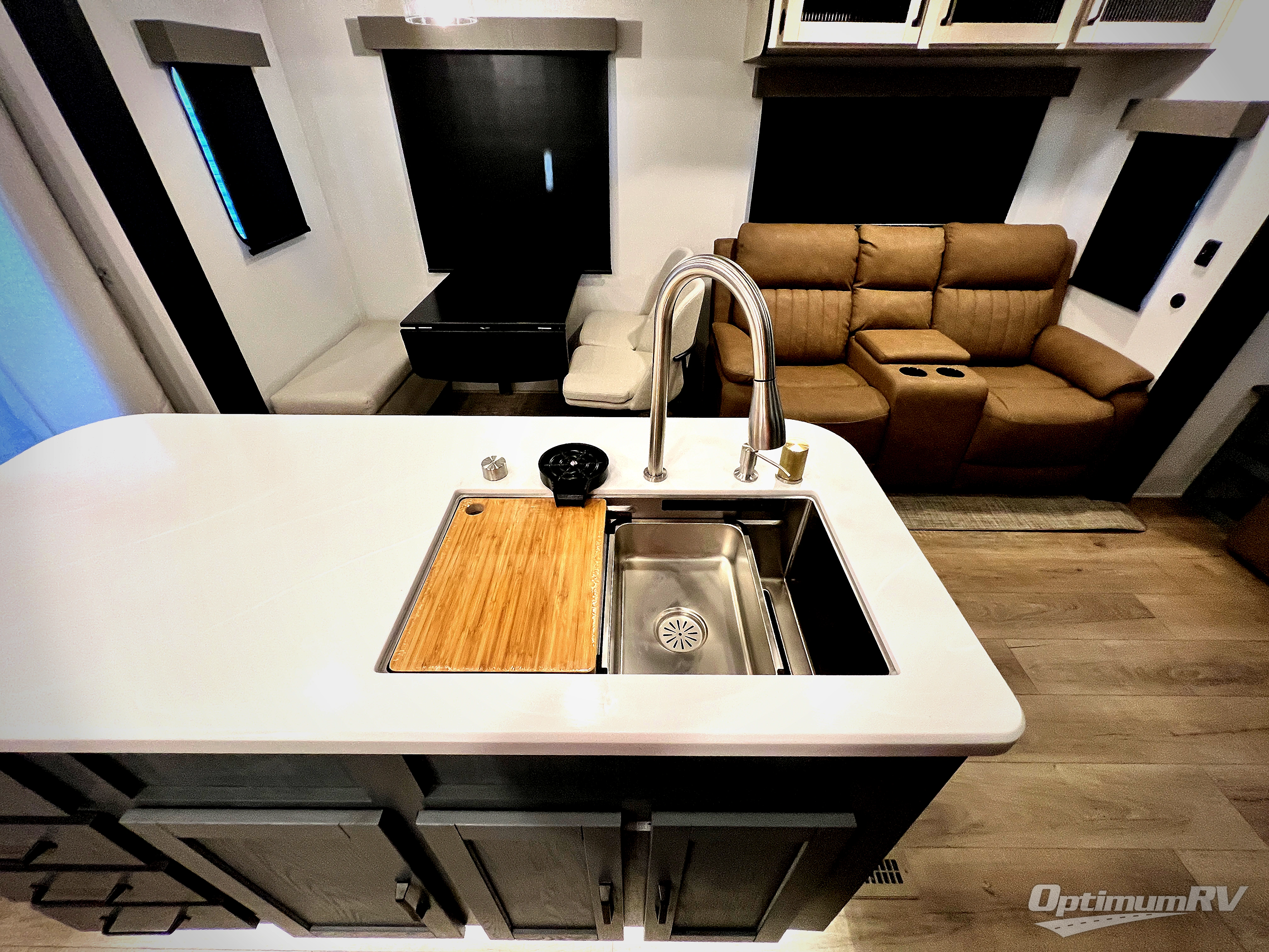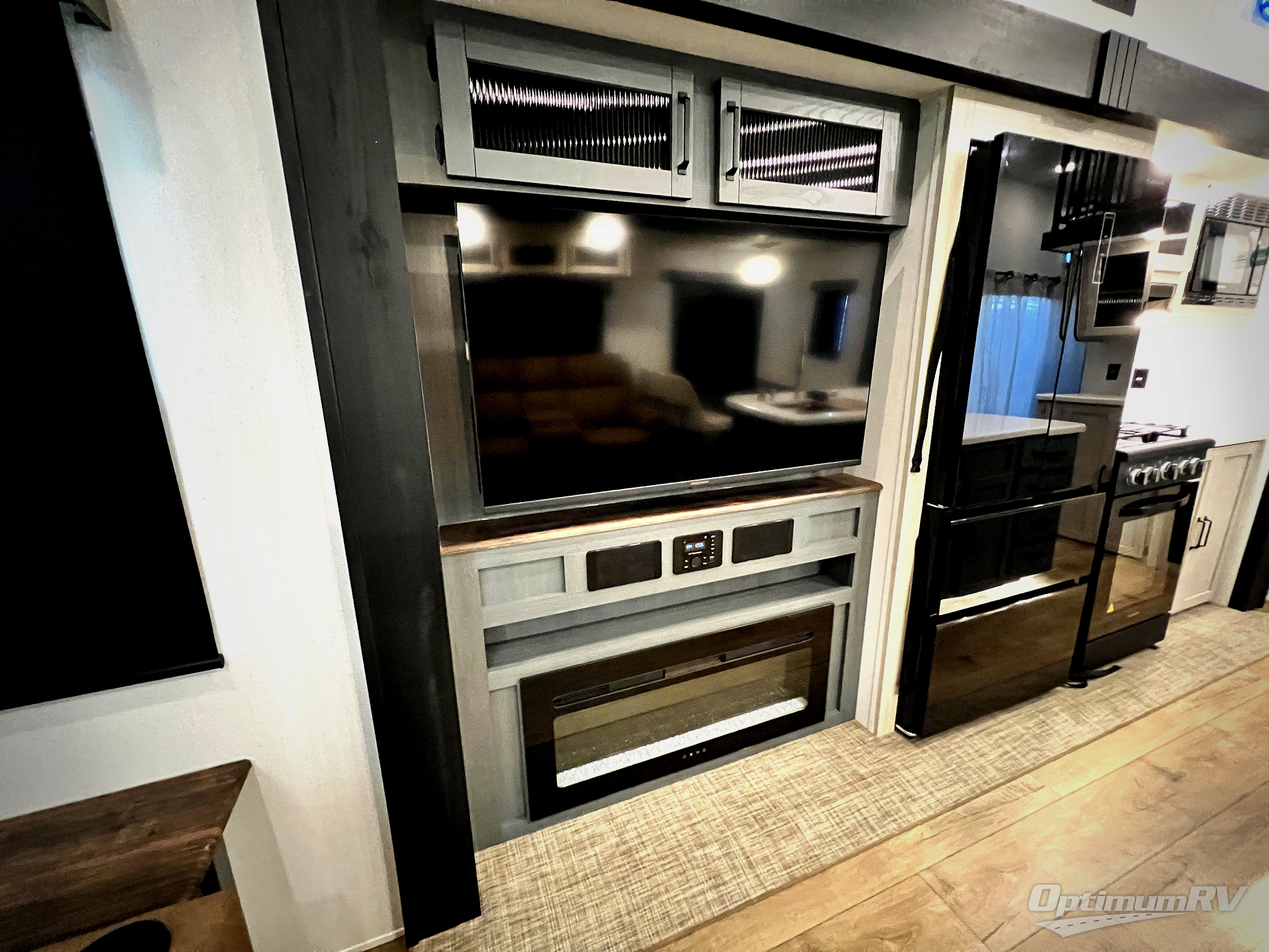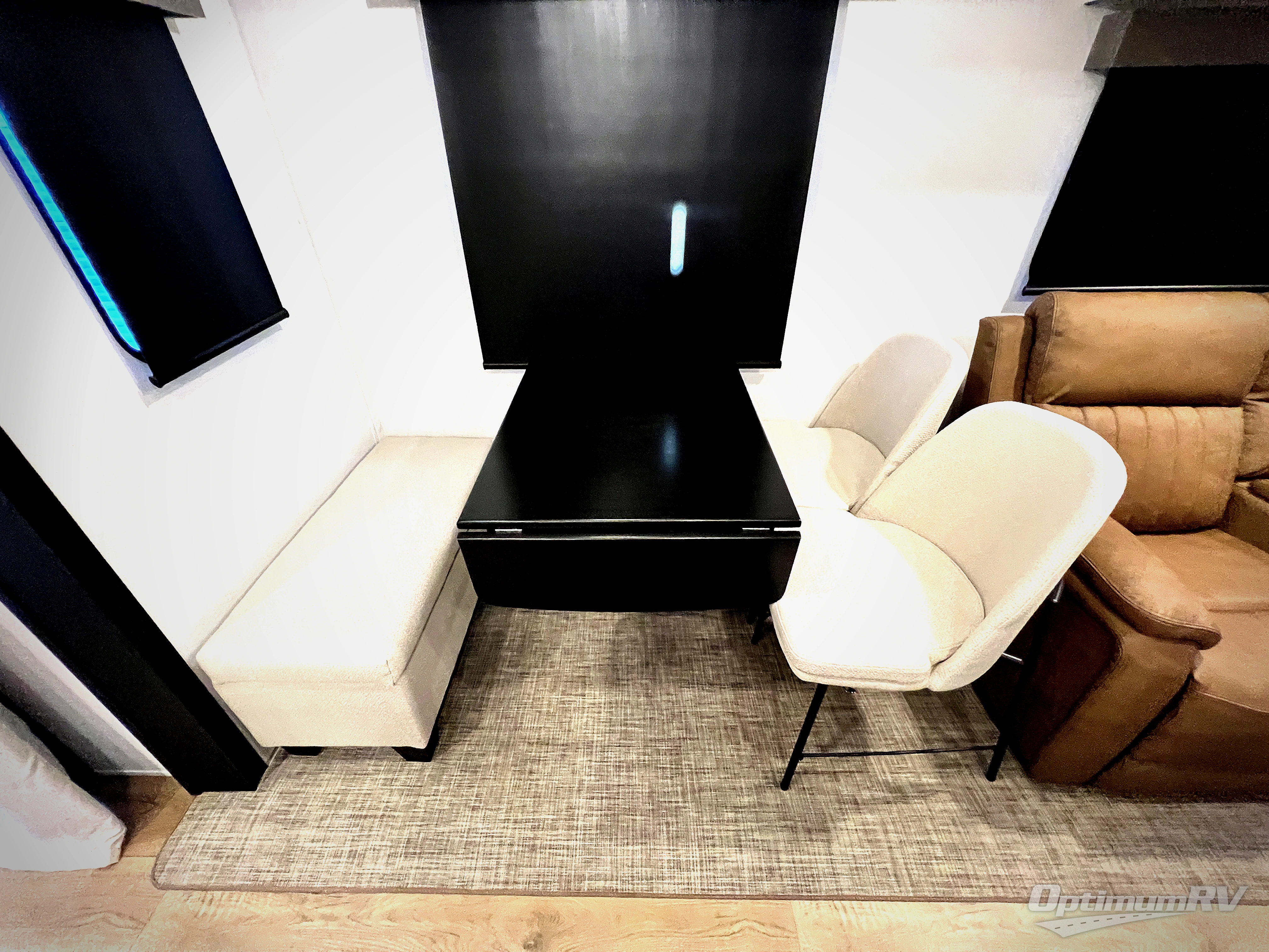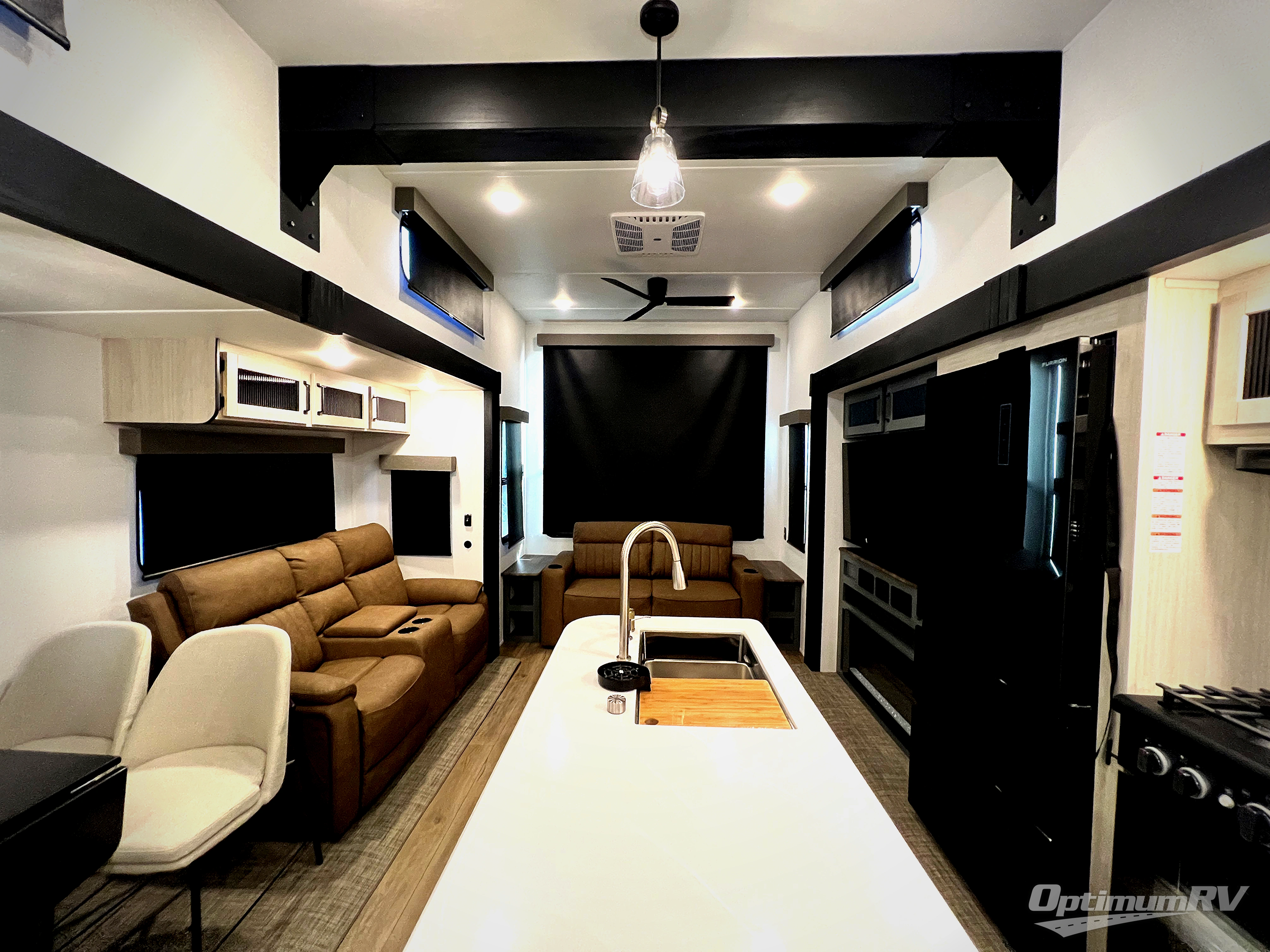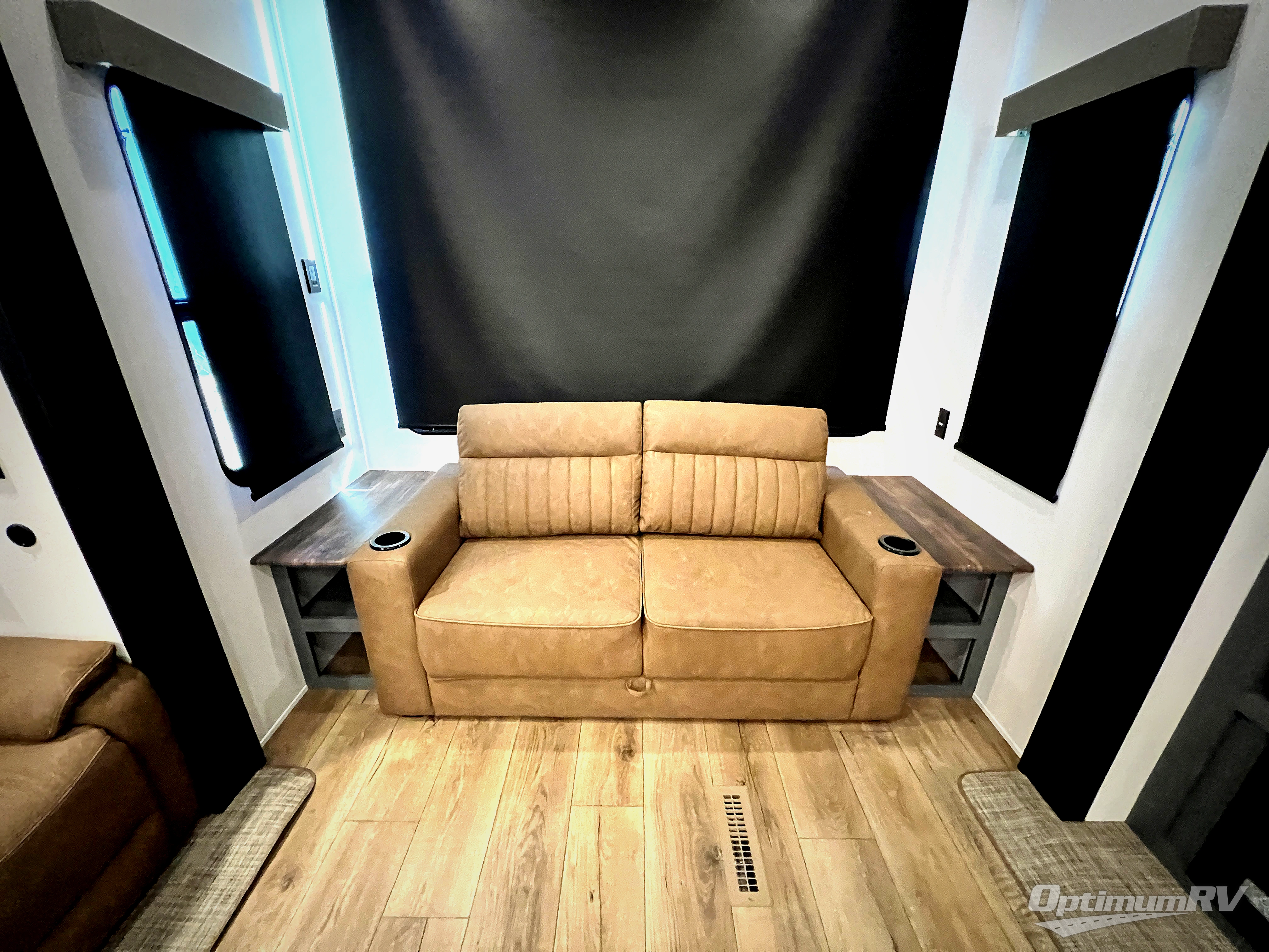 Wherever your destination may be, you can be sure to enjoy it to the fullest with this trailer in tow! With two entry doors, you can enter in through the front private bedroom or the main living area. The bedroom includes a king bed slide out, a desktop if you need to work from home, and a wardrobe/closet to keep your clothes organized. There is also a closet with the option to add washer and dryer prep. Just outside this room are steps that lead to the large loft area with a 58" x 58" bunk mat and a cabinet on one side, plus two 32" x 80" bunk mats on the other. There is also a front cabinet and a wardrobe/closet for plenty of storage space. Once you've headed back downstairs, you can relax on the dual recliners, rear sofa, or free-standing table with a bench and two seats. And the chef of your group will love the kitchen with its residential style refrigerator and pantry, kitchen island, and four burner cooktop!