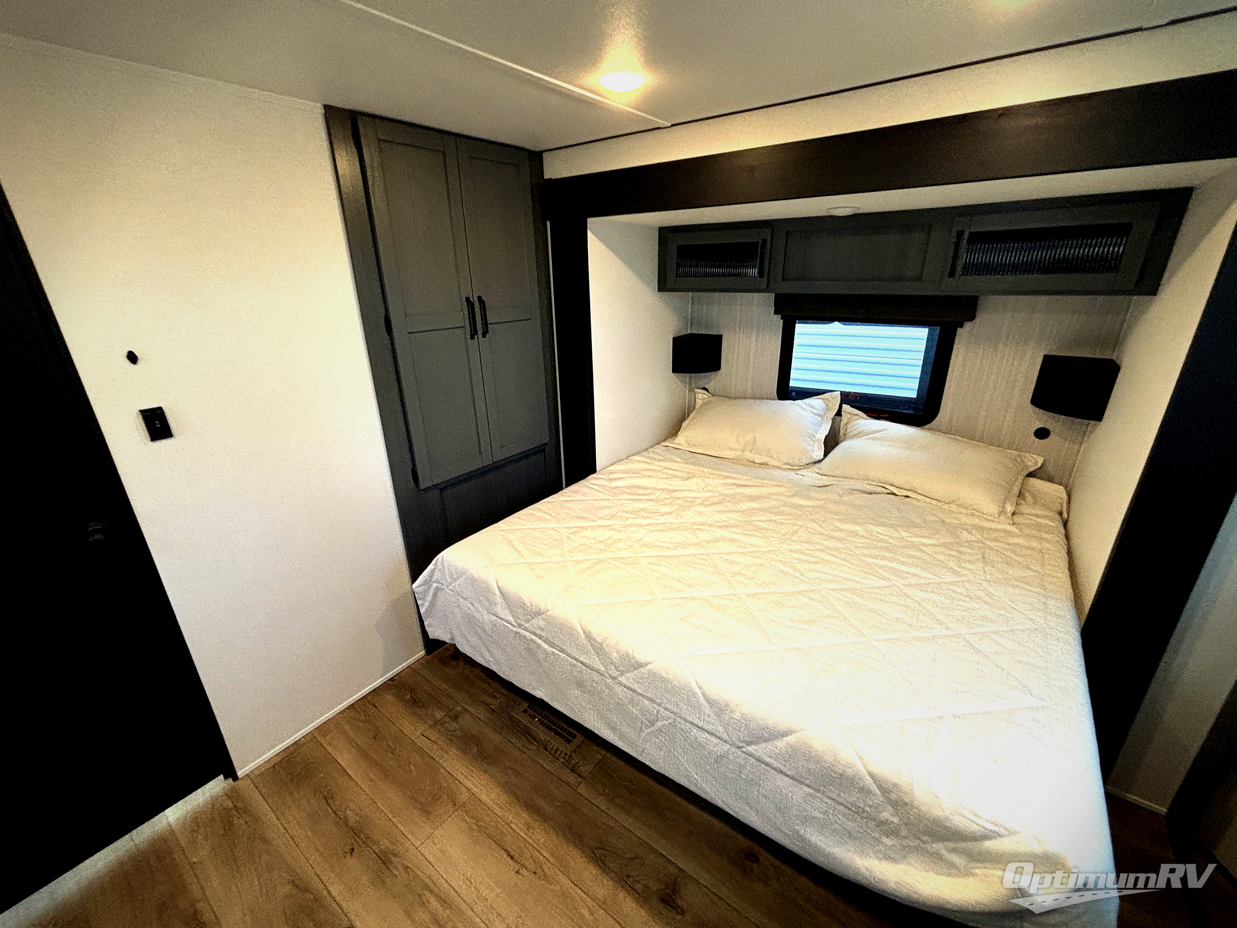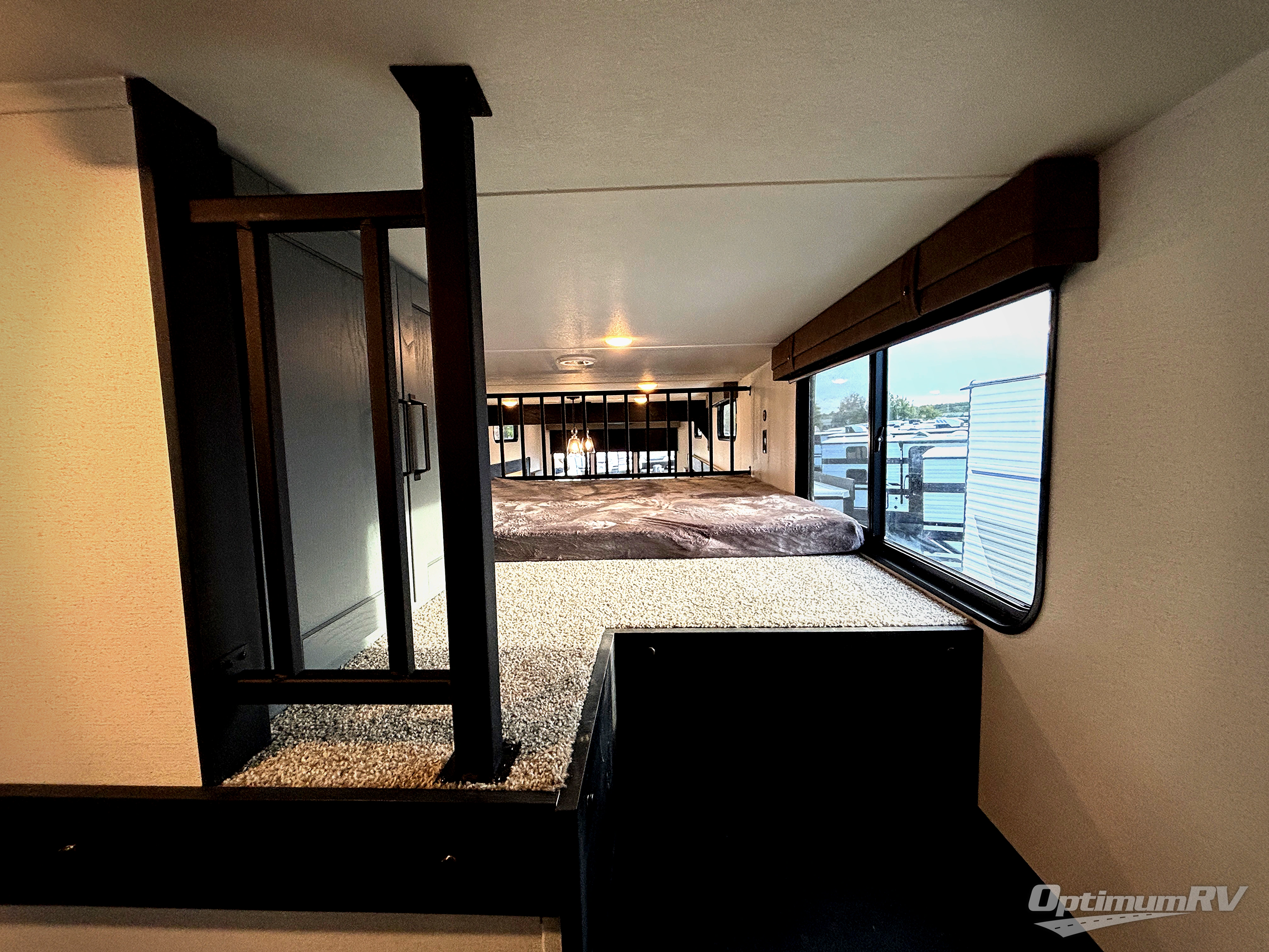 Wherever your destination may be, you can be sure to enjoy it to the fullest with this trailer in tow! With two entry doors, you can enter in through the front private bedroom or the main living area. The bedroom includes a king bed slide out, a desktop if you need to work from home, and a wardrobe/closet to keep your clothes organized. There is also a closet with the option to add washer and dryer prep. Just outside this room are steps that lead to the large loft area with a 58" x 58" bunk mat and a cabinet on one side, plus two 32" x 80" bunk mats on the other. There is also a front cabinet and a wardrobe/closet for plenty of storage space. Once you've headed back downstairs, you can relax on the dual recliners, rear sofa, or free-standing table with a bench and two seats. And the chef of your group will love the kitchen with its residential style refrigerator and pantry, kitchen island, and four burner cooktop!