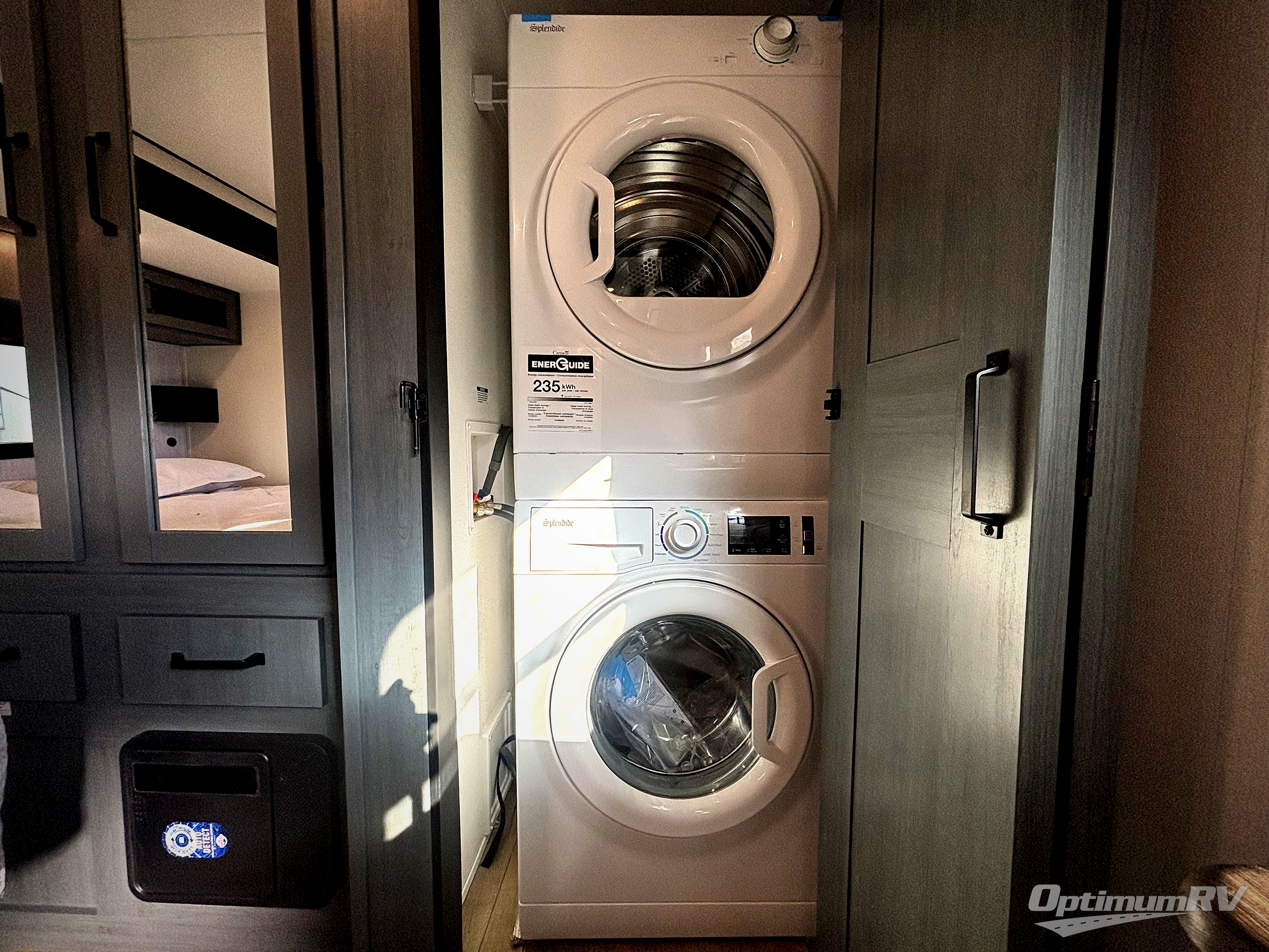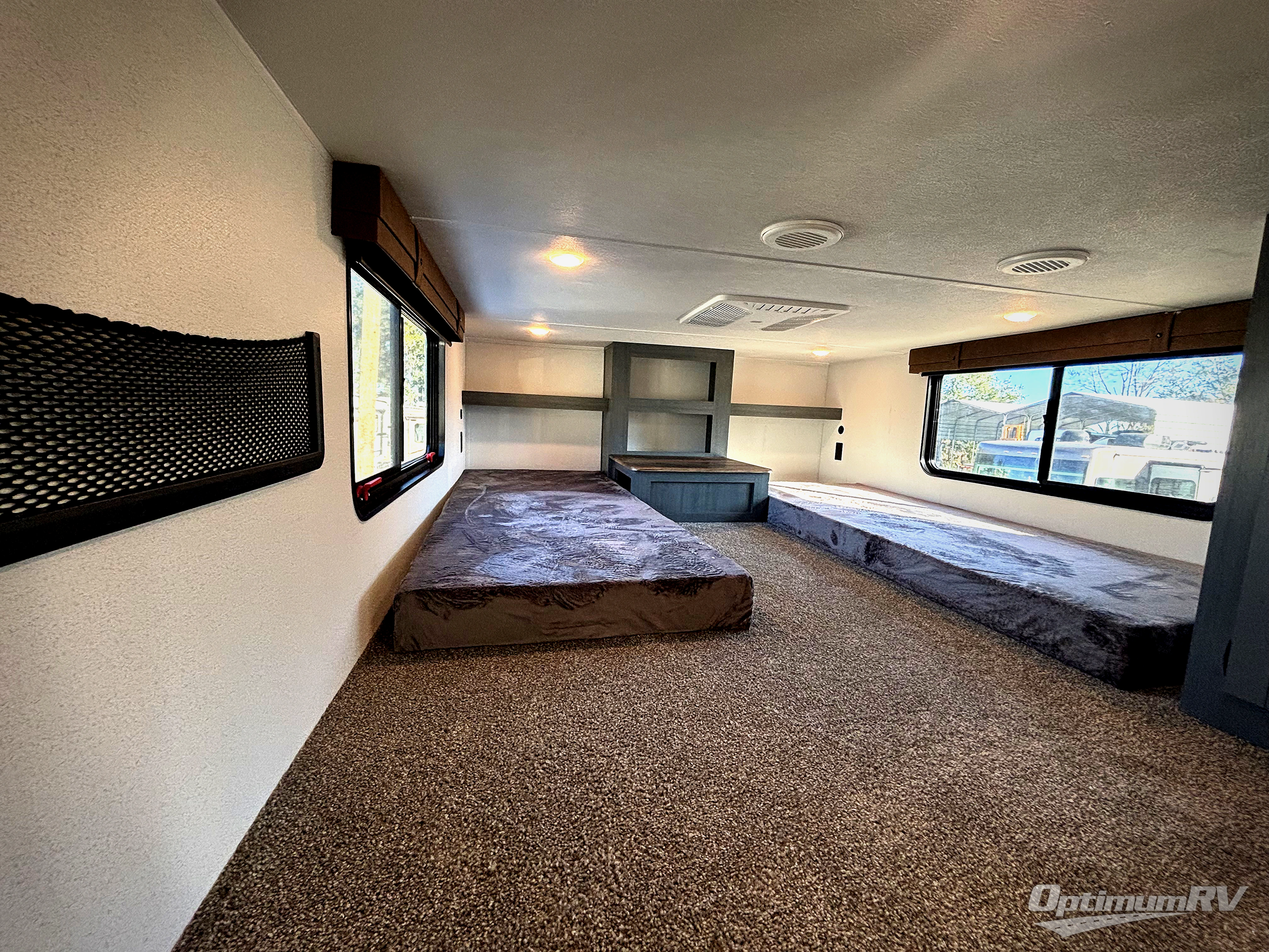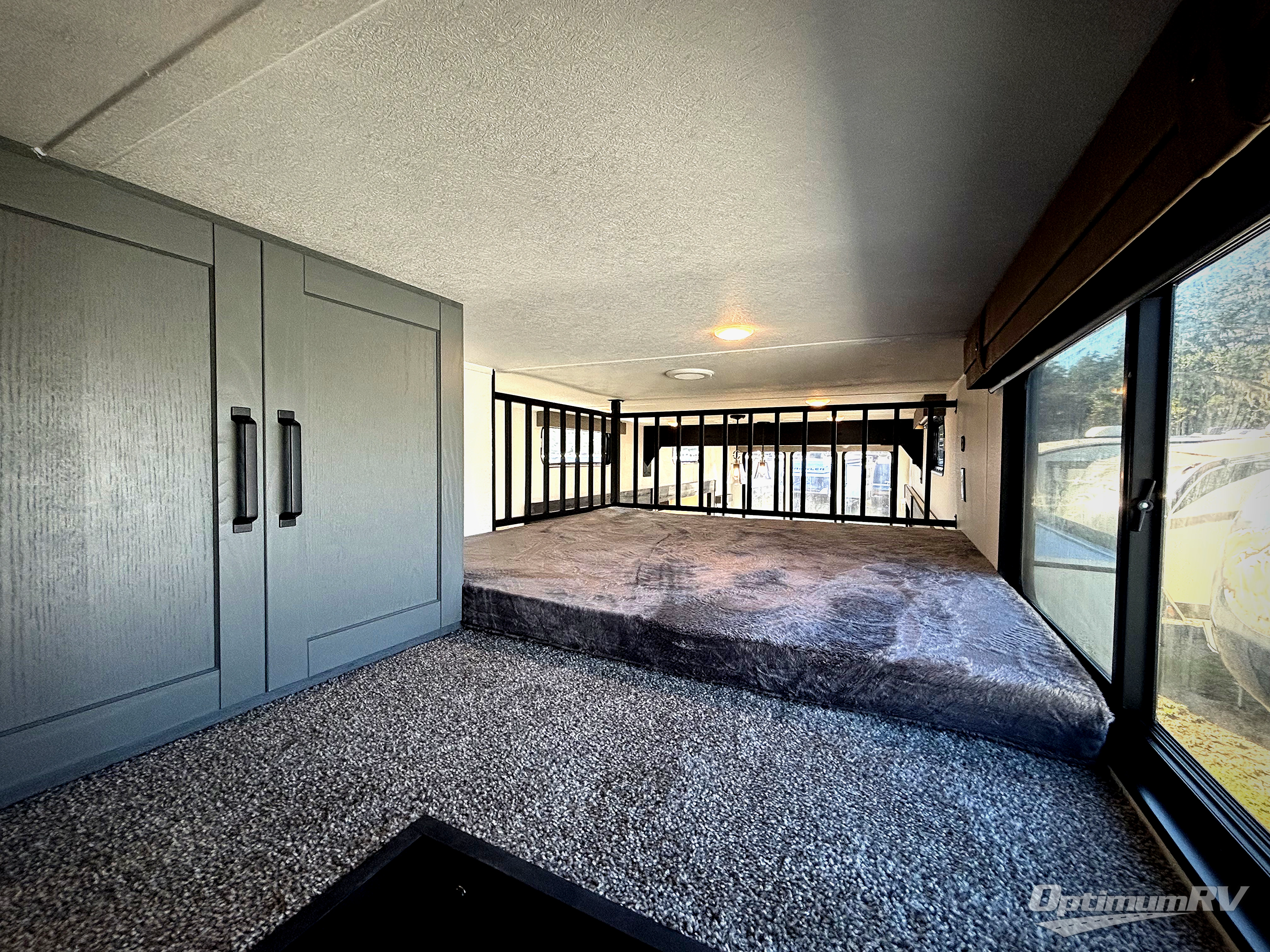 Wherever your destination may be, you can be sure to enjoy it to the fullest with this trailer in tow! With two entry doors, you can enter in through the front private bedroom or the main living area. The bedroom includes a king bed slide out, a desktop if you need to work from home, and a wardrobe/closet to keep your clothes organized. There is also a closet with the washer and dryer prep if you plan to add these appliances. Just outside this room are steps that lead to the large loft area with a 58" x 58" bunk mat and a cabinet on one side, plus two 32" x 80" bunk mats on the other. There is also a front cabinet and a wardrobe/closet for plenty of storage space. Once you've headed back downstairs, you can relax on the theater seating, rear sofa, or table and chairs with bench seating. And the chef of your group will love the kitchen with its residential style refrigerator and pantry, kitchen island, and four burner cooktop!