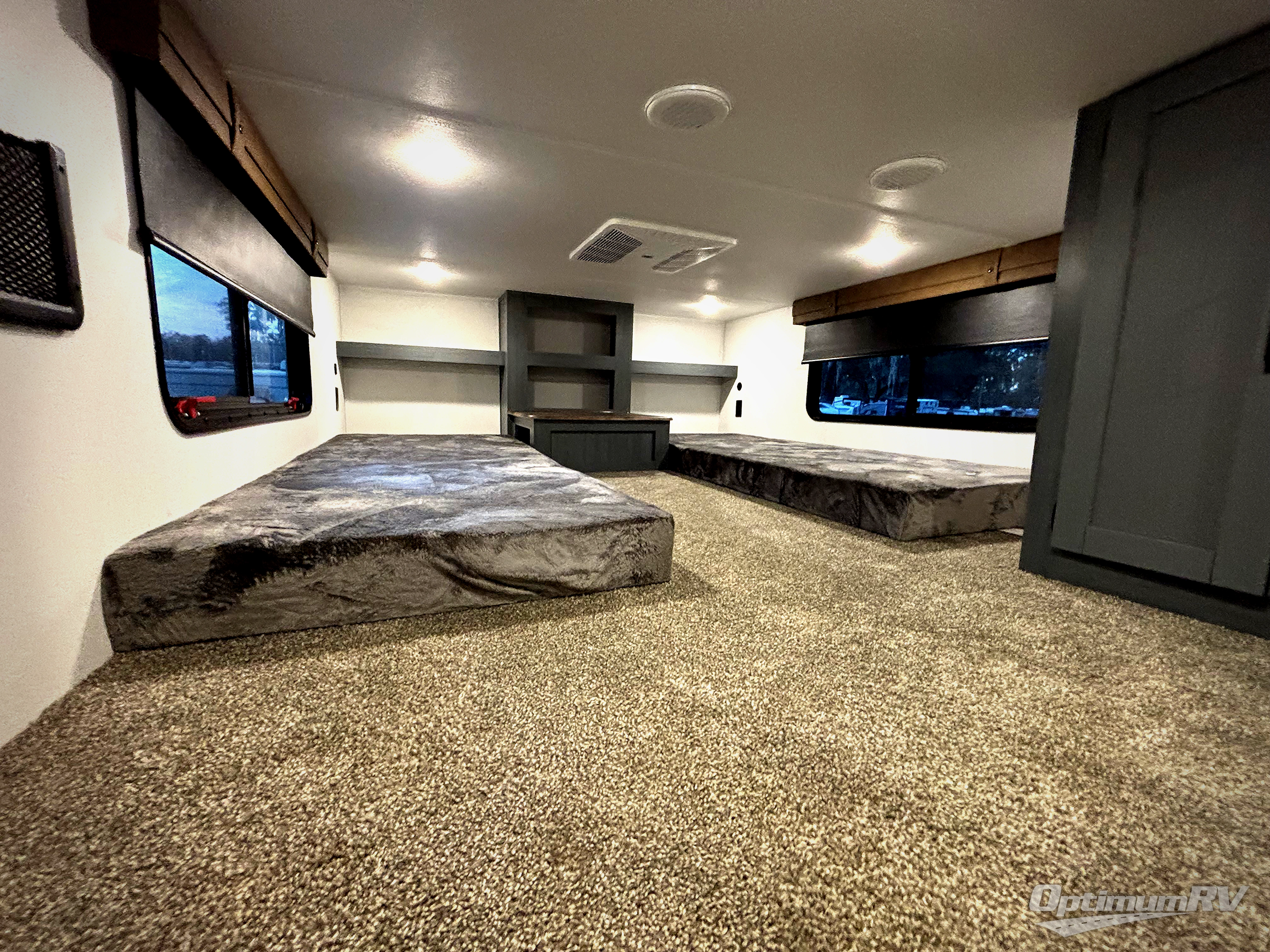 Wherever your destination may be, you can be sure to enjoy it to the fullest with this trailer in tow! With two entry doors, you can enter in through the front private bedroom or the main living area. The bedroom includes a king bed slide out, a desktop if you need to work from home, and a wardrobe/closet to keep your clothes organized. There is also a closet with the washer and dryer prep if you plan to add these appliances. Just outside this room are steps that lead to the large loft area with a 58" x 58" bunk mat and a cabinet on one side, plus two 32" x 80" bunk mats on the other. There is also a front cabinet and a wardrobe/closet for plenty of storage space. Once you've headed back downstairs, you can relax on the theater seating, rear sofa, or table and chairs with bench seating. And the chef of your group will love the kitchen with its residential style refrigerator and pantry, kitchen island, and four burner cooktop!