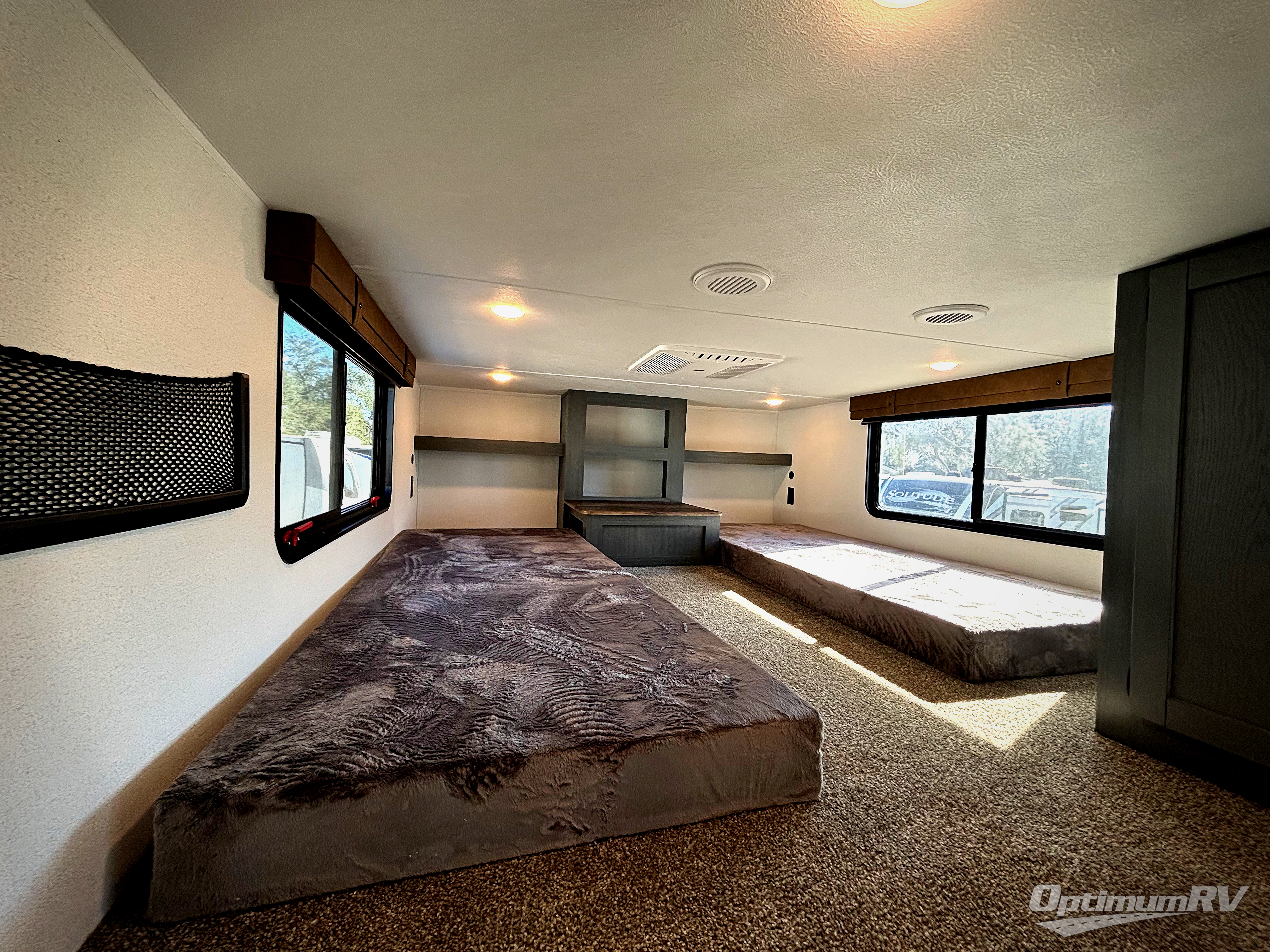 Wherever your destination may be, you can be sure to enjoy it to the fullest with this trailer in tow! With two entry doors, you can enter in through the front private bedroom or the main living area. The bedroom includes a king bed slide out, a desktop if you need to work from home, and a wardrobe/closet to keep your clothes organized. There is also a closet with the washer and dryer prep if you plan to add these appliances. Just outside this room are steps that lead to the large loft area with a 58" x 58" bunk mat and a cabinet on one side, plus two 32" x 80" bunk mats on the other. There is also a front cabinet and a wardrobe/closet for plenty of storage space. Once you've headed back downstairs, you can relax on the theater seating, rear sofa, or table and chairs with bench seating. And the chef of your group will love the kitchen with its residential style refrigerator and pantry, kitchen island, and four burner cooktop!