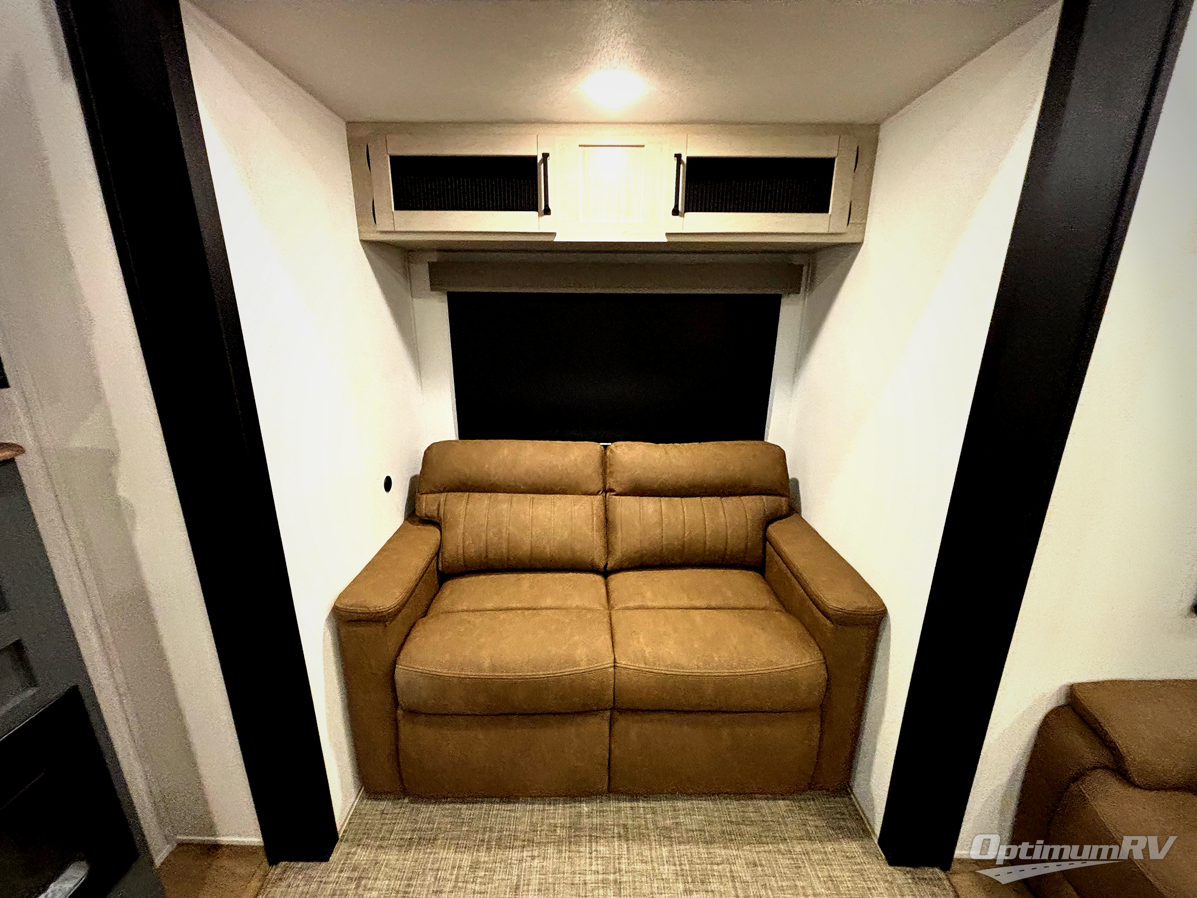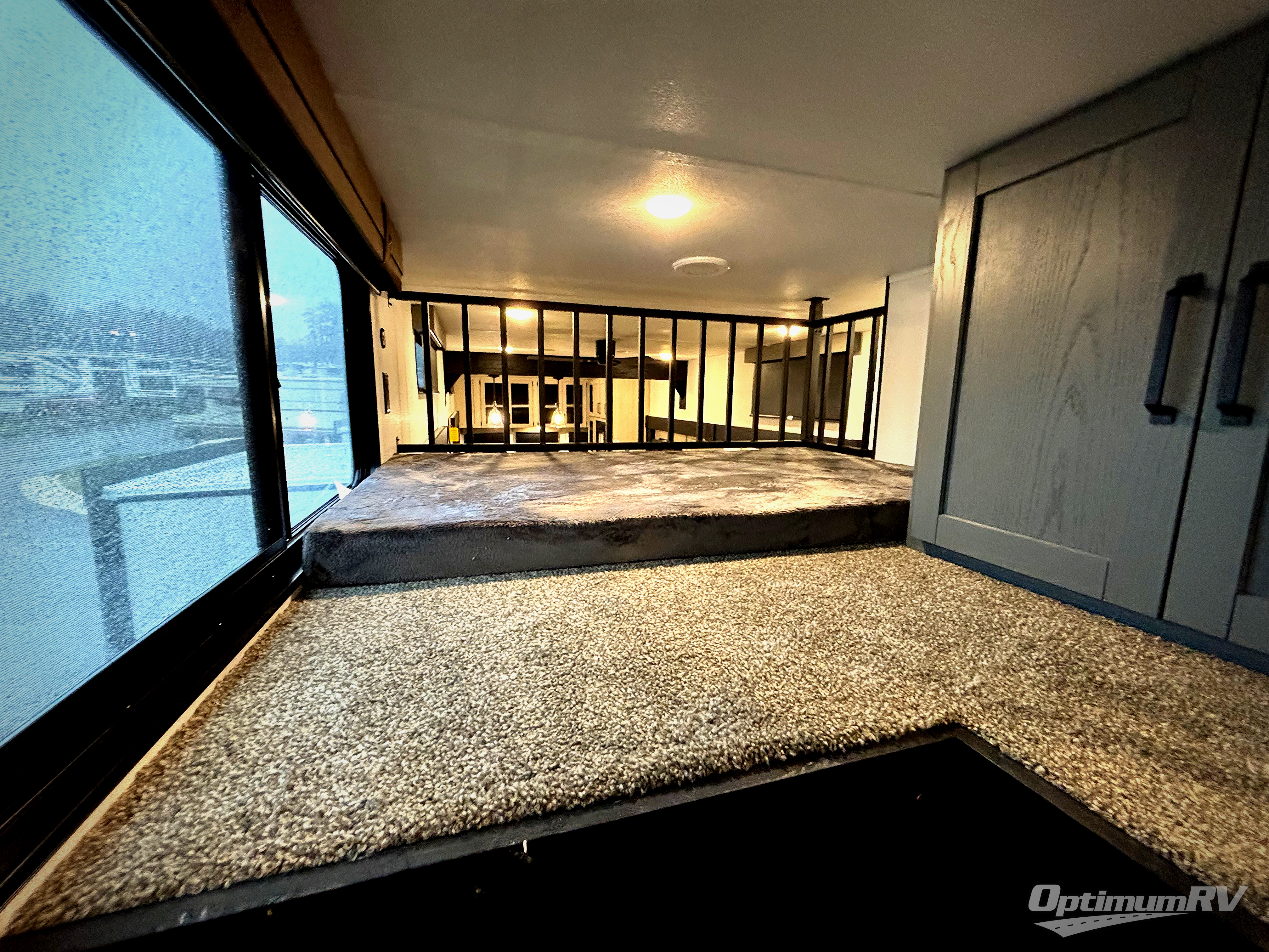 This is the perfect destination trailer for a larger group since it can sleep up to nine campers each night. The little ones will love the double loft areas with three bunk mats and storage space for their things, while you take the rear private bedroom. There is a king bed slide out here, along with a wardrobe/closet for your clothes, plus a second closet with washer and dryer prep. Everyone can meet in the middle living room to relax on the dual opposing sofas or theater seating across from the fireplace and entertainment center. Head to the front of the unit where you'll find the kitchen that includes ample counter space to prep meals, a residential style refrigerator and pantry for food storage, and a free-standing table to dine at. There is also a breakfast nook that overlooks the living area so you can visit with the cook and watch a movie at the same time!