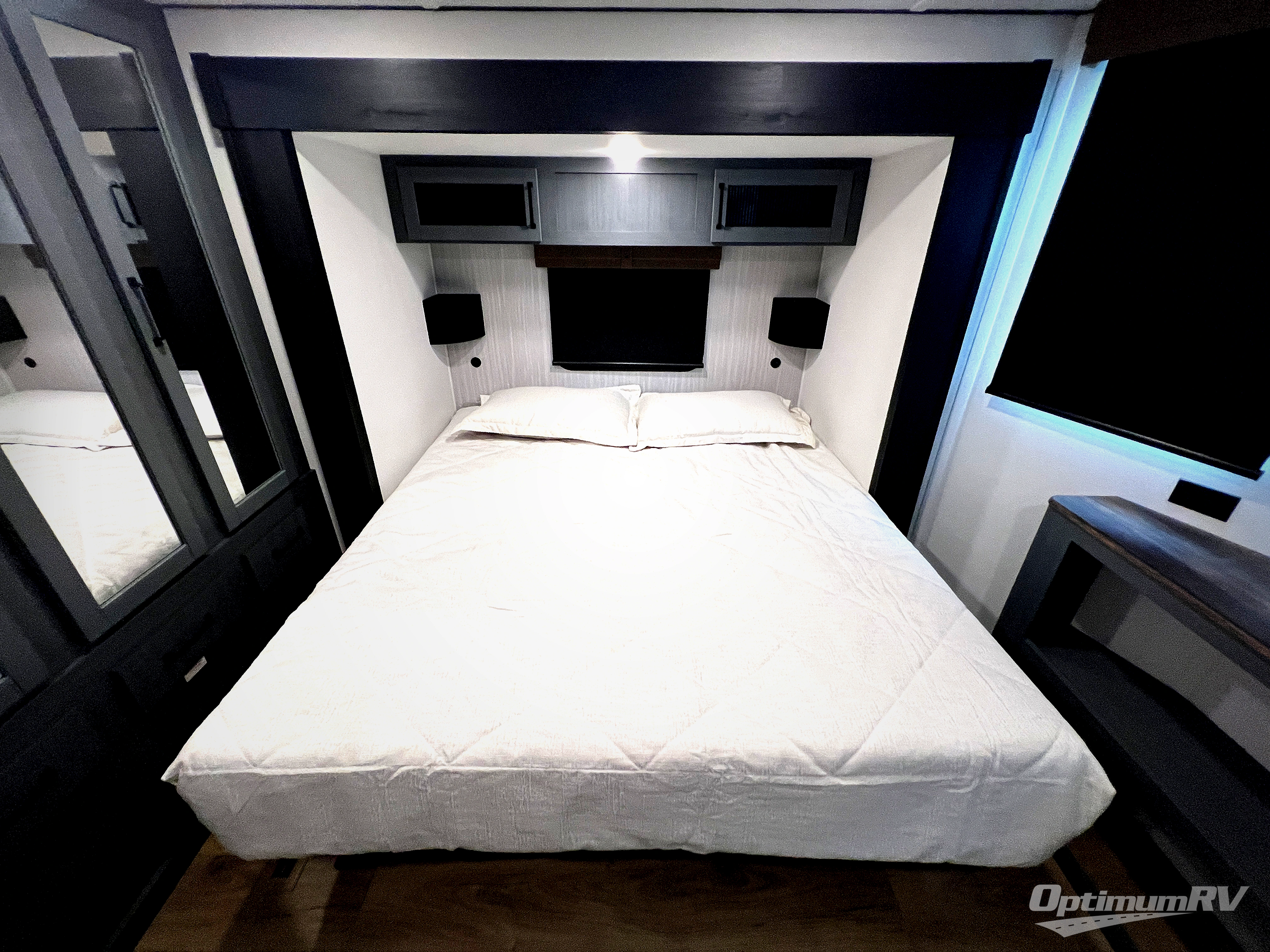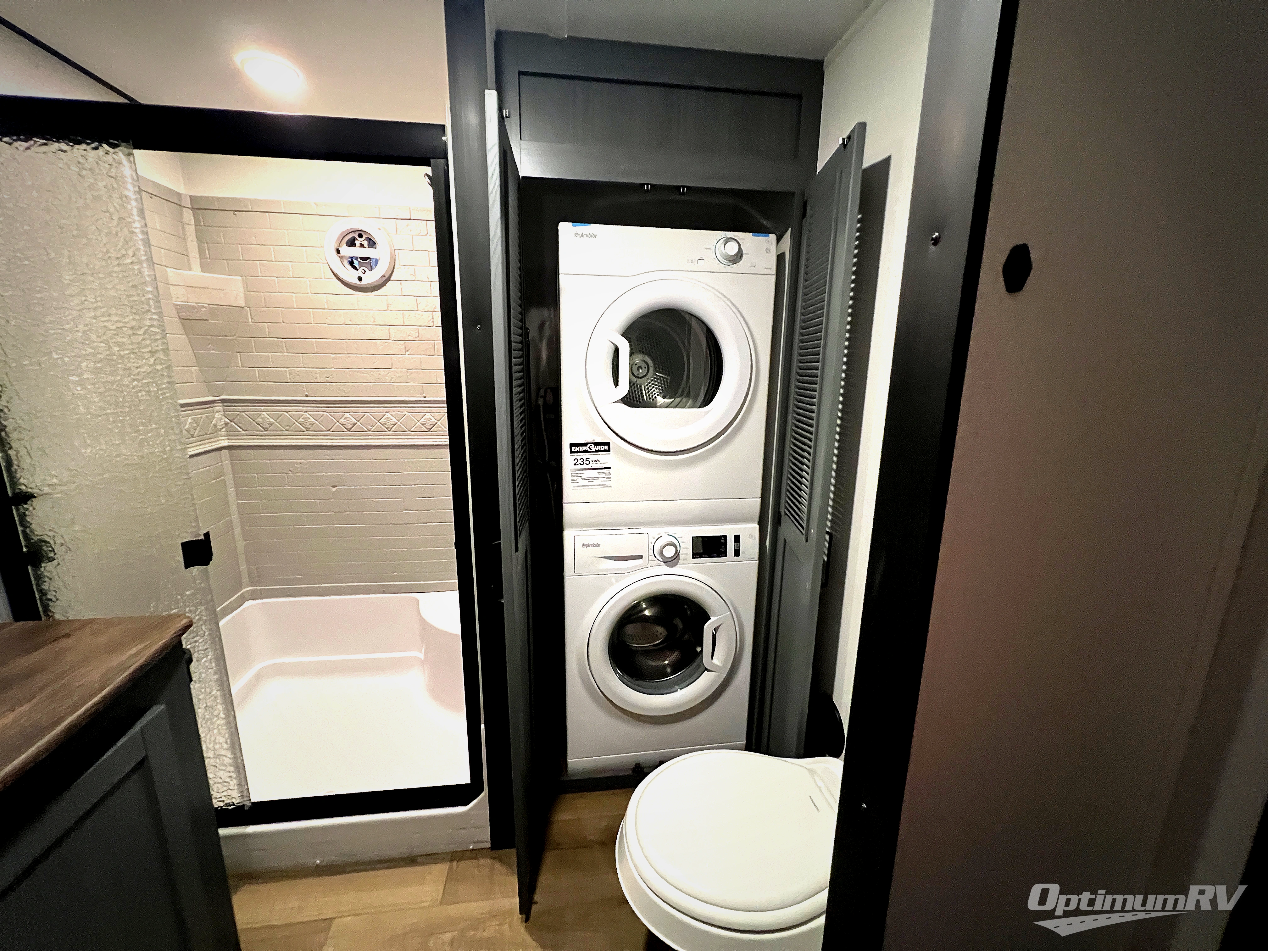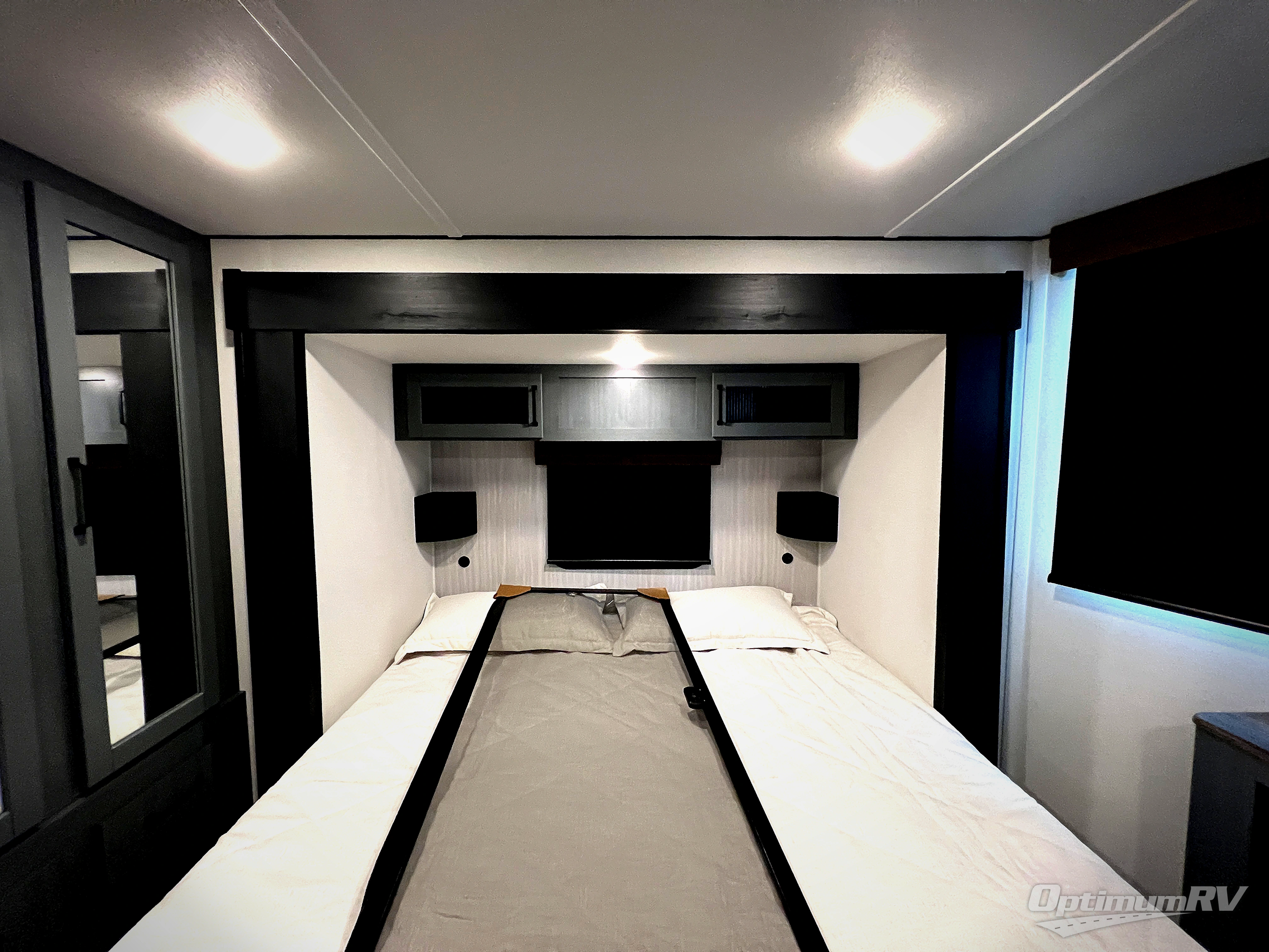 Head to your favorite spots with this destination trailer! With two entry doors, you can easily enter or exit the unit. The front private bedroom includes a king bed slide out, a wardrobe and dresser to keep your clothes organized, plus a countertop for your books or jewelry. Just outside this room is the ladder that leads to the large loft area with two 32" x 80" bunk mats, a cubby, a counter, a nightstand, and cabinets. Once you've headed back downstairs, you can relax on the L-shaped sofa across from the entertainment center with a fireplace and slide-out cabinet or the free-standing table with a bench and two seats. And the chef of your group will love the kitchen with its residential style refrigerator and pantry, kitchen island, and four burner cooktop. The full rear bathroom not only has a 32" x 40" shower with a seat to freshen up in and a closet prepped to add the optional washer and dryer, but is also below the second loft with a 32" x 80" bunk mat and closet for storage!