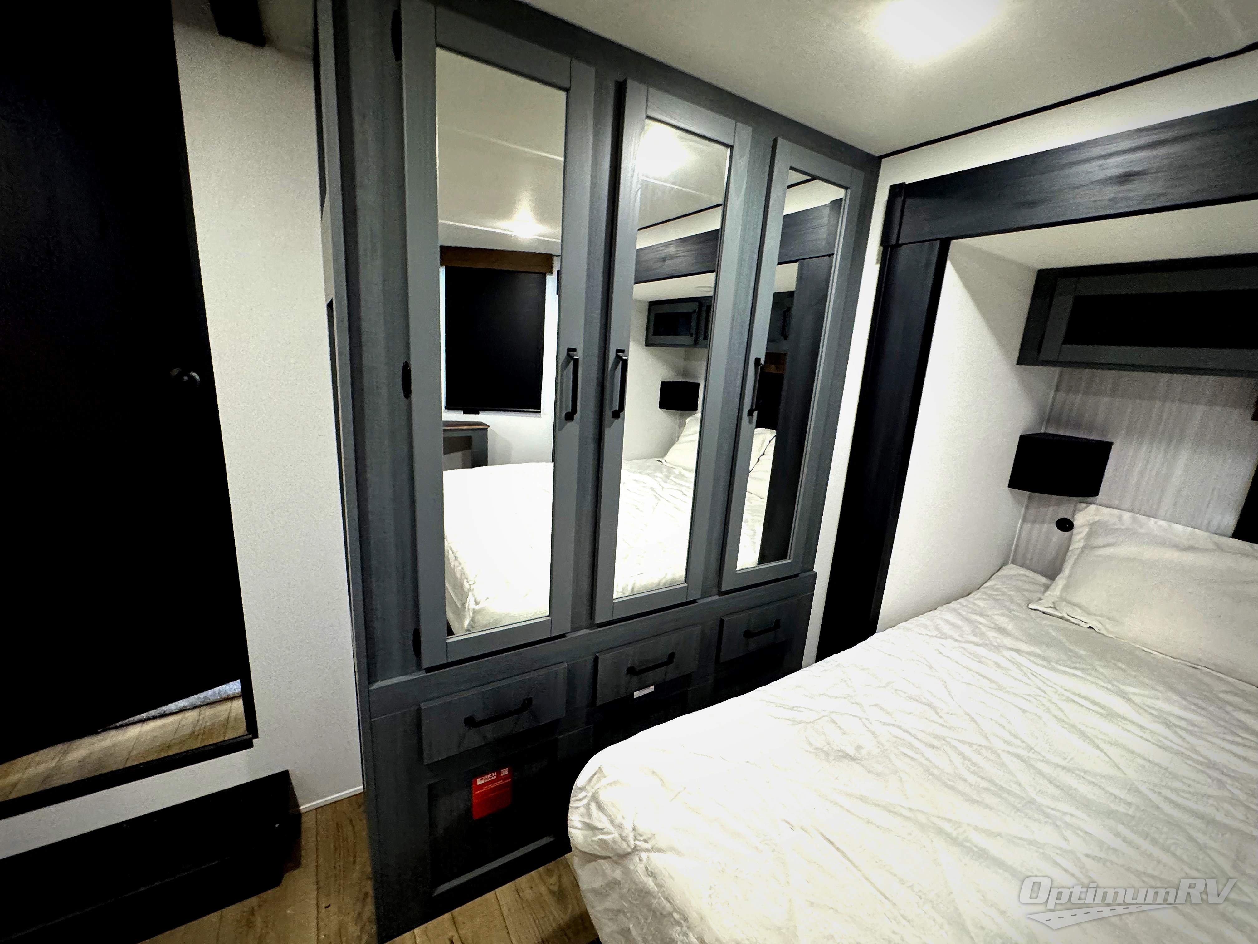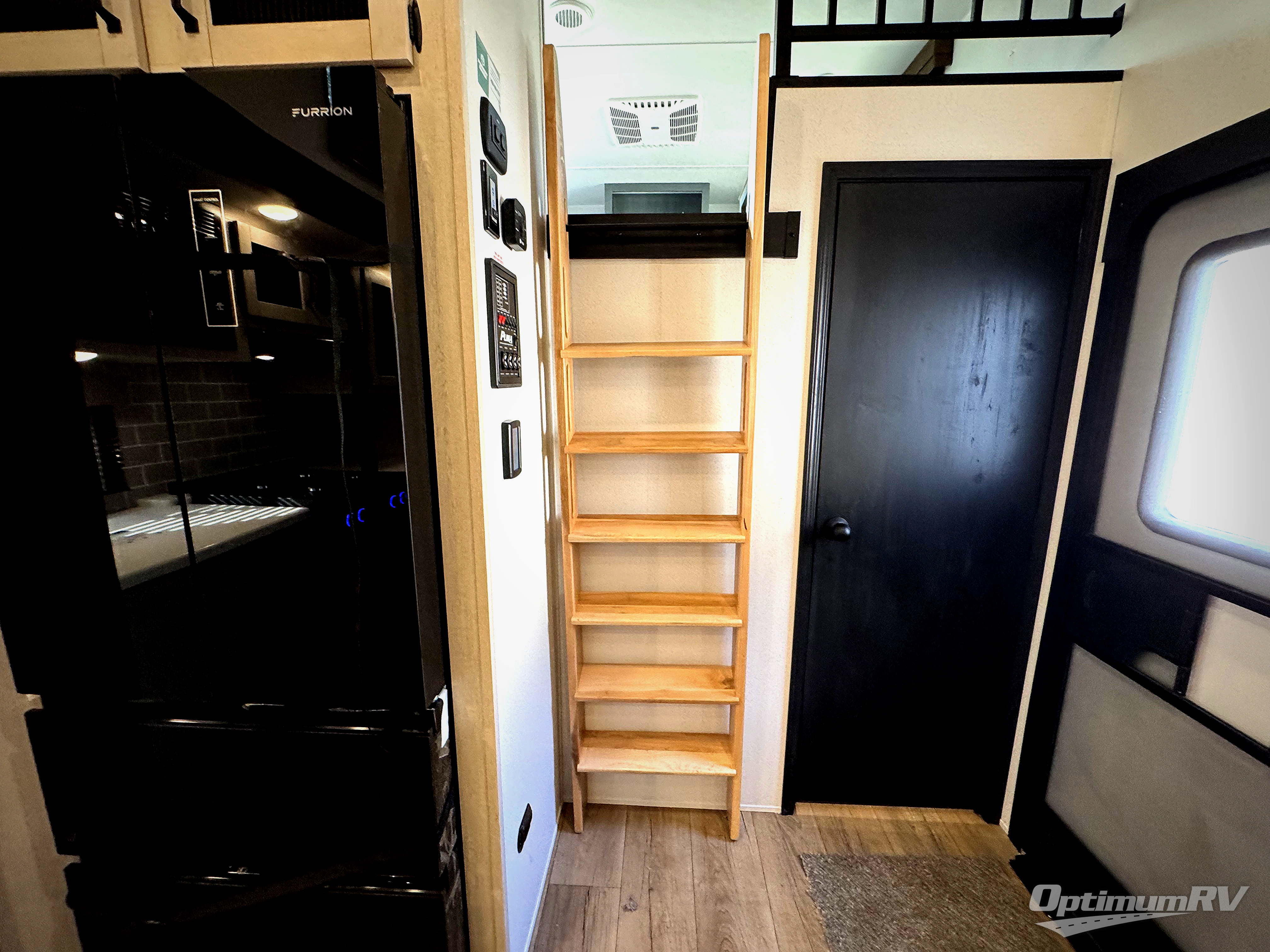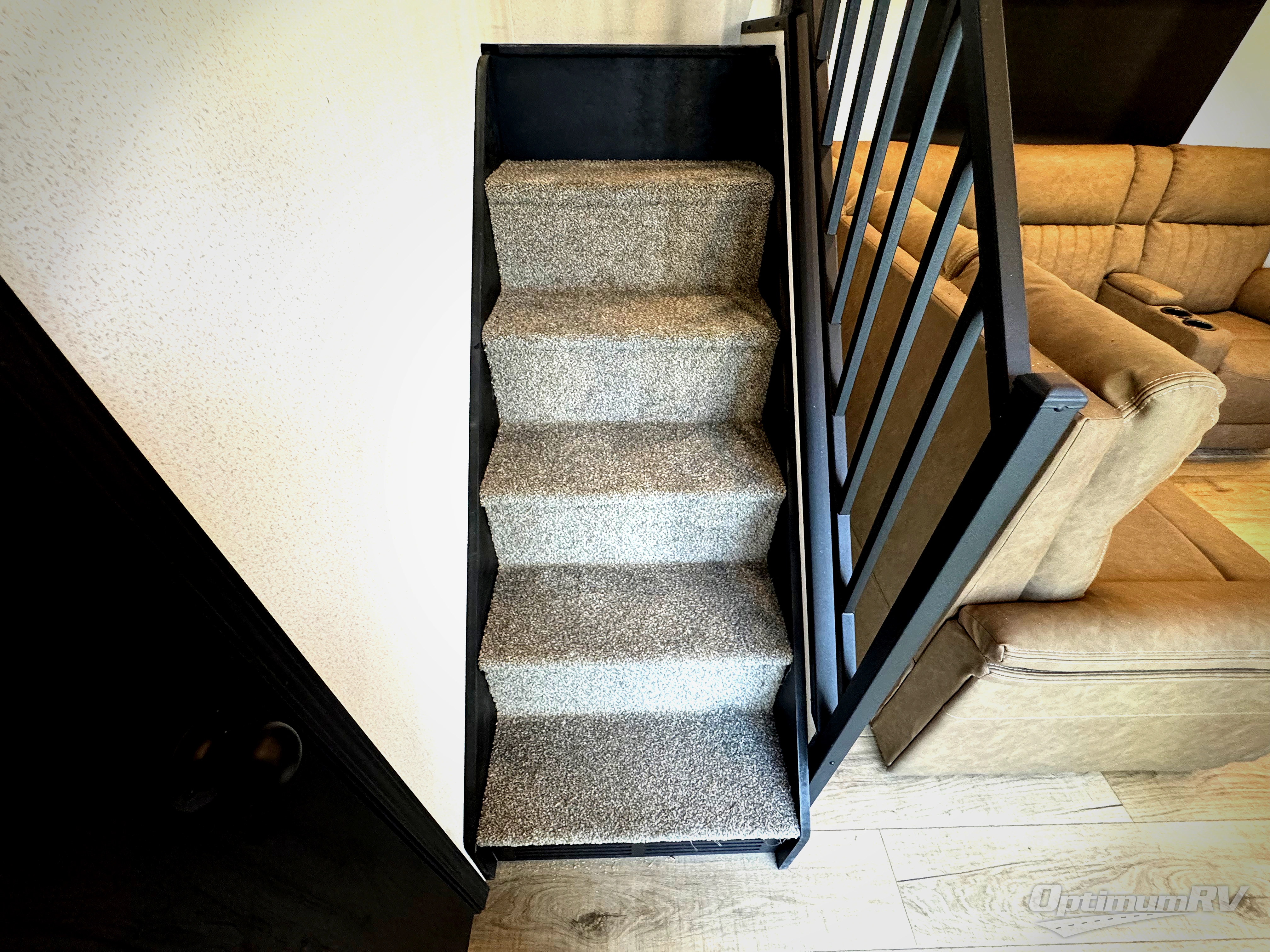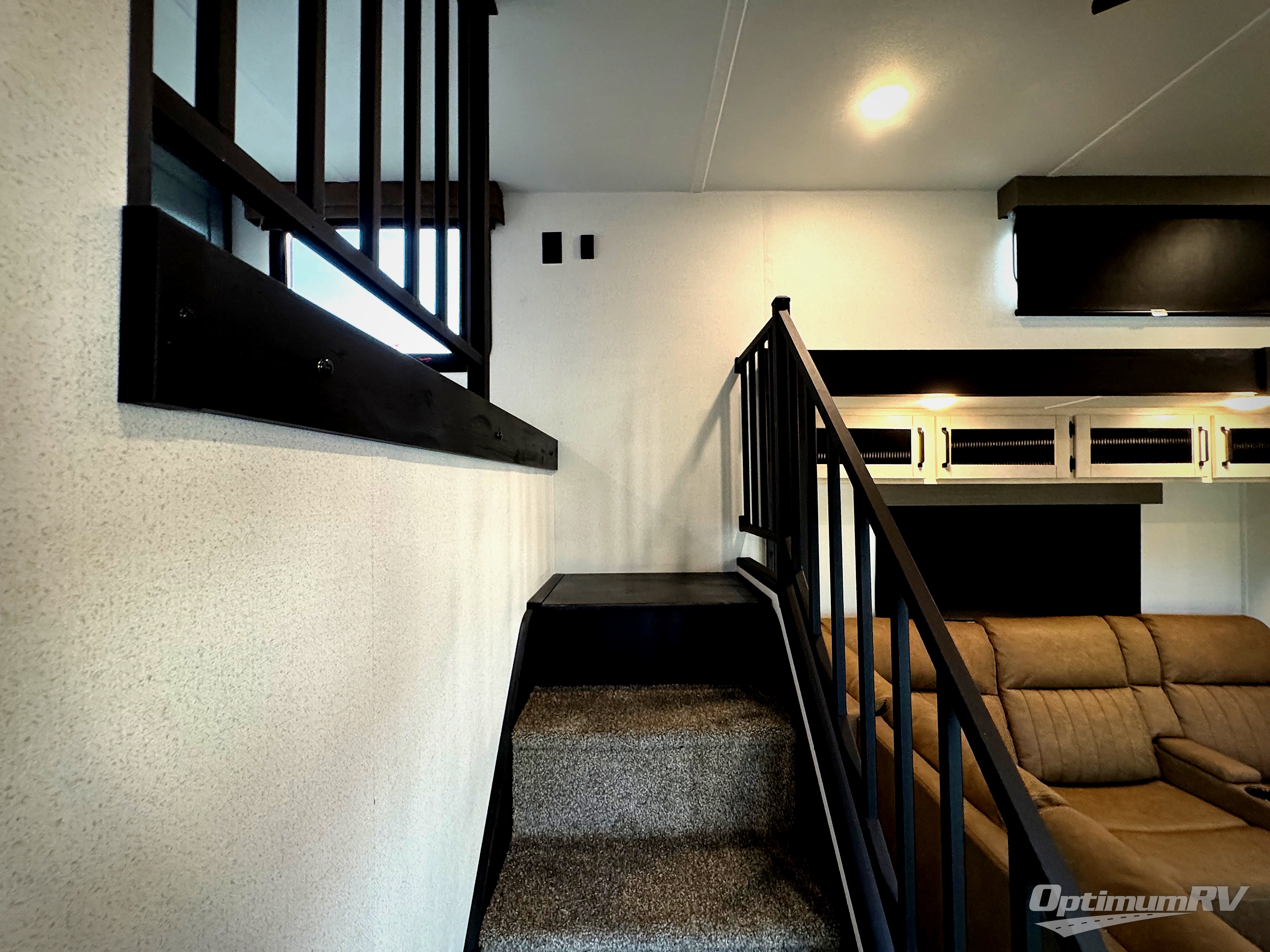 Head to your favorite spots with this destination trailer! With two entry doors, you can easily enter or exit the unit. The front private bedroom includes a king bed slide out, a wardrobe and dresser to keep your clothes organized, plus a countertop for your books or jewelry. Just outside this room is the ladder that leads to the large loft area with two 32" x 80" bunk mats, a cubby, a counter, a nightstand, and cabinets. Once you've headed back downstairs, you can relax on the L-shaped sofa across from the entertainment center with a fireplace and slide-out cabinet or the table and chairs with bench seating. And the chef of your group will love the kitchen with its residential style refrigerator and pantry, kitchen island, and four burner cooktop. The full rear bathroom not only has a 32" x 40" shower with a seat to freshen up in, and a closet with washer/dryer prep, but is also below the second loft with a 32" x 80" bunk mat and closet for storage!