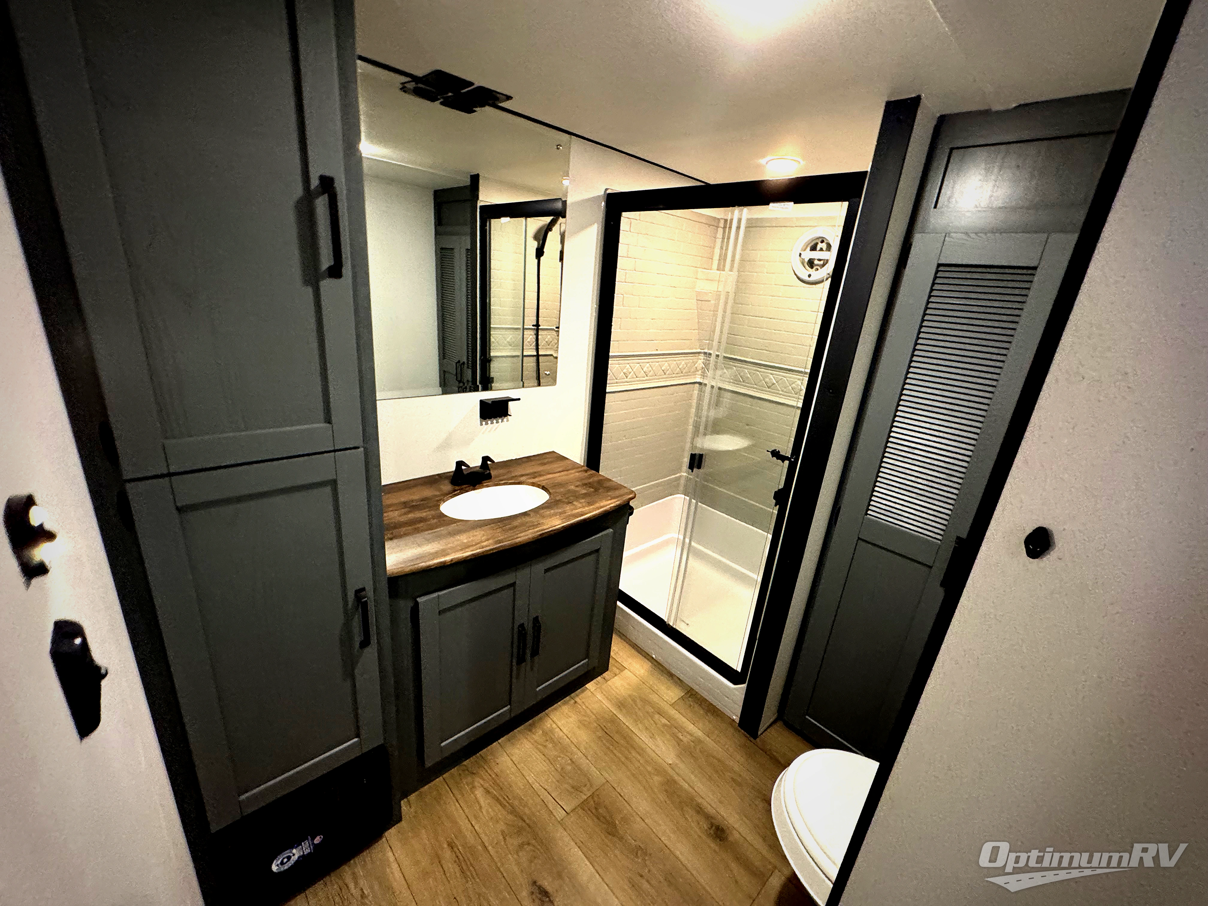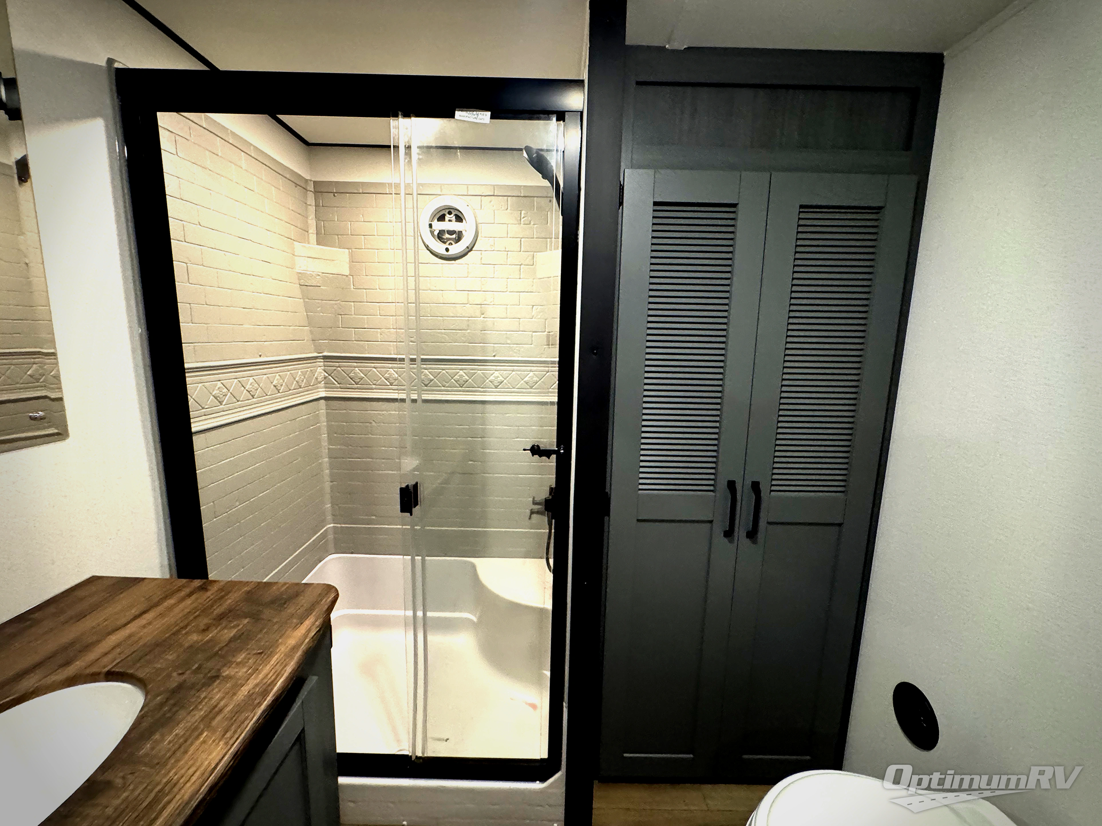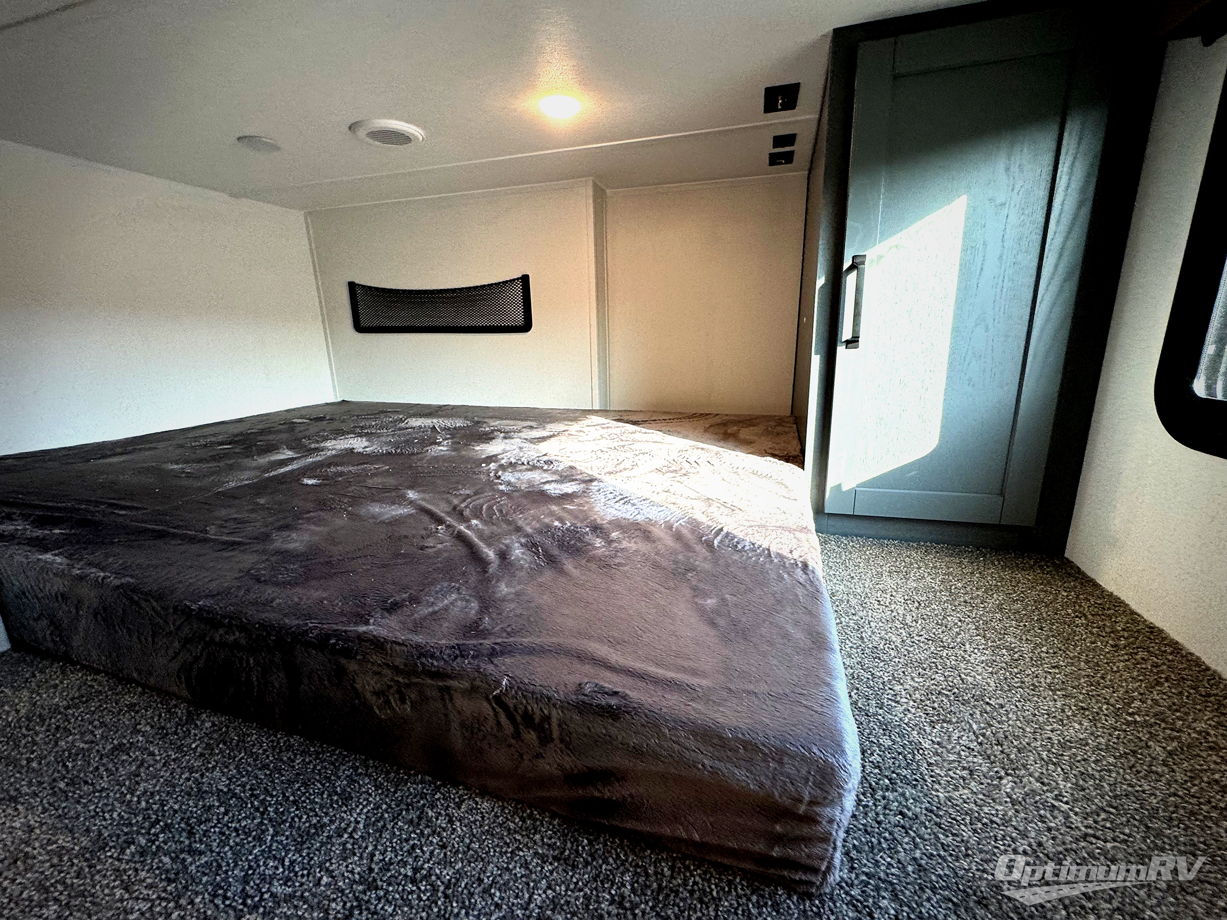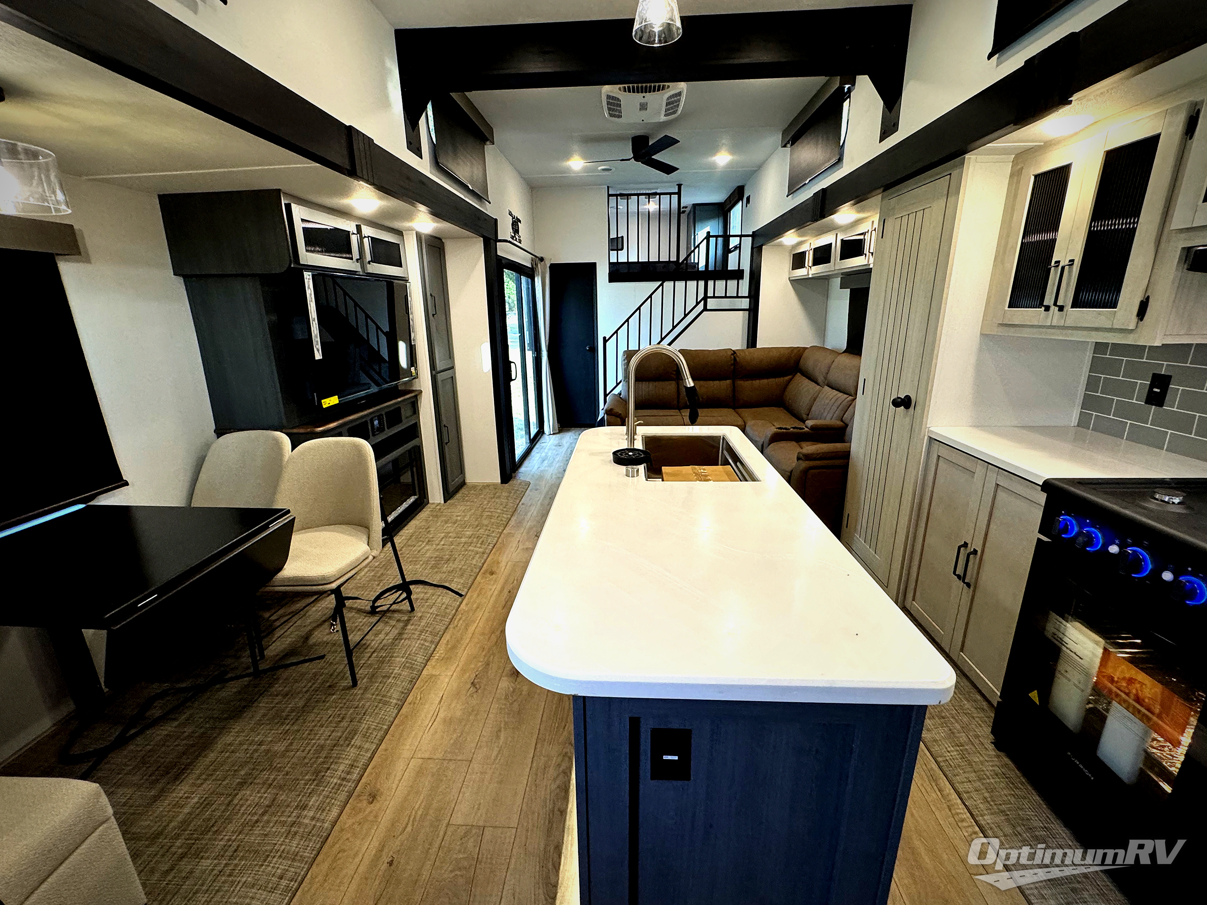 Head to your favorite spots with this destination trailer! With two entry doors, you can easily enter or exit the unit. The front private bedroom includes a king bed slide out, a wardrobe and dresser to keep your clothes organized, plus a countertop for your books or jewelry. Just outside this room is the ladder that leads to the large loft area with two 32" x 80" bunk mats, a cubby, a counter, a nightstand, and cabinets. Once you've headed back downstairs, you can relax on the L-shaped sofa across from the entertainment center with a fireplace and slide-out cabinet or the table and chairs with bench seating. And the chef of your group will love the kitchen with its residential style refrigerator and pantry, kitchen island, and four burner cooktop. The full rear bathroom not only has a 32" x 40" shower with a seat to freshen up in, and a closet with washer/dryer prep, but is also below the second loft with a 32" x 80" bunk mat and closet for storage!