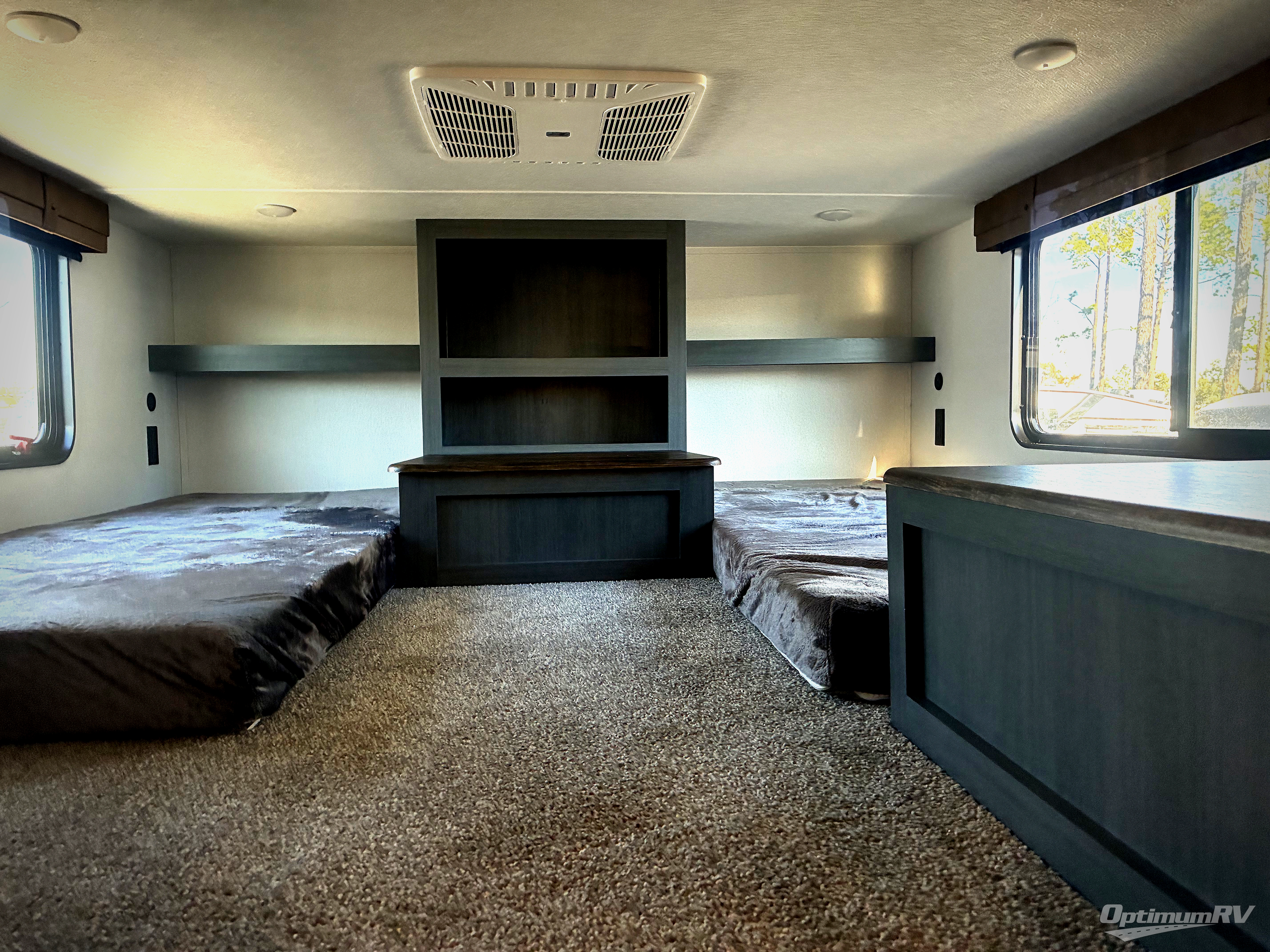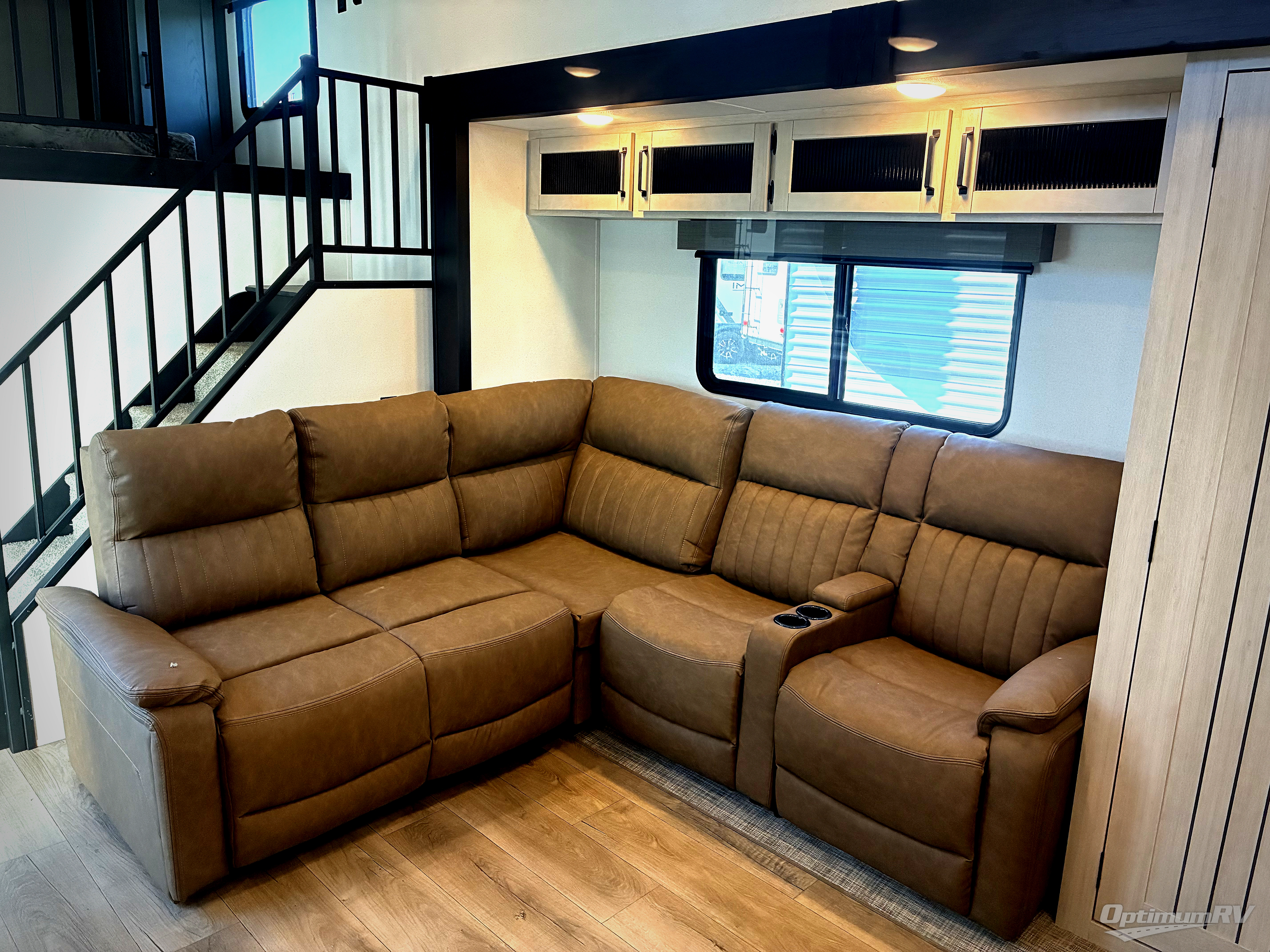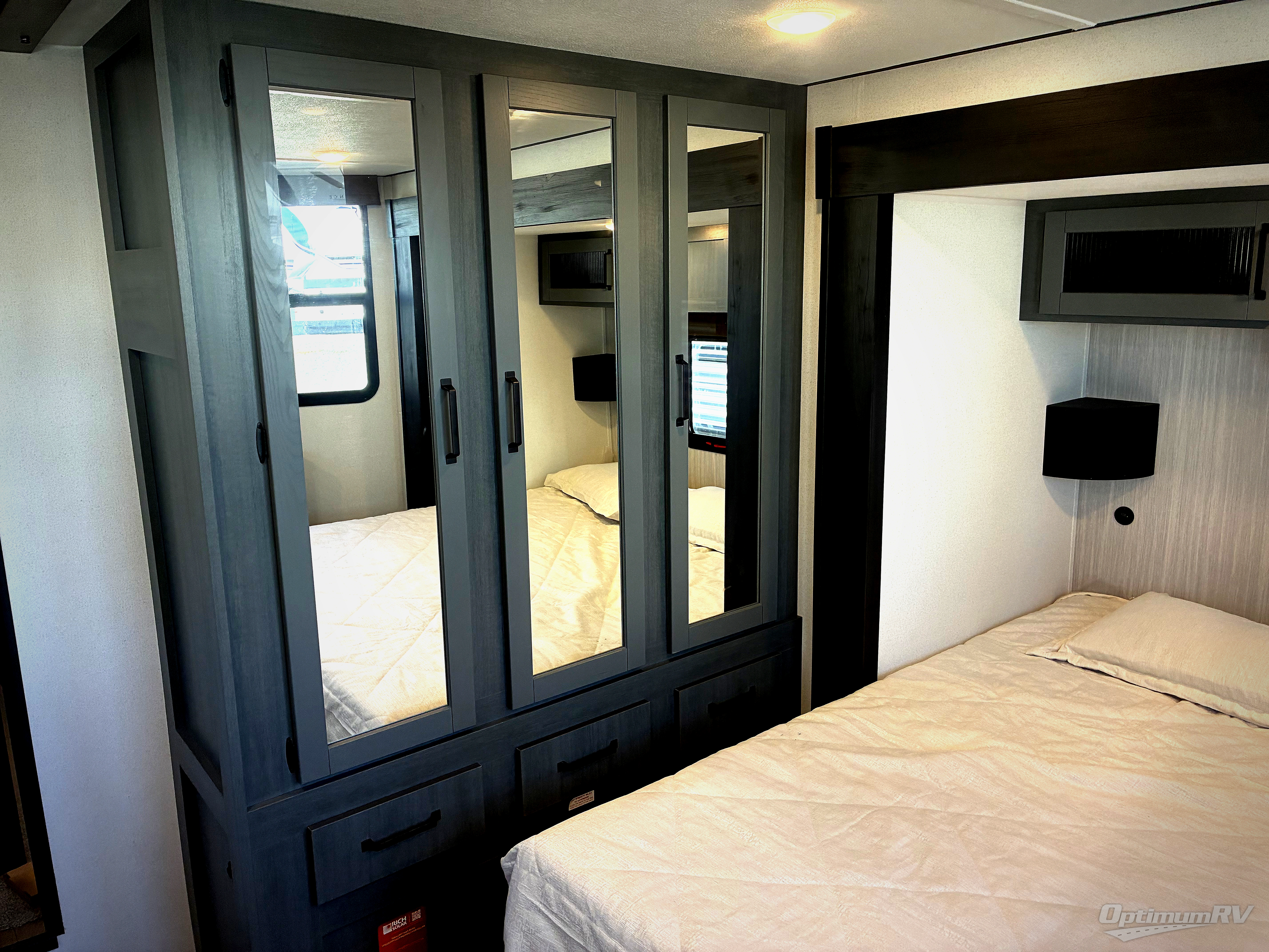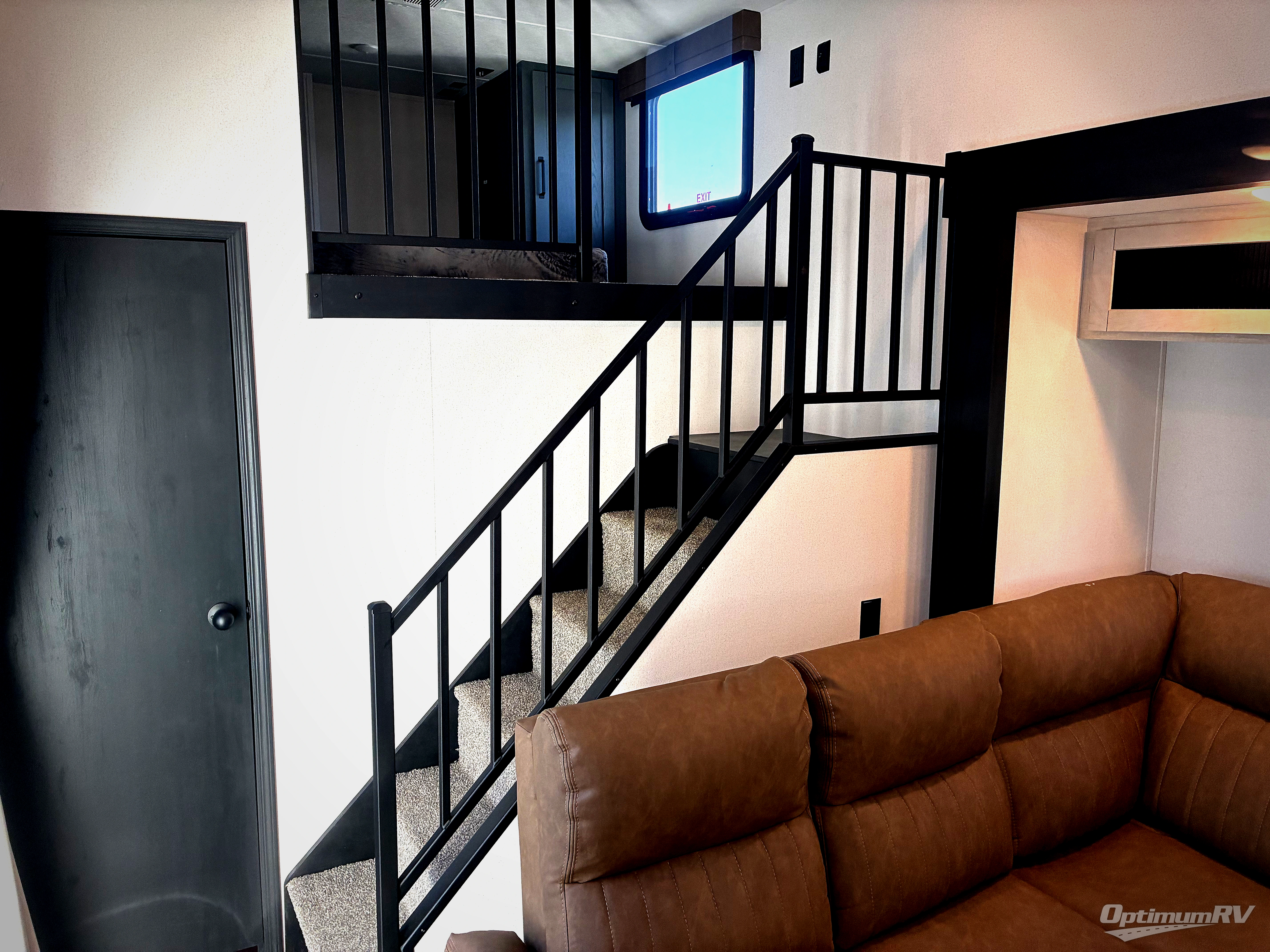 Head to your favorite spots with this destination trailer! With two entry doors, you can easily enter or exit the unit. The front private bedroom includes a king bed slide out, a wardrobe and dresser to keep your clothes organized, plus a countertop for your books or jewelry. Just outside this room is the ladder that leads to the large loft area with two 32" x 80" bunk mats, a cubby, a counter, a nightstand, and cabinets. Once you've headed back downstairs, you can relax on the L-shaped sofa across from the entertainment center with a fireplace and slide-out cabinet or the table and chairs with bench seating. And the chef of your group will love the kitchen with its residential style refrigerator and pantry, kitchen island, and four burner cooktop. The full rear bathroom not only has a 32" x 40" shower with a seat to freshen up in, and a closet with washer/dryer prep, but is also below the second loft with a 32" x 80" bunk mat and closet for storage!