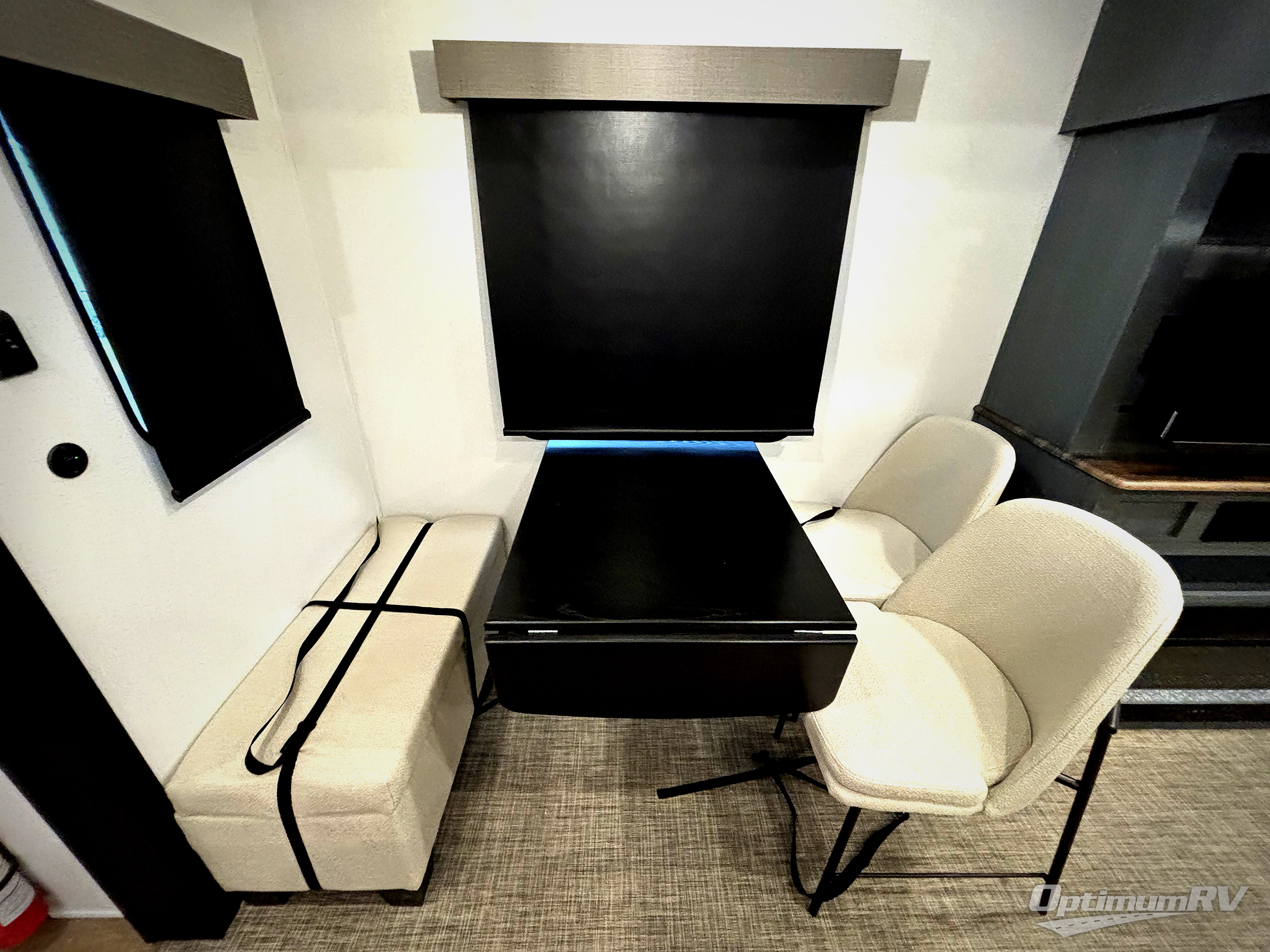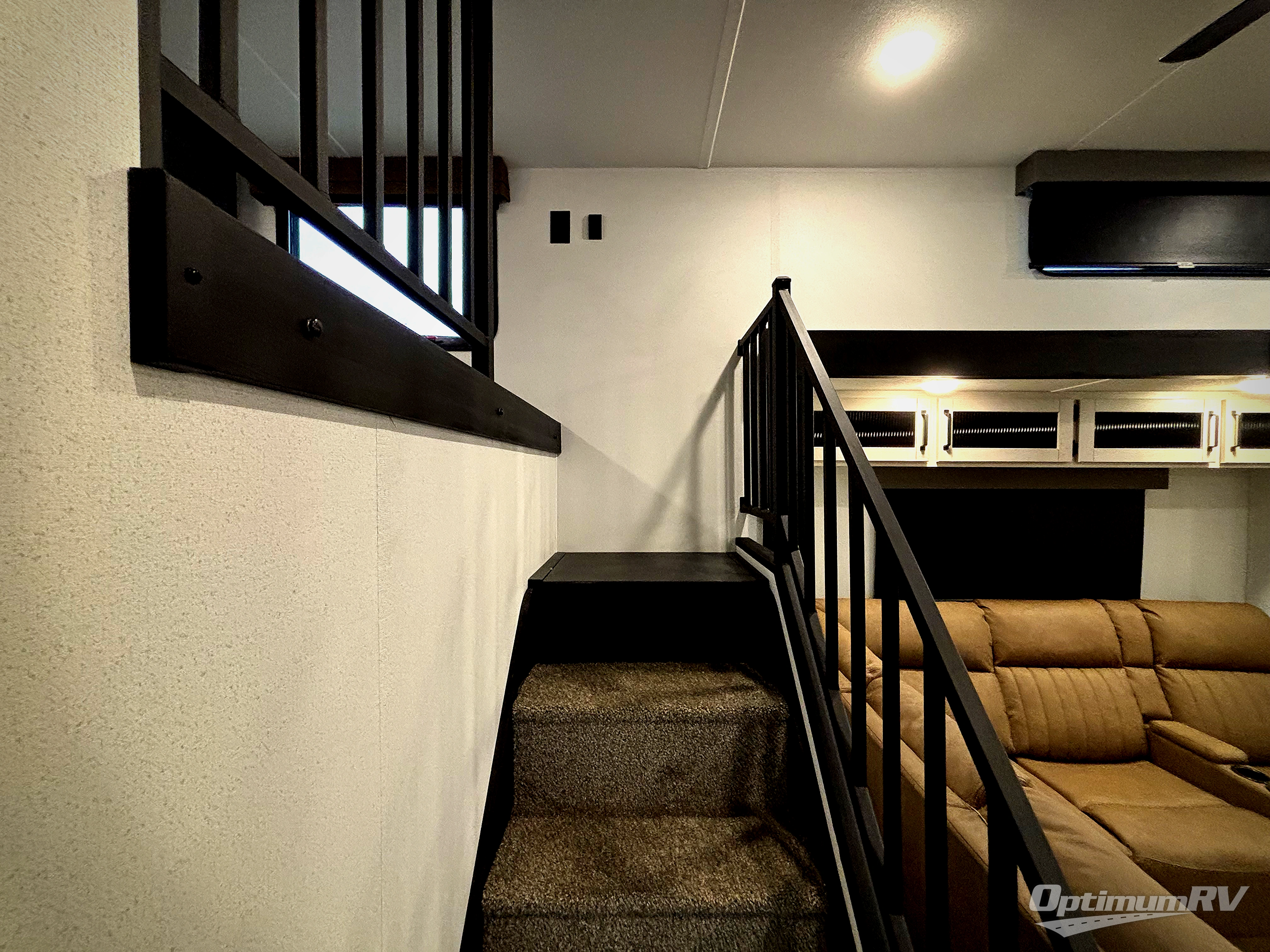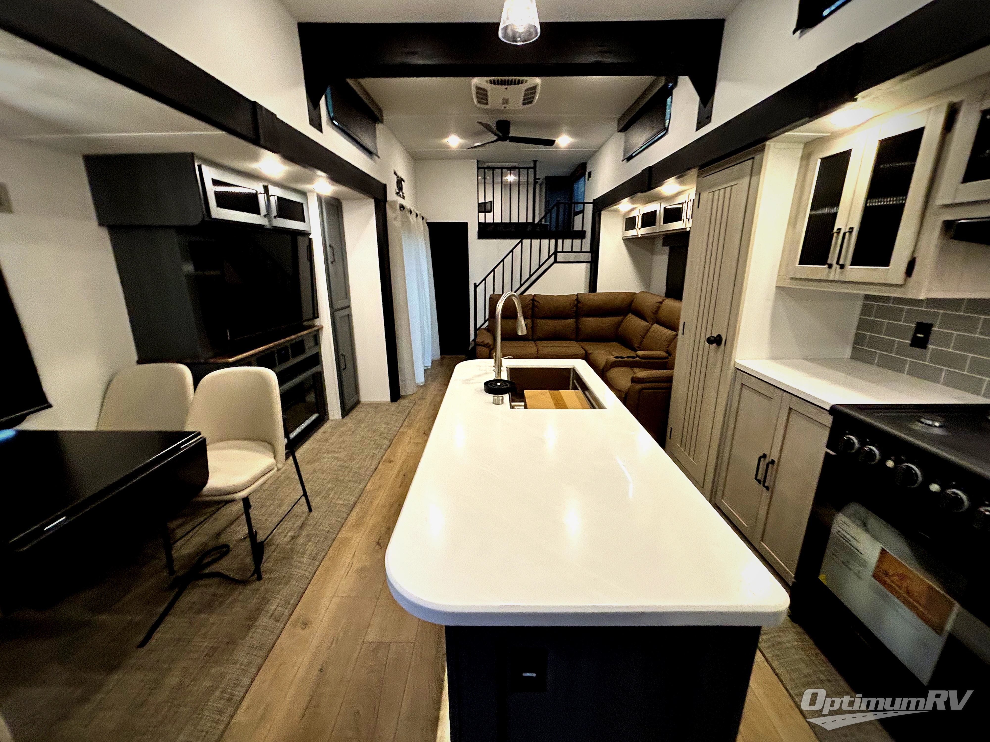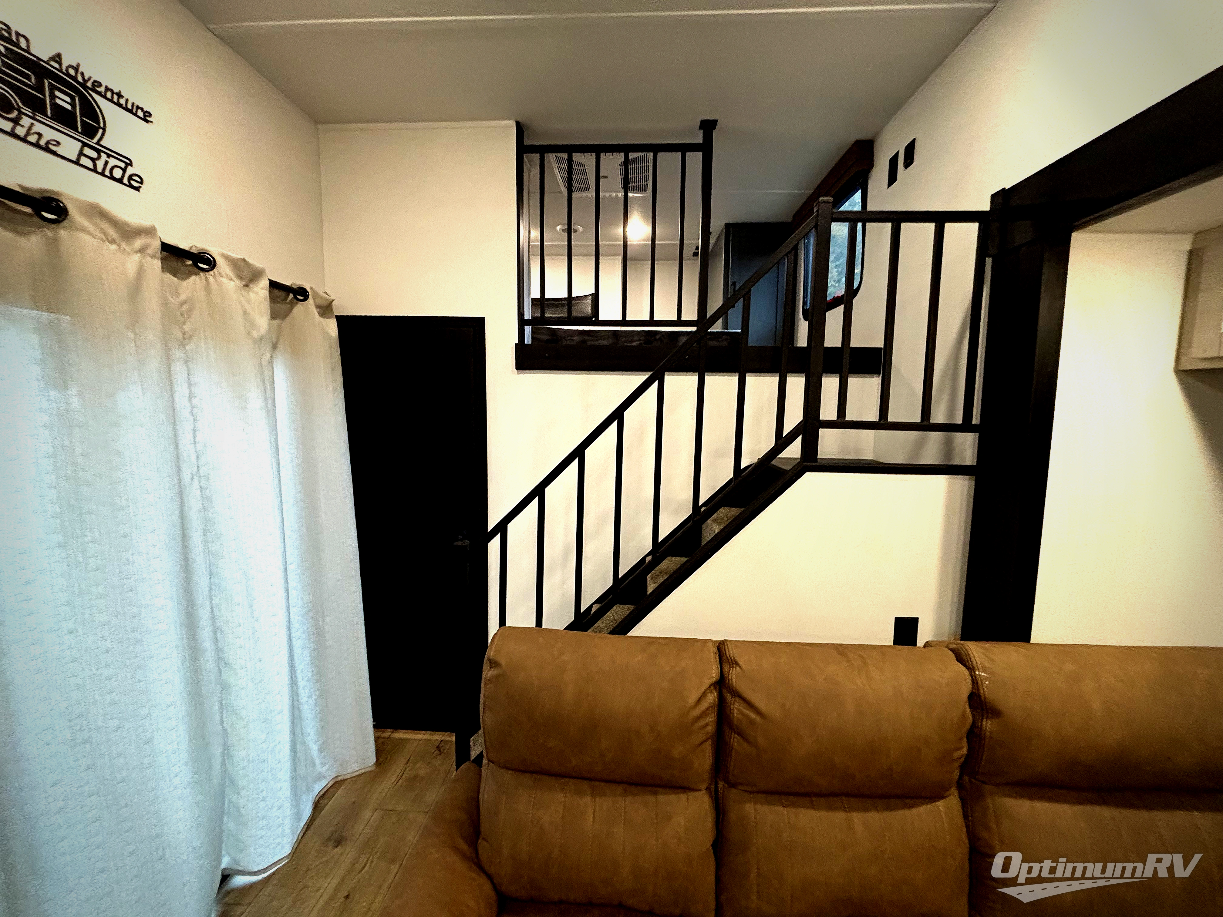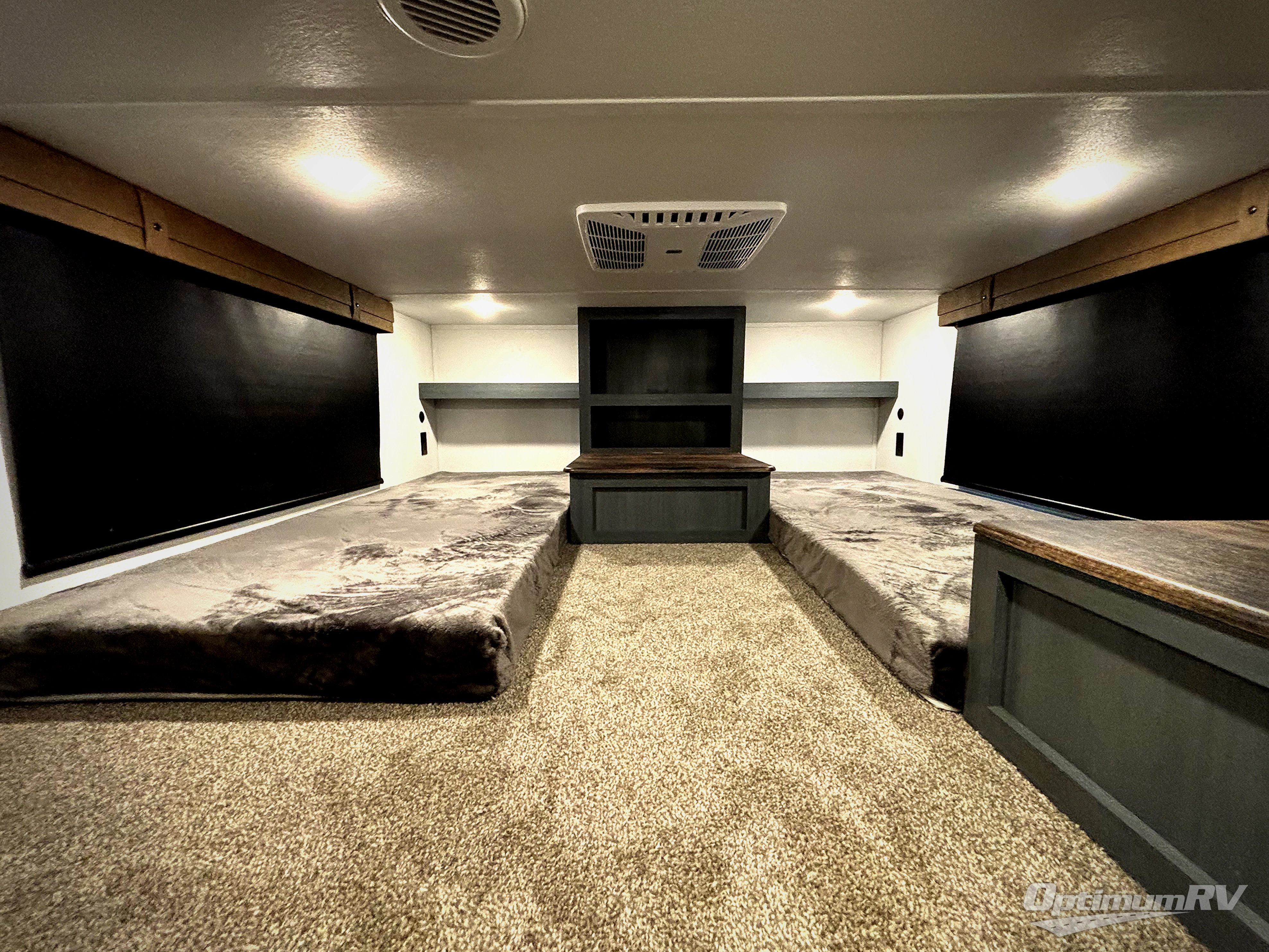 Head to your favorite spots with this destination trailer! With two entry doors, you can easily enter or exit the unit. The front private bedroom includes a king bed slide out, a wardrobe and dresser to keep your clothes organized, plus a countertop for your books or jewelry. Just outside this room is the ladder that leads to the large loft area with two 32" x 80" bunk mats, a cubby, a counter, a nightstand, and cabinets. Once you've headed back downstairs, you can relax on the L-shaped sofa across from the entertainment center with a fireplace and slide-out cabinet or the table and chairs with bench seating. And the chef of your group will love the kitchen with its residential style refrigerator and pantry, kitchen island, and four burner cooktop. The full rear bathroom not only has a 32" x 40" shower with a seat to freshen up in, and a closet with washer/dryer prep, but is also below the second loft with a 32" x 80" bunk mat and closet for storage!