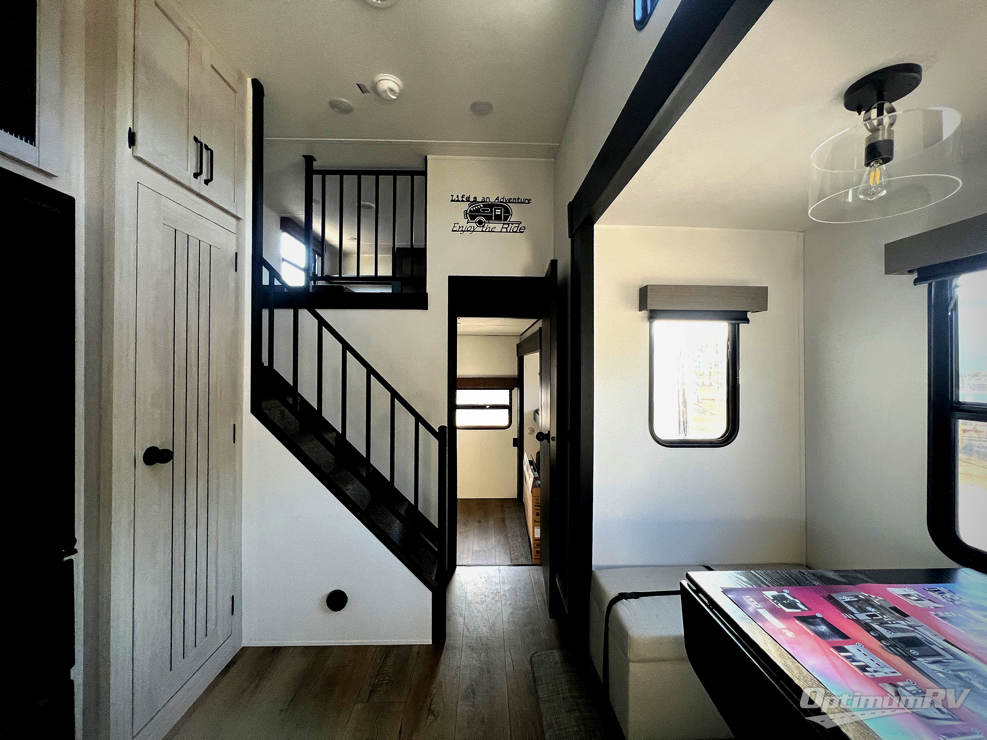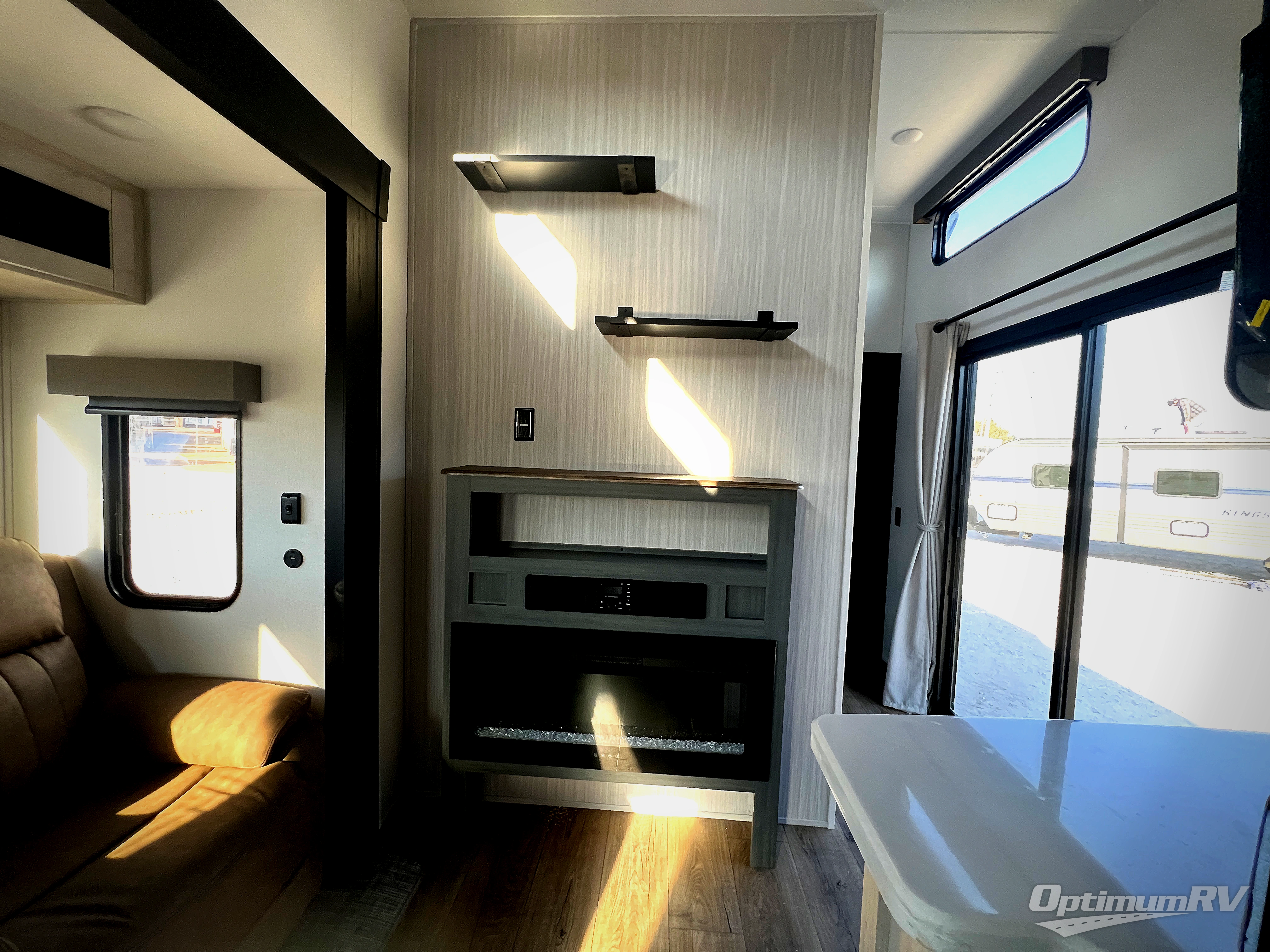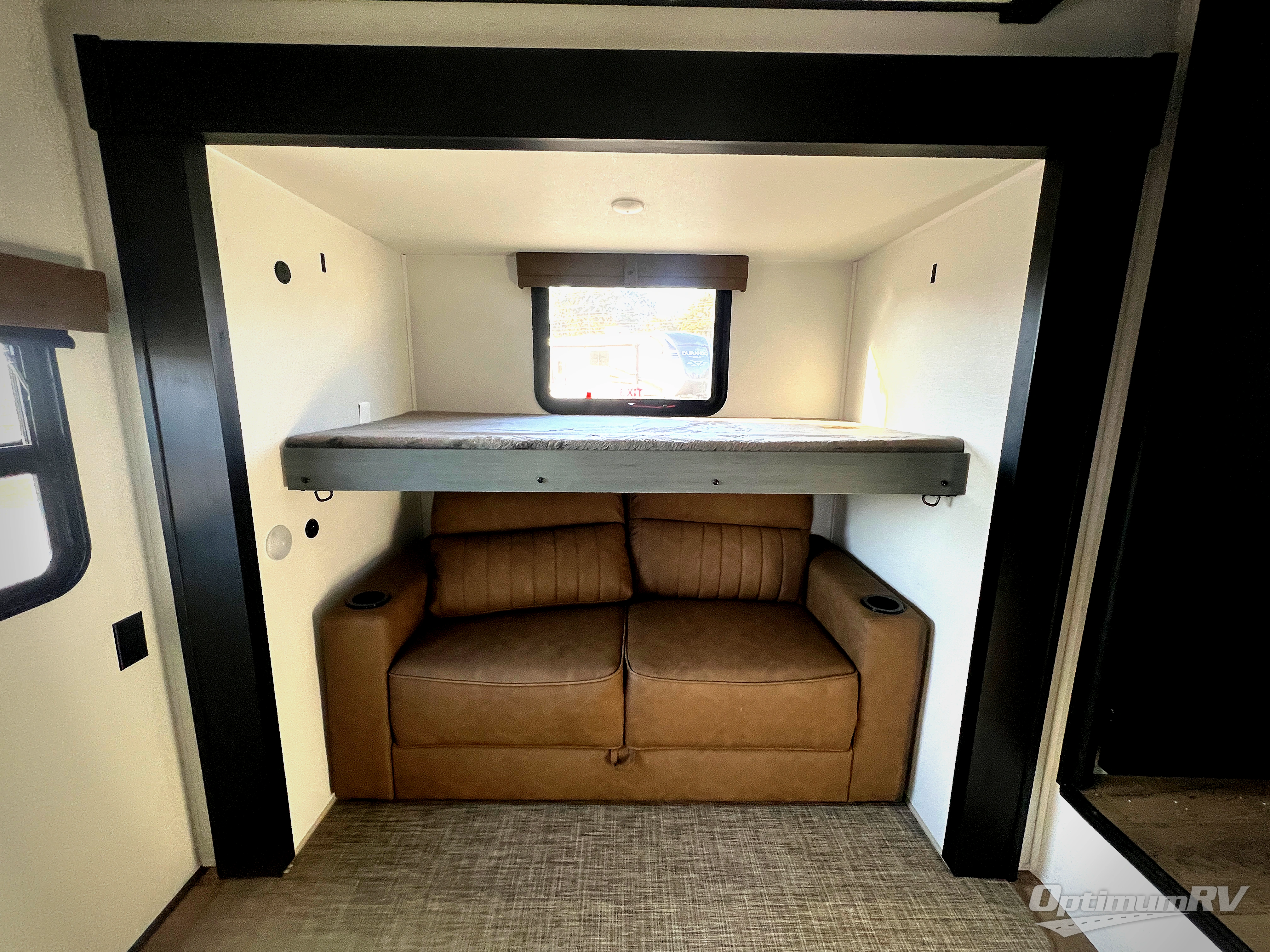 If you're planning to camp with a larger group or your family, this destination trailer will provide everything you're looking for! Your guests can take the rear bunkhouse suite that includes a slide out with a jiffy sofa and bunk bed, an entertainment center, and a full bath. You'll also find one of the dual entry doors here for added convenience. There are steps just outside the bunkhouse that lead to the loft with two bunk mats and storage space to keep this space tidy! The front private bedroom will be perfect for you with its king bed slide out, wardrobe/closet, and bedroom desk if you're needing to work from home. There is even a closet with the option to add washer and dryer prep. In the morning, everyone can meet in the combined middle living area and kitchen. A large slide out here houses the table and chairs plus the sofa, and the fireplace is close by to make it feel a little more like home!