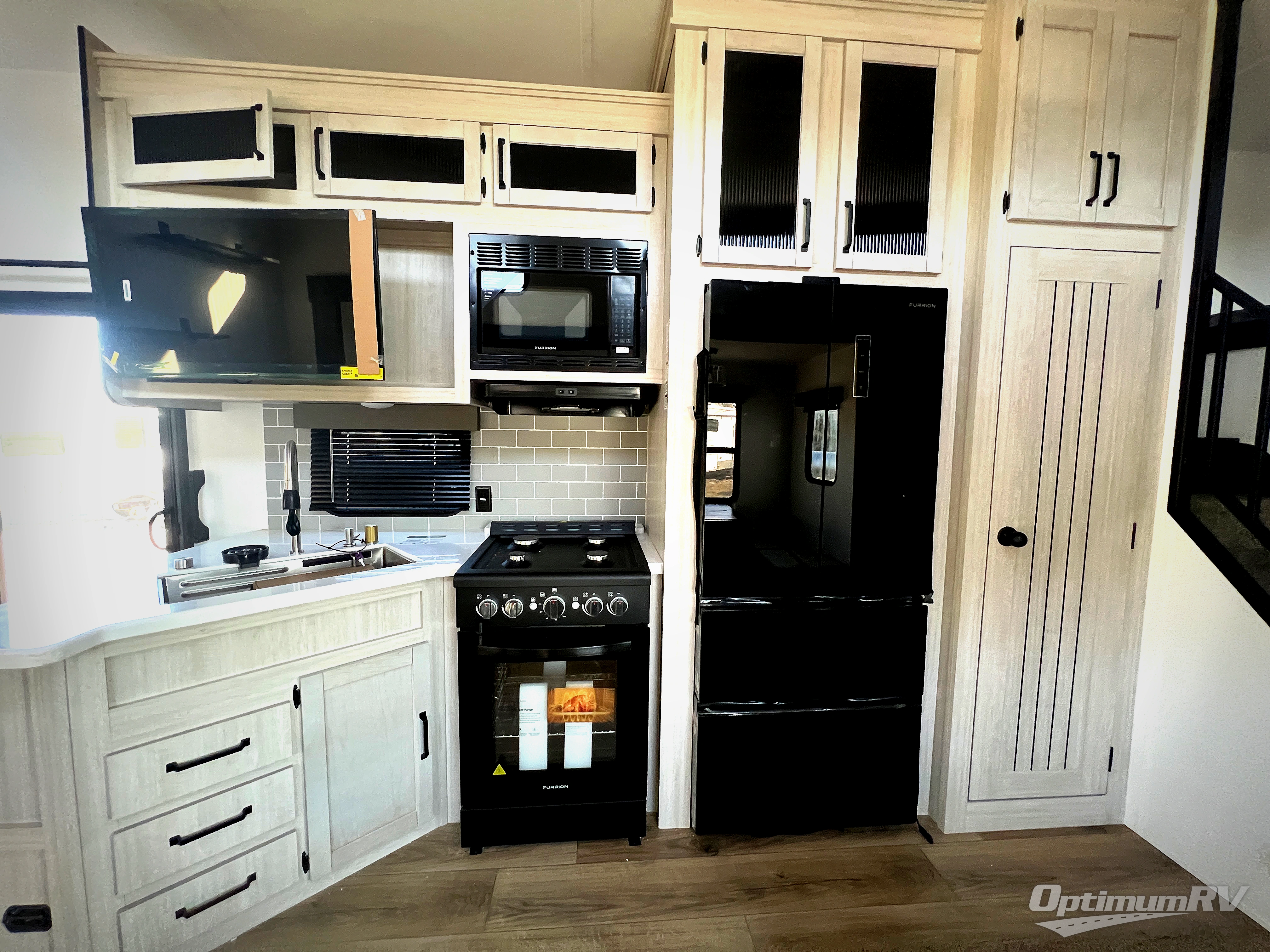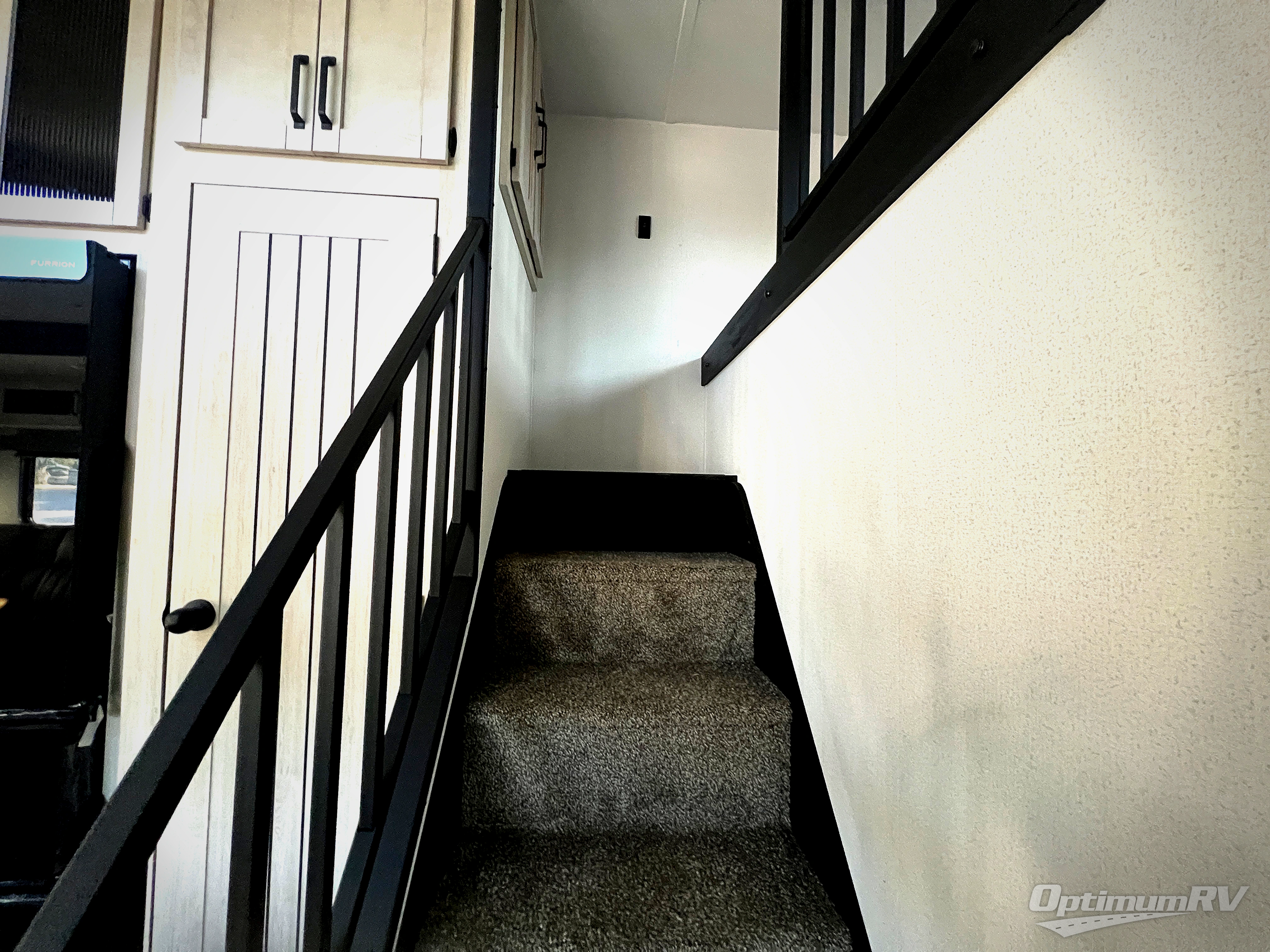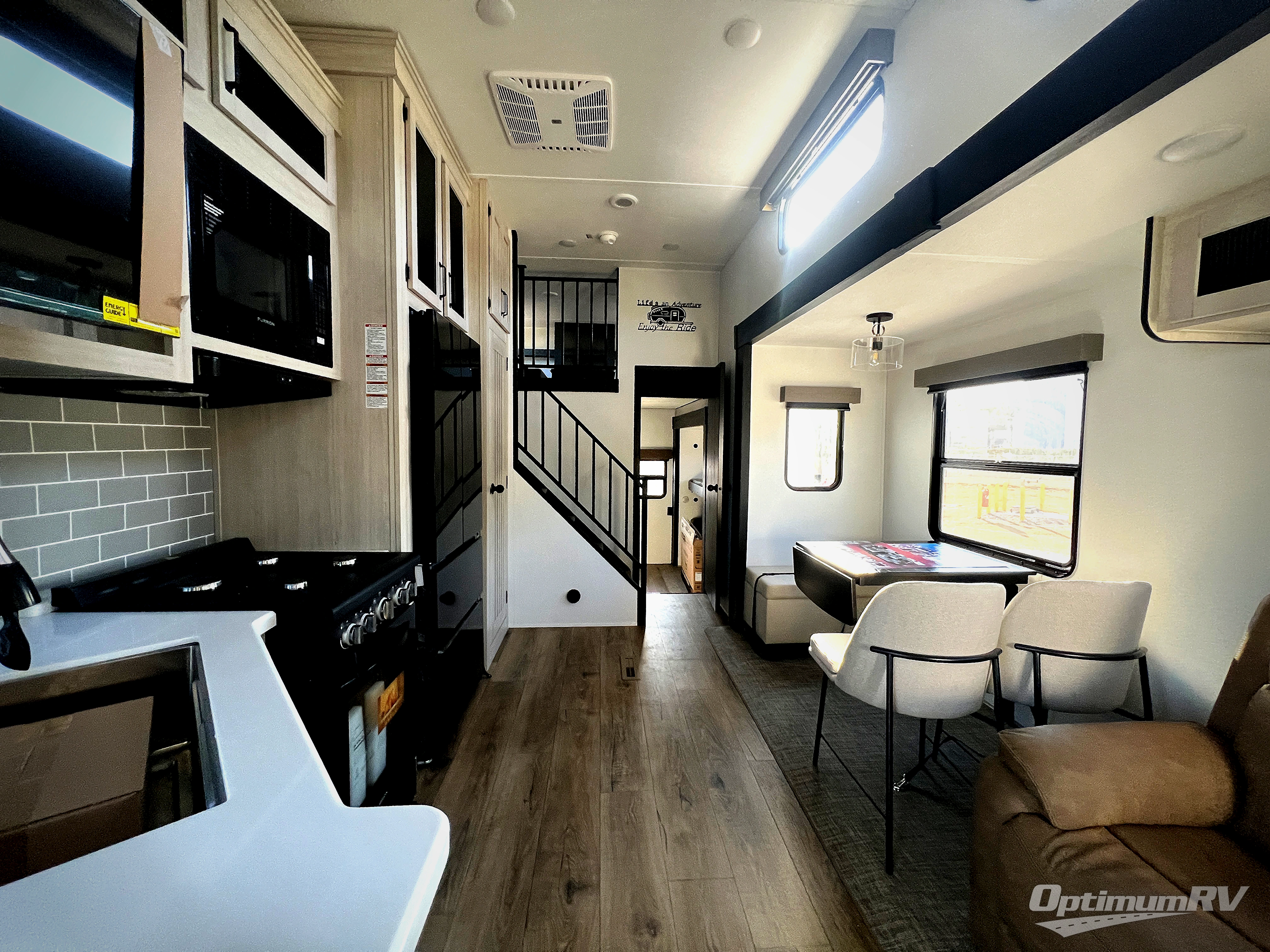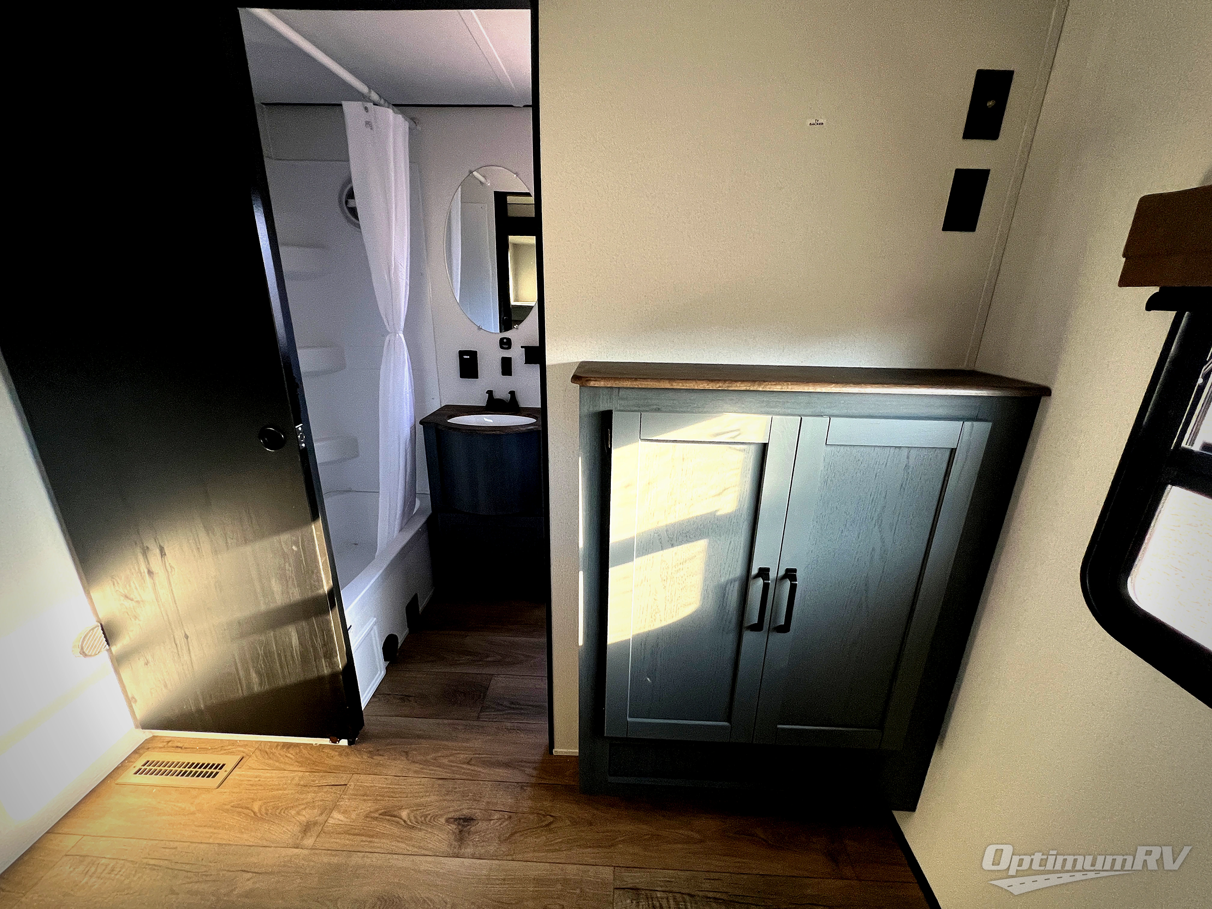 If you're planning to camp with a larger group or your family, this destination trailer will provide everything you're looking for! Your guests can take the rear bunkhouse suite that includes a slide out with a jiffy sofa and bunk bed, an entertainment center, and a full bath. You'll also find one of the dual entry doors here for added convenience. There are steps just outside the bunkhouse that lead to the loft with two bunk mats and storage space to keep this space tidy! The front private bedroom will be perfect for you with its king bed slide out, wardrobe/closet, and bedroom desk if you're needing to work from home. There is even a closet with the option to add washer and dryer prep. In the morning, everyone can meet in the combined middle living area and kitchen. A large slide out here houses the table and chairs plus the sofa, and the fireplace is close by to make it feel a little more like home!