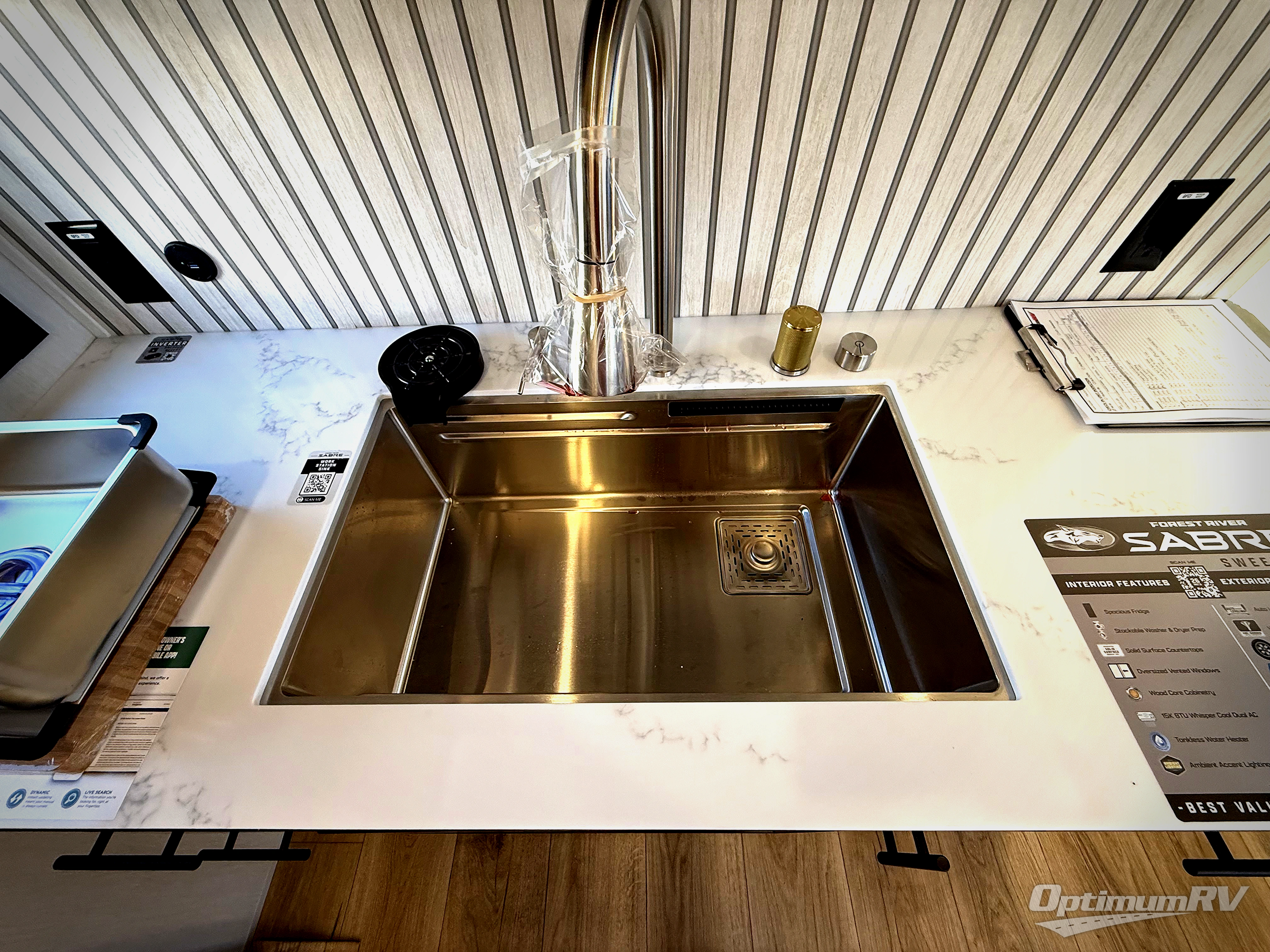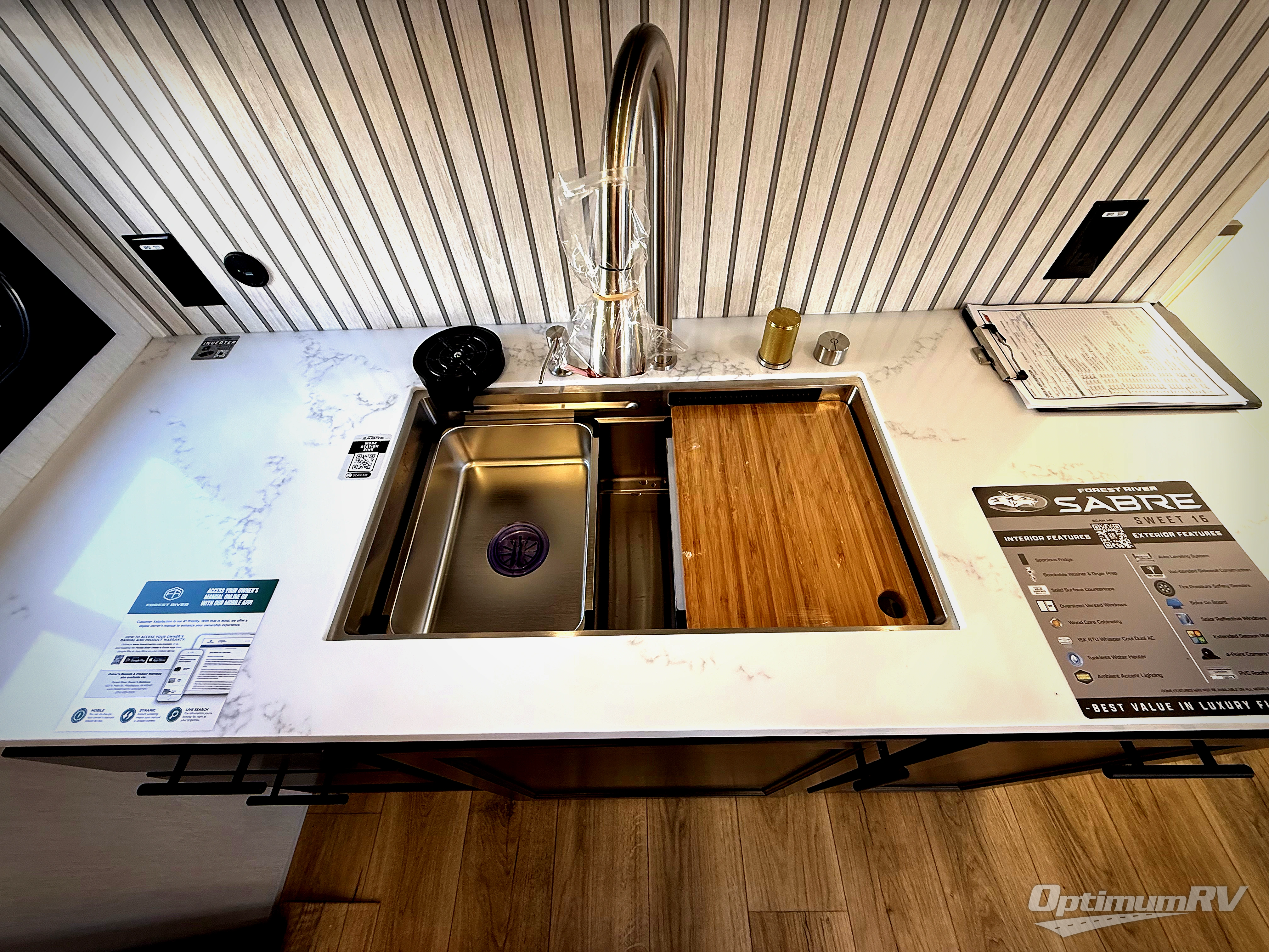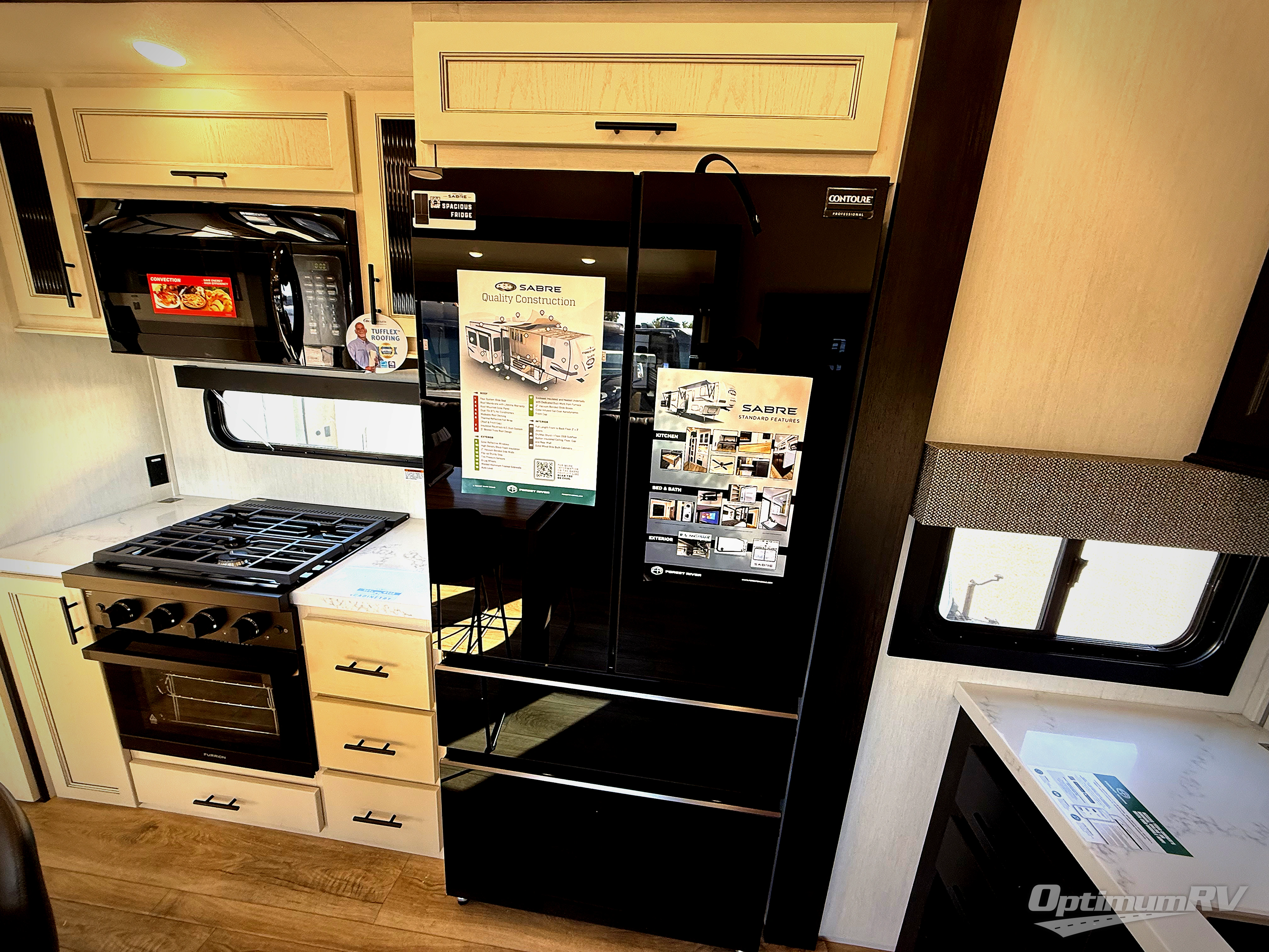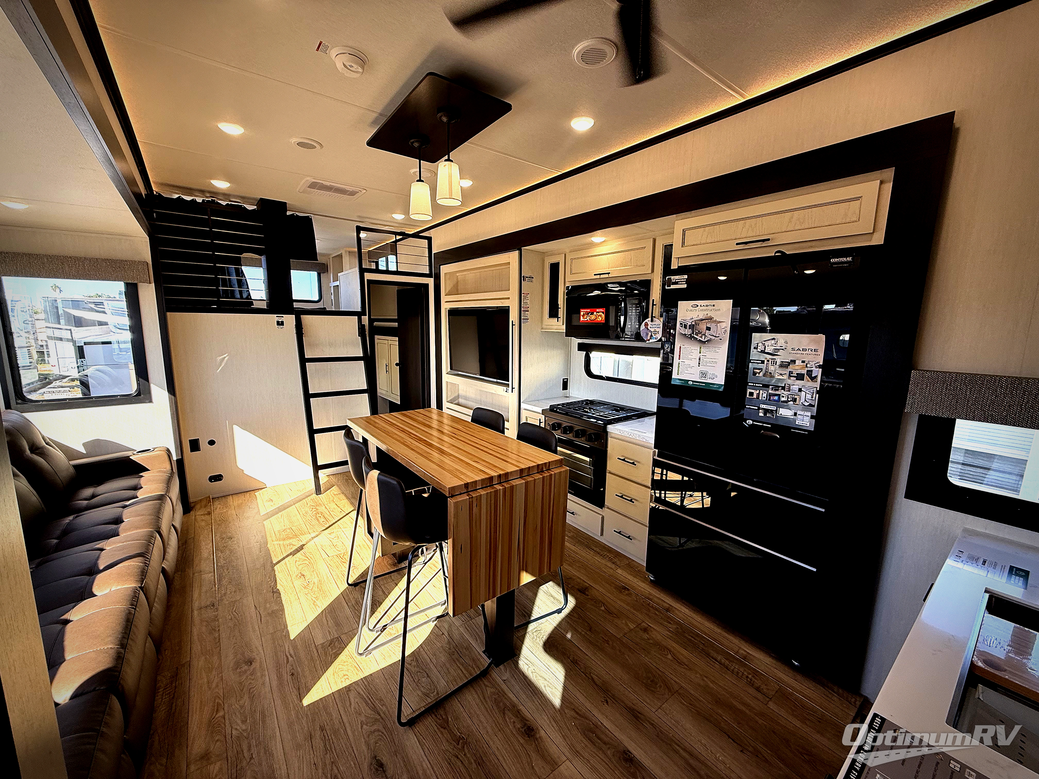 You will experience luxurious camping trips at an affordable price with any one of these Forest River Sabre fifth wheels! These models are durable and ready to travel anytime of the year thanks to features like the high-gloss gel-coat front cap with LED lighting, the PVC roof membrane, and the forced air underbelly with enclosed gate valves. The electric auto-leveling system makes setting up easy and safe, and the adjustable power awning with LED lighting will create an inviting outdoor living space. Each model includes a universal docking station which includes a black tank flush and an outside shower, and adjustable stable steps for you to enter and exit the unit safely. Inside, you will love the design of the ambient accent lighting in the living area, the real wood lumbercore cabinetry, and the linoleum flooring!