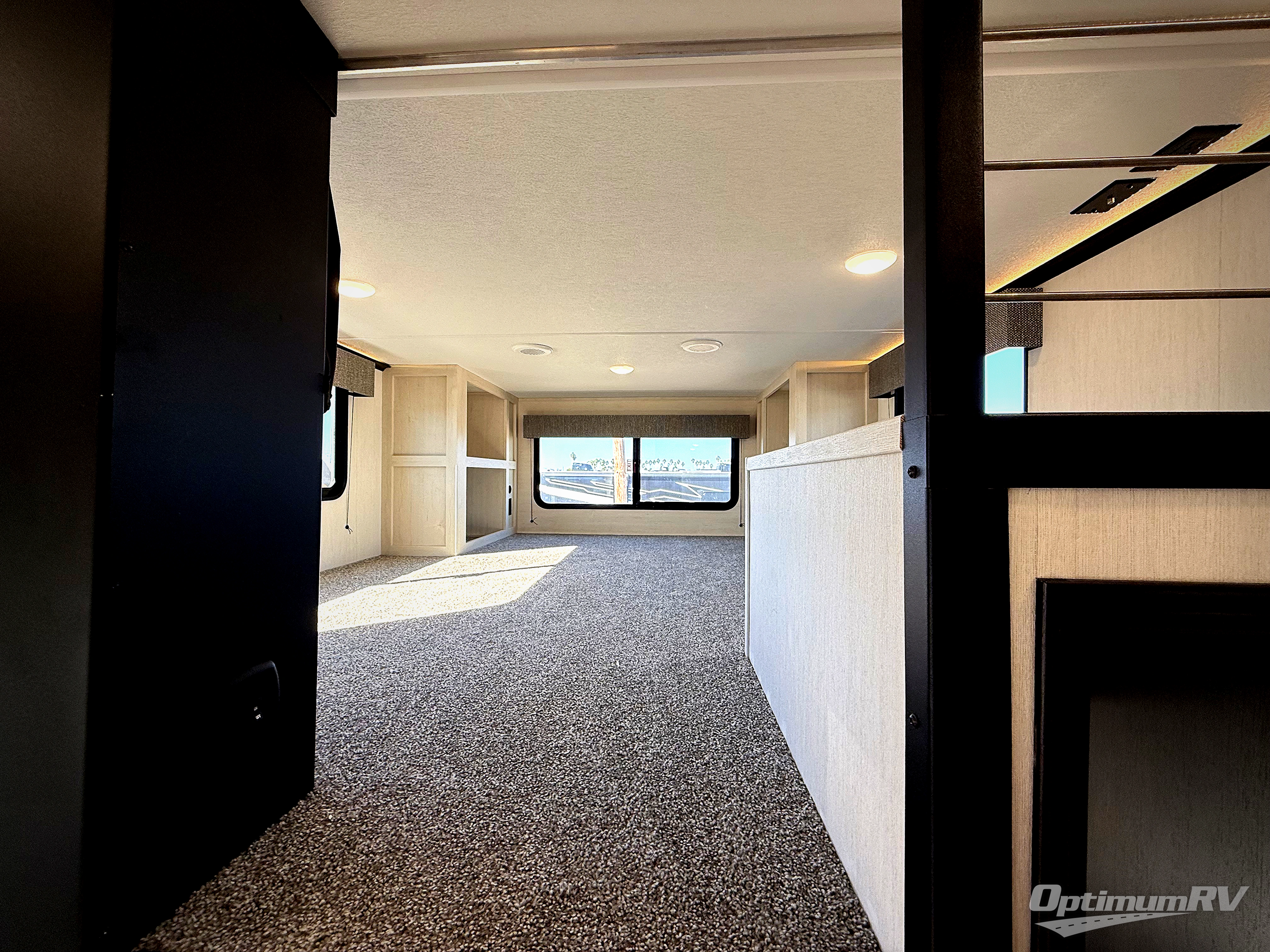 Are you looking for a fifth wheel where you can bring along your neighbor friends? You can do just that since there are two bedrooms in this unit, one of which includes a master bath with its own exterior entry door! The front bedroom is right next to the second full bath for convenience, and includes a camper king bed slide, a dresser, and front wardrobe. The rear master bedroom has a queen bed slide out across from a second slide for more floor space, and there is a loft above this room for more sleeping or storage space. Everyone can meet in the middle kitchen and living room since there are recliners, a ceiling fan, and kitchen island with four chairs. There is also storage below the island for kitchen necessities, and the hidden pantry behind the TV will be perfect for snacks, board games and more!