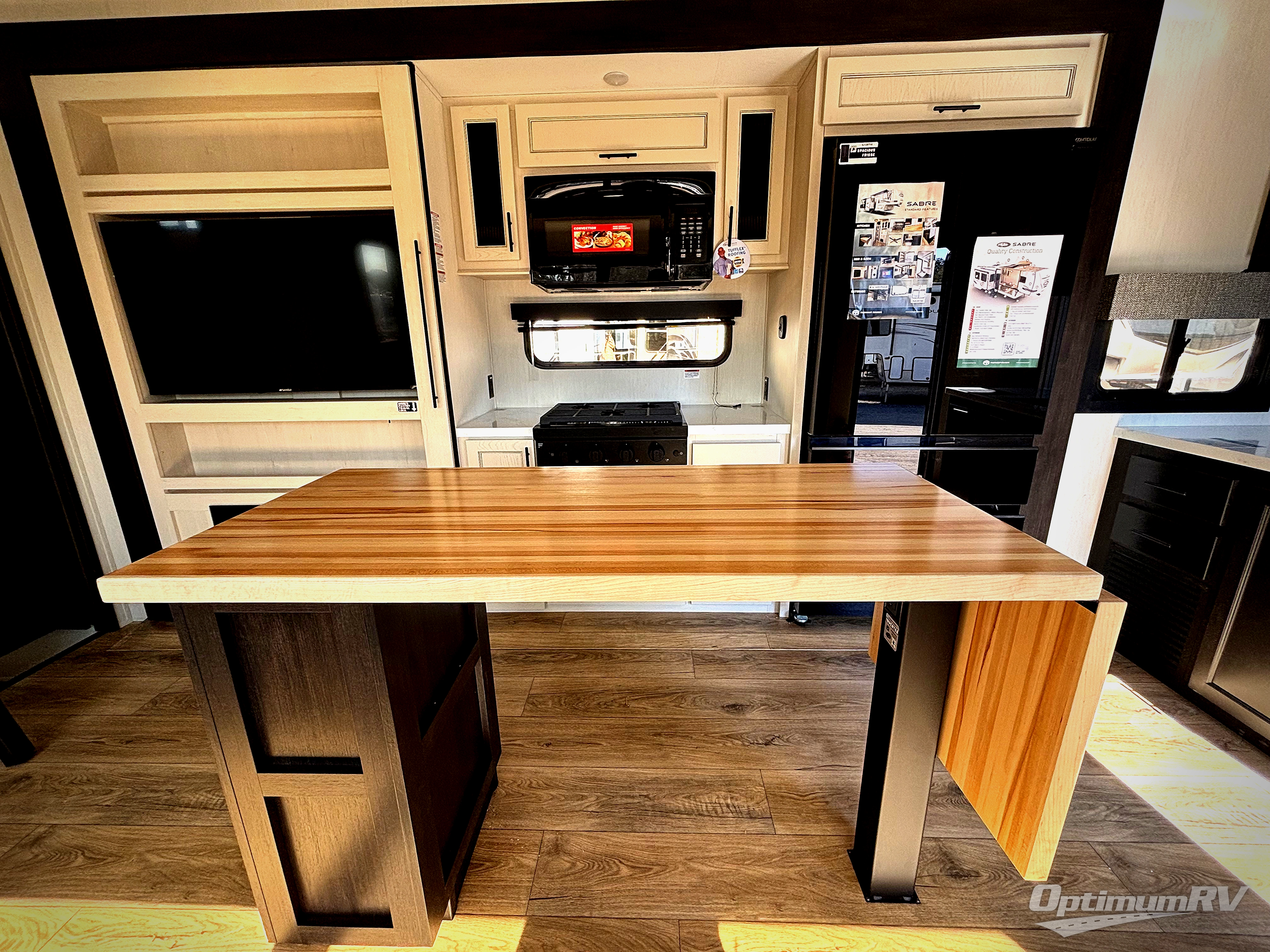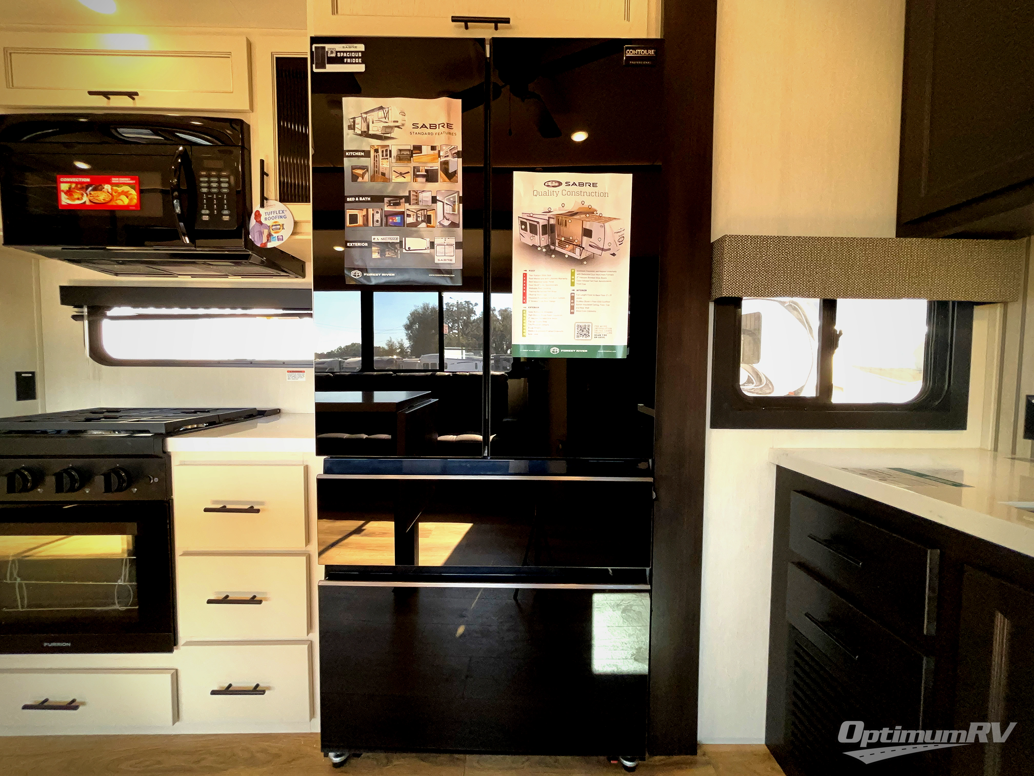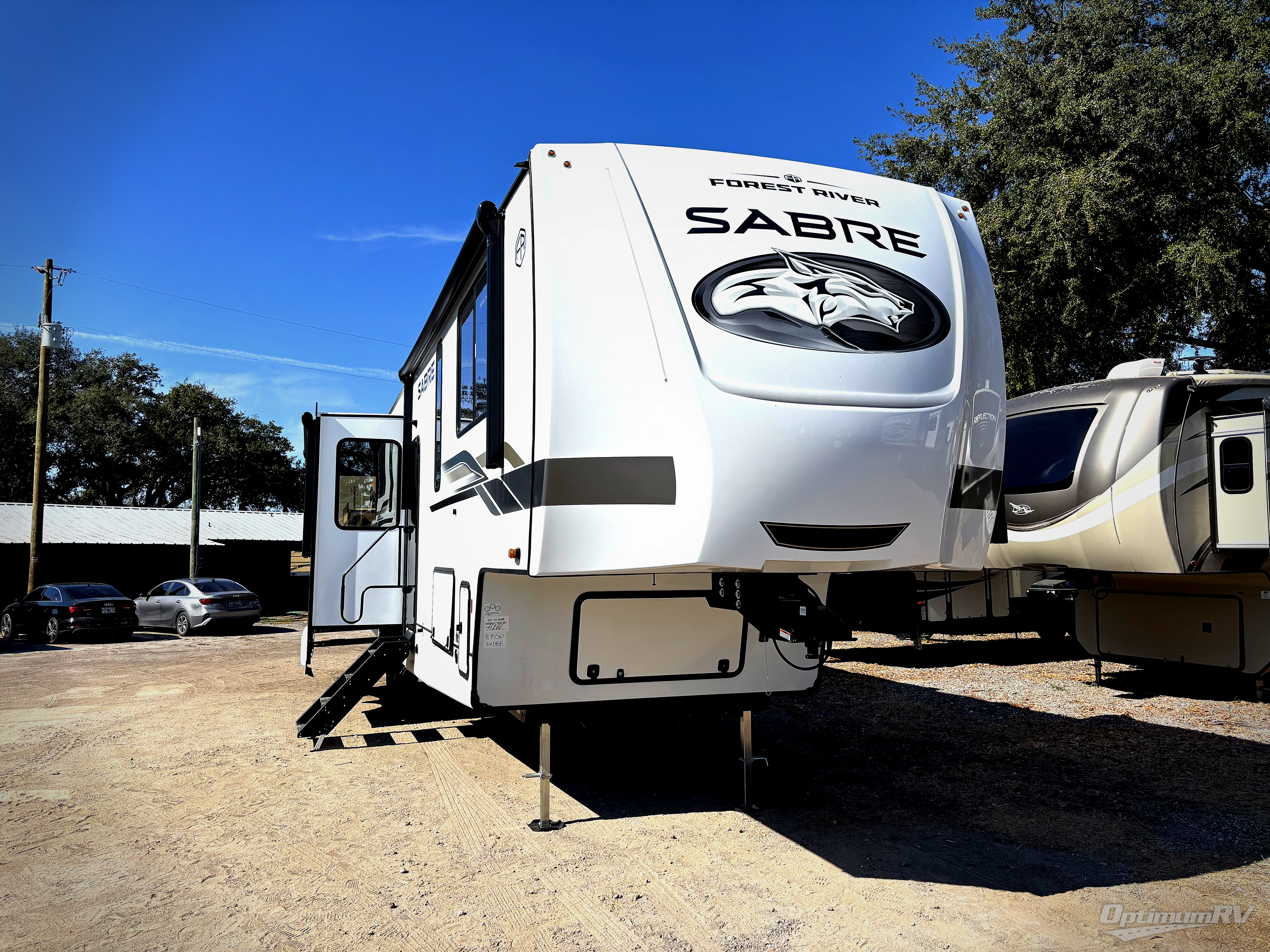 You will experience luxurious camping trips at an affordable price with any one of these Forest River Sabre fifth wheels! These models are durable and ready to travel anytime of the year thanks to features like the high-gloss gel-coat front cap with LED lighting, the PVC roof membrane, and the forced air underbelly with enclosed gate valves. The electric auto-leveling system makes setting up easy and safe, and the adjustable power awning with LED lighting will create an inviting outdoor living space. Each model includes a universal docking station which includes a black tank flush and an outside shower, and adjustable stable steps for you to enter and exit the unit safely. Inside, you will love the design of the ambient accent lighting in the living area, the real wood lumbercore cabinetry, and the linoleum flooring!