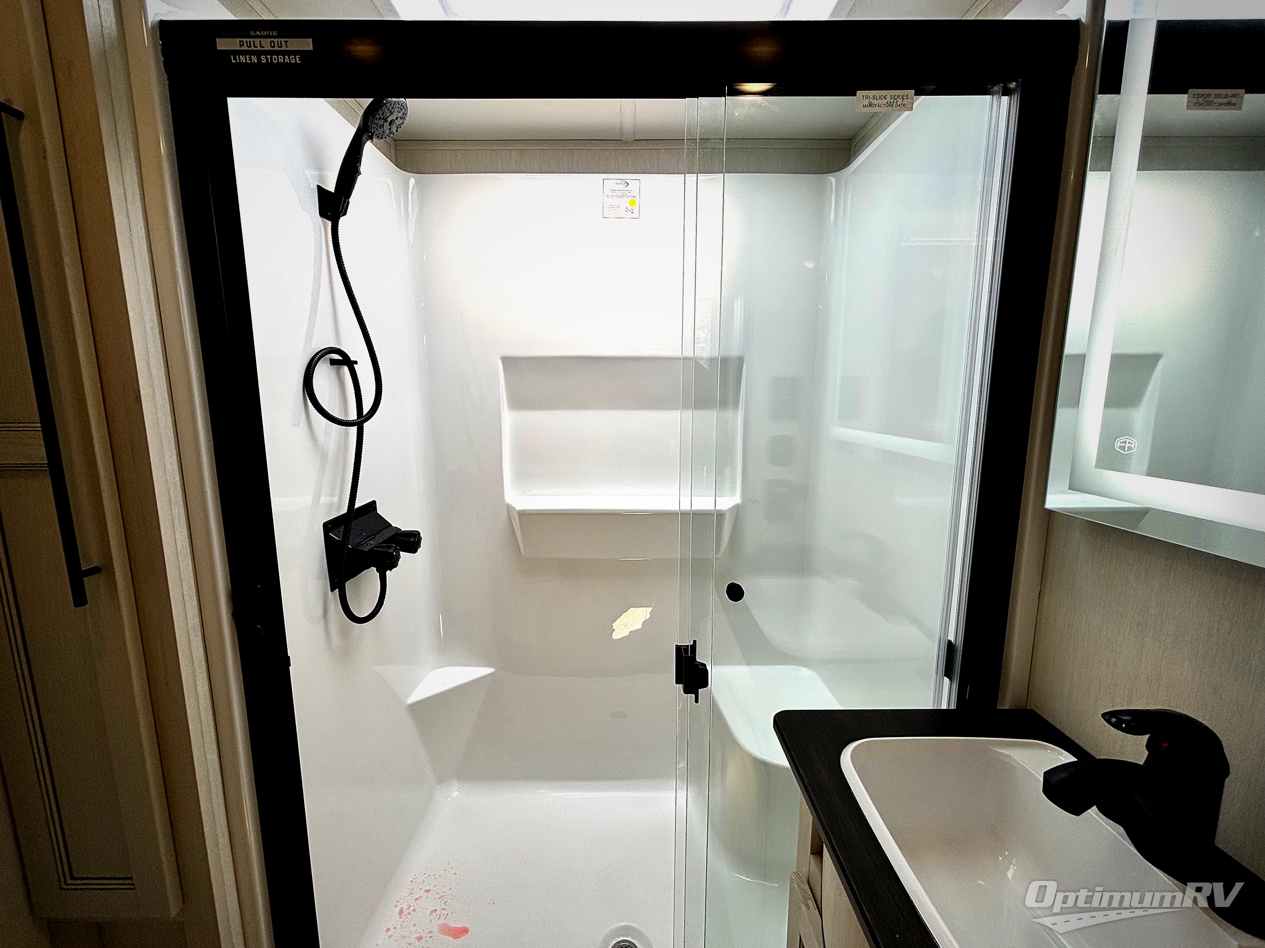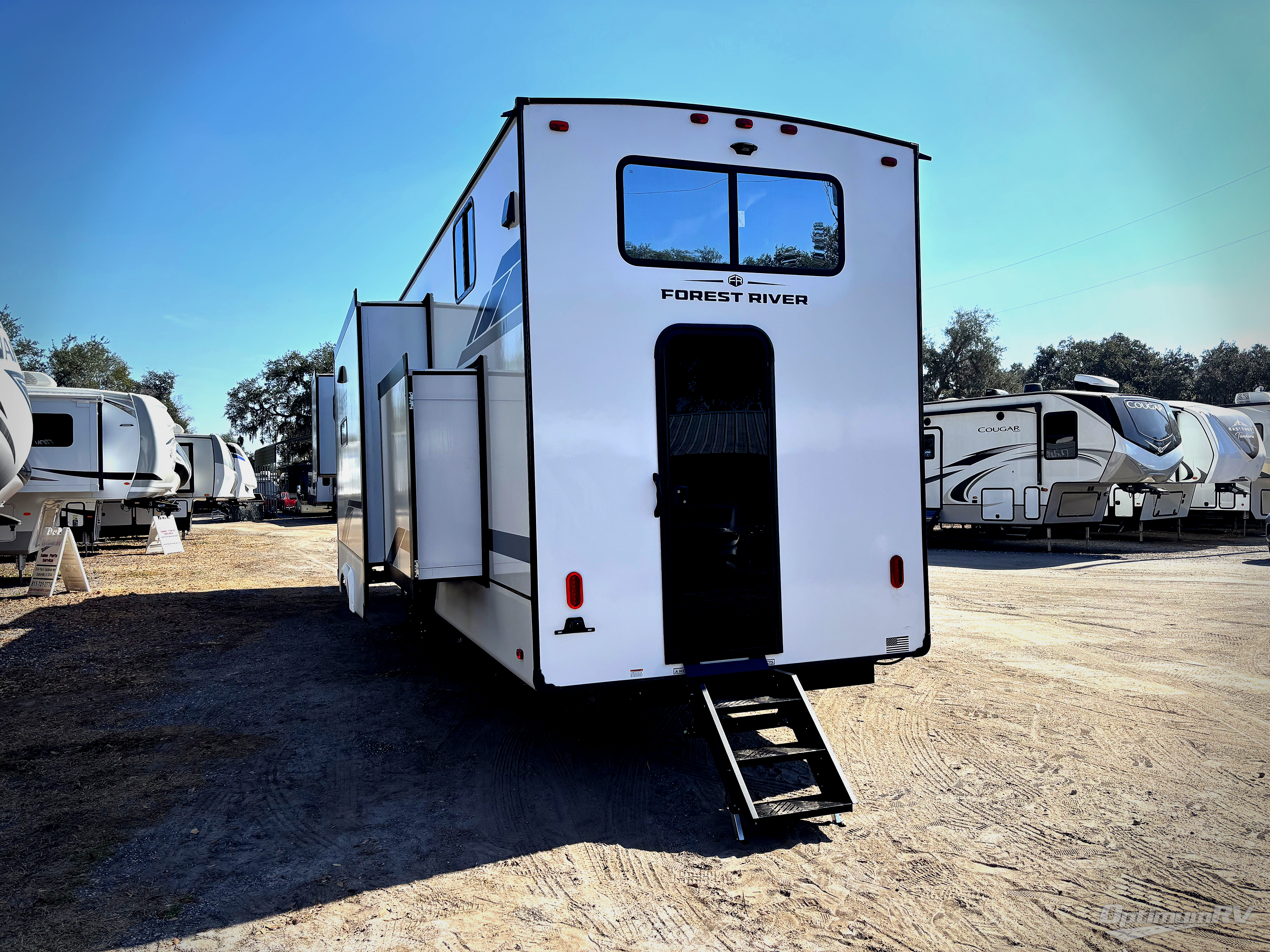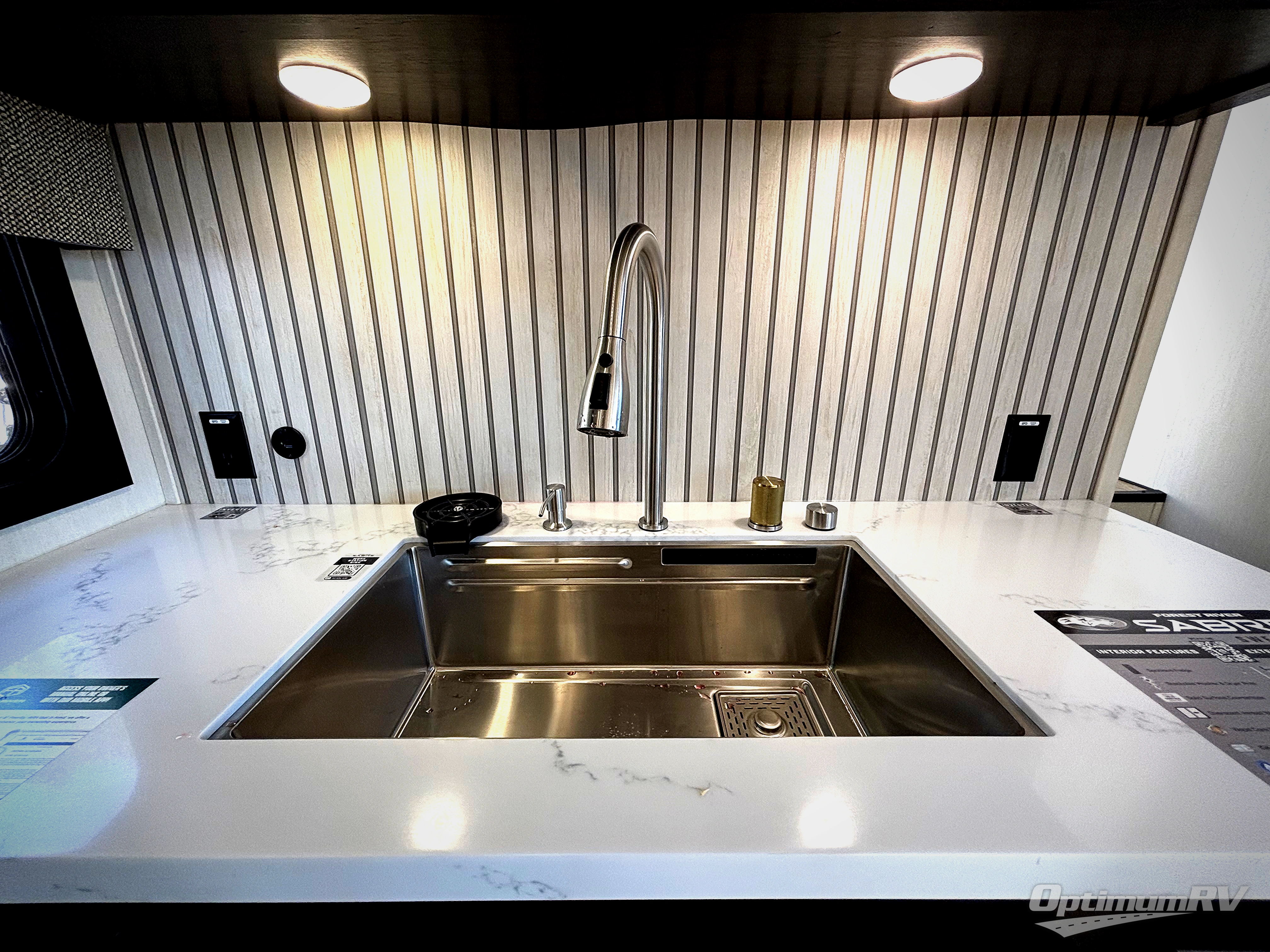 You will experience luxurious camping trips at an affordable price with any one of these Forest River Sabre fifth wheels! These models are durable and ready to travel anytime of the year thanks to features like the high-gloss gel-coat front cap with LED lighting, the PVC roof membrane, and the forced air underbelly with enclosed gate valves. The electric auto-leveling system makes setting up easy and safe, and the adjustable power awning with LED lighting will create an inviting outdoor living space. Each model includes a universal docking station which includes a black tank flush and an outside shower, and adjustable stable steps for you to enter and exit the unit safely. Inside, you will love the design of the ambient accent lighting in the living area, the real wood lumbercore cabinetry, and the linoleum flooring!