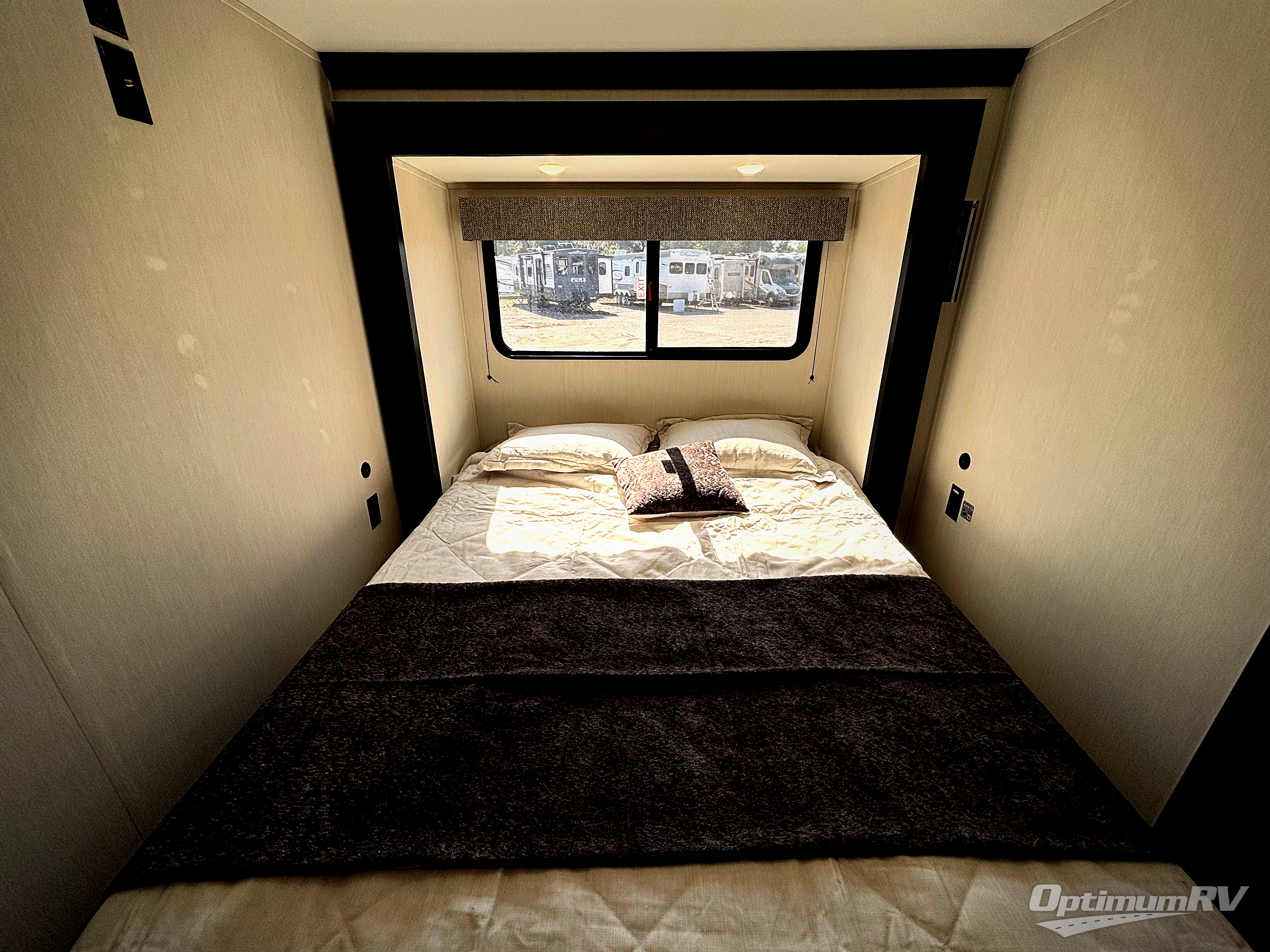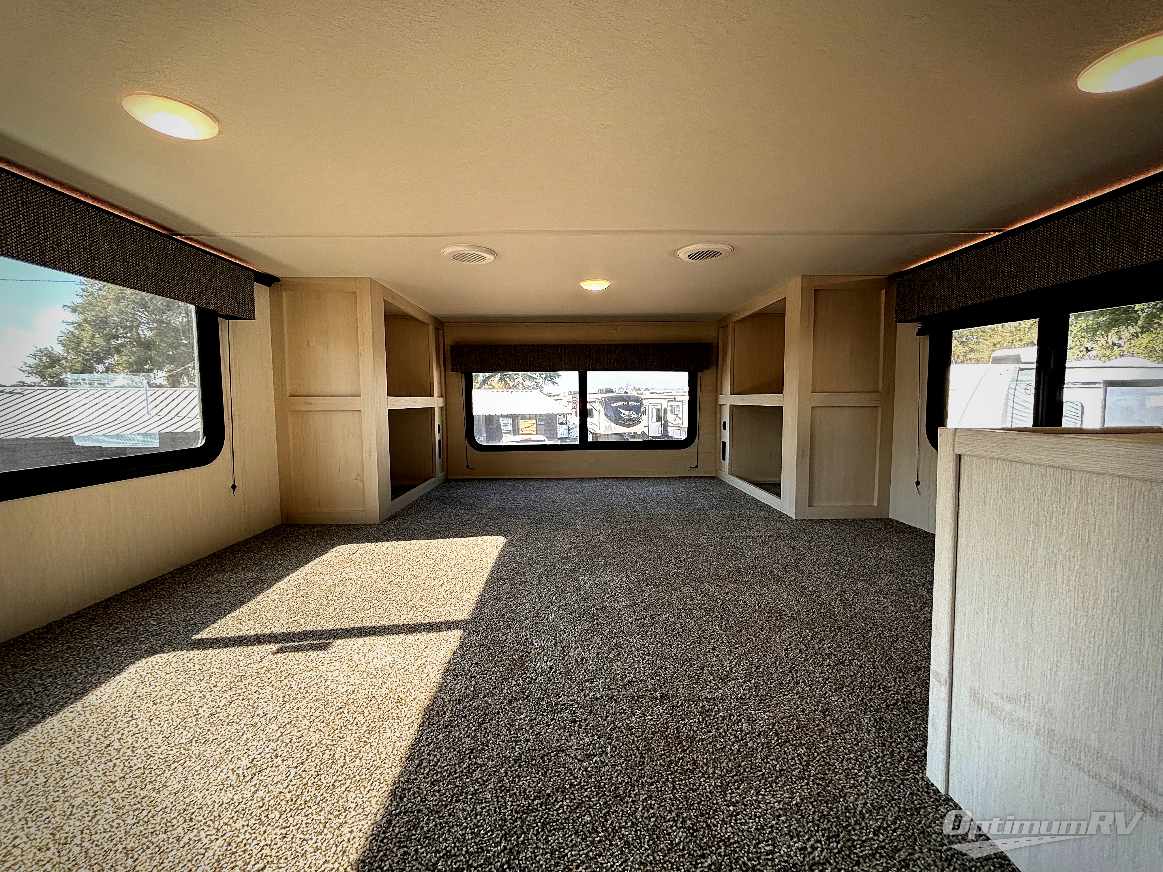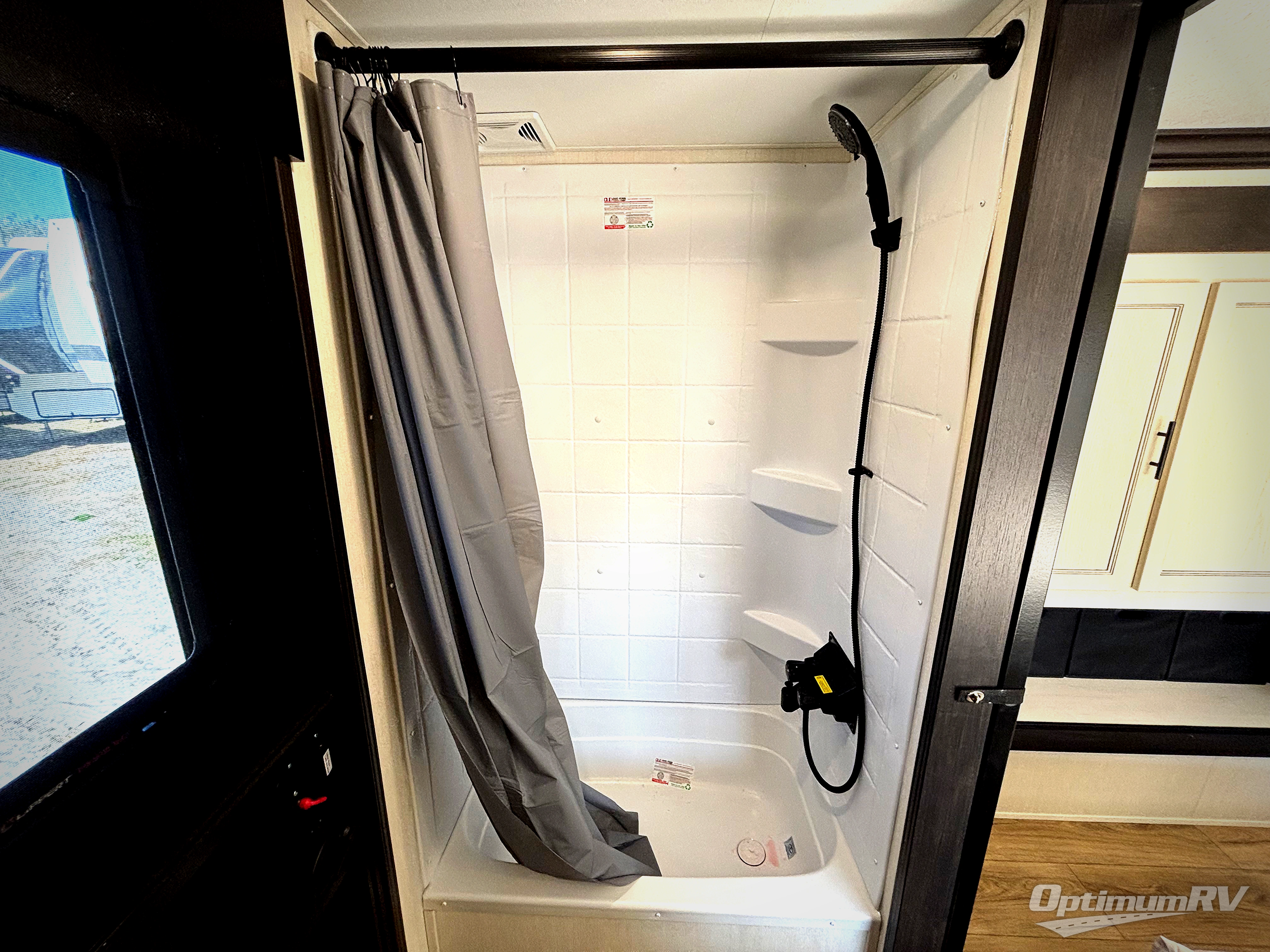 Are you looking for a fifth wheel where you can bring along your neighbor friends? You can do just that since there are two bedrooms in this unit, one of which includes a master bath with its own exterior entry door! The front bedroom is right next to the second full bath for convenience, and includes a camper king bed slide, a dresser, and front wardrobe. The rear master bedroom has a queen bed slide out across from a second slide for more floor space, and there is a loft above this room for more sleeping or storage space. Everyone can meet in the middle kitchen and living room since there are recliners, a ceiling fan, and kitchen island with four chairs. There is also storage below the island for kitchen necessities, and the hidden pantry behind the TV will be perfect for snacks, board games and more!