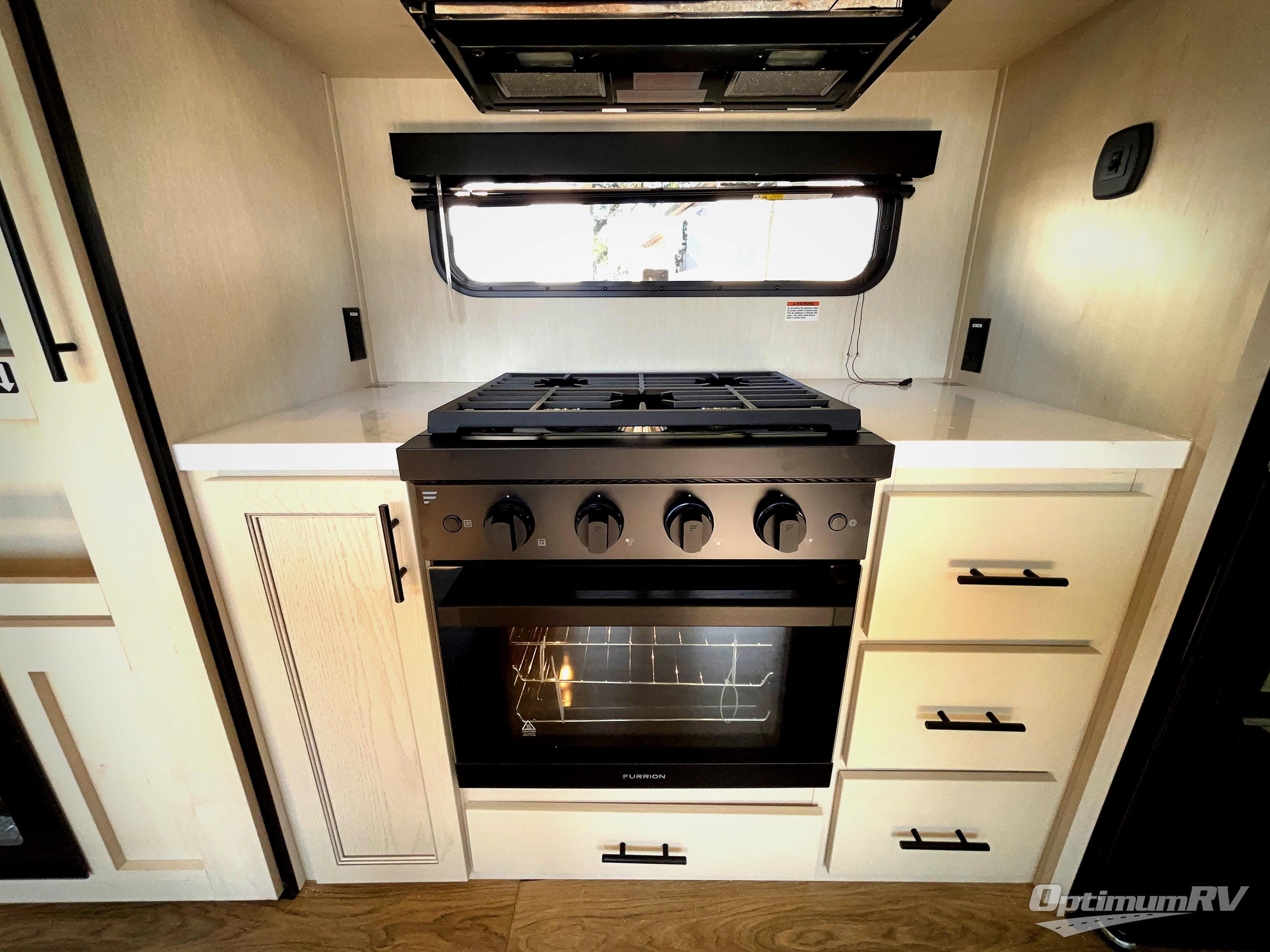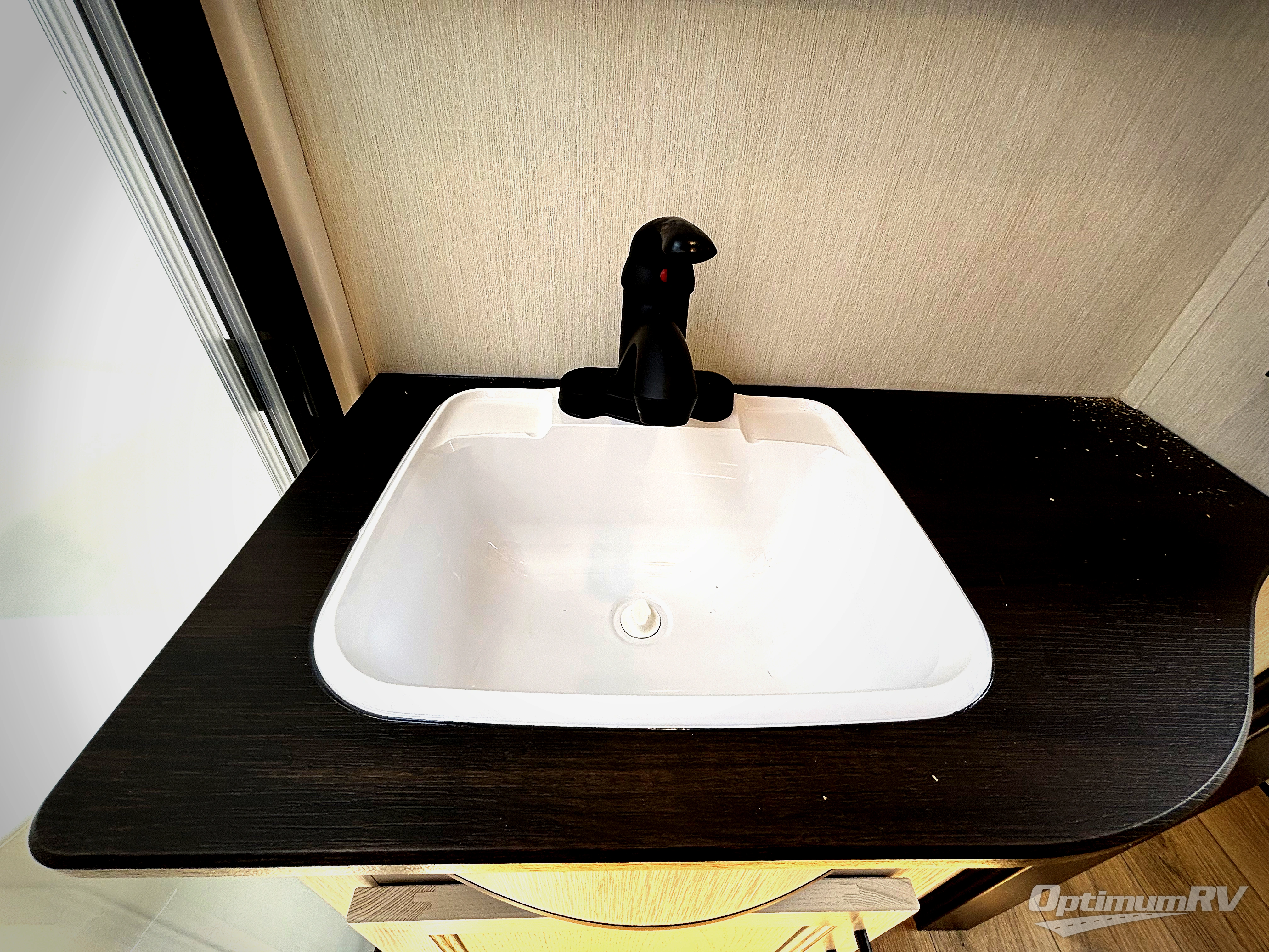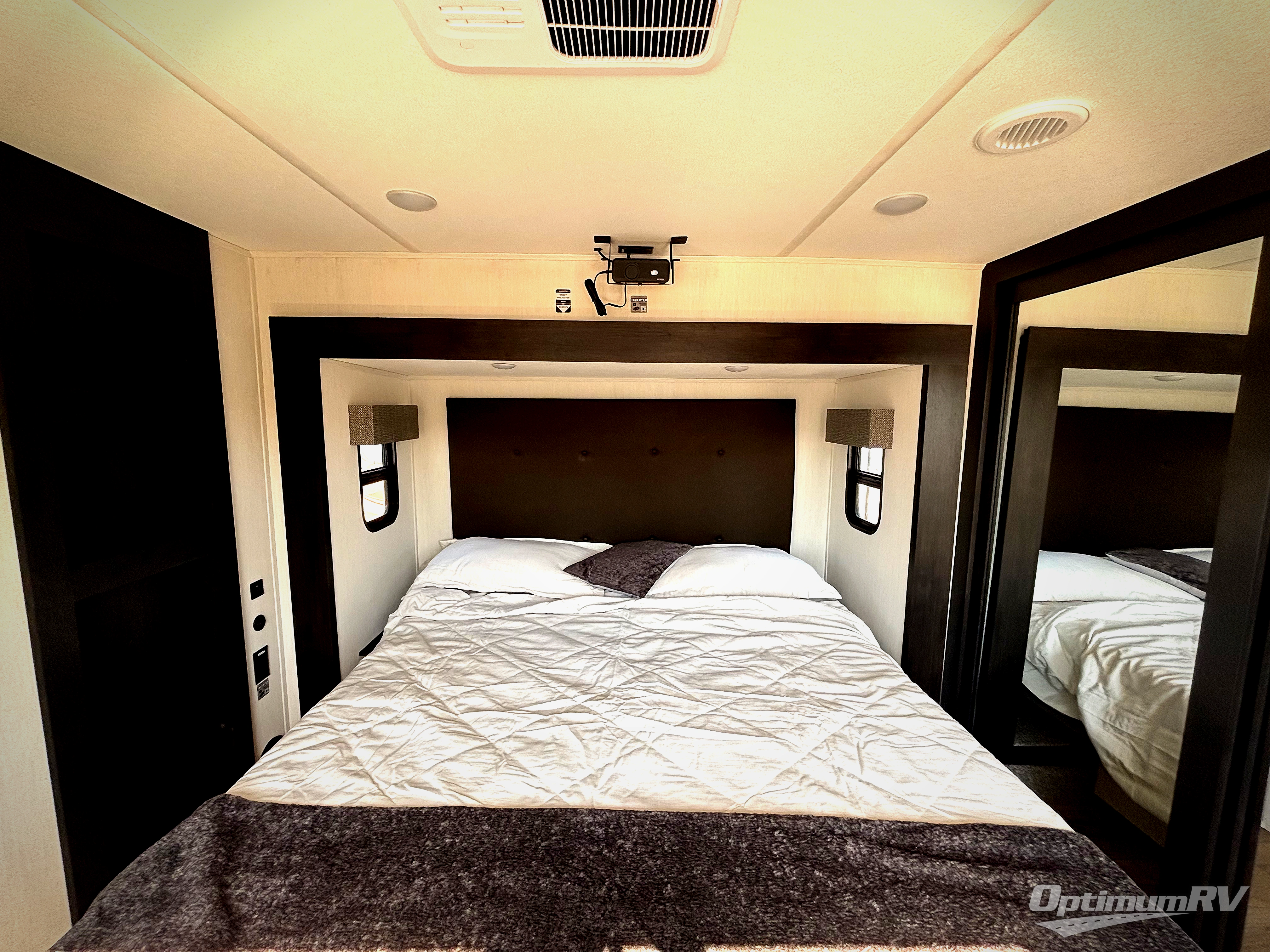 Are you looking for a fifth wheel where you can bring along your neighbor friends? You can do just that since there are two bedrooms in this unit, one of which includes a master bath with its own exterior entry door! The front bedroom is right next to the second full bath for convenience, and includes a camper king bed slide, a dresser, and front wardrobe. The rear master bedroom has a queen bed slide out across from a second slide for more floor space, and there is a loft above this room for more sleeping or storage space. Everyone can meet in the middle kitchen and living room since there are recliners, a ceiling fan, and kitchen island with four chairs. There is also storage below the island for kitchen necessities, and the hidden pantry behind the TV will be perfect for snacks, board games and more!