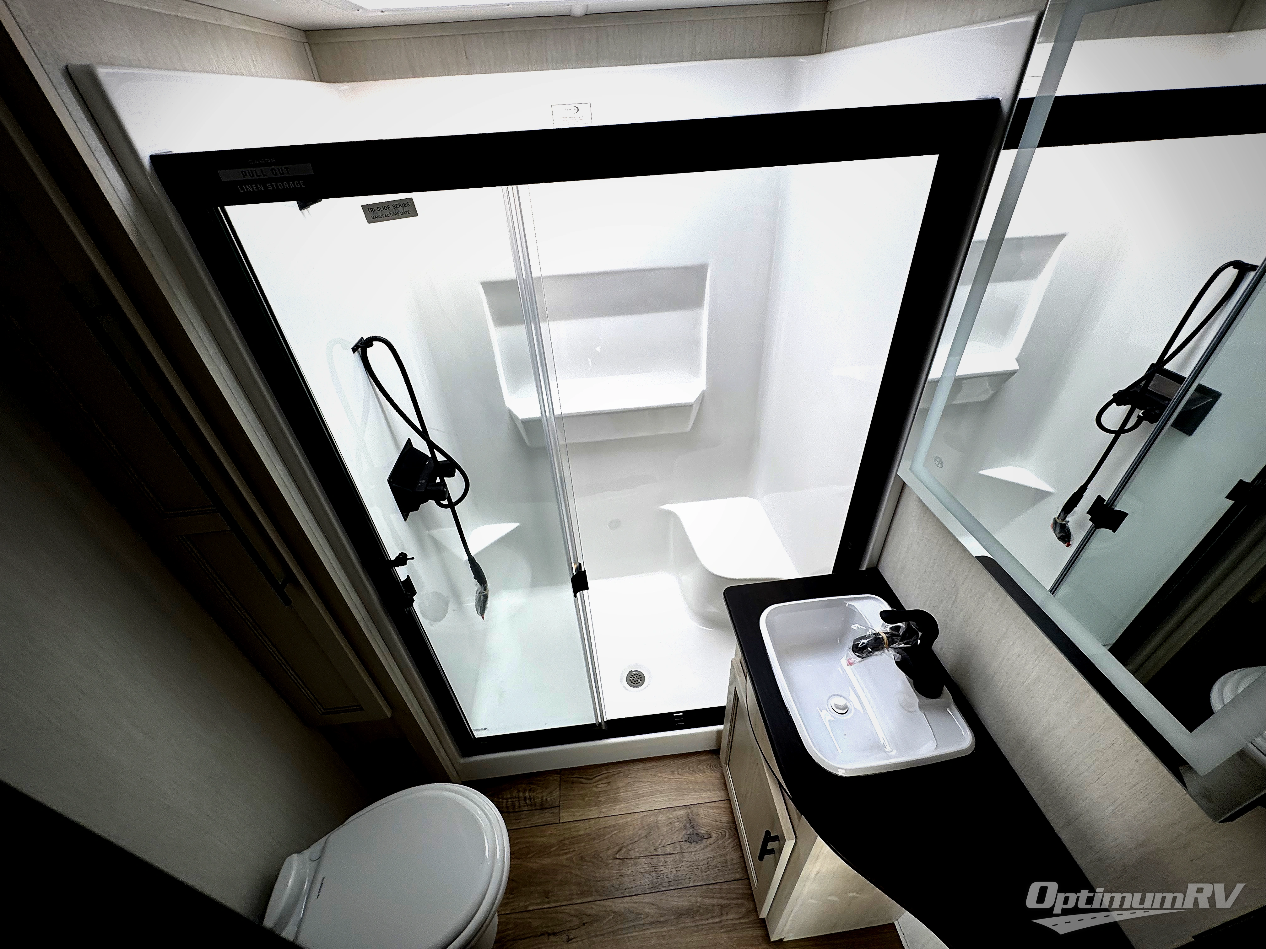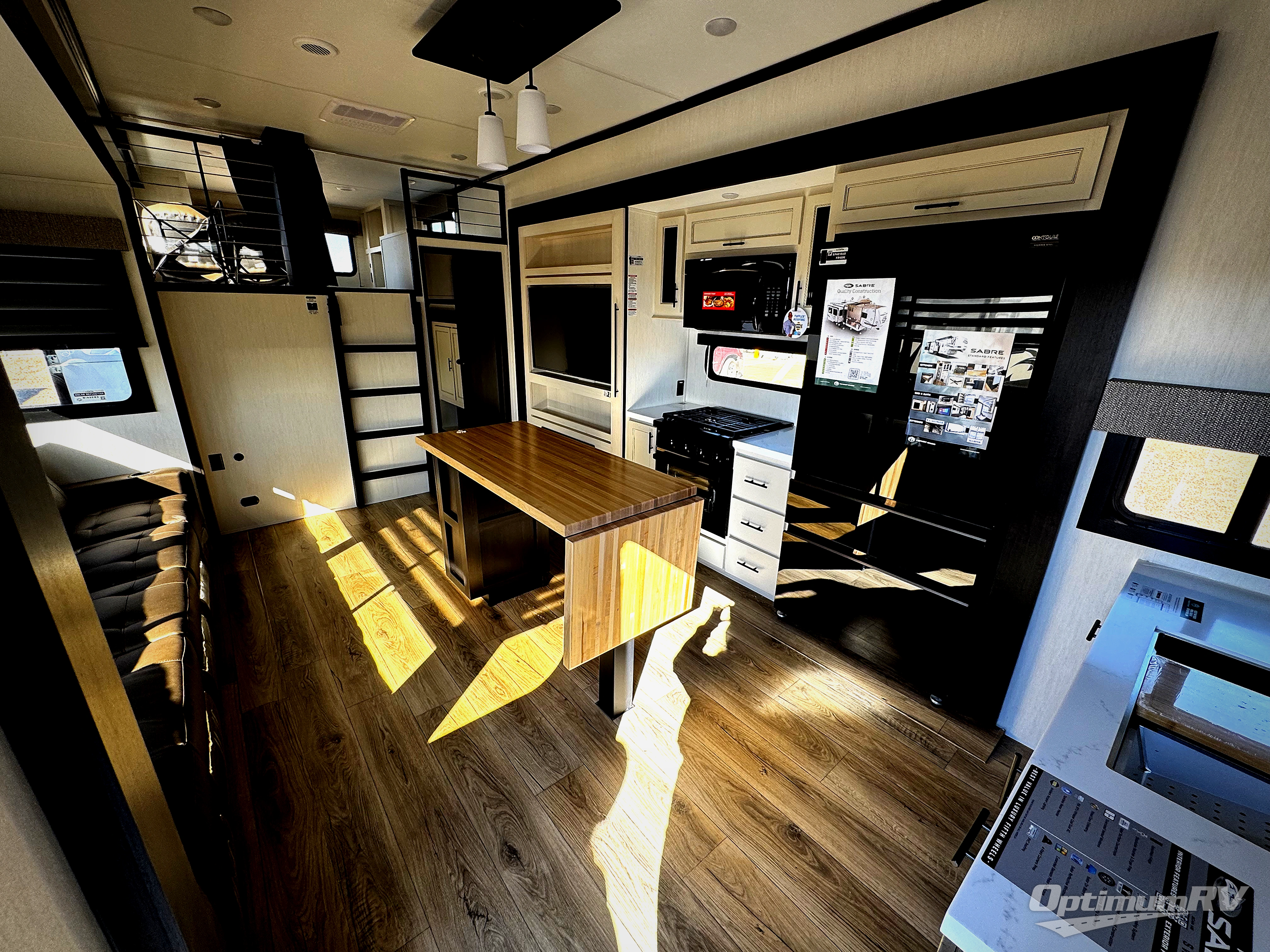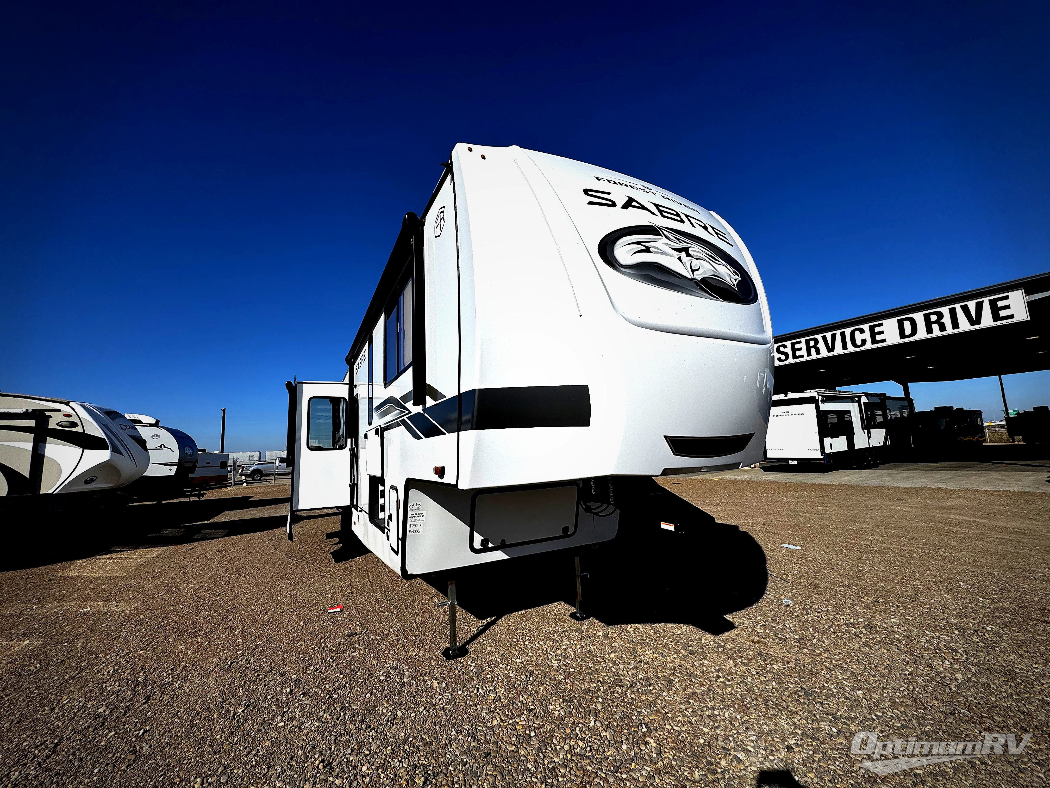 You will experience luxurious camping trips at an affordable price with any one of these Forest River Sabre fifth wheels! These models are durable and ready to travel anytime of the year thanks to features like the high-gloss gel-coat front cap with LED lighting, the PVC roof membrane, and the forced air underbelly with enclosed gate valves. The electric auto-leveling system makes setting up easy and safe, and the adjustable power awning with LED lighting will create an inviting outdoor living space. Each model includes a universal docking station which includes a black tank flush and an outside shower, and adjustable stable steps for you to enter and exit the unit safely. Inside, you will love the design of the ambient accent lighting in the living area, the real wood lumbercore cabinetry, and the linoleum flooring!
