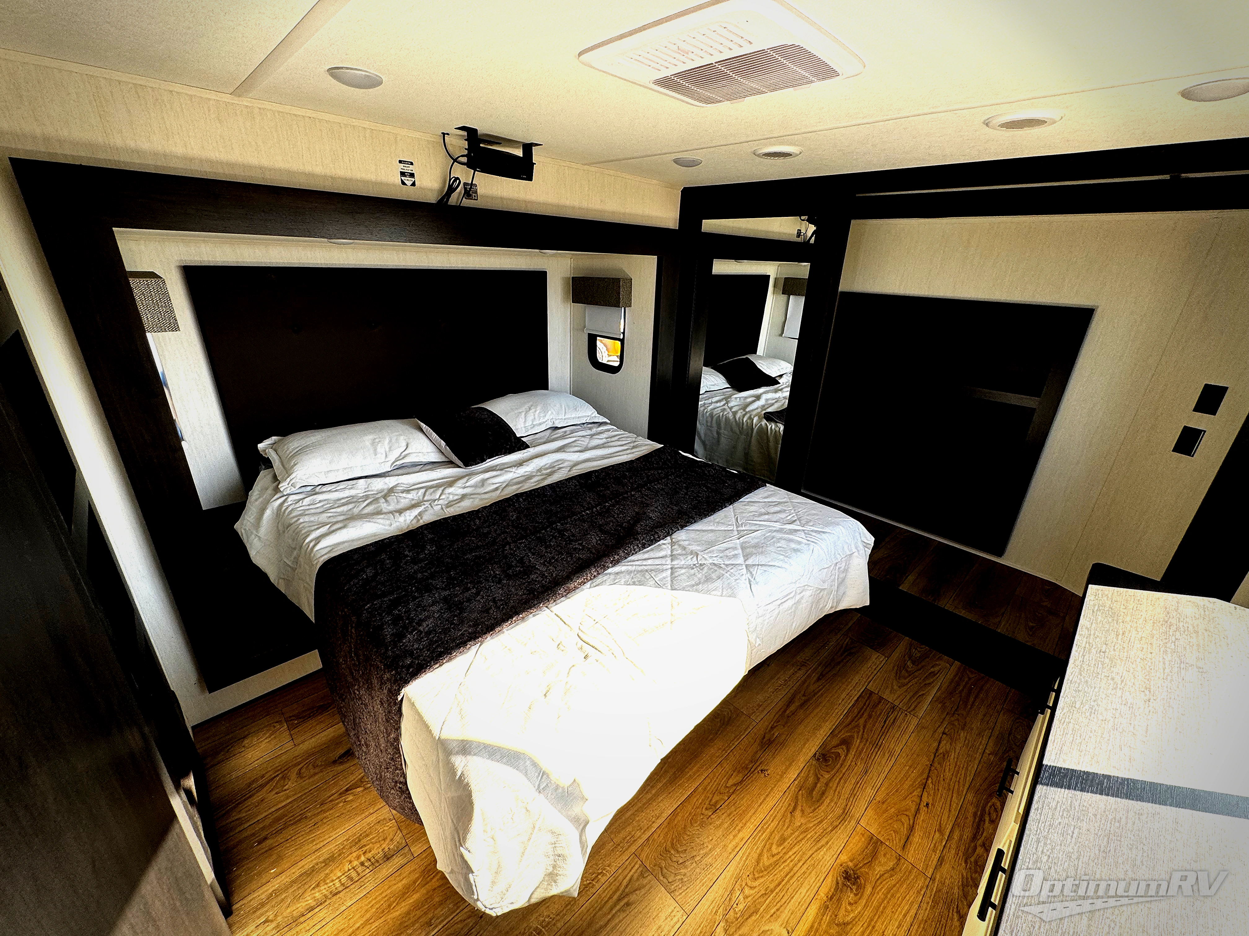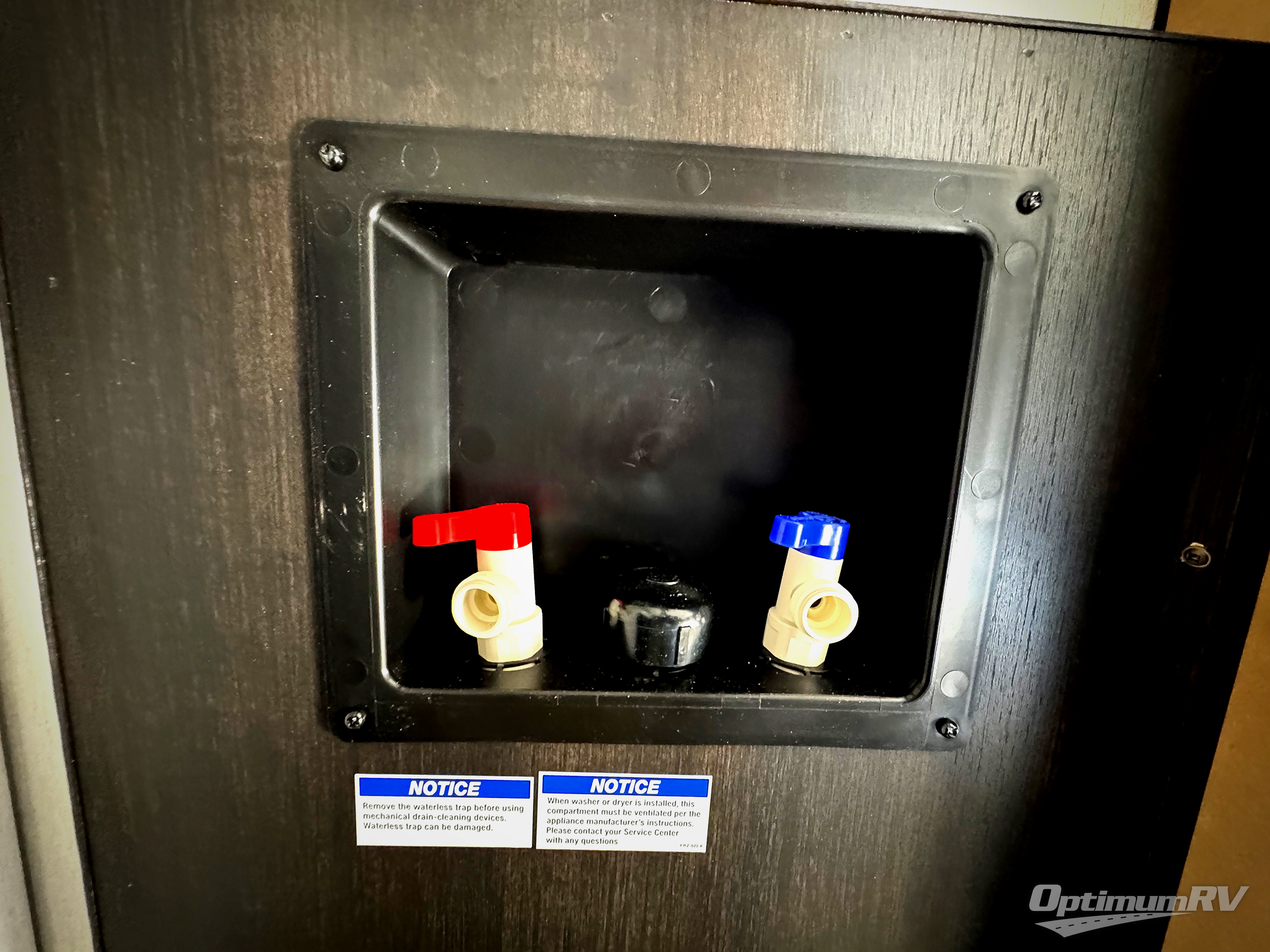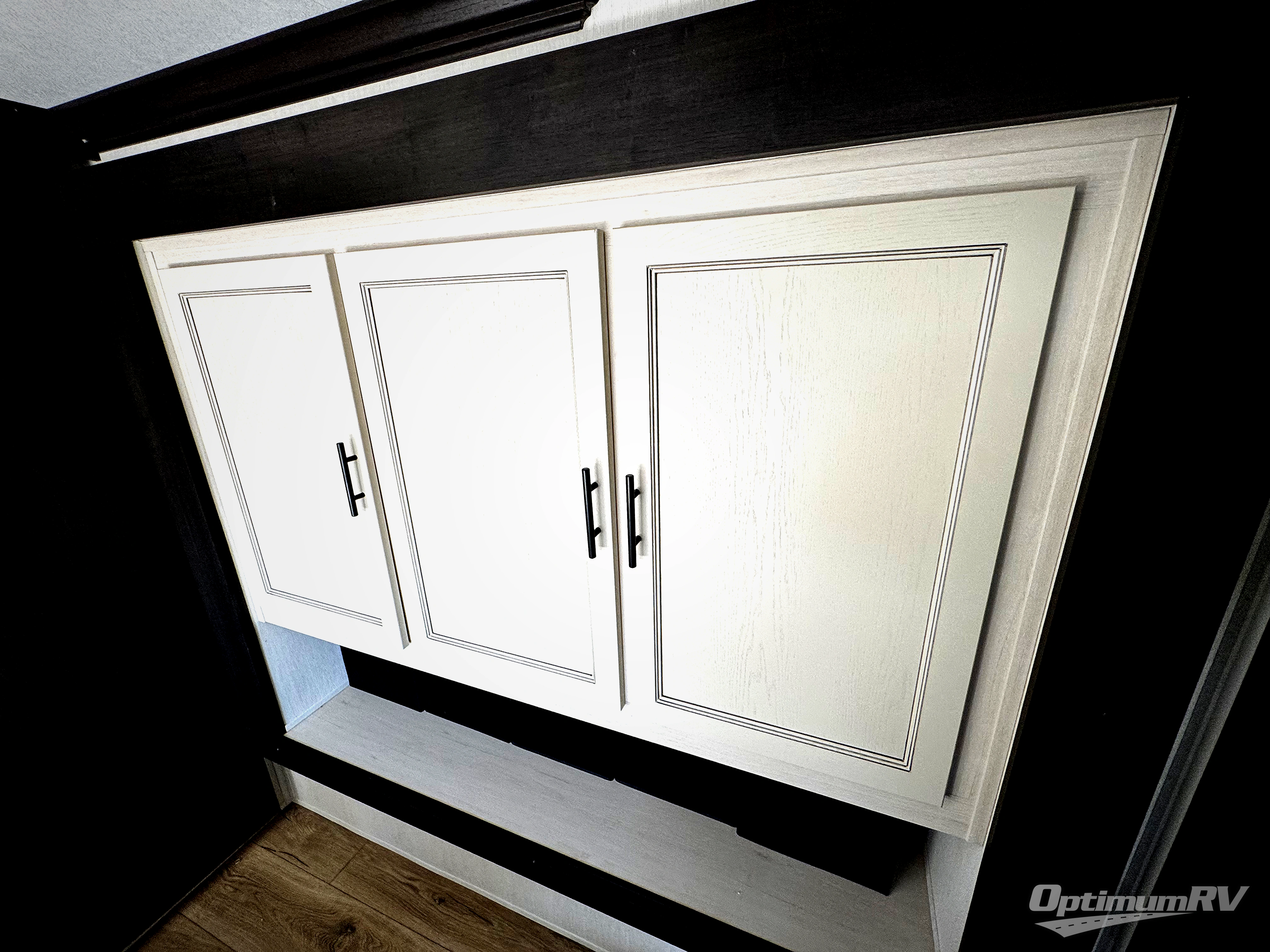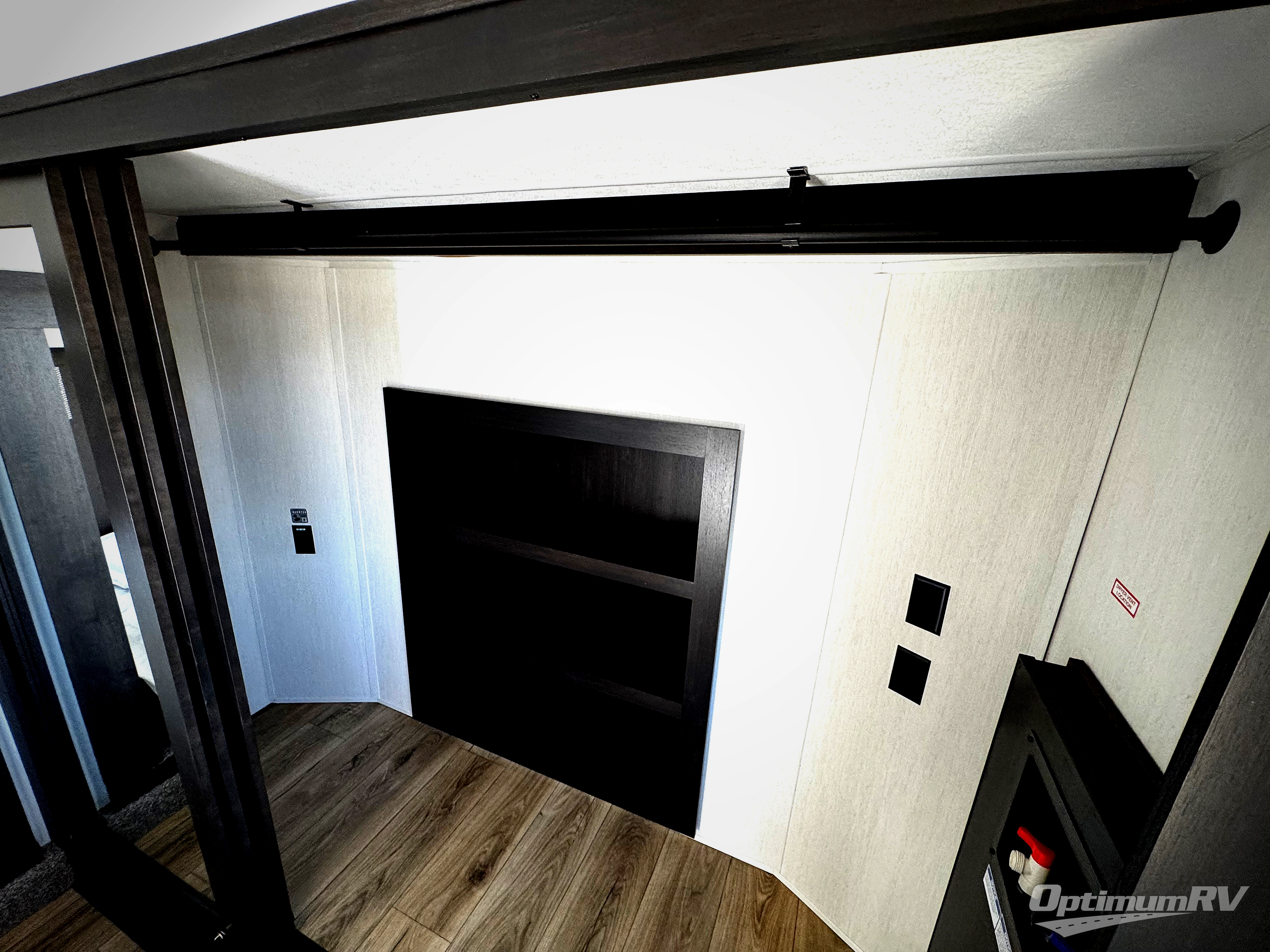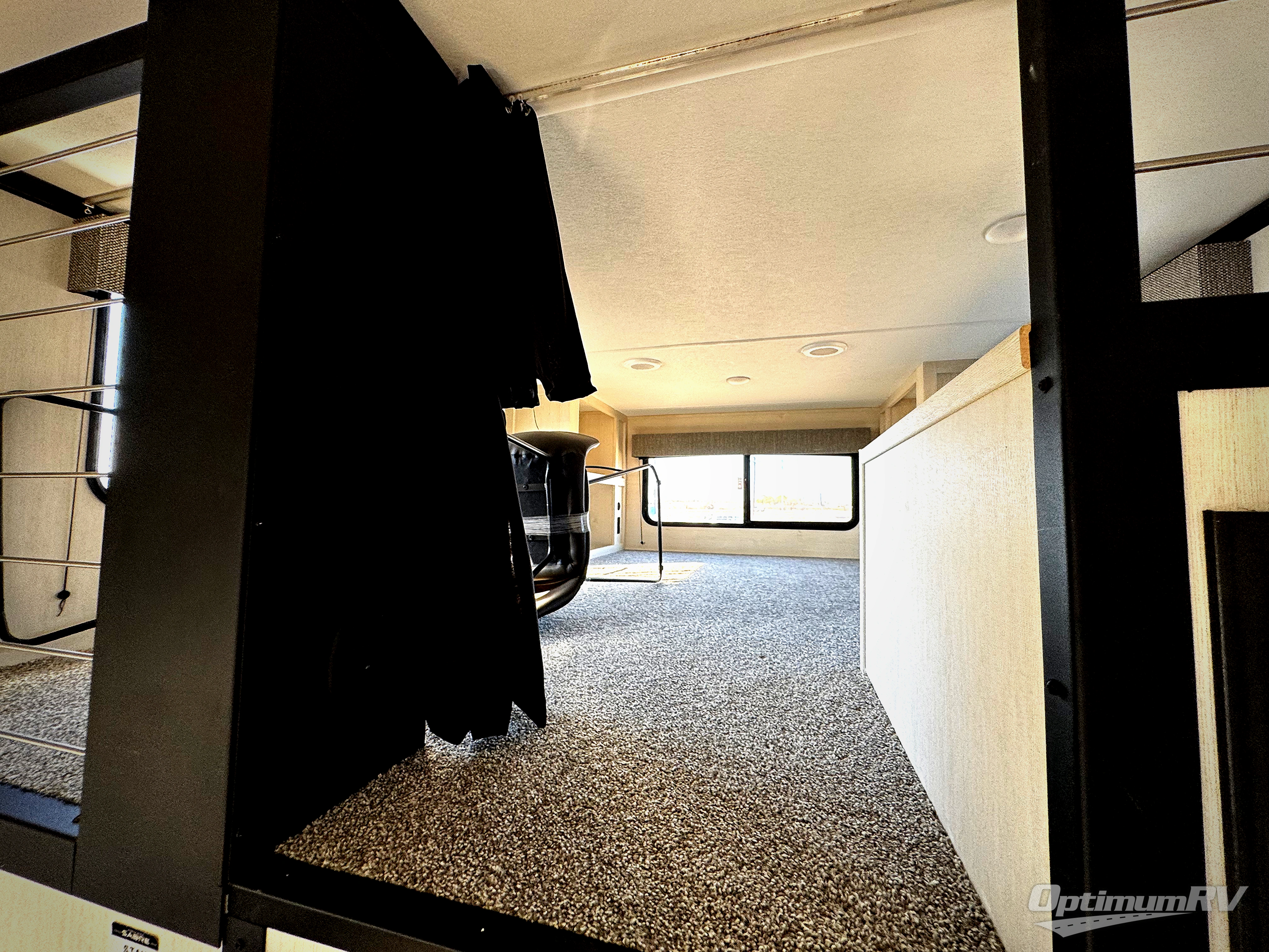 Are you looking for a fifth wheel where you can bring along your neighbor friends? You can do just that since there are two bedrooms in this unit, one of which includes a master bath with its own exterior entry door! The front bedroom is right next to the second full bath for convenience, and includes a camper king bed slide, a dresser, and front wardrobe. The rear master bedroom has a queen bed slide out across from a second slide for more floor space, and there is a loft above this room for more sleeping or storage space. Everyone can meet in the middle kitchen and living room since there are recliners, a ceiling fan, and kitchen island with four chairs. There is also storage below the island for kitchen necessities, and the hidden pantry behind the TV will be perfect for snacks, board games and more!