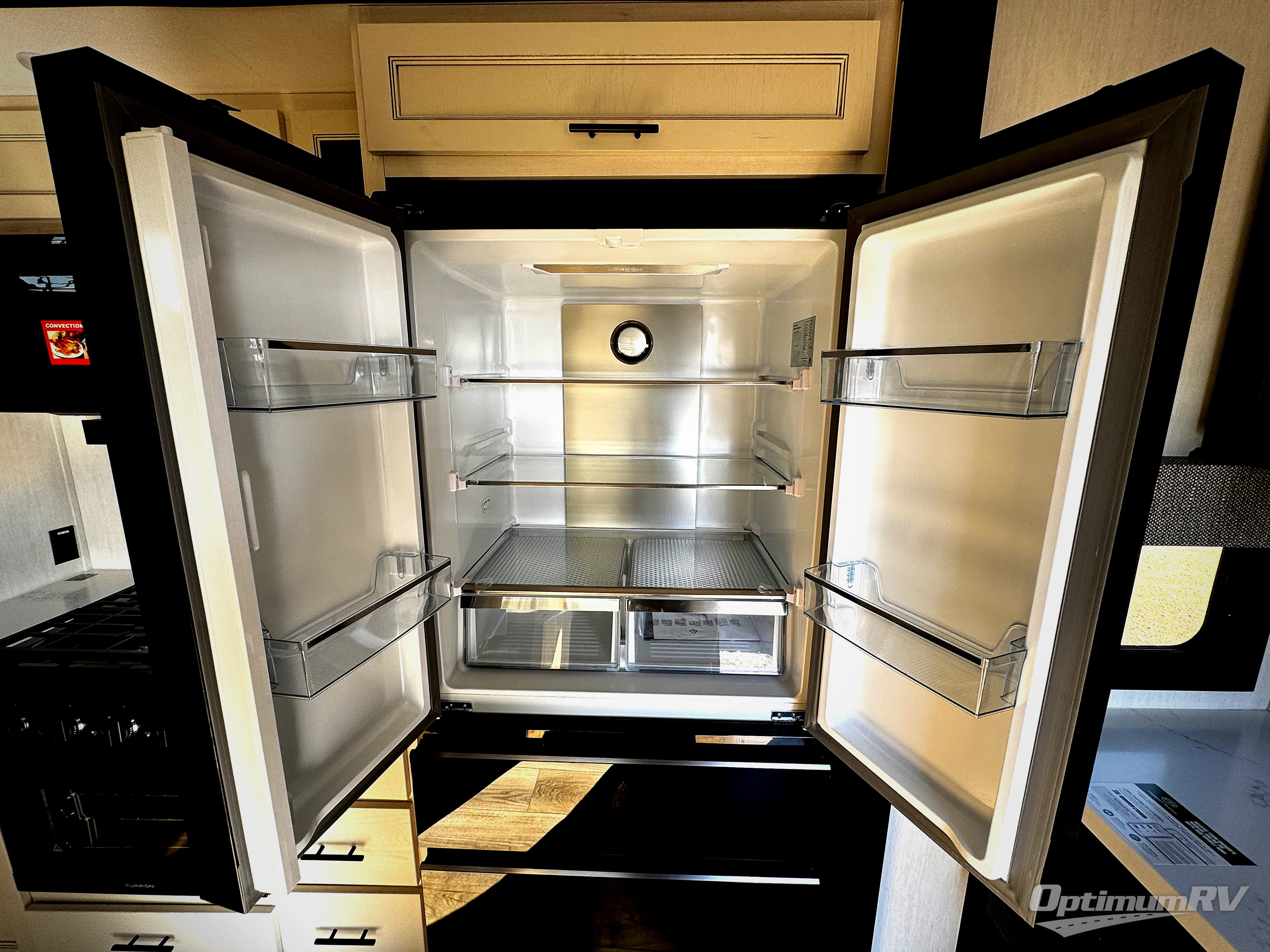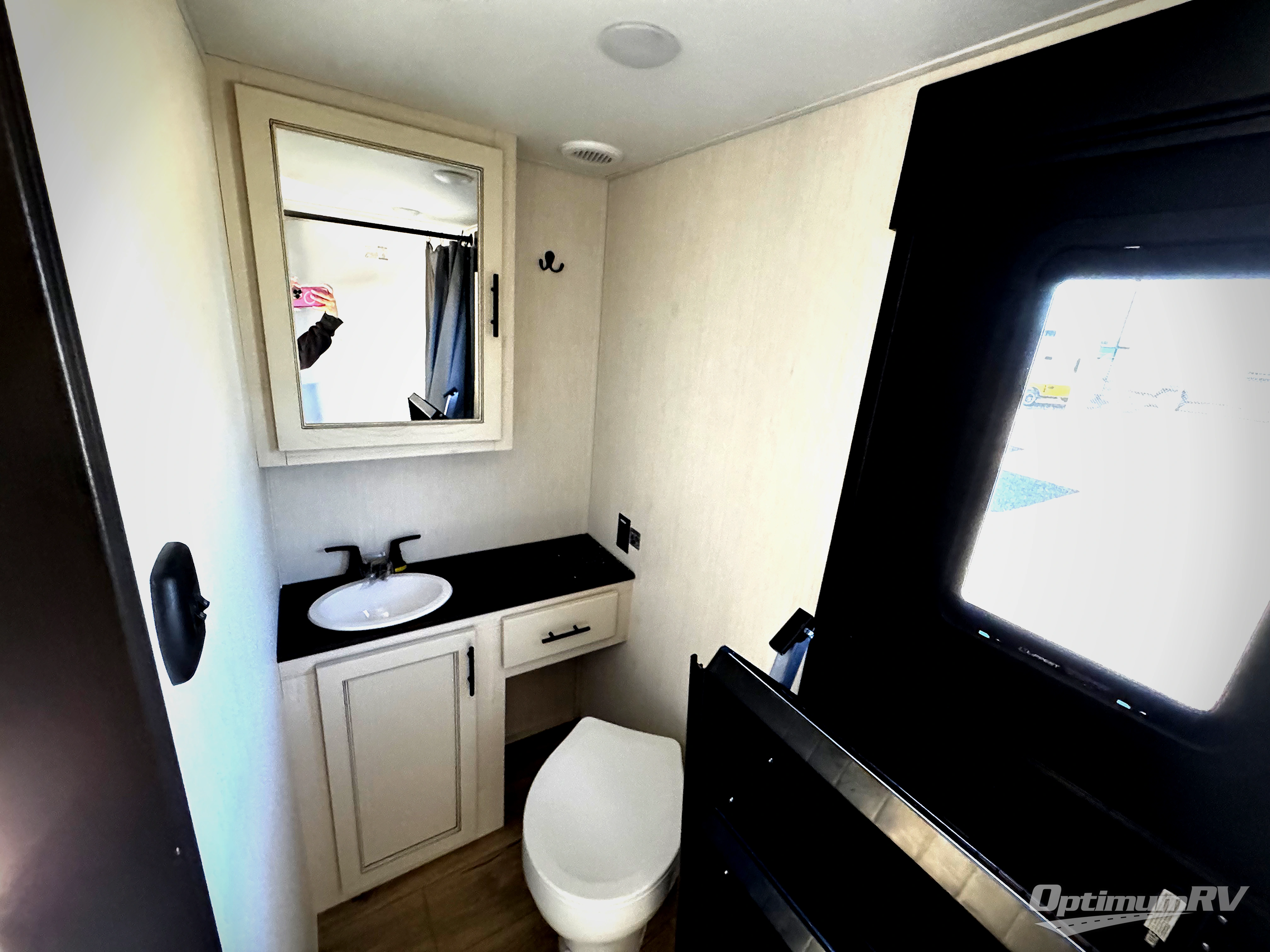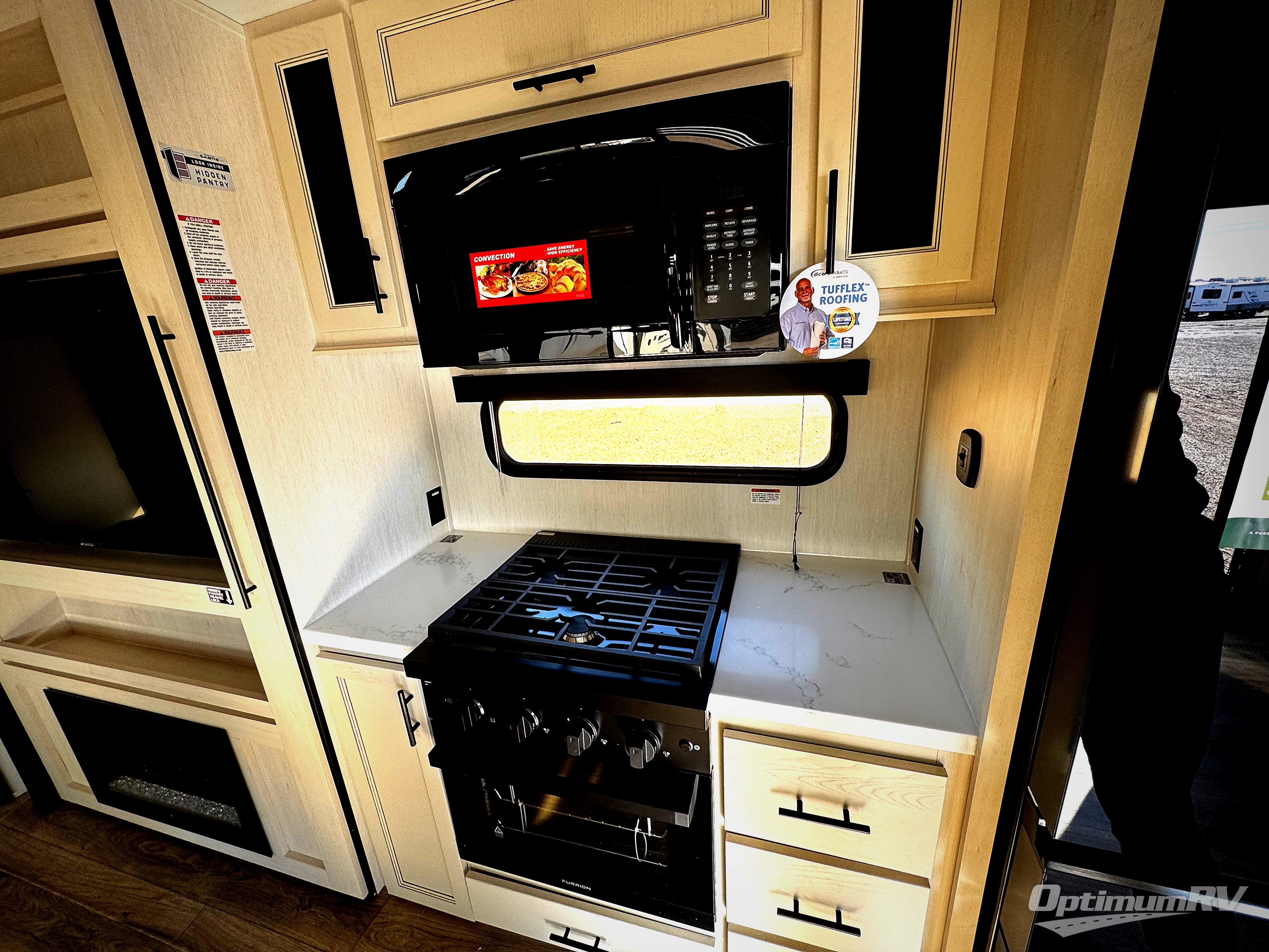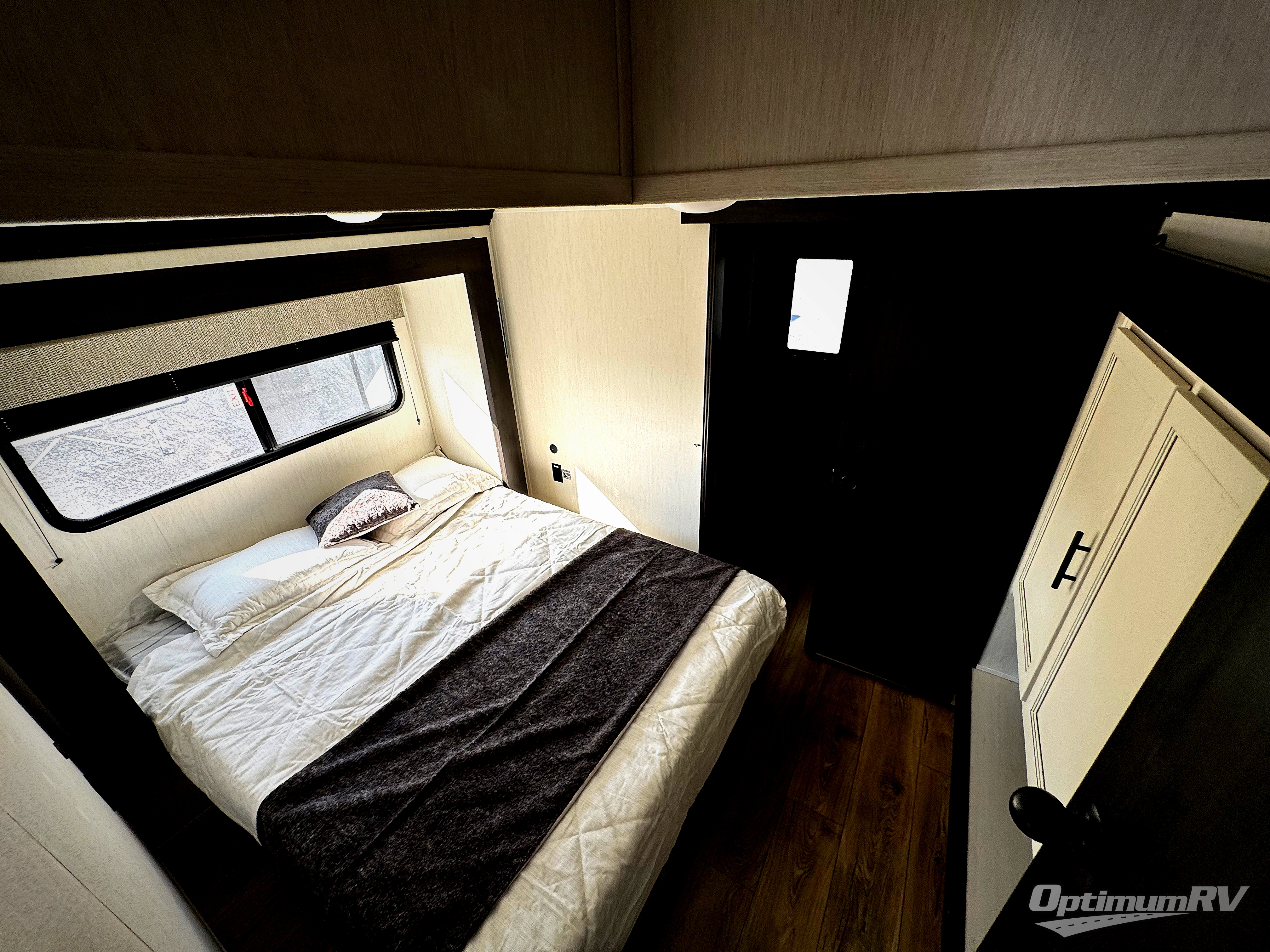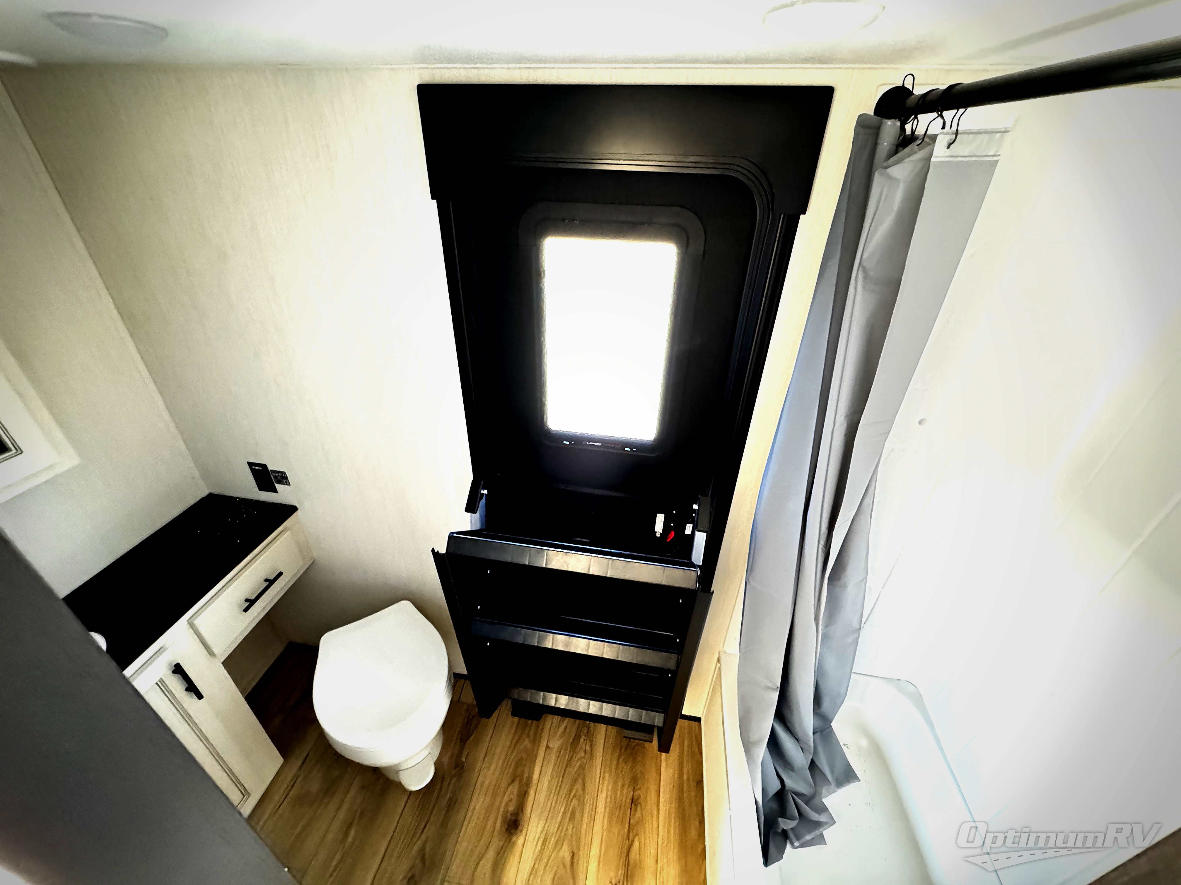 Are you looking for a fifth wheel where you can bring along your neighbor friends? You can do just that since there are two bedrooms in this unit, one of which includes a master bath with its own exterior entry door! The front bedroom is right next to the second full bath for convenience, and includes a camper king bed slide, a dresser, and front wardrobe. The rear master bedroom has a queen bed slide out across from a second slide for more floor space, and there is a loft above this room for more sleeping or storage space. Everyone can meet in the middle kitchen and living room since there are recliners, a ceiling fan, and kitchen island with four chairs. There is also storage below the island for kitchen necessities, and the hidden pantry behind the TV will be perfect for snacks, board games and more!