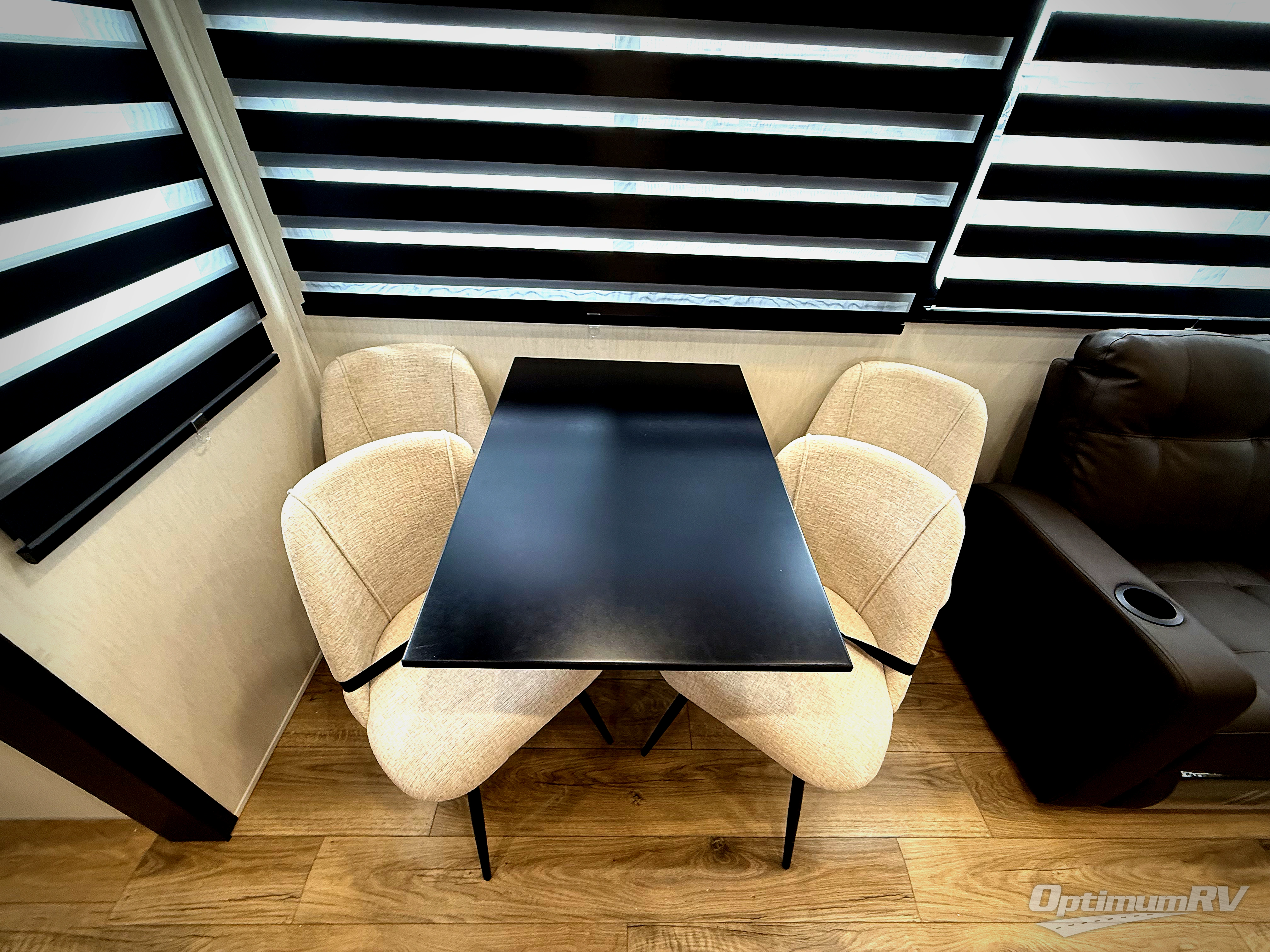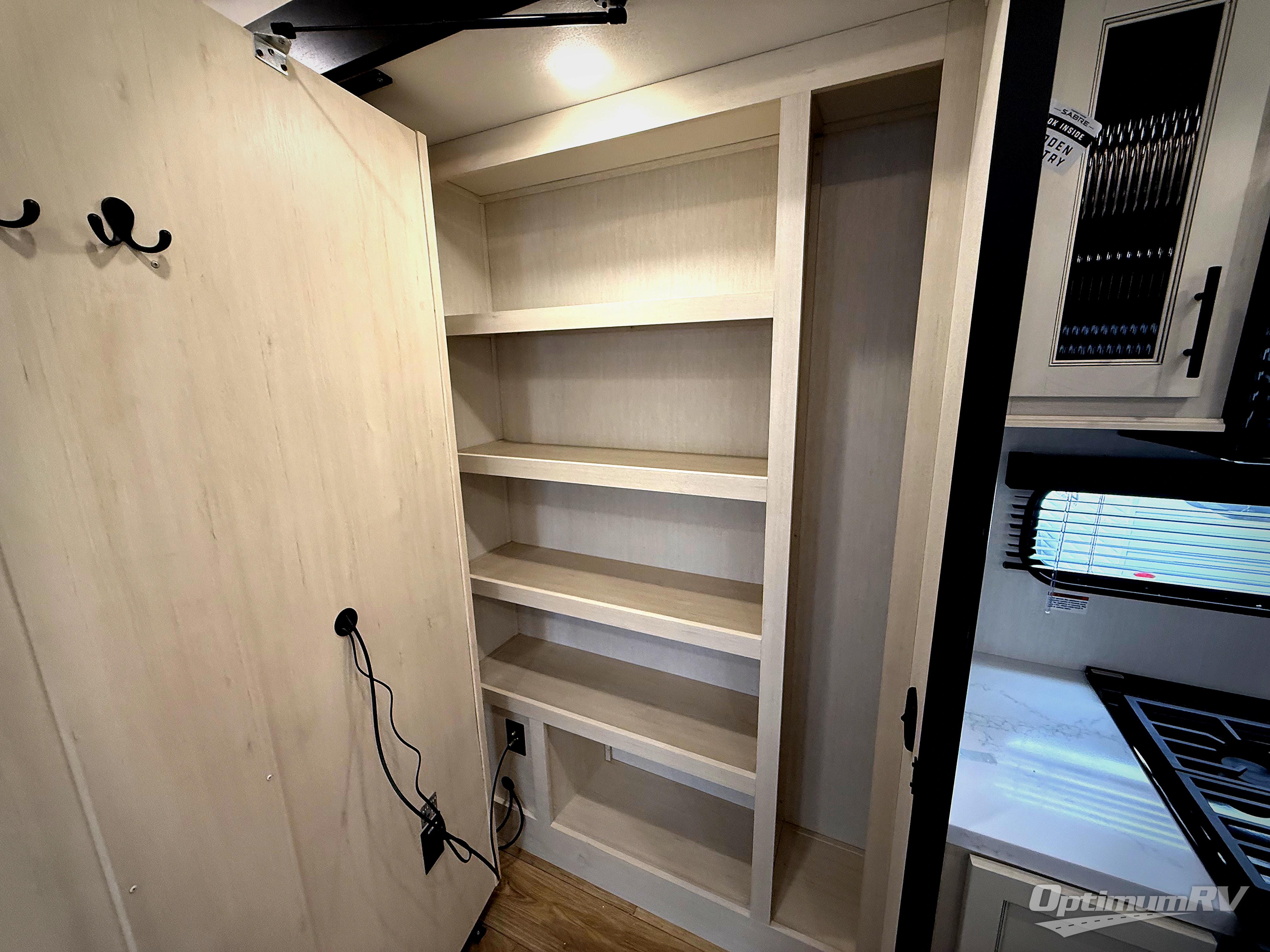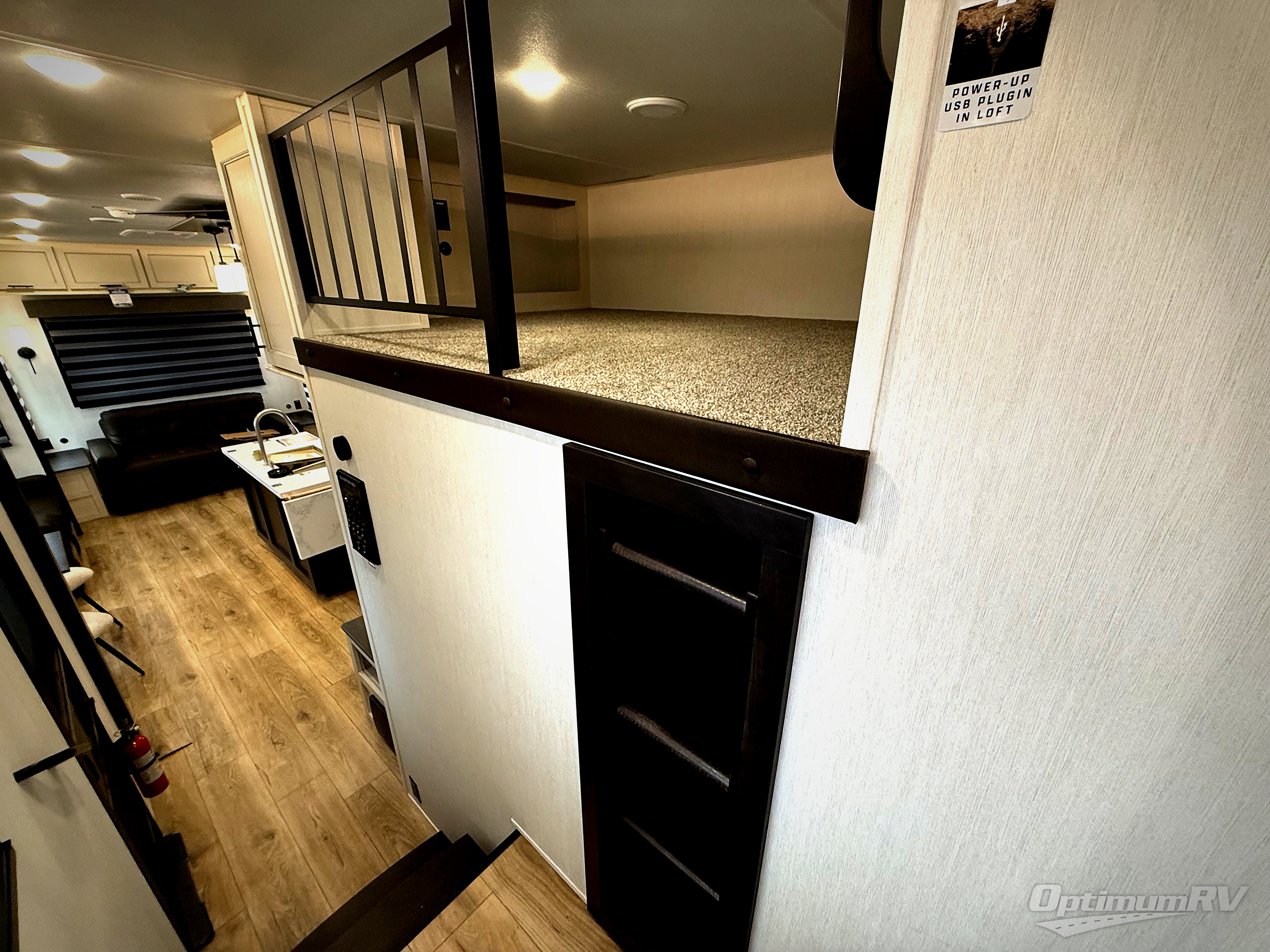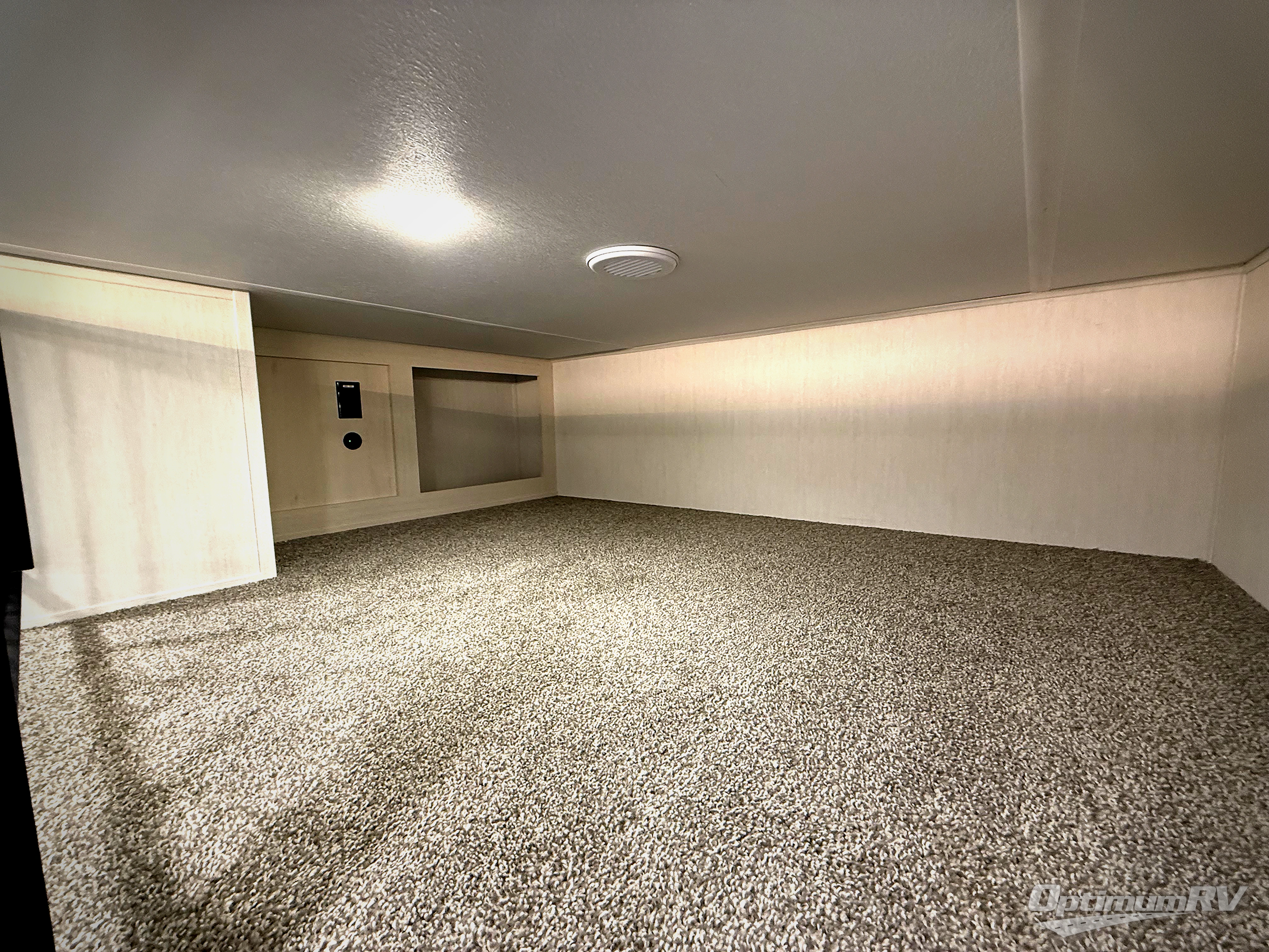 There is much to love in this fifth wheel! Starting with the second bedroom which has a slide that houses a flip-up bunk above a tri-fold sofa across from a desk with drawers, a drop zone, and a wardrobe, plus above all of that is a storage/bunk loft. The rear living area includes a tri-fold sofa, a TV with a hidden pantry behind, and theater seating for two making this space another area at night for guests. In the morning, you can prepare breakfast on the kitchen island, then dine together at the versatile dinette/desk. The full bath will allow you to stay clean throughout your trip, and you'll feel right at home in the front private bedroom with a camper king bed, a dresser, and front wardrobe. Outside, a kitchen and two power awnings create an inviting space!