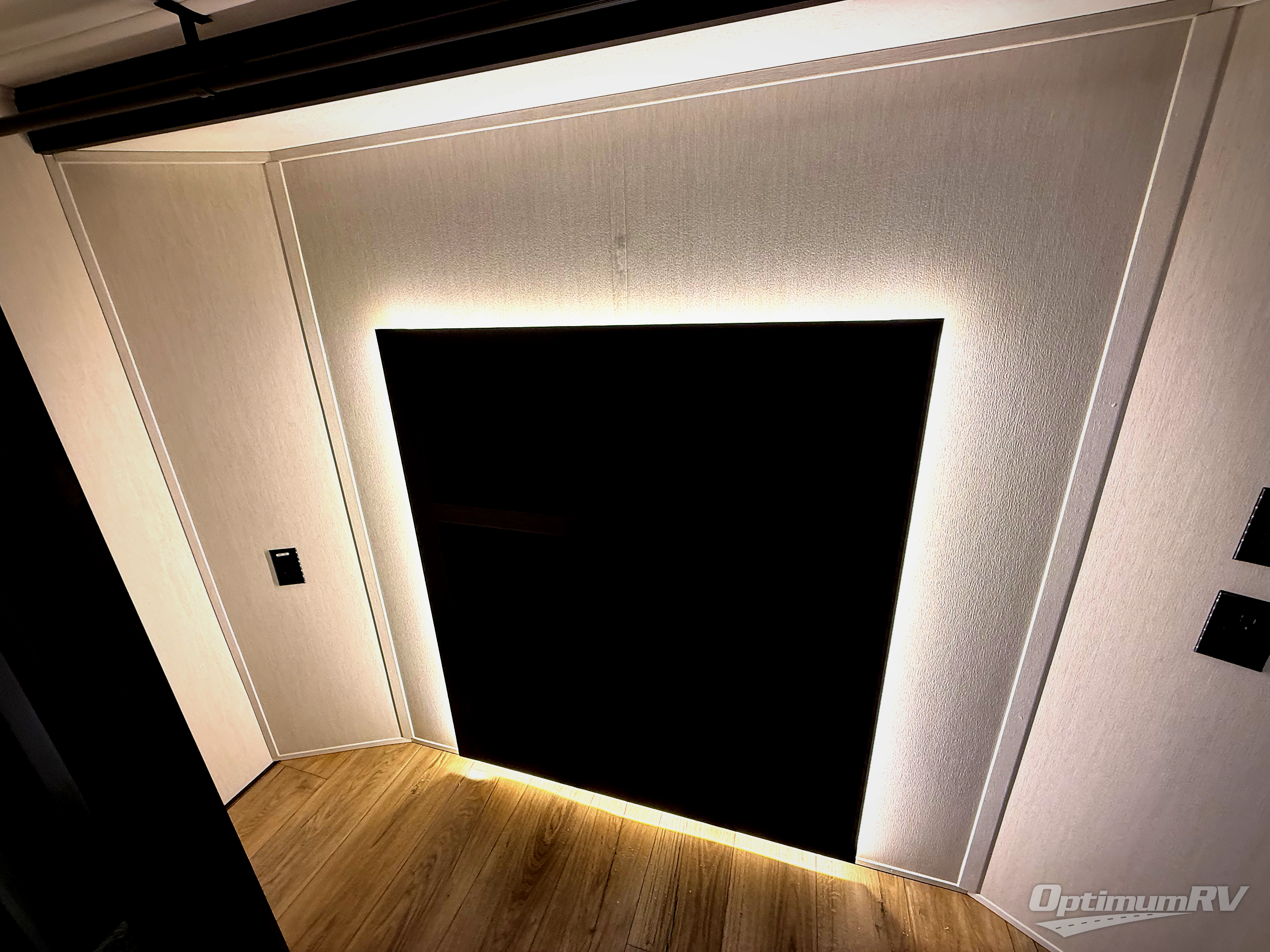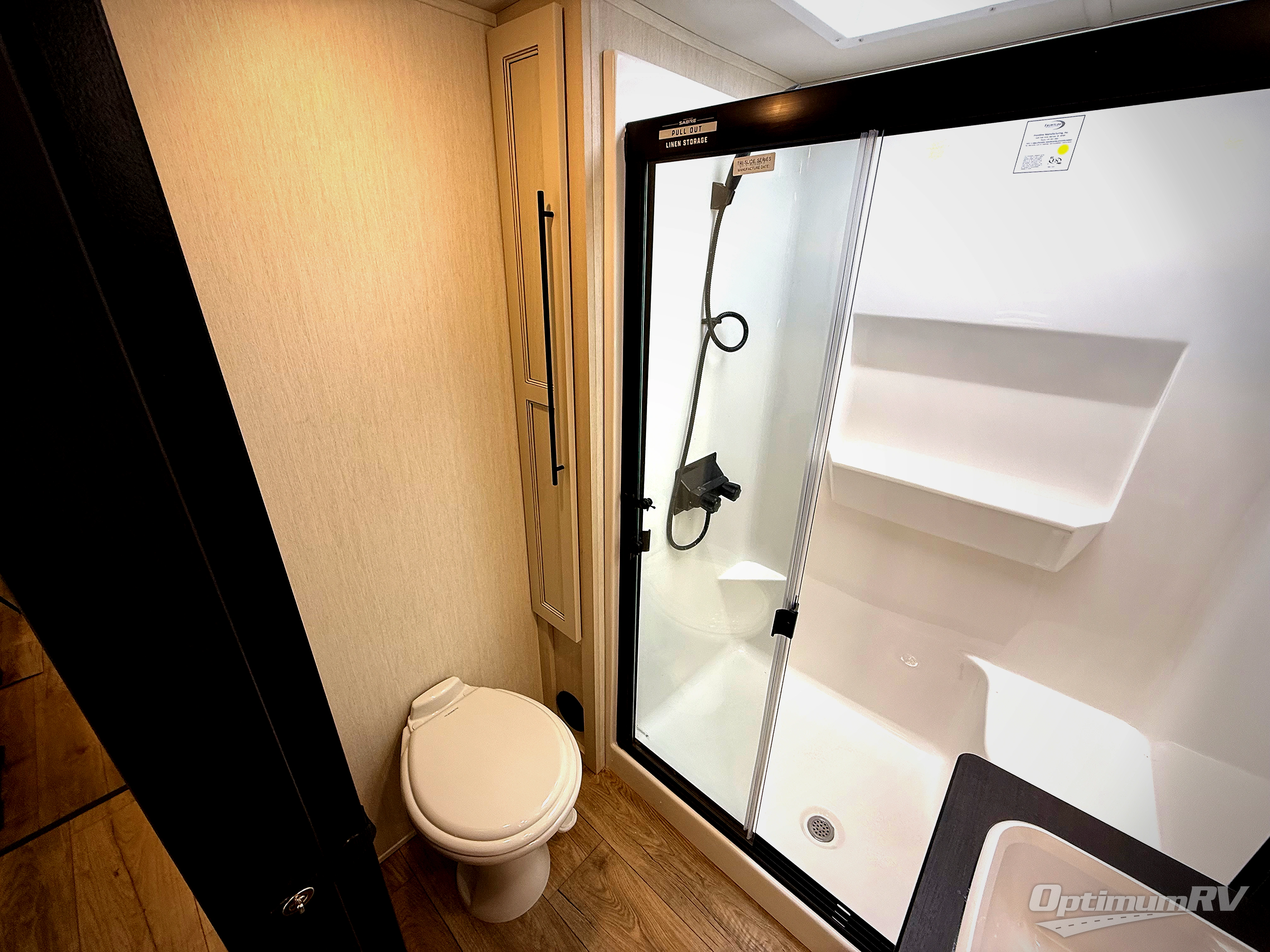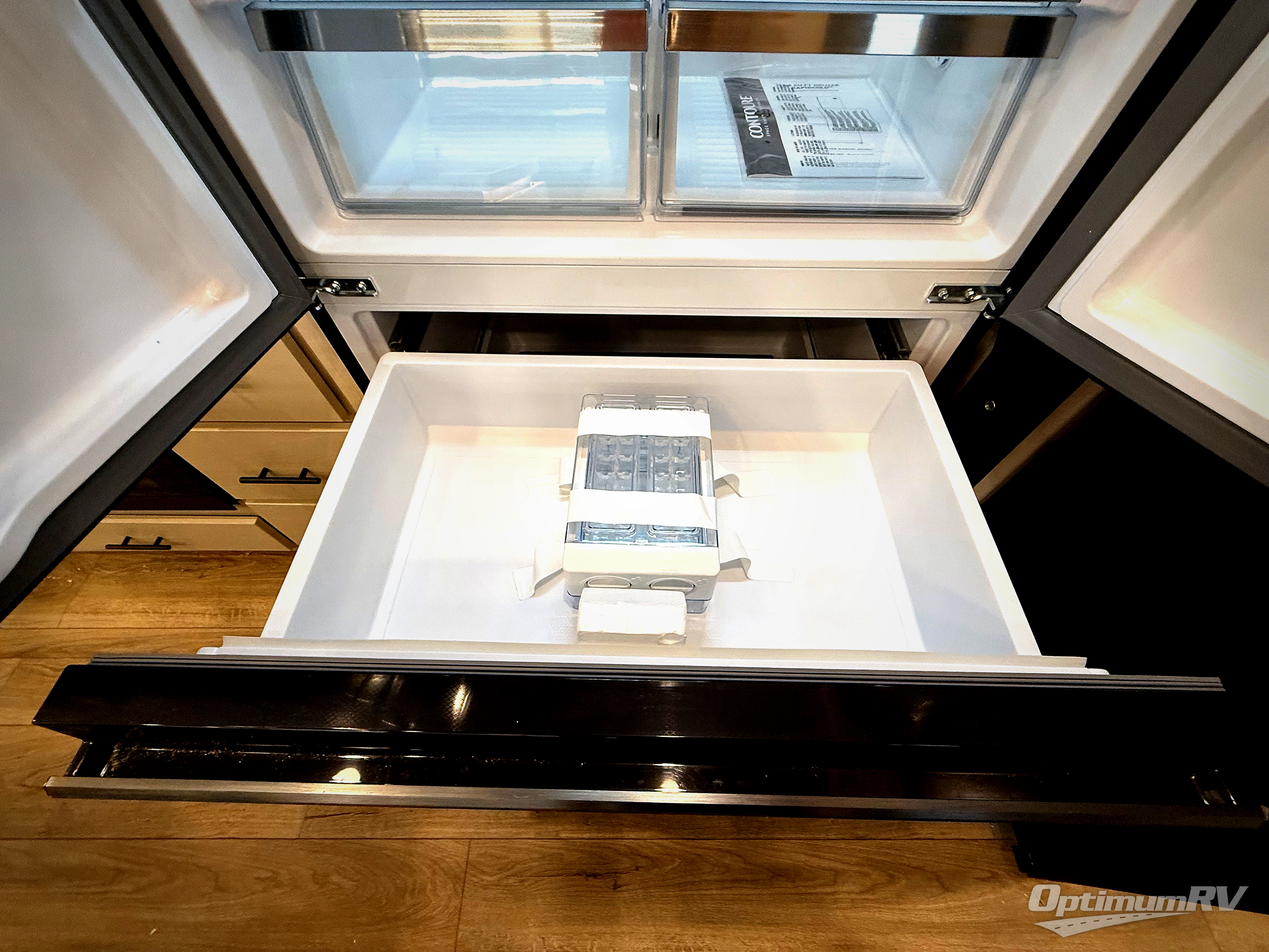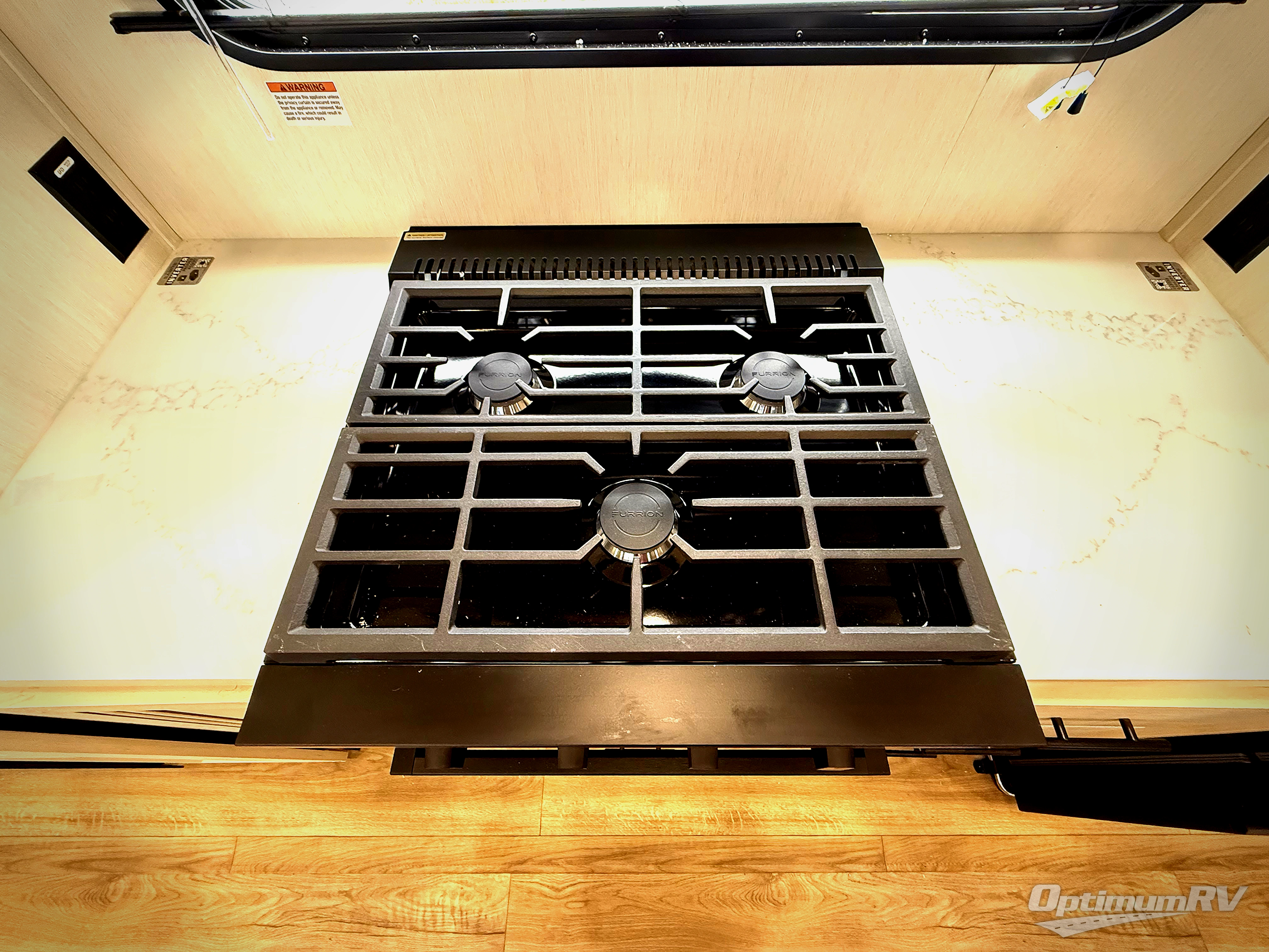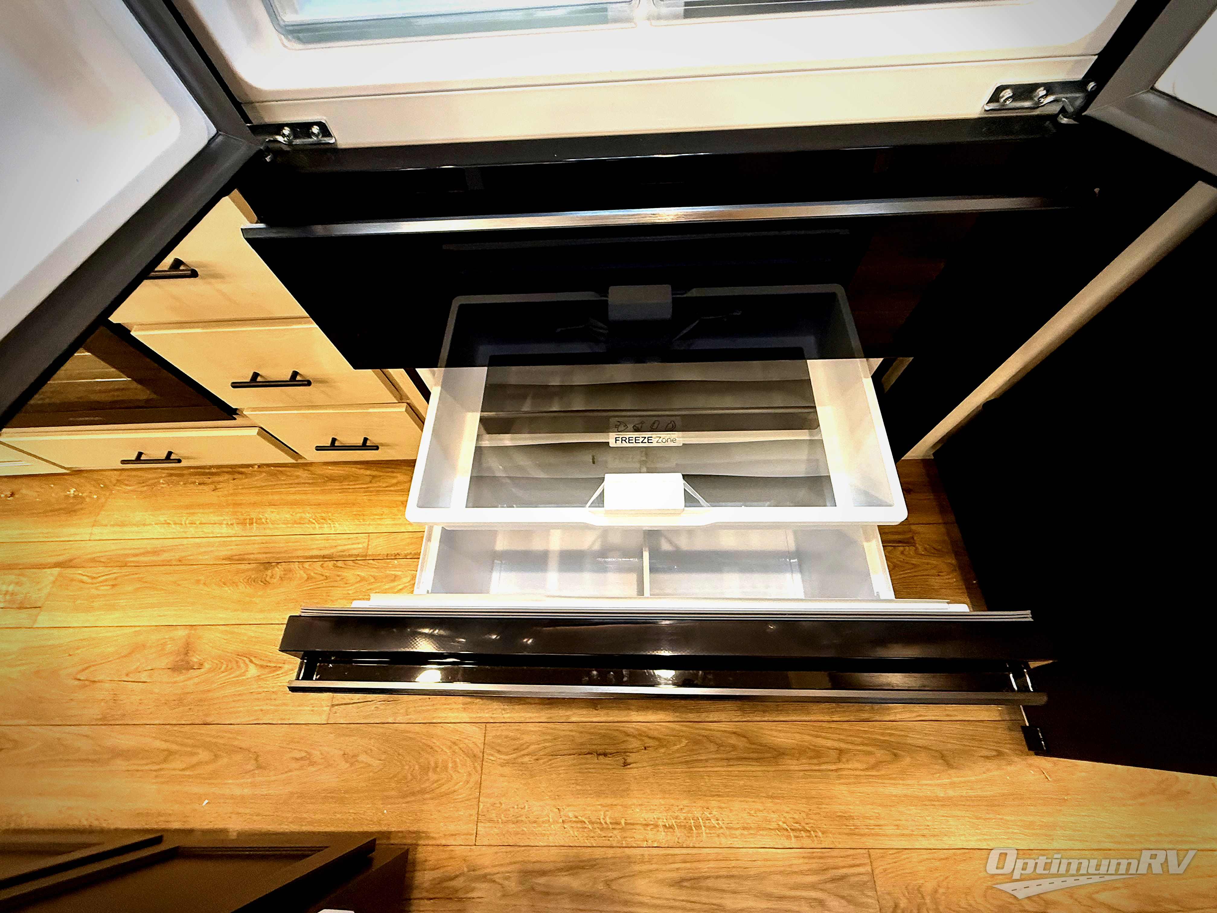 There is much to love in this fifth wheel! Starting with the second bedroom which has a slide that houses a flip-up bunk above a tri-fold sofa across from a desk with drawers, a drop zone, and a wardrobe, plus above all of that is a storage/bunk loft. The rear living area includes a tri-fold sofa, a TV with a hidden pantry behind, and theater seating for two making this space another area at night for guests. In the morning, you can prepare breakfast on the kitchen island, then dine together at the versatile dinette/desk. The full bath will allow you to stay clean throughout your trip, and you'll feel right at home in the front private bedroom with a camper king bed, a dresser, and front wardrobe. Outside, a kitchen and two power awnings create an inviting space!