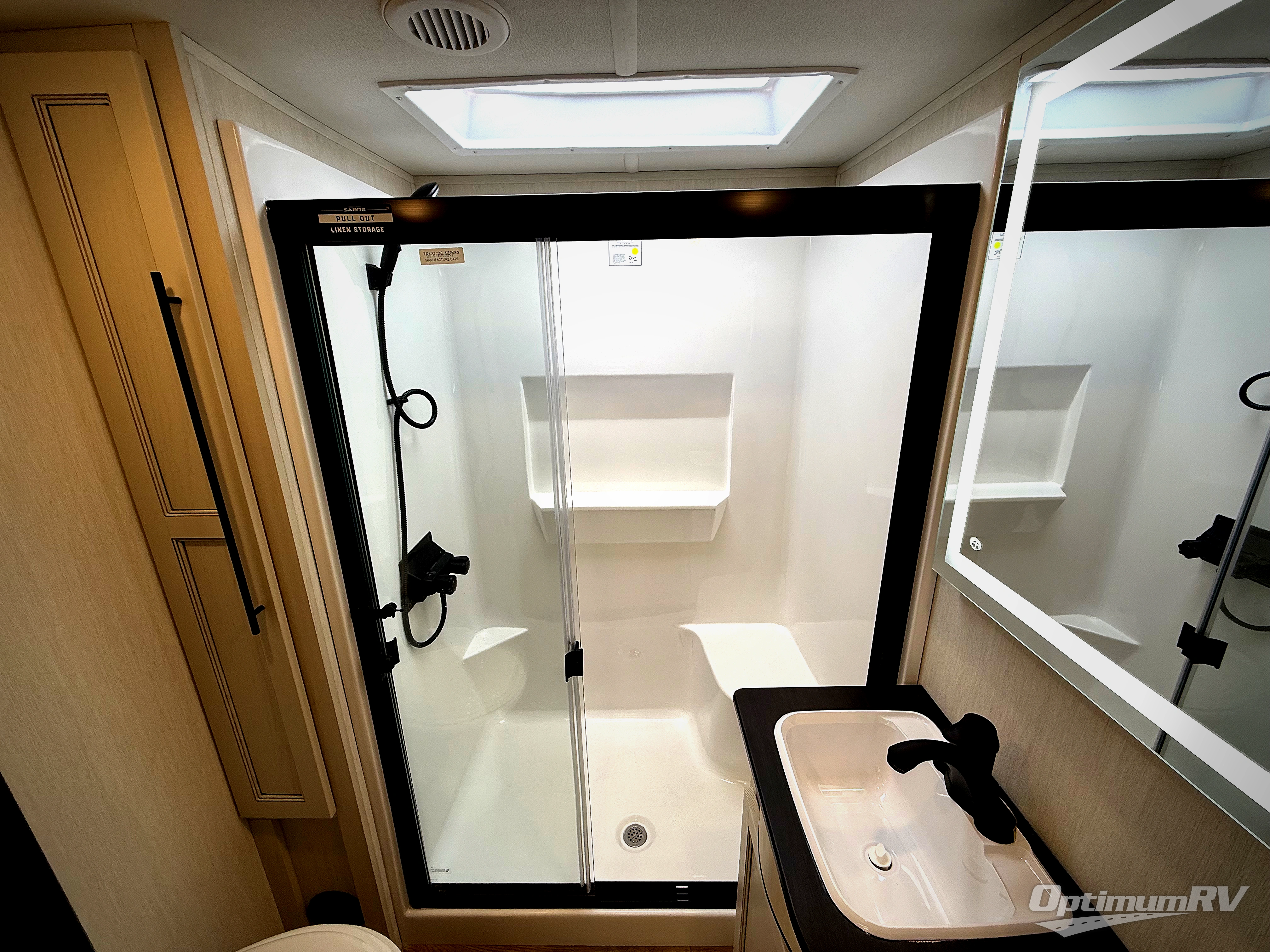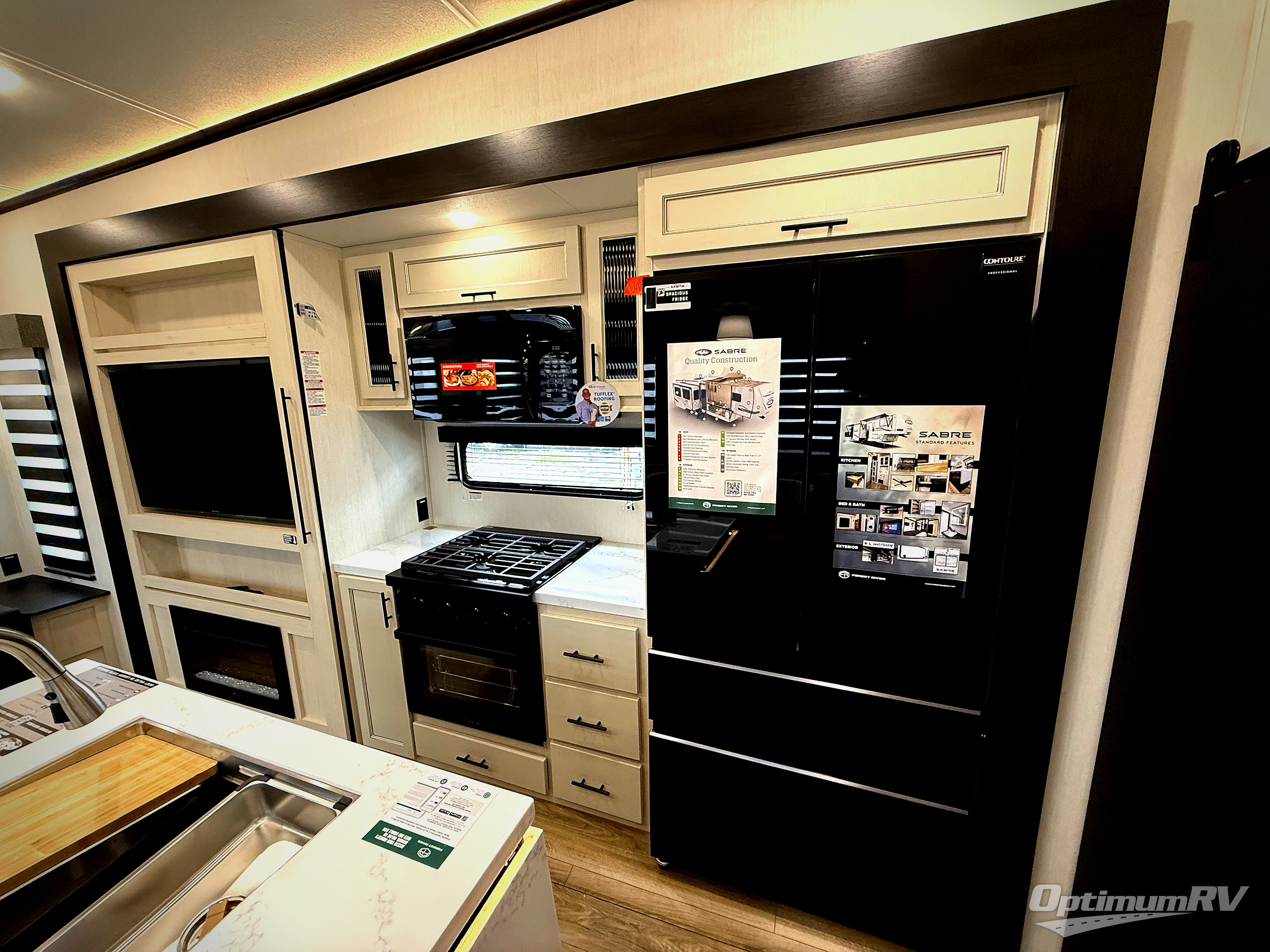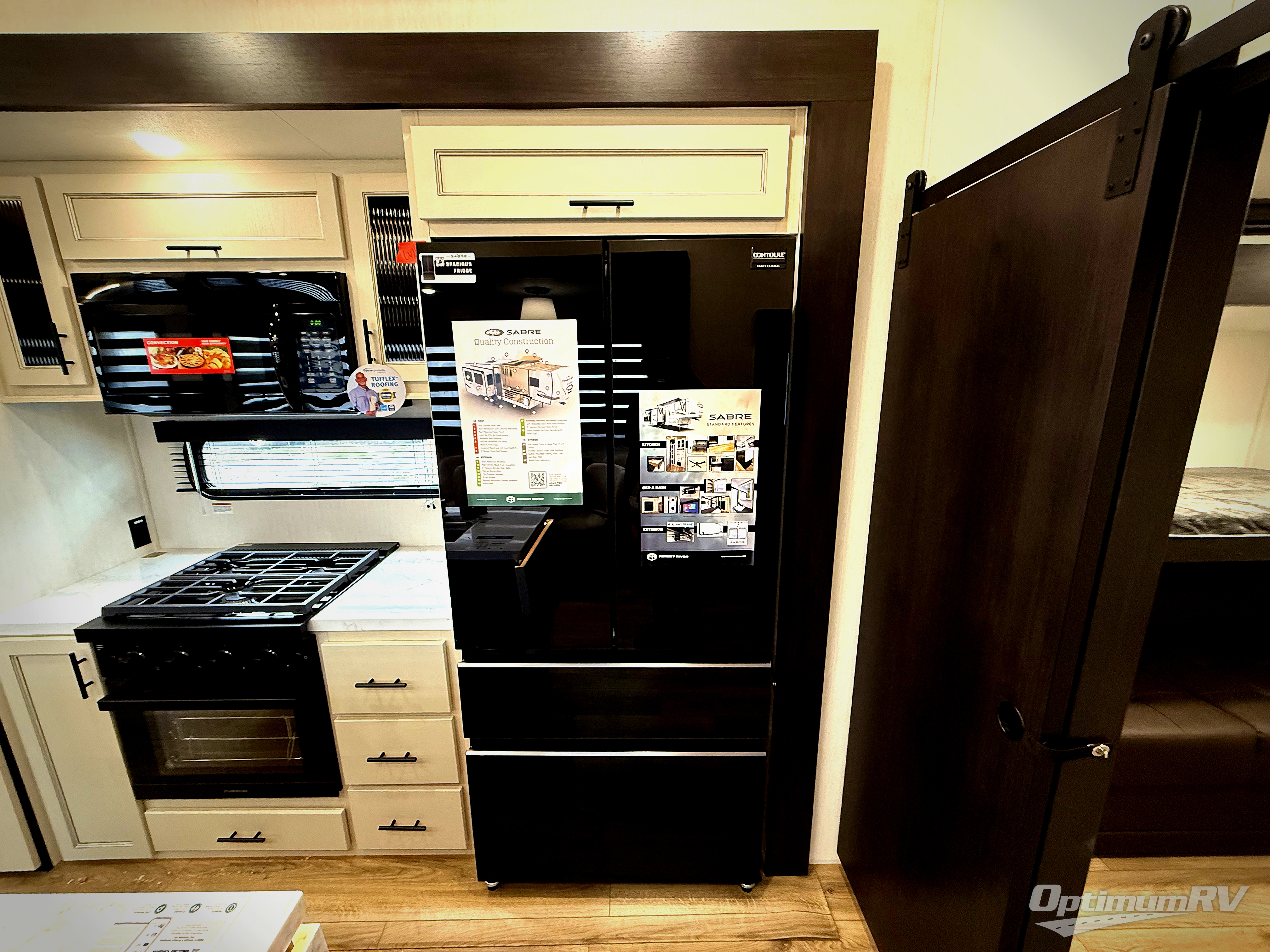 You will experience luxurious camping trips at an affordable price with any one of these Forest River Sabre fifth wheels! These models are durable and ready to travel anytime of the year thanks to features like the high-gloss gel-coat front cap with LED lighting, the PVC roof membrane, and the forced air underbelly with enclosed gate valves. The electric auto-leveling system makes setting up easy and safe, and the adjustable power awning with LED lighting will create an inviting outdoor living space. Each model includes a universal docking station which includes a black tank flush and an outside shower, and adjustable stable steps for you to enter and exit the unit safely. Inside, you will love the design of the ambient accent lighting in the living area, the real wood lumbercore cabinetry, and the linoleum flooring!