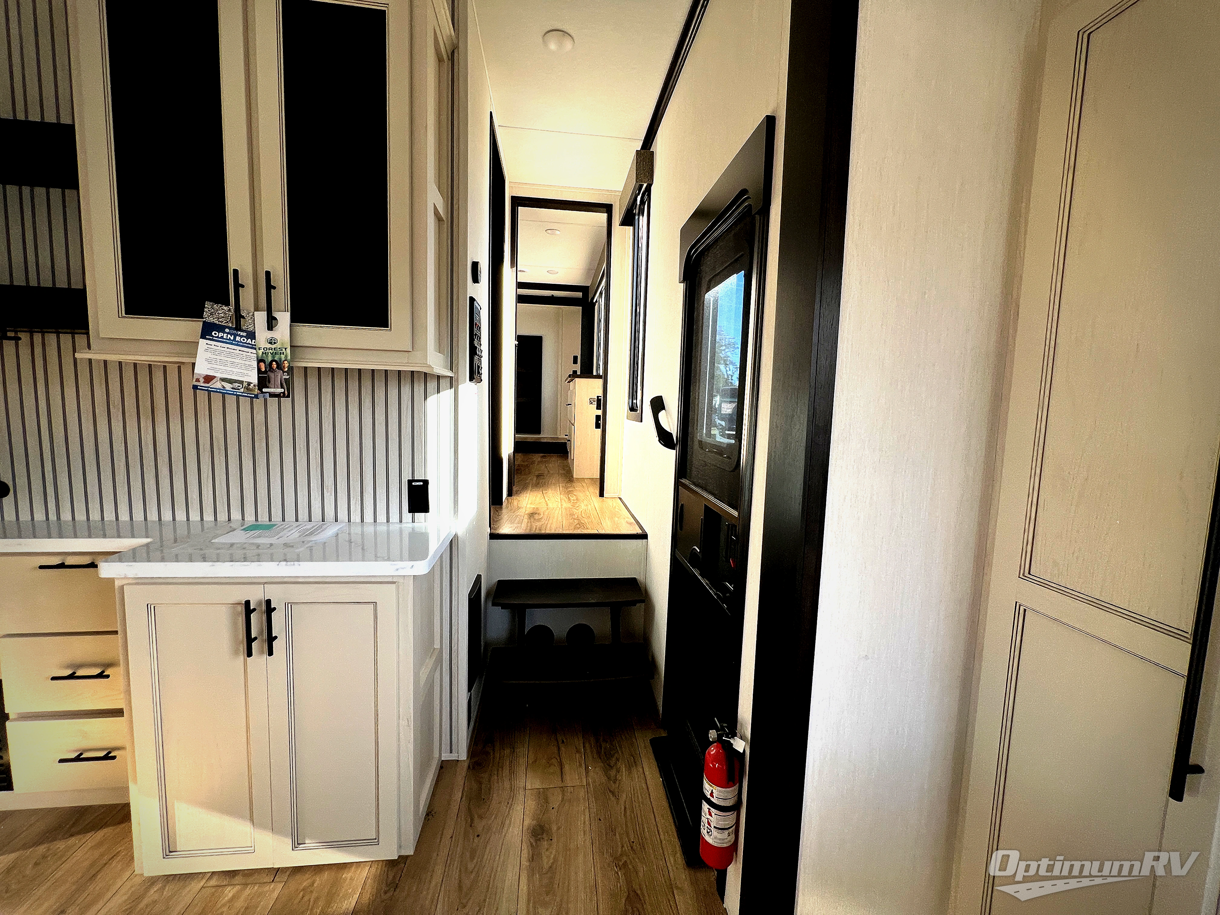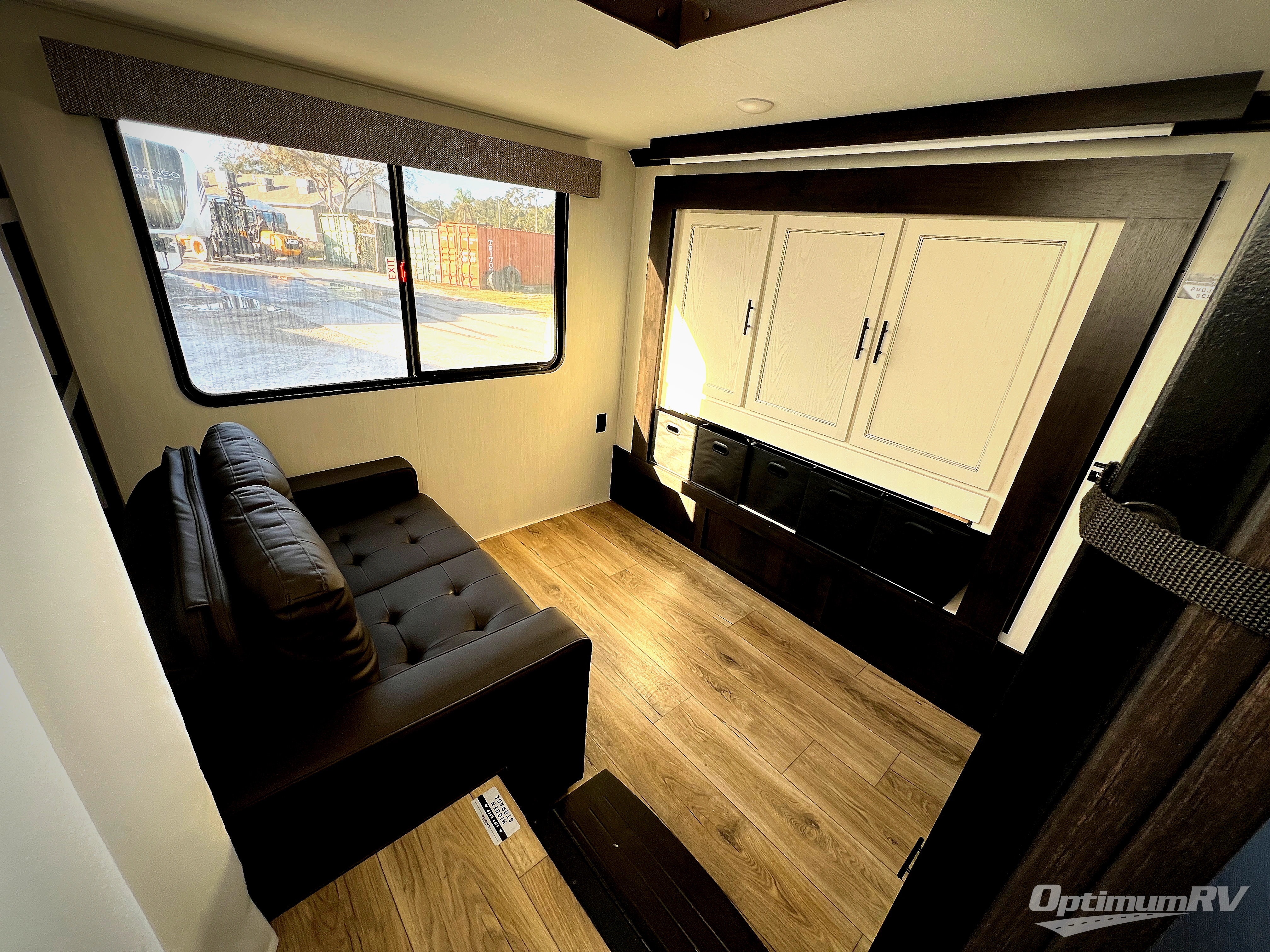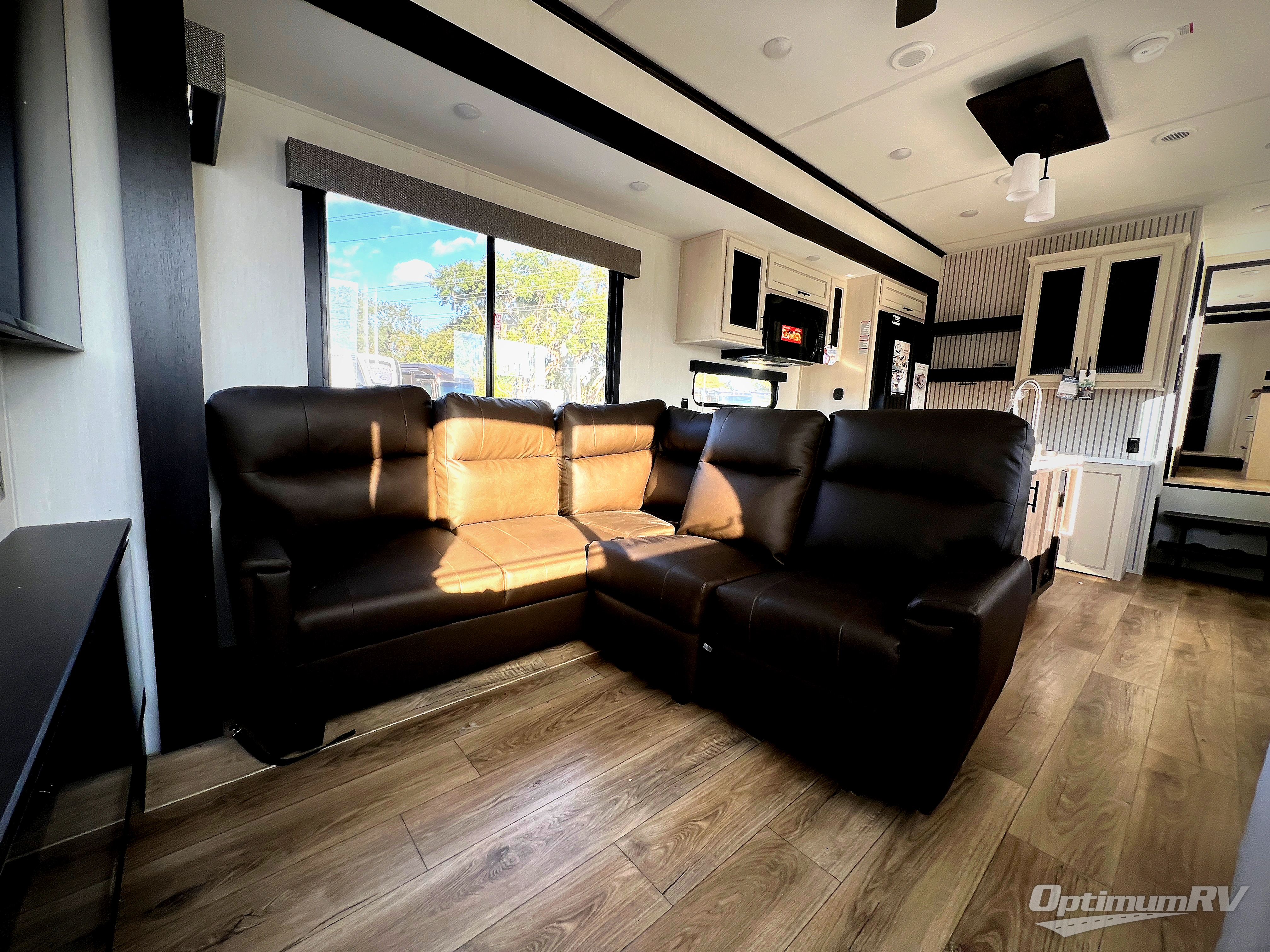 This is the perfect fifth wheel if you enjoy camping with friends and family! You'll have the front private bedroom with a camper king bed slide all to yourselves, while your guests take the rear den. There is a tri-fold sofa here, along with a wardrobe with a desk, additional shelves plus a loft above this room for even more sleeping or storage space! The main living room features an L-shaped sectional sofa, a fireplace and an entertainment center. And the patio deck with a 12' awning is right off of this room so you can visit with friends indoors or outdoors! There is generous counter space in the full kitchen, along with a pull-out storage drawer and a versatile dinette/desk. There are many more stand-out features found in this fifth wheel, including washer and dryer prep in the front bedroom, a 70" projector screen in the rear den, a second power awning, and the list goes on!