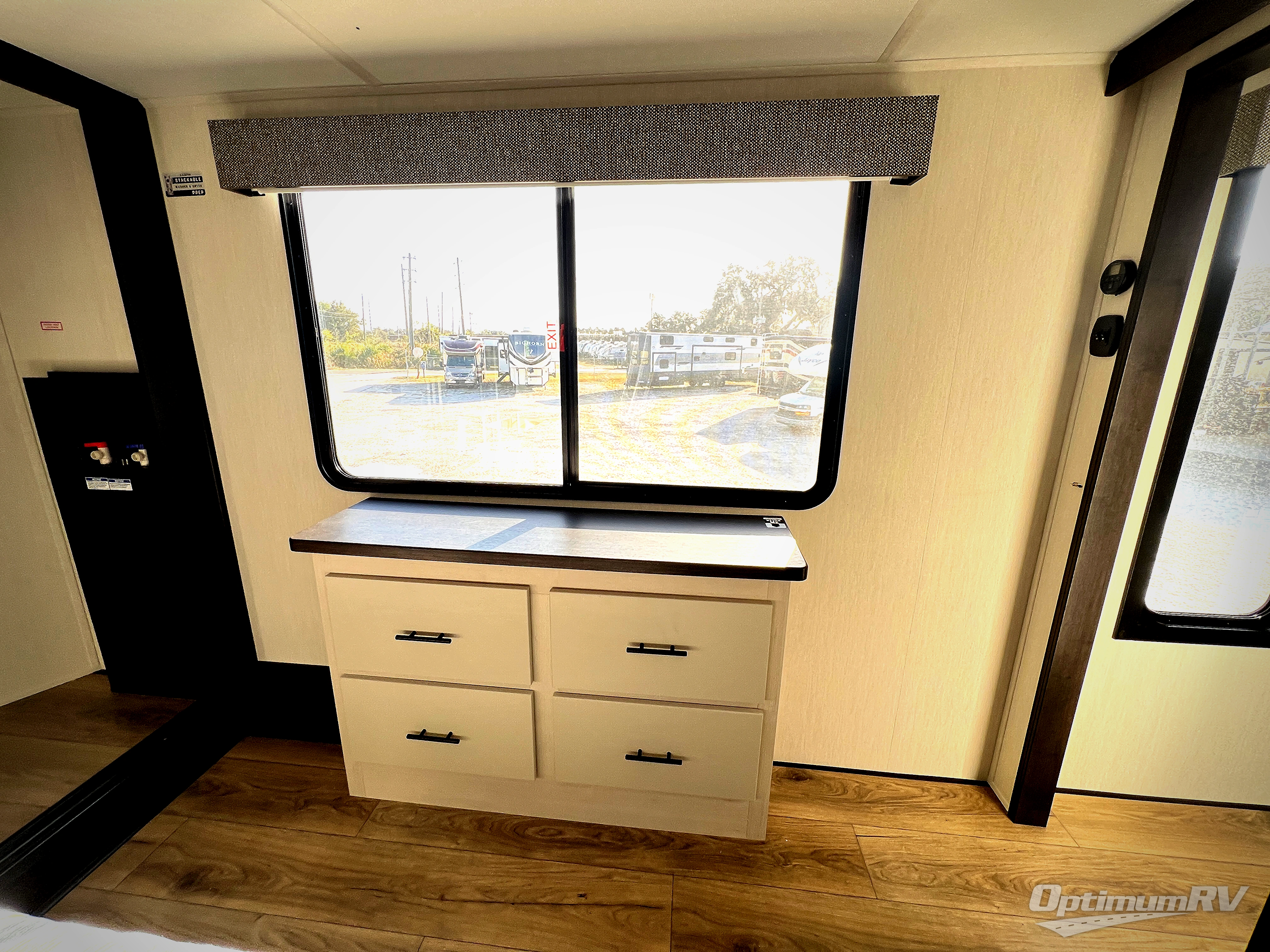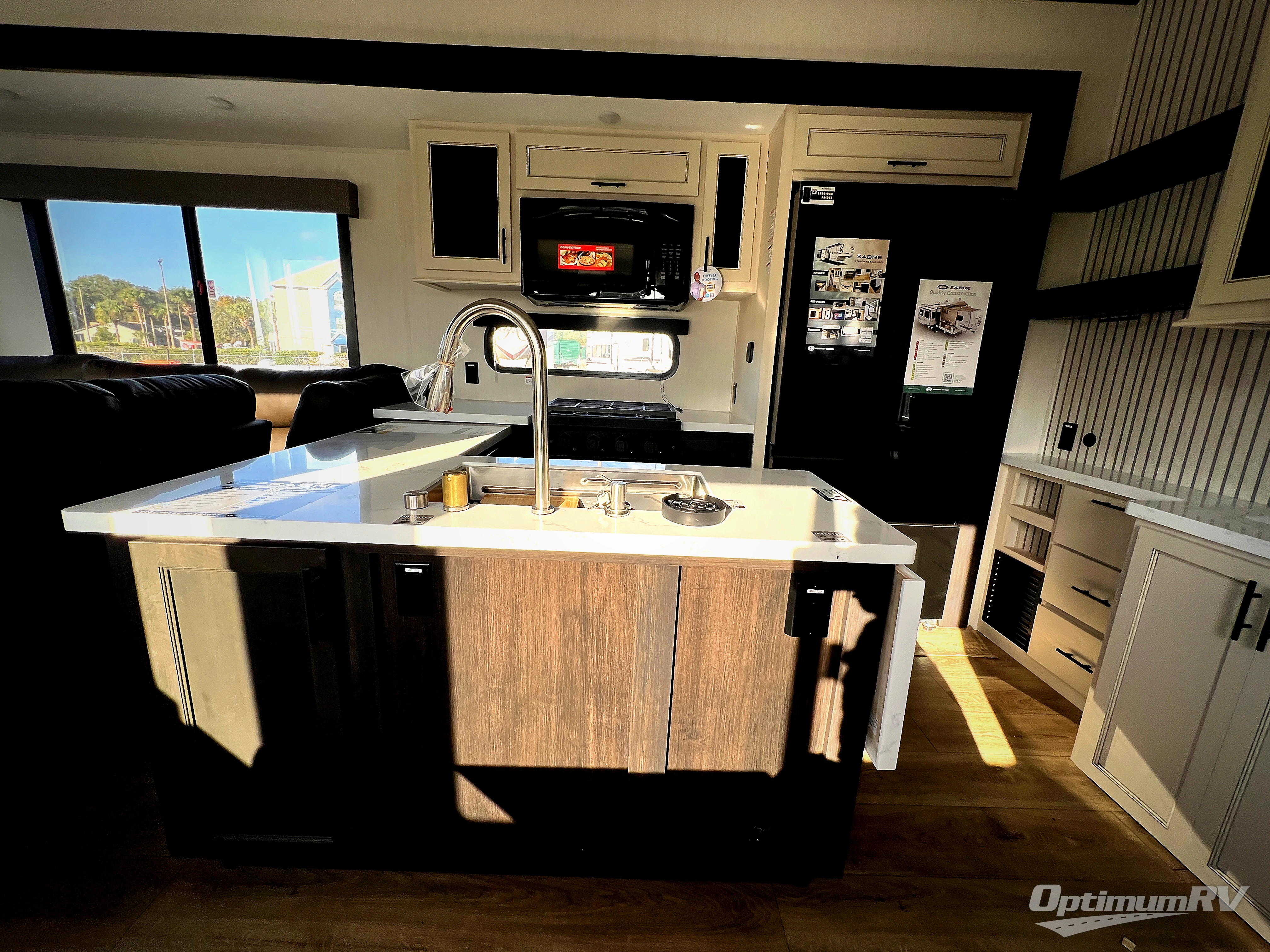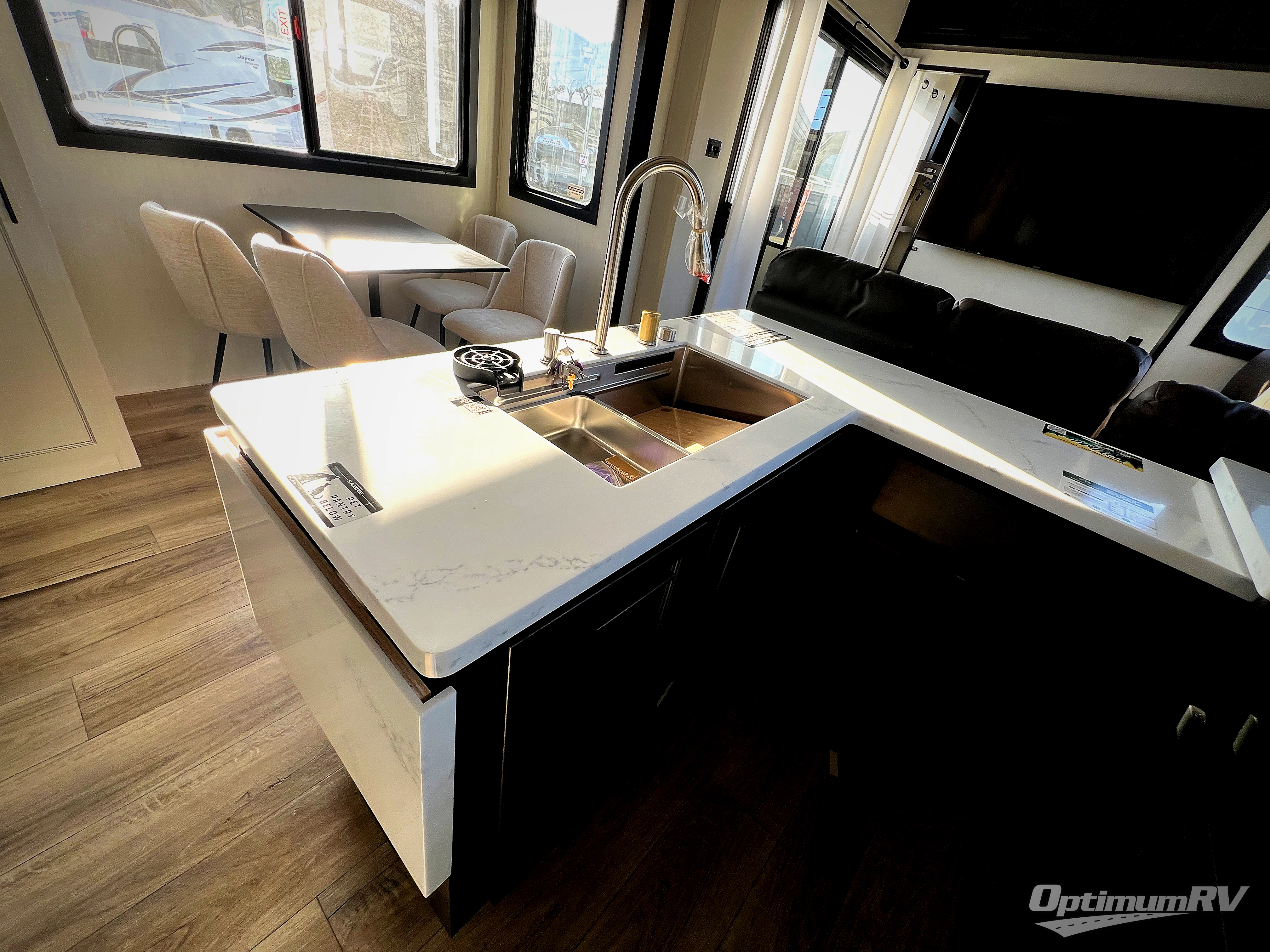 This is the perfect fifth wheel if you enjoy camping with friends and family! You'll have the front private bedroom with a camper king bed slide all to yourselves, while your guests take the rear den. There is a tri-fold sofa here, along with a wardrobe with a desk, additional shelves plus a loft above this room for even more sleeping or storage space! The main living room features an L-shaped sectional sofa, a fireplace and an entertainment center. And the patio deck with a 12' awning is right off of this room so you can visit with friends indoors or outdoors! There is generous counter space in the full kitchen, along with a pull-out storage drawer and a versatile dinette/desk. There are many more stand-out features found in this fifth wheel, including washer and dryer prep in the front bedroom, a 70" projector screen in the rear den, a second power awning, and the list goes on!