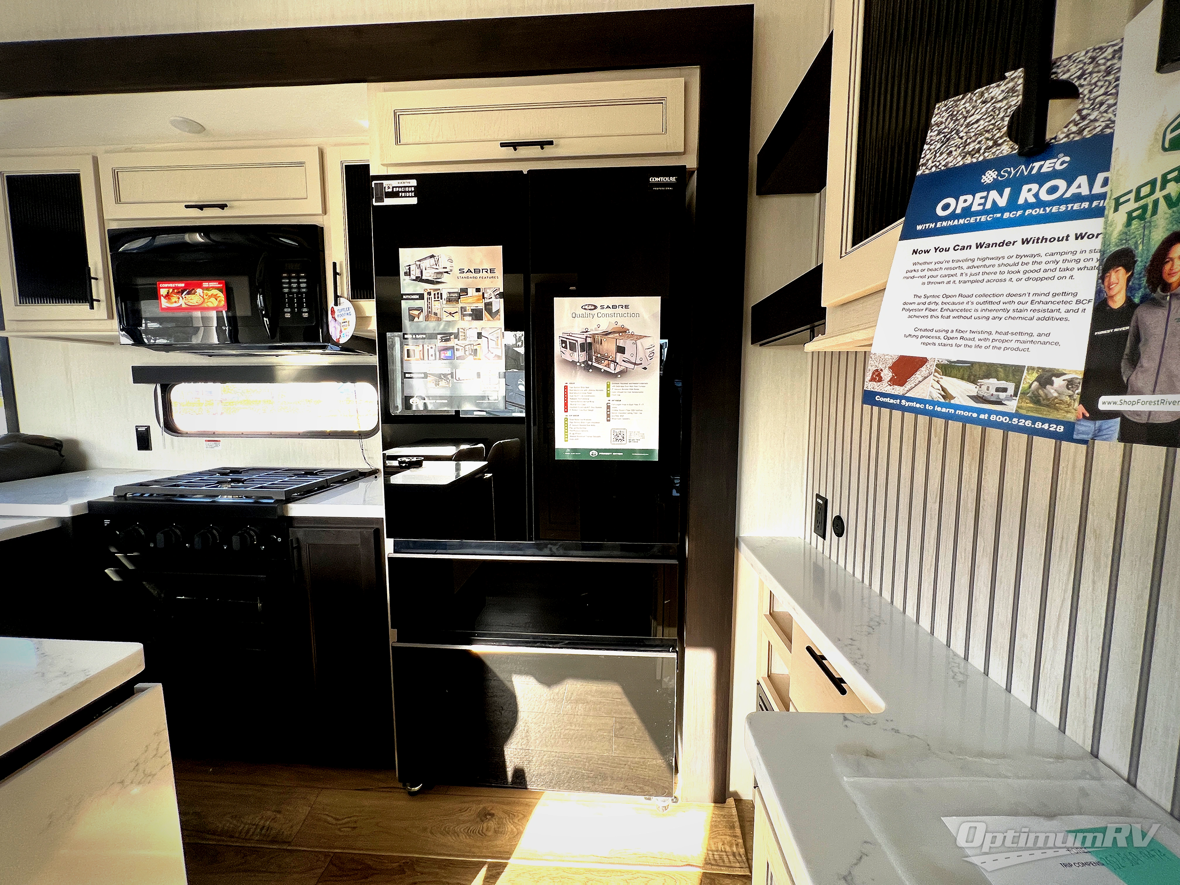 You will experience luxurious camping trips at an affordable price with any one of these Forest River Sabre fifth wheels! These models are durable and ready to travel anytime of the year thanks to features like the high-gloss gel-coat front cap with LED lighting, the PVC roof membrane, and the forced air underbelly with enclosed gate valves. The electric auto-leveling system makes setting up easy and safe, and the adjustable power awning with LED lighting will create an inviting outdoor living space. Each model includes a universal docking station which includes a black tank flush and an outside shower, and adjustable stable steps for you to enter and exit the unit safely. Inside, you will love the design of the ambient accent lighting in the living area, the real wood lumbercore cabinetry, and the linoleum flooring!